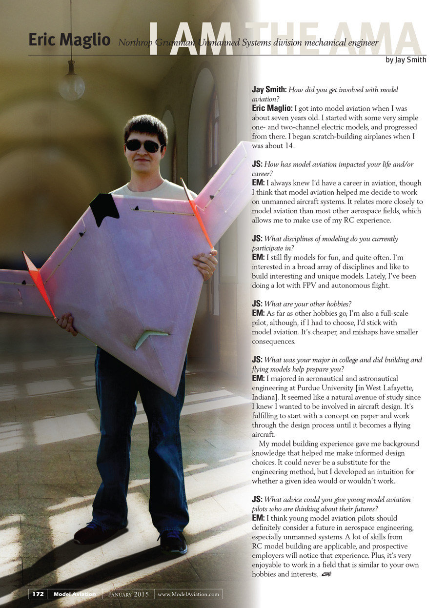 EM: I always knew I’d have a career in aviation, though I think that model aviation helped me decide to work on unmanned aircraft systems. It relates more closely to model aviation than most other aerospace fields, which allows me to make use of my RC experience.