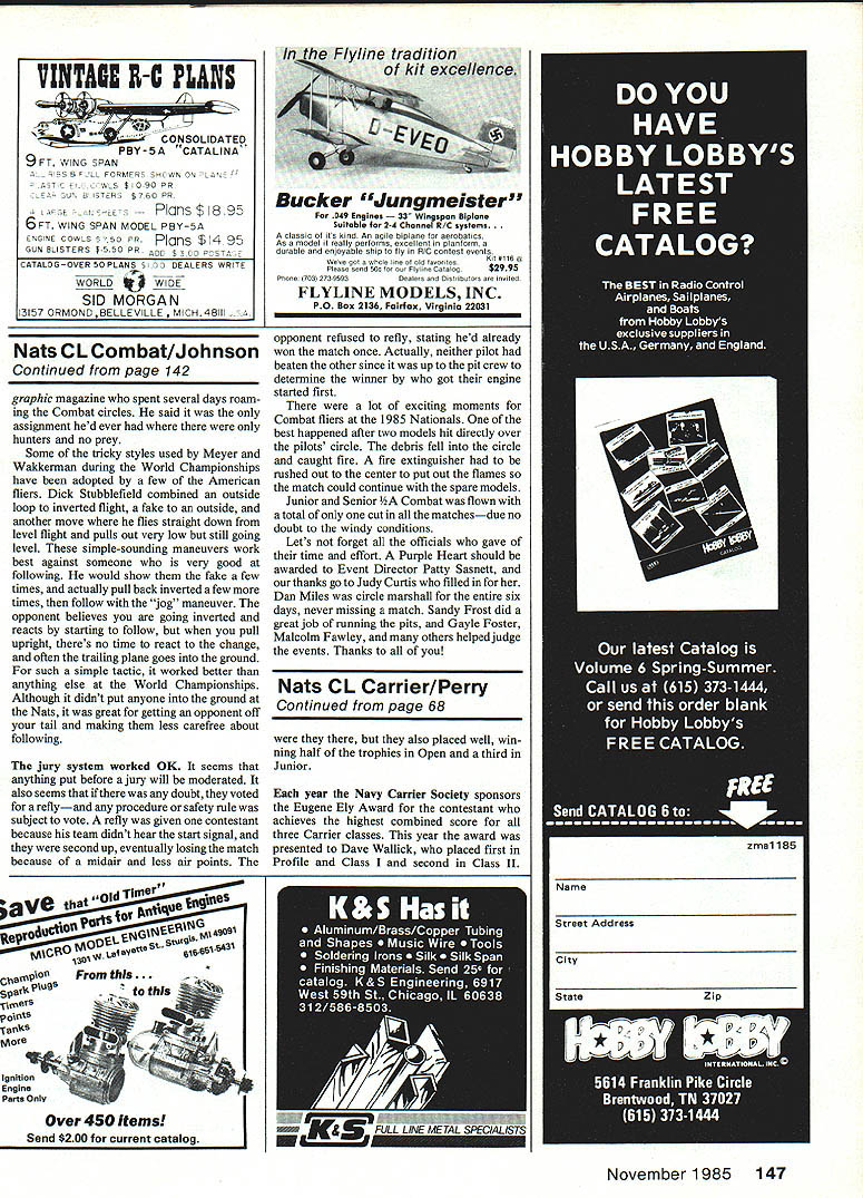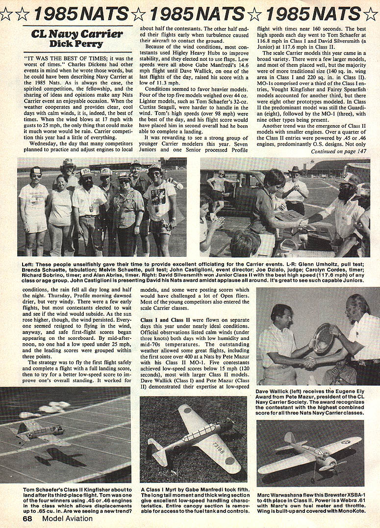 I 985NATSY 985NATSY I985NATS CL Navy Corner Dick Perry IT WAS THE BEST OF TIMES worst times Charles Dickens other events mind wrote words could have describing Navy Carrier 1985 Nats As always case spirited competition fellowship sharing ideas opinions make Nats Carrier event enjoyable occasion weather cooperates provides clear cool days calm winds indeed best times wind blows 17 mph gusts 25 mph thing could make much worse would rain Carrier competi tion year little everything Wednesday day competitors planned practice adjust engines local about half contestants other half end ed flights early turbulence caused alrcraft contact ground Because wind conditions con testants used Higley Heavy Hubs improve stability elected use flaps Low speeds above Gabe Manfredis 146 mph flight until Dave Walhick last flights day raised score low 113 mph Conditions seemed favor heavier models Four top five models weighed over 44 oz Lighter models such Tom Schaefers 32-oz Curtiss Seagull harder handle wind Toms high speeds over 98 mph best day flight score would have placed him second overall able complete landing rewarding see strong group younger Carrier modelers year Seven Juniors Senior processed Profile flight times near 160 seconds best high speeds day went Tom Schaefer 1168 mph Class David Silversmith Junior 1176 mph Class II scale Carrier models year came broad variety few larger models placed well majority traditional size 140 sq wing area Class 220 sq in Class II MO- comprised over third Class en tries Vought Kingfisher Fairey Spearfish models accounted another third eight other prototypes modeled Class lithe predominant model still Guardi eight followed MO-i three nine other types being present Another trend emergence Class II models smaller engines Over quarter Class II entries powered 45 46 engines predominantly OS designs Continued page 147 Left These people unselfishly gave time provide excellent officiating Carrier events L-R Glenn Umholtz pull test Brenda Schuette tabulation Melvin Schuette pull test John Castiglioni event director Joe Dzialo judge Carolyn Cordes timer Richard Sobrino timer Alan Abrlss timer Right David Silversmith won Junior Class II best high speed 1176 mph class orage group John Castiglioni presenting David Nats award amidst applause around Its greatto see such capable Juniors conditions rain fell day long half night Thursday Profile morning dawned drier very windy few early flights contestants elected wait see wind would subside As sun rose higher though wind persisted seemed resigned flying wind anyway safe first-flight scores began appearing scoreboard mid-after noon no low speed under 25 mph leading scores grouped within three points strategy fly first flight safely complete flight full landing score try better low-speed score im prove ones overall standing worked models some posting scores would have challenged lot Open fliers Most young competitors also entered scale Carrier classes Class Class II flown separate days year under nearly ideal conditions Official observations listed calm winds under three knots both days low humidity mid-70s temperatures outstanding weather allowed some great flights including first score over 400 Nats Pete Mazur Class II MO-i Five contestants achieved low-speed scores below 15 mph 120 seconds larger Class II models Dave Wallick Class Pete Mazur Class II demonstrated expertise low-speed Dave Wallick left receives Eugene Ely Award Pete Mazur president CL Navy Carrier Society award recognizes contestant highest combined score three Nats Navy Carrierciasses Tom Schaefers Class Ii Kingfisheraboutto Class Myrt Gabe Manfredi took fifth land after its third-place flight Tom long tail moment thickwing section thefourwinners using 45or46 engines give excellent low-speed handling charac class allows displacements teristics Entire canopy section remov up 65 cu Are seeing new trend able accesato fuel tank controls 68 Model Aviation Marc Warwashana flew BrewsterXSBA-1 4th place Class II Power Webra 61 Marcs own fuel meter throttle Wing built-up covered MonoKote Ducker Jun gmeister 049 EngInes ingspan Erplane Swtable 2 4 Channel R/C systems classic its kind An agile biplane aerobattos As model really performs excellent plantorm durable enjoyable ship fly RIG contest esents Weve oot sOnIc line old lovorites Kit elte Plexon send noe oar Flytine Catalog$2995 phone 17031 273-0593 Dealers OstoSotots ate noitno FLYLINE MODELS INC PO Box 2136 Fairfax Virginia 22031 Nats CL Combat/Johnson Continued page 142 graphic magazine spent several days roam ing Combat circles said assignment hed ever hunters no prey Some tricky styles used Meyer Wakkerman during World Championships have adopted few American fliers Dick Stubblefield combined outside loop inverted flight fake outside another move flies straight down level flight pulls out very low still going level simple-sounding maneuvers work best against someone very good following would show fake few times actually pull back inverted few times follow jog maneuver opponent believes going inverted reacts starting follow pull upright theres no time react change often trailing plane goes ground such simple tactic worked better anything else World Championships Although didnt put anyone ground Nats great getting opponent off tall making less carefree about following jury system worked OK seems anything put before jury will moderated also seems doubt voted refly procedure safety rule subject vote refly given contestant because team didnt hear start signal second up eventually losing match because midair less air points 9in aVO OId TIi~nes DGA this. spae - - Ignition/ Engine Parts Only Over45Oltems Send $200 current catalog opponent refused refly stating hed already won match once Actually neither pilot beaten other since up pit crew determine winner got engine started first lot exciting moments Combat fliers 1985 Nationals best happened after two models hit directly over pilots circle debris fell circle caught fire fir