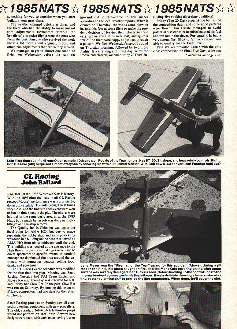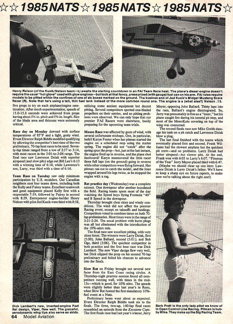 I 985 NATS l985NATS 1985 NATSM something consider start building next plane weather changed quickly times fliers ability make instant trim adjustments sometimes benefit practice flight ones fared best Anyone survived week knew lot about engines props other trim adjustments arrived managed get almost round flying Wednesday before rain set inand did rainthree five inches according local weather reports cleared Thursday winds came blowing forced some fliers make pru dent decision leaving planes cars Six seven ships lost quite few fliers happy just get through pattern flew Wednesdays second round Thursday morning followed two flights long tiring day After smoke cleared top 20 fliers including five rookies first-time qualifiers Friday Top 20 Day brought best air competition days some good patterns flown Jim Casale managed avoid potential disaster after miscalculated fuel ran out clover Fortunately very strong first flight fall back able qualify Final Five Paul Walker provided Casale close competition Final Five Day Continued page 138 Left First-time qualifierBruce Olson came 10th won Rookie theYearhonors HasST 60 Sig dope heavy-dutycontrois Right Bob Gieseke 4th surprised almost everyone showing up 60-sized Nobler Bob now 60 convert can Fancher hold out CL Racing John Ballard RACING 1985 Westover Nats history 10%-nitro-fuel rule CL Racing except Mouse performance surprisingly down slightly rule brought heat times very close finals event won lost time spent pits circles laid out same basic area 1983 Nats much better job done hole filling tar-strip removal Quality Inn Chicopee again focal point AMA HQ due space restraints hobby shop some processing done building base served AMA HQ about midweek until end building located entrance Nats flying site colored signs used direct spectators specific events carnival atmosphere dominated area around en trance numerous vendors selling food drink souvenirs CL Racing event schedule modified first time year Monday Scale Racing Tuesday FAL Team Racing Mouse Racing Thursday reserved Rat Friday Slow Rat past Slow Rat run Saturday moving event Friday competitors two days return trip home Scale Racing practice Sunday saw com petitors testing equipment new propellers old standard 6-6 -pitch high-nitro props would perform 10% nitro Several new designs seen team having four Jerry Meyer won Fireman Year award accident Above during pit stop Final plane caught fire MonoKote covering wing upper surfacewas severelydamaged Ken Hicks isseen Below hooking upthecontroi linestothe internal lead-outconnectors Scale Racer Barelyvisible inthewings lowersurface isa tiny rectangular hatch service line connectors done hell cover slot 1985NATS 985 NATS I985NATSY five props try airplane/engine com bination After much experimentation speeds 150-158 seconds achieved props having about 5-in pitch 5-in length Size blade area thinness extremely critical Race day Monday dawned surface temperatures 850F light gusty wind Event Director Ralph Biddie modified qualifying allowing competitors best time two preliminary 70-lap heat races used Seven ty-lap times ranged low 257 314 racers 301-to-306 range final race saw Lawrence Dziak superior airspeed slow pits edge out Bill Lees 613 winning time 610 Lawrences son Larry third time 616 Team Race Tuesday saw minimum participation US modelers Canadian neighbors sent four teams down including both Kelly Fairey teams Excellent teamwork good equipment placed Kelly first respectable 759 followed Fairey second 829 Entrepeneur engine-builder Henry Nelson pilot Jed Kusik third 85 8 utilizing some ancient equipment decent pitting Several competitors sported one-bladed propellers entries no pitting prob lems observed can hope premier FAL Racers elsewhere busily preparing upcoming team trials Mouse Race affected gusts wind several unfortunate mishaps particular befell Karyn Foster pitman started engine scheduled stop using starter spring engine did catch after spring spun propbut just last instant engine fired up reverse plane shot backward Karyn maneuvered little racer three full laps ground going reverse other competitors flying forward pitman ran out catch model lines wrapped around legs twice stopped engine rag Rat practIce day Wednesday complete rainout downpour after another inundated field Racing teams spent day watching Speed boys flying Formula 40 B Speed downpour Thursday brought clear skies windy con ditions wind did affect premier Racing event except takeoffs landings Competitors voted combine times both 70lap preliminaries Heat times inthe range 221-226 usual problem burnt plugs eliminated introduction 10%-nitro rule final race saw excellent pitting very close times winners Larry Dziak first 500 John Ballard second 501 Bob Oge third 506 quickest competitor both practice first heat race Dick Lambert new Viper design flew very well Dick clipped prop second 70-lap preliminary foiled chances advance finals Slow Rat Friday brought out several new faces East Coast racing circles Thursday-night practice session found com petitors running well times mid iSswhich good 10% nitro speeds slightly better last years Reno Slow Rat hosted first mandatory 10%fuel event Nats Preliminary heats went about expected Event Director Ralph Biddle took six finals three two-up 140-lap final races resembled episode Keystone Cops first finals race last years winner Jerry Meyer opposing John Ballard Thirty laps race Ballards engine disintegrated So Jerry presumably free loner plane caught fire during second pit stop MonoKote covering top wing consumed second finals race saw Mike Grebb dam age tank pit catch Lawrence Dziak blow plug last final finished teams eventually placed first second Frank Wil liams slowest airplane quickest pit crewand no problems Larry Dziak better airspeedbut slower pits end Frank won 605 Larrys 607 Fireman Year Jerry Meyer placed third 647 Maybe should clear up item Law rence Dziak Larry Dziaks father Well have keep sharp eye future reports make sure ta