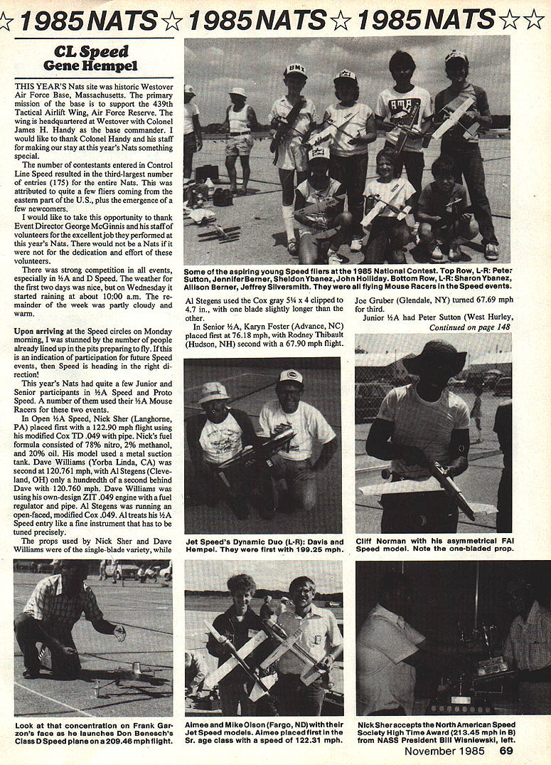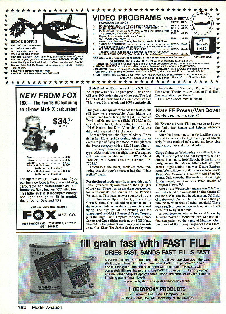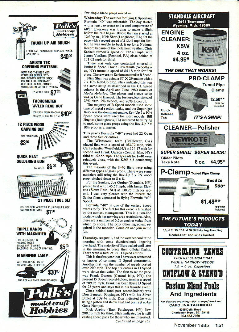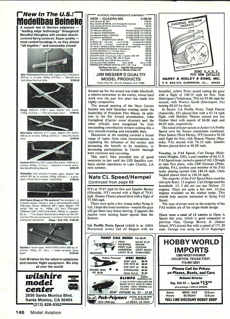 I 985 NA TS Y 985 NA TS Y 1985 NATSM CL Speed Gene Hemupel THIS YEARS Nats site historic Westover Air Force Base Massachusetts primary mission base support 439th Tactical Airlift Wing Air Force Reserve wing headquartered Westover Colonel James H Handy base commander would like thank Colonel Handy staff making stay years Mats something special number contestants entered Control Line Speed resulted third-largest number entries 175 entire Nats attributed quite few fliers coming eastern part US plus emergence few newcomers would like take opportunity thank Event Director George McGinnis staff volunteers excellent job performed years Mats would Mats dedication effort volunteers strong competition events especially lA D Speed weather first two days nice Wednesday started raining about 1000 am re mainder week partly cloudy warm Upon arrivIng Speed circles Monday morning stunned number people already lined up pits preparing fly indication participation future Speed events Speed heading right di rection years Nats quite few Junior Senior participants Speed Proto Speed number used Mouse Racers two events Open Speed Nick Sher Langhome PA placed first 12290 mph flight using modified Cox TD 049 pipe Nicks fuel formula consisted 78% nitro 2% methanol 20% oil model used metal suction tank Dave Williams Yorba Linda CA second 120761 mph Al Stegens Cleve land OH hundredth second behind Dave 120760 mph Dave Williams using own-design ZIT 049 engine fuel regulator pipe Ai Stegens running open-faced modified Cox 049 Ai treats Speed entry like fine instrument has tuned precisely props used Nick Sher Dave Williams single-blade variety Ai Stegens used Cox gray 5 x 4 clipped 47 blade slightly longer other Senior Karyn Foster Advance NC placed first 7618 mph Rodney Thibault Hudson NH second 6790 mph flight Joe Gruber Glendale NY turned 6769 mph third Junior Peter Sutton West Hurley Continiod nn n 148 Some aspiring young Speed fliers 1955 National Lontest TOP HOW Ll1 Peter Sutton Jennifer Berner Sheldon Ybanez John Hoiliday Bottom Row L-R Sharon Ybanez Allison Berner Jeffrey Silversmith flying Mouse Racers Speed events Jet Speeds Dynamic Duo L-R Davis CII? Norman asymmetrical FAI Hempel first 19925 mph Speed model Note onebladed prop Look concentration Frank Gar zons face launches Don Beneachs Class D Speed plane 20946 mph flight Almee Mike Olson Fargo ND theirNick Sher accepts North American Speed Jet Speed models Almee placed first theSociety High Time Award 21345 mph B Sr age class speed 12231 mphfrom NASS President Bill Wisnlewskl left November 1985 69 rNew UDSEj modeilbau Beineke superb line German sailpianes leading edge technology throughout Beautiful fiberglass sanded obechi covered flying surfaces Super quality control housings almost fall together reasonably priced Mlni-Thermaris2300wm 90 span HO 15/8 airfoil 628 sq w/area 1600g 36 lbs ld fast slope/thermal ship$16500 468 sq w/area 1300g 28 lbsbeautiful scale ship$14995 Cortina4000mm 158span Ritz airfoil 1Q56 sq w/area 3300g 73 lbs stic 4-meter scalelike breathtaking beauty$26500 Schwalbe shown 2-meter span Eppler 180 airfoil 561 sq w/area 1200g 26 lbs pylon wing mount slope rocketship $16995 Cliff Hawk Slope F3b versions Two designs V-tailed sloper shown conventional-tailed F3b-typo Slope 2300mm go span Eppler 178 airfoil 561 sq 1400g 31 lbs F3b-type 2700mm 106 HO 25/8 airfoil 748 sq appros 60 oz er should blazer hill nd F3b version q uotes sum bern like world champion sailplanes Slope Call F3b -$18495 Call Wilshire latest sailplanes electric flight equipment ship over world wilshire model center 2836 Santa Monica Blvd Santa Monica CA 90404 213 8289362 IN STOCK FOR IMMEDIATE SHIPMENT NEW RA SOS$19995 New Qoedre 35 COt$10998 Req Qeedre 3589995 RrsigheIia fivwhoei$11990 Req Oeadra 38 Power Asseorbin Oem$6480 OUAORA REPAIR$1000 pies pertsl Jin Messer ERCOUPEPLANS 82395 KiT $23998 Jiw Mentor TOMAHAWKPLANS $2395 KIT $25995 Jim Messer RRALL TRAINERPLANS $2396 KIT 821495 Jim Messer ACROBATPLANS 81998 KIT $22495 New ZENOAHG23513996ZENOAHG3B$ 9995 PLOATS 36115 scalenorm $1798notopiete kit $3995 FLOATS 48 1/4 scalecores $21 95complete kit $4795 1$ WWi WHEELS 2595 PhW CYLS FLEET l5l02595 PLANS SUPER STEARMAN 14 IGoafreni$2895 1/3 TAYLORCRAFT 13 cue Nelite$2995 VOLKSPLANE 1/3lChioken Charliel82395 COCKPIT KITS Tvwohawk F4U $ Spitfee ME 109$2295 Ercoepe Fleet J3 Cob P6E P47 C Eagle$2195 Citebria $24 95 Zero $26 95 Zero eeterior$1095 US Oeadra FUEL TANKS 16 ac 569532 oc $795 FIBEROLASS ARROW SHAFTS 516032 long6l$1$08 24-Hour Service. Add 52SOpnstage Seed Bank checker Money Order JIM MESSERS QUALTIY MODEL PRODUCTS Valley View Bee 43 Allegany NY 14706 Runner-up award Gabe Manfredi relative newcomer events hard work over past few years has made him highly competitive annual meeting Navy Carrier Society held Saturday evening under leadership President Pete Mazur addi tion Ely Award presentation John Castiglioni Carrier event director other officials recognized outstanding contribution toward making very smooth-running enjoyable Nato Discussion meeting covered broad range topics rules interpretations expanding influence society increasing benefit its members increasing participation Carrier through both retention recruiting years Nats provided lots good memories last until USS Smallfry con ducts carrier operations Lake Charles LA next summer Nats CL Speed/Hem pel Continued page 69 NY 7997 mph first Jennifer Berner Glendale NY second flight 7961 mph Sharon Ybanez placed third flight 77560 mph quite few young ladies flying hope trend continuesmaybe guys will get lazy bones moving appears Juniors turning faster speeds Seniors Profile Proto Speed AMA Provisional event Al Stegens PEANUT SCALE MODELS Kits $695 MILES M8 PIETENPOLDRUINE PIPER CUBCOUGAR ANDRESONGIPSY MOTH MUSTANGLACEY M-90GANAGOBIE jjr Powered PRAIRIE BIRD 4 $595 - SPORT MODELS BABY ACE$649 ONE HITS 286695 ONE NITE 16$595 STRINGLESS6495 PECK ROG$195 RADIO BLIMPS CONTROLLED Ii end 13 FOOT LONOKITS OR READY TO FLY NO