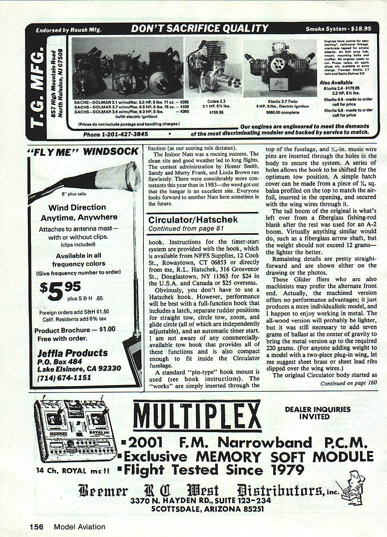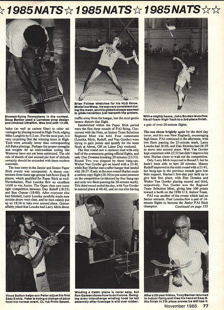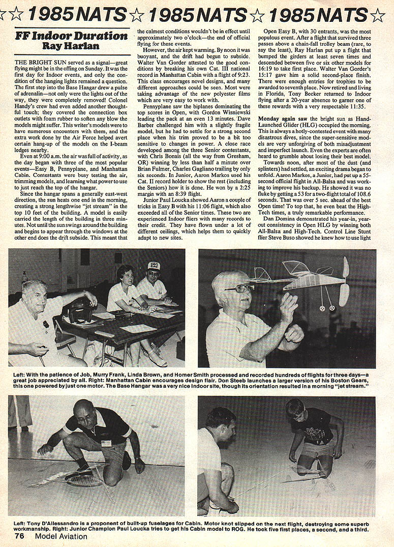 I 985NATSY 985NATSY I985NATSY IF Indoor Duration Ray Harlan THE BRIGHT SUN served signalgreat flying might offing Sunday first day Indoor events con dition hanging lights remained question first step Base Hangar drew pulse adrenalinnot lights out way completely removed Colonel Handys crew added another thought ful touch covered connection box outlets foam rubber soften blow models might suffer writers models have numerous encounters extra work done Air Force helped avert certain hang-up models I-beam ledges nearby 900 am air full activity day began three popular eventsEasy B Pennyplane Manhattan Cabin Contestants busy testing air trimmingmodels leamingwhatpowertouse just reach top hangar Since hangar spans generally east-west direction sun heats end morning creating strong lengthwise jet stream top 10 feet building model easily carried length building three min utes until sun swings around building begins appear through windows other end does drift subside meant calmest conditions wouldnt effect until approximately two oclockthe end official flying events However air kept warming noon buoyant drift begun subside Walter Van Gorder attested good con ditions breaking own Cat III national record Manhattan Cabin flight 923 class encourages novel designs different approaches could seen Most taking advantage new polyester films very easy work Pennyplane saw biplanes dominating top scores Open Gordon Wisniewski leading pack 13 minutes Dave Barber challenged him slightly fragile model settle strong second place trim proved bit too sensitive changes power close race developed among three Senior contestants Chris Bonais way Gresham OR winning less half minute over Brian Fuimer Charles Gagliano trailing six seconds Junior Aaron Markos used Cat II record holder show rest including Seniors done won 225 margin 839 flight Junior Paul Loucka showed Aaron couple tricks Easy B 1106 flight also exceeded Senior times two experienced Indoor fliers records credit have flown under lot different ceilings helps quickiy adapt new sites Open Easy B 30 entrants populous event After flight survived three passes above chain-fall trolley beam rare say least Ray Harlan put up flight bumped girders least seven times descended between five six other models 1619 take first place Walter Van Gorders 1517 gave him solid second-place finish enough entries trophies awarded seventh place Now retired living Florida Tony Becker returned Indoor flying after 20-year absence gamer rewards very respectable 1135 Monday again saw bright sun HandLaunched Glider HLG occupied morning always hotly-contested event disastrous dives since super-sensitive mod els very unforgiving both misadjustment imperfect launch experts often heard grumble about losing best model Towards noon after dust splinters settled exciting drama began unfold Aaron Markos Junior put up 55second official flight All-Balsa work ing improve backup showed no fluke getting 53 atwo-flighttotal 1086 seconds over 5 sec ahead best Open time top beat HighTech times truly remarkable performance Dan Domina demonstrated year-in yearout consistency Open HLG winning both All-Balsa High-Tech Control Line Stunt flier Steve Buso showed knew use light Left patience Job Murry Frank Linda Brown Homer Smith processed recorded hundreds flights forthree daysa great job appreciated ail Right Manhattan Cabin encourages design flair Don Steeb launches iarger version Boston Gears powered just motor Base Hangar very nice indoor site though its orientation resulted morning jet stream Left Tony DAiiessandro proponent buiitup fuselages Cabin Motor knot slipped next flight destroying some superb workmanship Right Junior Champion Paul Loucka tries get Cabin model ROG took five first piaces second third 76 Model Aviation 985 NA TS Y 985 NATS I985NATSM Slowest-flying Pennyplane contest Doug Barber used Larrabee prop design crinkled Ultraflim 2nd wIth 1209 balsa well carbon fiber other ad vantages placing second High-Tech edging Mike Langlois 02 sec part very surprising winning times HighTech actually lower corresponding All-Balsa placings Perhaps proper strengths weights intermediate ceiling like Westover have yet optimized old rule thumb second per foot altitude certainly should exceeded modem materials lone entry Junior Senior Paper Stick events unexpected dozen con testants age groups flown Easy B planes qualified Paper Stick well Nevertheless Paul Loucka flew excellent 1408 win Junior Open class saw some tight competition between Dan Belieff 1855 Ron Ganser 1800 After everyone else finished Larry Loucka carefully made sure outside doors shut caimly put up 1834 take over second place Ganser affably joked Loucka Larry Mzik direct traffic away hangar lest gentle breeze disturb flight Sandwiched within Paper Stick period first three rounds FM flying Con current Nats Indoor Team Selection Regional Meet held Four contestants Loucka Mzik Radoff Van Gorder trying gain points qualify team finals Akron OH Labor Day weekend first round saw cautious start half contestants getting official flights Dan Domina breaking 20 minutes 2355 Round Two plagued three hang-ups Walter Van Gorder got board 2346 Ray Harlan rafter banger landed 2837 Early next round Harlan made carbon copy flight 2830 put some pressure competition evidenced four hang-ups two fliers passing 20-minute mark third round ended day Van Gorder second place 4642 no else having pair over-20-minute flights sun shone brightly again third day wow New England encouraging high times FAI continued afternoon two fliers passing 25-minute mark Larry Loucka 2606 Dan Domina 2629 move second place Walt Van Gorder kept consistent 2232 didnt improve time Harlan chose wait out competition Only Larry Mzik improved RoundS hadnt able best 20 minutes Manny Radoff improved sixth round 2141 hang-ups previous rounds gave him little support Harlans first-day pair held up give him first place Dan Domina Walter Van Gorder placing second third respectively Van Gorder won Regional 