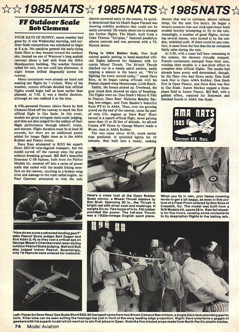 I 985NATSY 985NATSY I985NATS FF Outdoor Scale Bob Clemens FOUR DAYS OF SUNNY warm weather gone Wednesday morning out door Scale competition scheduled begin 8 am No sunshine greeted early-rising Scale fliers headed toward outdoor site located Westovers long asphalt runways about half mile AMA Headquarters building weather forecast called raln until late afternoon slight breeze drifted diagonally across runway contestants already hand making test flights 7 oclock Wary weather contest officials decided official flights would begin half hour earlier planned 730 fateful decision although no realized time C02-powered Farman Jabiru flown Bob Clemens lifted off runway mark first official flight Gas Scale event models given stringent static-scale judging also judged realism flight performance through takeoff cruise descent Flight duration must least 20 seconds no additional points added longer flight times AMA Rubber Peanut events Dave Rees attempted ROG superb Short 5D3-30 twin-engined transport model curved off runway onto grass breaking ground Bill Bells beautiful Stearman C-3B biplane built Flyline Models kit zoomed off series power stalls ended model hitting nosefirst runway resulting broken wing strut damage scale radial engine As Paul Gaertner attempted trim electric-powered entry contest quick ly determined Heath Super Parasol showing stability problems could easily corrected wisely chose attempt further flights Heath built Gene Thomas kit/plan featured pendulum aileron controls powered VL Hytork motor FlyIng AMA Rubber Scale Don Srull started quietly putting hand-launched offi cial flights allowed biplanes scarlet Missel Thrush 30-inch Thrush climbed out steady spiral pattern easily topping minute heavy air fighting second today noted Dave Rees began taking officials Peanut clipped-wing Monocoupe Little Butch Subtly breeze picked up Overhead gray cloud deck showed no signs breaking flights went Don Steebs Micro-X Fike Peanut Dave Rees Nicholas Beazlcy Bar ling low-winger Tom Sandors beautiful Ryan PT-21 AMA over growing crowd end runway came purr twin CO2 engines Dave Rees Short turned superb official flight never gaining 15 20 feet altitude An all-red Cessna AW flown George Meyers made 90-sec max AMA Rubber rain came about 1030 much earlier predicted sprinkled lightly 10 minutes built steady soaking shower continue almost letup next five hours So began bizarre scenario saw stick-and-tissue Scale models bravely attempting fly rain Amazingly number good flights includ ing several maxes turned sod den wrinkled craft could com fort came fact air remained fairly calm during rain 330 scant half hour remaining contest showers virtually stopped Frantic contestants emerged cars winding models last-ditch effort complete official flights results already pretty well determined though fliers flown early Don Srull took first Open AMA Rubber Don Steeb first Open Peanut Dave Rees first Gas Scale Aaron Markos topped threeplane field Junior Peanut Bill Bell gallant effort repaired Stearman finished fourth AMA Gas Scale El 74 Model Aviation Heres close look Open Rubber fly rain tissue covering Scale winner Missel Thrush biplane tends get bit saggy seen pic Don Srull Spanning 30 Thrush ture Fleet Finch entered Don Ross bright red silver cowl markings Cresakili NJ modei built weighs 31/2 oz Two loops 1/4-in PAl rubber R/N Models kit spans 28 Rain fell steadi provided power fullsize Thrush iy five hours causing some contestants 1 g2os-vintage English sport plane try despiratlon flights lasting rain El Howdowescorca reTracwalanalnggearr asks Peanut Scale judges Bert Dugan Bob Adair L-R cast critical eye George Meyes Chambermaid racer during outdoor Peanut Scale judging Bertand Bob also judged indoor Peanut Surprisingly 16 Peanuts entered outdoors Left Power Dave Rees Gas Scale Short SD3-3otransport came two Brown Campus Bee motors single 20cctank providing gasfor both Filler tube can seen exiting fuselage top just front wing leading edge projection Right Dave entertains gaggle gawkers superb model went win first place Open Notethe five-bladed props made North Pacific plastic blades