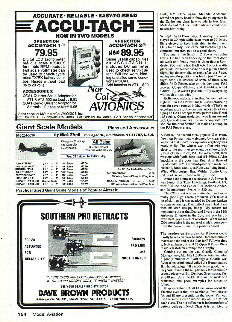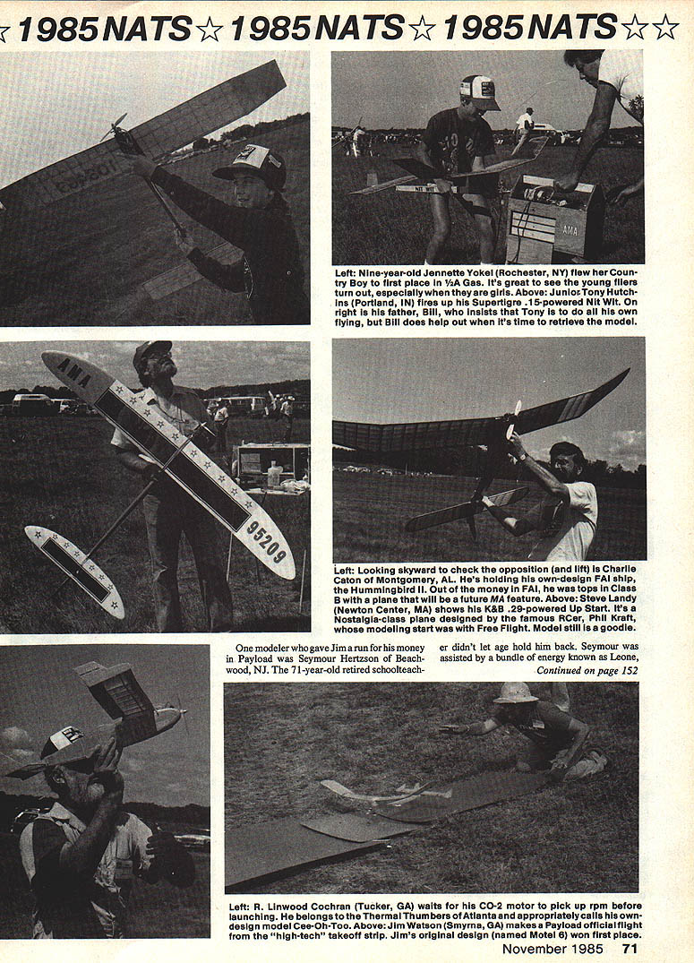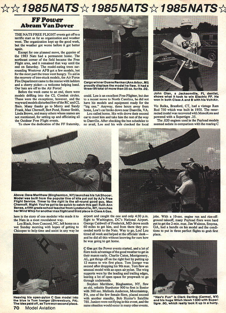 1985 NA TS Y 985NATSY 1985NATS FF Power Abram Van Dover THE NATS FREE FLIGHT events got off terrific start far organization weather went organization kept up good work weather got worse before got better again Except planned move gypsies 1983 Nats permanent home northeast corner field became Free Flight area remained way until end Saturday model-eating trees sur rounding Westover AFB got few models part trees went hungry aid recovery tree-stuck models Air Force Fire Department came rescue ladders cherry pickera welcome helping hand hats off Air Force Before week came end models drifting CL Combat circles exceptions however wayward models disturbed few RC CL fliers thanks go Murry Sandy Frank Max Chernoff Bert Pond Homer Smith Linda Brown others names mentioned setting up officiating Outdoor Free Flight events show dedication FF fraternity story modeler made Nats roundabout way Lou Black Concord NC left home wet Sunday morning hopes getting Chicopee help time assist way could Lou excellent Free Flighter due recent move North Carolina did have models equipment ready big Anyway three hours away home Lous car broke down near Danville VA Lou called home wife drove second car meet him take him rest way Danville After checking bus schedules no avail Lou wife checked local airport caught 430 pm flight Washington DCs National Airport George Caidwell Frederick MD drove south 60 miles get him pro ceeded north Nats Way go Lou Lou timed week helped officials desk did knowing sure going get home C Gas got Power events started lot fliers took advantage good weather get maxes early Charlie Caton Montgomery AL got things off right foot putting up 12 maxes win first place Tom loerger second after dropping 9th max Tom flew unusual model open-air pylon wing supports leading trailing edges leaving lot open space propwash go through underneath Stephen Merithew Binghamton NY flew old reliable Starduster 900 first Senior 360 sec Melinda Anderson Mountaintop PA few female fliers placed second another standby Bob Hunters Satellite 788 Juniors flying event same situation would occur otherevents Vic Rolka Branford CT vintage Ram Rod 750 built 1958 resur rected model recovered MonoKote powered Supertigre 35 020 engines used Payload models seemed sedate comparison roaring C jobs 10-sec engine run rise-offground takeoff Payload fliers hard put get 2-min max Jim Walston Smyrna GA handle model condi tions put three peifect flights grab first place Cargo winner Duane hlUflKUfl lRflfl RrDor muJ proudiy dispisys modei fiew three-iifttotai 25 oz its 02 onn uian JacKsonvIIIe FL dentist shows what took win Eiectric FF won both Ciass B Voit-Air Above Dave Merithew Binghamton NY isunches 1/iA Shocer Modei built popular line kits put out AJs Free Flight Service Timer right all-round good guy Max Chernoff Right Youve got quick catch gall Ruth Ann Banes fifth grade school teacherfrom Lyndonvilie NY launches Wind Whip foranother maxfiight third place Class AGas Heaving open-pylon C Gas moasi blue Tom loerger Shrewabury PA idea paid off Tom won second place 70 Model Aviation Havn Fun Clark Darling Carmel NY huge Witch Hawk 1300 Super tigre 60 whIch reaiiy took up hurry 1985 NATS 985 NA TS Y 1985 NATSM2 modeler gave Jim run money er didnt let age hold him back Seymour Payload Seymour Hertzson Beach- assisted bundle energy known Leone wood NJ 71-year-old retired schoolteach-Continued page 152 Left R Linwood Cochran Tucker GA waits CO-2 motor pick up rpm before launching belongs Thermal Thumbers Atlanta appropriately calls owndesign model Cee-Oh-Too Above Jim Watson Smyrna GA makes Payload official flight high-tech takeoff strip Jims original design named Motel 6 won first place November 1985 71 LOUT NIne-yesr-oIa ienneue TUdei Rochester NY flew Coun try Boy first place /aA Gas its great see young fliers turn out especially girls Above JuniorTony Hutch ins Portland IN fires up Supertigre 15-powered Nit Wit right father Bill insists Tony own flying Bill does help out its time retrieve model Len LOUIUfl9 5Iywru iu uheck opposition lift Charlie Caton Montgomery AL Hes holding own-design FAI ship Hummingbird ii Out money FM tops Class B plane will future MA feature Above Steve Landy Newton Center MA shows K&B 29-powered Up Start its Nostaigia-ciass plane designed famous RCer Phil Kraft modeling start Free Flight Model still goodie *III *PROGRAMS VHS&BETA4f * IPROGRAM LISTINGSRENT BUY ~ *BASIC CONSTRUCTION FOR BEGINNERS IN RIC107 Mm 4995 \aW* * BASICFLIGHTTRAININGFORBEGINNERSINRIC65Mm 4495/1 VIDEO Professional highly detailed step-by-step instruction Z * *IV *THE WORLDOFMODELAVIATION90Mir 4495** Expos Scale meets AMA Nats & *OSHKOSH OVERVIEW55Mm3995* *hr-u Workshops Forums Tours Aerobatics Warbirds & Morej 5AIRPLANEFUNNIES30Mm 3995Rentals* See friends others goofing wildeat video ever *6 US SCALE MASTERS CHAMPIONSHIPS60Mm 3995$1495* beat scale models snd pilots competing top honors 7WARBIRDS IN ACTIoN Full Scale AIr Shows & 5Mm * *_____________________________ sales tlnal * * * * * sales fInal prIces subject change please check current ads tar rates ORDERING INFORMATION Please Resd Carefufly Te Avoid Delays RENTAL DEPOSIT full purchase price EACH program ordered difference refunded * RENTAL DURATION 1 week after delivery Reserved dates require 15 day notice PAYMENT Check 10 day clearance money order Sorry no Visa etc CODs available phone * SHIPPING S3lsForeign Canada add 10/o TOTAL others add 15% IL res add 8% tea * SEND ORDERS TO ACADEMY OF AVIATION RESEARCH & DEVELOPMENT OX 428144 CHICAGO IL 60642 call 312 874-0456 10 am-B pm Mon thru Sat * NEW FROM FOX 15X 15 RC featuring all-new Mark carburetor $345 #21500 lightest weight lowest Cost 15 YOU can buy now boasts all-new Markl CarbUretor better-than-ever per formanCe Runs best 10/e nitro fuel little jewel still compact enough light enough fit models designed 09s 10s VISA MasterCard Accepted Fox MFG Co 5305 TOWSON AVE FOAT SMITH AA 72901 501 646-1656 Both Frank Donwere usingthe OS Max 65 eng