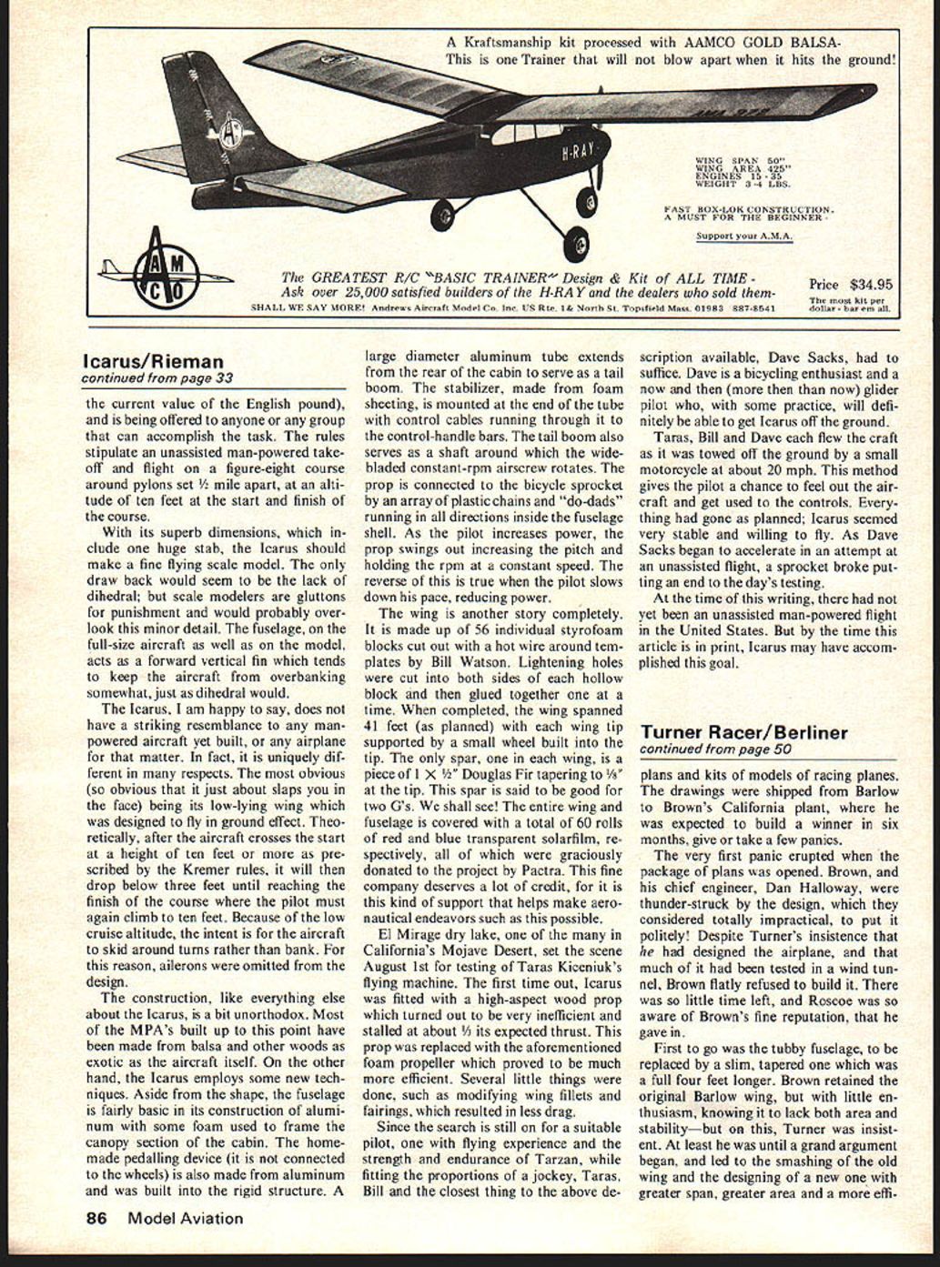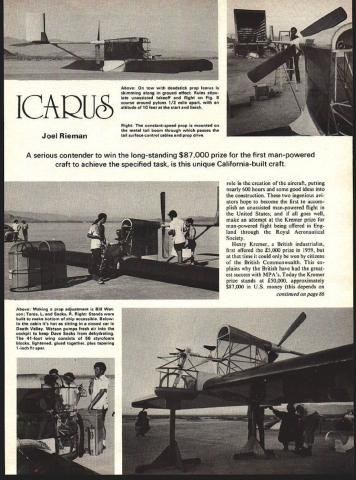 NEARLY ALL categories found governing pages AMA rule book have subject revisions new ideas concepts relating form model aircraft gradually evolve com petitive events Five years ago RC heli copters impractical Martian landing today skeptics eating hats would have believed P-nut scale would rage pylon freaks building Whatever case new concepts modifica tions old make hobby-sport interesting largest widening single category recent years appears have come scale events such P-nut elec tric scale Model viation Aug 76 top charts Scale modelers other type modeler seem thrive adversity whether culti vating new event searching design out norm havent already will probably run across modeler slaps down set self-drawn 3-views aircraft no has heard supposedly made short flight ah pick year year tucked away some barn Eastern Siberia sincere enthusiast threatens build man-size Sleek Streak may long before innova tive Xacto twiddlers have event fly being scale models manpowered aircraft MPA true comparatively few MPAs have built let alone flown growing interest man-powered flight movement United States dumb-founded modeler very likely find such project stimulating enough duplicate small such pioject now being tested Southern California Icarus manpowered aircraft designed Taras Ki ceniuk engineering student designer popular Icarus series rigid wing hand gliders have seen skim ming slopes across country Fellow aeronaut Bill Watson also played large 32 Model Aviation Dave Sacks controls Icarus towed above hard dry surface El Mirage dry lake about 20 mph Ship will cruise 3-foot alti tude designed skid around turns rather bankhence no ailerons Left Taras Kiceniuk inventor eyes small hole wing designer rigid wing Icarus hang gliders Right talented P-Nut RC glider flier Bill Watson tapes plastic drop bottom Icarus attempt reduce drag Below takeoff position Icarus wing barely clears ground JCAQUS Right constant-speed prop mounted metal tail boom through passes Joel Riemantail surface control cables prop drive serious contender win long-standing $87000 prize first man-powered craft achieve specified task unique California-built craft role creation aircraft putting nearly 600 hours some good ideas construction two ingenious avi ators hope become first accom plish unassisted man-powered flight United States goes well make attempt Kremer prize man-powered flight being offered Eng land through Royal Aeronautical Society Henry Kremer British industrialist first offered 5000 prize 1959 time could won citizens British Commonwealth ex plains British have great est success MPAs Today Kremer prize stands 50000 approximately $87000 US money depends continued page 86 Above Making prop adjustment Bill Wat son Taras 1 Sacks R Right Stands built make bottom ship accessible Below cabin its hot sitting closed car Death Valley Watson pumps fresh air cockpit keep Dave Sacks dehydrating 41 -foot wing consists 56 styrofoam blocks lightened glued together plus tapering 1-inch fir spar Above On tow deadstick prop Icarus skimming along ground effect Rules stipu late unassisted takeoff flight Fig 8 course around pylons 1/2 mile apart altitude 10 feet start finish current value English pound being offered anyone group can accomplish task rules stipulate unassisted man-powered take off flight figure-eight course around pylons set apart alti tude ten feet start finish course its superb dimensions clude huge stab Icarus should make fine flying scale model draw back would seem lack dihedral scale modelers gluttons punishment would probably over look minor detail fuselage full-size aircraft well model acts forward vertical fin tends keep aircraft overbanking somewhatjust dihedral would Icarus am happy say does have striking resemblance manpowered aircraft yet built airplane matter fact uniquely dif ferent respects obvious obvious just about slaps face being its low-lying wing designed fly ground effect Theo retically after aircraft crosses start height ten feet pre scribed Kremer rules will drop below three feet until reaching finish course pilot must again climb ten feet Because low cruise altitude intent aircraft skid around turns rather bank reason ailerons omitted design construction like everything else about Icarus bit unorthodox Most MPAs built up point have made balsa other woods exotic aircraft itself other hand Icarus employs some new tech niques Aside shape fuselage fairly basic its construction alumi num some foam used frame canopy section cabin home made pedalling device connected wheels also made aluminum built rigid structure large diameter aluminum tube extends rear cabin serve tail boom stabilizer made foam sheeting mounted end tube control cables running through control-handle bars tail boom also serves shaft around wide bladed constant-rpm airscrew rotates prop connected bicycle sprocket array plastic chains do-dads running directions inside fuselage shell As pilot increases power prop swings out increasing pitch holding rpm constant speed reverse true pilot slows down pace reducing power wing another story completely made up 56 individual styrofoam blocks cut out hot wire around tem plates Bill Watson Lightening holes cut both sides hollow block glued together time completed wing spanned 41 feet planned wing tip supported small wheel built tip spar wing piece X /2 Douglas Fir tapering spar said good two 6s shall see entire wing fuselage covered total 60 rolls red blue transparent solarfilm re spectively graciously donated project Pactra fine company deserves lot credit kind support helps make aero nautical endeavors such possible El Mirage dry lake Californias Mojave Desert set scene August 1st testing Taras Kiceniuks flying machine first time out Icarus fitted high-aspect wood prop turned out very inefficient stalled about its expected thrust prop replaced aforementioned foam propeller proved much efficient Several little things done such modifying wing fillets fairings resulted less drag Since search still suitable pilot 