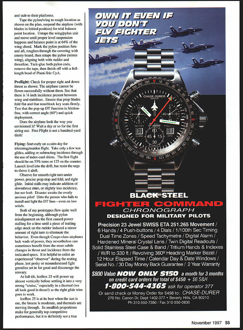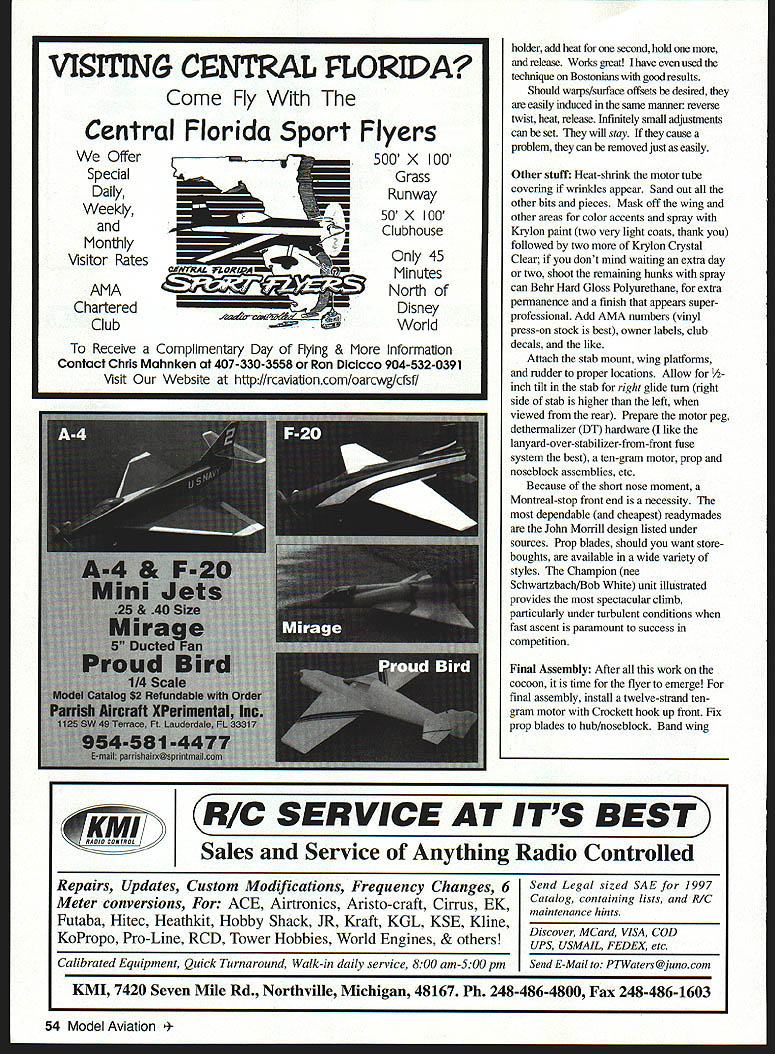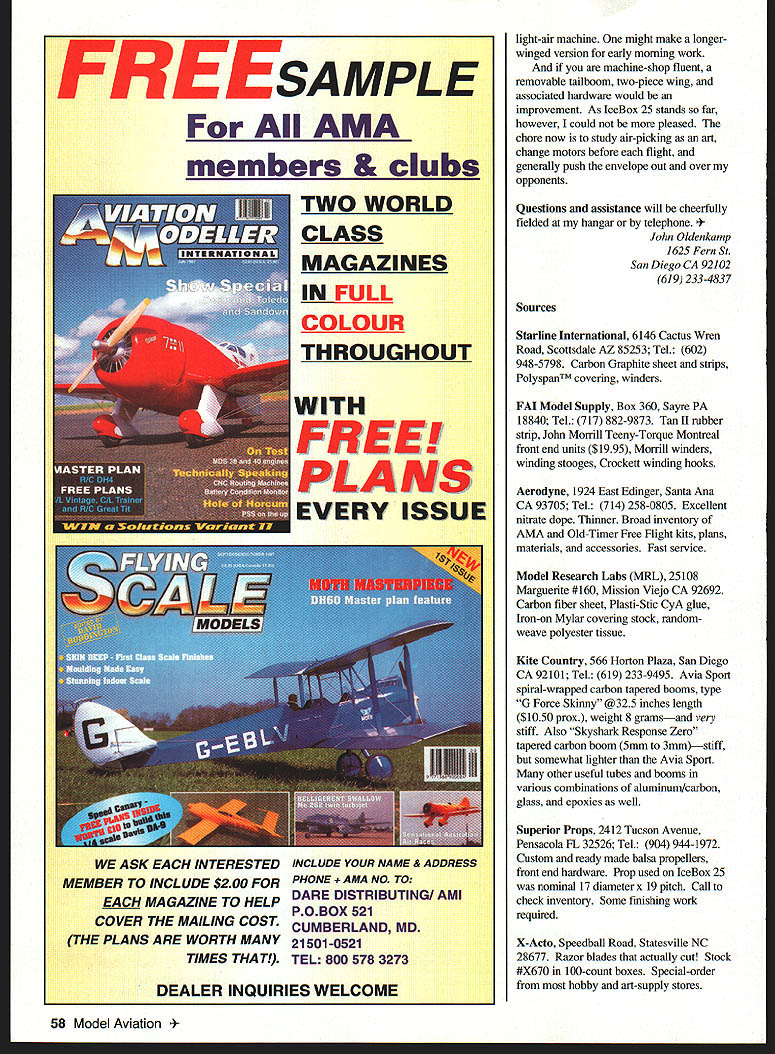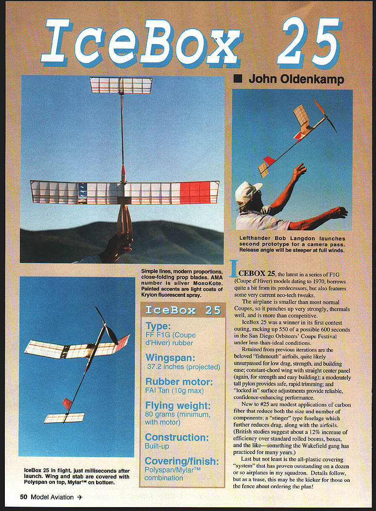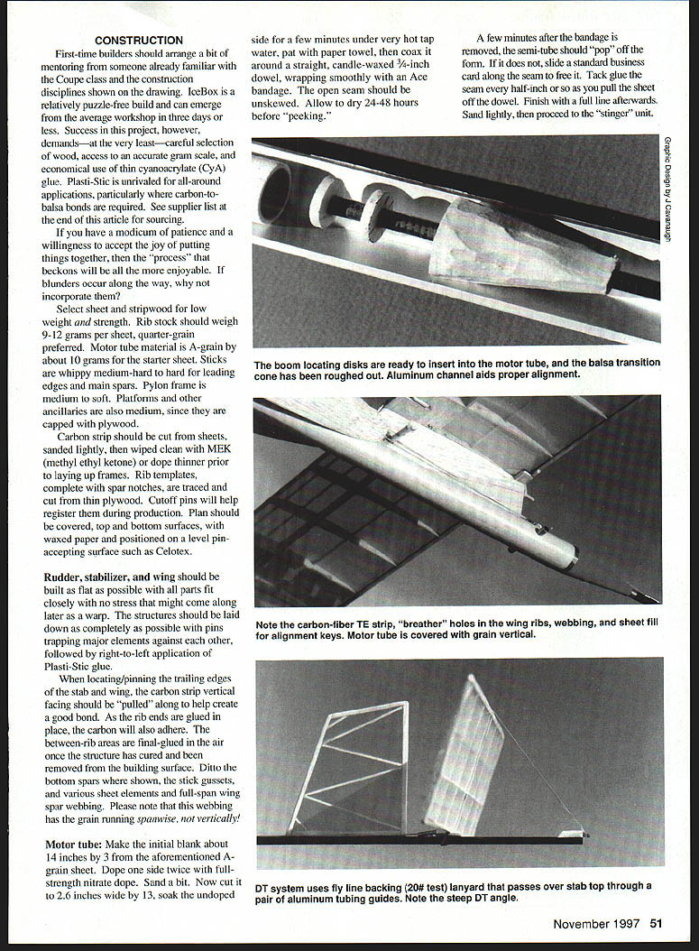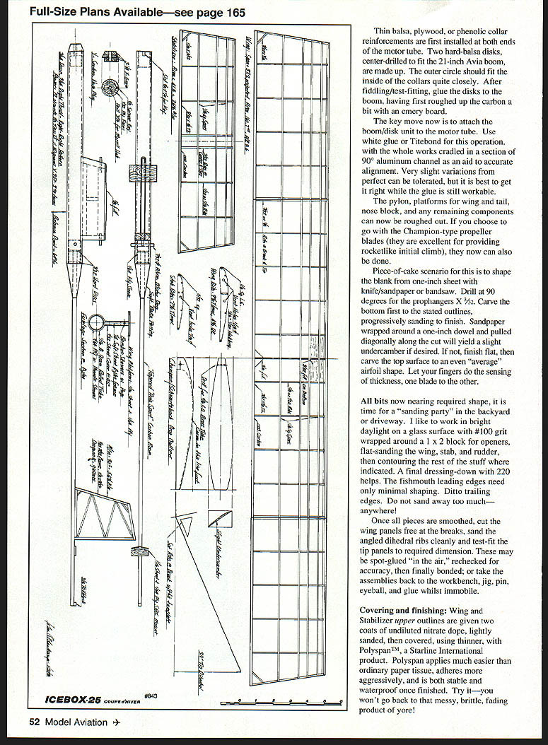 IceBox 25 flight just milliseconds after launch Wing stab covered Polyspan top MylarTil bottom U s 1gm C ant spray Coupe rubber ries projected r motor log max Flying weight 80 grams minimum motor Construction BuIIF-up Covering/finish Polyspan/MyiarTM combination estin dating essoi hi ech twea mailer es Un very c ipSSO tee deal con previous itera ith ajifoils quil v drag strengtu rd wing sIr ii easy buik es safe rapid trir surface adjushnents e nhancing performai w #25 modest applications carbon fiber reduce both size number components sfinger type fuselage further reduces drag along airfoils British studies suggest about 12% increase efficiency over standard rolled booms boxes likesomething Wakefield gang has practiced years Last least all-plastic covering system has proven outstanding dozen airplanes squadron Details follow tease may kicker fence about ordering plan 50 Model Aviation TRUCTION First-time builders should arrange bit mentoring someone already familiar Coupe class construction disciplines shown drawing IceBox relatively puzzle-free build can emerge average workshop three days less Success project however demandsat very leastcareful selection wood access accurate gram scale economical use thin cyanoacrylate CyA glue Plasti-Stic unrivaled all-around applications particularly carbon-tobalsa bonds required See supplier list end article sourcing have modicum patience willingness accept joy putting things together process beckons will enjoyable blunders occur along way incorporate Select sheet stripwood low weight strength Rib stock should weigh 9-12 grams per sheet quarter-grain preferred Motor tube material A-grain about 10 grams starter sheet Sticks whippy medium-hard hard leading edges main spars Pylon frame medium soft Platforms other ancillaries also medium since capped plywood Carbon strip should cut sheets sanded lightly wiped clean MEK methyl ethyl ketone dope thinner prior laying up frames Rib templates complete spar notches traced cut thin plywood Cutoff pins will help register during production Plan should covered top bottom surfaces waxed paper positioned level pinaccepting surface such Celotex Rudder stabilizer wing should built flat possible parts fit closely no stress might come along later warp structures should laid down completely possible pins trapping major elements against other followed right-to-left application Plasti-Stic glue locating/pinning trailing edges stab wing carbon strip vertical facing should pulled along help create good bond As rib ends glued place carbon will also adhere between-nb areas final-glued air once structure has cured removed building surface Ditto bottom spars shown stick gussets various sheet elements full-span wing spar webbing Please note webbing has grain running spanwise vertically Motor tube Make initial blank about 14 inches 3 aforementioned Agrain sheet Dope side twice fullstrength nitrate dope Sand bit Now cut 26 inches wide 13 soak undoped side few minutes under very hot tap water pat paper towel coax around straight candle-waxed 3¼-inch dowel wrapping smoothly Ace bandage open seam should unskewed Allow dry 24-48 hours before peeking few minutes after bandage removed semi-tube should pop off form does slide standard business card along seam free Tack glue seam half-inch pull sheet off dowel Finish full line afterwards Sand lightly proceed stinger unit November 1997 51 boom locating disks ready insert motor tube balsa transition cone has roughed out Aluminum channel aids proper alignment Note carbon-fiber TE strip breather holes wing ribs webbing sheet fill alignment keys Motor tube covered grain vertical DT system uses fly line backing 20# test lanyard passes over stab top through pair aluminum tubing guides Note steep DT angle Full-Size Plans Availablesee page 165 0 -l 4 K H I I N r L #043 ICEBOX25 COUPE dEI VIA F r 11 V F 7/ f iN N p L Thin balsa plywood phenolic collar reinforcements first installed both ends motor tube Two hard-balsa disks center-drilled fit 21-inch Avia boom made up outer circle should fit inside collars quite closely After fiddling/test-fitting glue disks boom having first roughed up carbon bit emery board key move now attach boom/disk unit motor tube Use white glue Titebond operation whole works cradled section 90 aluminum channel aid accurate alignment Very slight variations perfect can tolerated best get right glue still workable pylon platforms wing tail nose block remaining components can now roughed out choose go Champion-type propeller blades excellent providing rocketlike initial climb now can also done Piece-of-cake scenario shape blank one-inch sheet knife/sandpaper bandsaw Drill 90 degrees prophangers X 3A2 Carve bottom first stated outlines progressively sanding finish Sandpaper wrapped around one-inch dowel pulled diagonally along cut will yield slight undercamber desired finish flat carve top surface average airfoil shape Let fingers sensing thickness blade other bits now nearing required shape time sanding party backyard driveway like work bright daylight glass surface #100 grit wrapped around x 2 block openers flat-sanding wing stab rudder contouring rest stuff indicated final dressing-down 220 helps fishmouth leading edges need minimal shaping Ditto trailing edges sand away too much anywhere Once pieces smoothed cut wing panels free breaks sand angled dihedral ribs cleanly test-fit tip panels required dimension may spot-glued air rechecked accuracy finally bonded take assemblies back workbench jig pin eyeball glue whilst immobile Covering finishing Wing Stabilizer upper outlines given two coats undiluted nitrate dope lightly sanded covered using thinner PolyspanTM Starline International product Polyspan applies much easier ordinary paper tissue adheres aggressively both stable waterproof once finished Try ityou wont go back messy brittle fading product yore 52 Model Aviation get Polyspan reasonably smooth Trim excess new razor blade two dope sand shrink right now because Step Two