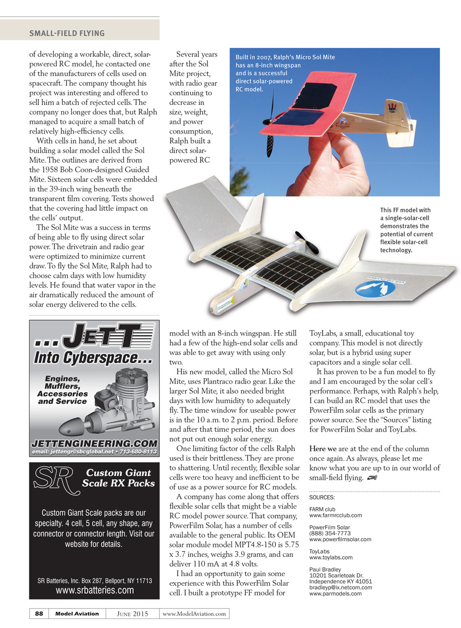 Several years after the Sol Mite project, with radio gear continuing to decrease in size, weight, and power consumption, Ralph built a direct solar-powered RC model with an 8-inch wingspan. He still had a few of the high-end solar cells and was able to get away with using only two.