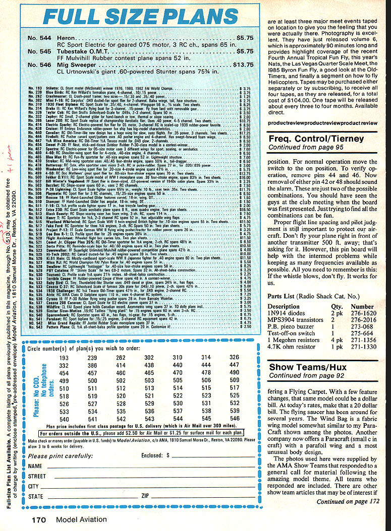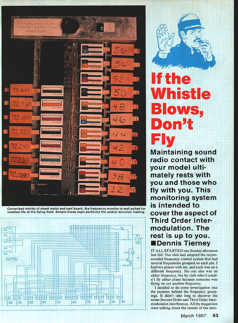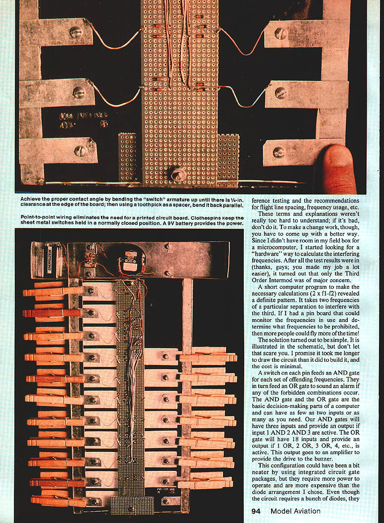 Whistle Blows Dont Fly Maintaining sound radio contact model ulti mately rests fly monitoring system intended coverthe aspect Third Order Intermodulation rest up U Dennis Tierney IT ALL STARTED Sunday afternoon last fall club adopted recom mended frequency control system several frequencies grouped pin two planes different frequency No else either frequency club rules could nt fly either plane because someone flying yet another frequency decided some investigation purpose behind frequency group ings didnt take long discover terms Second Order Third Order Intermodulation interference magazines talking about results interMarch 1987 93 Comprised mainly sheet metal perf board frequency monitor well suited isolated life flying field Simple diode logic performs and/or decision making J _______________ V K TYPE 9914 ii47k Ft PS 3904 ffl 71 90 ] H r 4I ference testing recommendations flight line spacing frequency usage etc terms explanations werent really too hard understand its bad dont make change work though have come up better way Since didnt have room field box microcomputer started looking hardware way calculate interfering frequencies After test results thanks guys made job lot easier turned out Third Order Intermod major concern short computer program make necessary calculations 2 x fl-fl revealed definite pattern takes two frequencies particular separation interfere third pin board could monitor frequencies use de termine what frequencies prohibited people could fly time solution turned out simple illustrated schematic dont let scare promise took longer draw circuit did build cost minimal switch pin feeds AND gate set offending frequencies turn feed OR gate sound alarm forbidden combinations occur AND gate OR gate basic decision-making parts computer can have few two inputs need AND gates will have three inputs provide output input 1 AND 2 AND 3 active OR gate will have 18 inputs provide output 1 OR 2 OR 3 OR 4 etc active output goes amplifier provide drive buzzer configuration could have bit neater using integrated circuit gate packages require power operate expensive diode arrangement chose though circuit requires bunch diodes 94 Model Aviation Achieve proper contact angle bending switch armature up until -In clearance atthe edge board using toothpick spacer bend back parallel Point-to-point wiring eliminates need printed circuit board Clothespins keep sheet metal switches held normally closed position 9V battery provides power dirt-cheap switches /I6 x 1 -in strips made scrap sheet metal duct work housing top board came same piece Any non-conductive ma terial can used back plate also serves switch insulators frequency flag stickers available Ace RC electronic components come Radio Shack Cut stickers down 1 x 2 cutting off space provided fliers name piece x 2-in ply epoxied wooden clothespin marking channel numbers Spring switch contacts appear normally open respect common bus bars along edge pins hold switches closed board Ihere no switches tor channels 12 eu. iwi au mt rence cant 7296 7564 because enter prrtected against unless know its in-band intermod pattern thLre frequencies however should con- test position test-off-on switch sidered totally safe channels because tests battery condition sounding out-of-band transmitters such radio pag- buzzer long switch systems theres near fieldV Continued page 170 March 1987 95 Full-size Plan List Available complete listing plans previously published magazine through NoX5J3 may obtained free charge writing enclose stampedpre-addressed envelope Model Aviation 1810 Samuel Morse Dr Reston VA 22090 emcee memo come me memo memo CnC2 3PleaseNoCOD2-S -~CD m rnNoteephane j orderse o Q0= -2n O-%-.m20 -cw a F SCN-CCflCfl gm C S p p Ni _ _ I _ _ p i - C 02 Cfl C 0 CA1ca0cocacaw02rJ 3CU CS Npcac3NJC--JI Co Cnp..JCNipwccc0 1st3 C Ca C ciacicrcrCrppCaI 0 ar-jC--Ip S Ca -CCa 0 023 C k CI 5C a02cONicnJwC--J02 p Ca Cfl Ni p Ni t mememeCSCOCOCOS@COC0COCOC azzazuarnuuuuuzuazmaaazflrflllfll faaEaEEEEEEEflmnzaazrmurmrn apmpirmCACACACCUCCACA3haeaanabfldwCtJwCJftJ aata-6M CSti 6CM cern sma ~ajernndJflCa-daiatd-C 33 5 CdMCCCflCCaCaJbaJ am eaeacncca uC7 nj Nji iuaj1g5whZ4 fls Tt ~sitsL4sa rAIjrc- iW a--r&a 4CCfnLniSCtE~ Ac E~fl Ca Ca4CCa-aRtt~Ini4[v32]NH] $nflF ~&ofl . . ~rS RE3 4Cm =FCC~ 3Cgt,Cain. -C CCO- arwtaa a- = -a- CaC5tCa ~1i Ca aaaaW~SflCCa C aa-r-a~a-aa aa-a- i:I1i Caa-CaCBaCoa aa25iCa a-a a1a-a- a- CCCC 1ZtACa- X&Ca~CCa-5wC5i5 - aai ja.SAa-Bao3 osnrcirTh oaa- Caj 5 T55jtCO ,aC aCa ~C5 a- 2arrC4a-i =S~ aCCa 1I-.srazxEta-5a5a ai 2a-a5 SC2CoI5 CCo&a-g -2 IR SNC _~aa-aa- 4 -aCaa$.a.a-aCCWSACnC aw jCaBCC~Ca5 C SWCCI&flCra3 a-Ca C a C-ai-ga a-a ia-i9~3$X$ -m0 Ba iICaia-a lsa ia-CaC NC0C CCCCC SI -5Ca 3122aa-a--a~5-a-s NI 5 5-4. C Ca usa-d Cs 1 a- $afla ~ CaIJiIb aRICa iaS [I a9a 3 CI.. IL __I a : a- 5C C C C C----a::: 5 . soOCaCaflnooo COCa CLOCoCCCJCSCCo a- NCCOCa0CC3- Ca-4OCaN4CCC 0CaJCCCaCa--JCOCaCNCCCCCaCO.&acC CoJ0CCJ ONCOCrOfl -JNCrON4CCCA C CaCoCoCC-CoCoCaCoCoCCJCoN0JCaCoCaCo CCOO4C4-J-J CCCJCC3CCaCOCoCo CC CCoCoC~ CA CCC C Ca Ca CCACACJCCCJ C Ca Ca Ca C CCACCACCOC Ca Ca Can CaCa Ca Ca Cii Ca Ca CCC CCACACCC CCC CCC CCC z z 2 PP P c CD 020 rg U 9 -c Ca CD 0 -- i- -C-i n oi - W CD CD Co Ni ~o CD Co.CD -C--i.01.02 -V a- 0 CD 2- 01 0 2 -a0 0 CO Cl CI Cl Cl 01 H 00 CD 0CD - 0 L -t CCDo~ CDCD~SCDCD 0Ca Ca- 0Q~ o oC 0-2r0-CDCDO-CD CD 32C CD 0 oo2A 0020020 NCC0CDCD E-t tato 1-i 00 0 --0 Cr ow Q%% Ccc Nx t 000 CD -t Co c 020 SC CD --Co N ui e N ui Ni prpr Ni Ni Ni Ni Ni Ni Z J 1 3 3 -. tiC Ca 0 0 Ca Ca tiC p 00fr Ni ag 000O CAna O 2 CD -aCaat aj --050 C-C 2zTh 2 a-~ r CD 0 atO ~ CD ~oCD 00 zCDZCD00- o0-0 Pg~t % 0 cWCD CD C- Oat 00 00-00 atCo CD C I 0-n o -q s-fl CD CD 00 00 C7iQ P C C 0 C 0 0 Cc 5 C 0 C 0 0 CD C 0 C 0 C 57 ag InIzmv 002 CD 0 C C 23 D OCCD5CDCIC0O-CDoCD oo~-&CD s CD -c v r 0 CD OS CD &CD WCDa -a - r-z -ccEL2o p Zo 2 3 o CD CD aB 020-C C o o02 O.-CDOc Dcc C CD C CO CCDcacoCDCDCO3 VCDacp2 a23 0 2cc D CD-Ca- .ffiCD --CD 0 0 o 2J0 CD CD - CD.30 02 CD