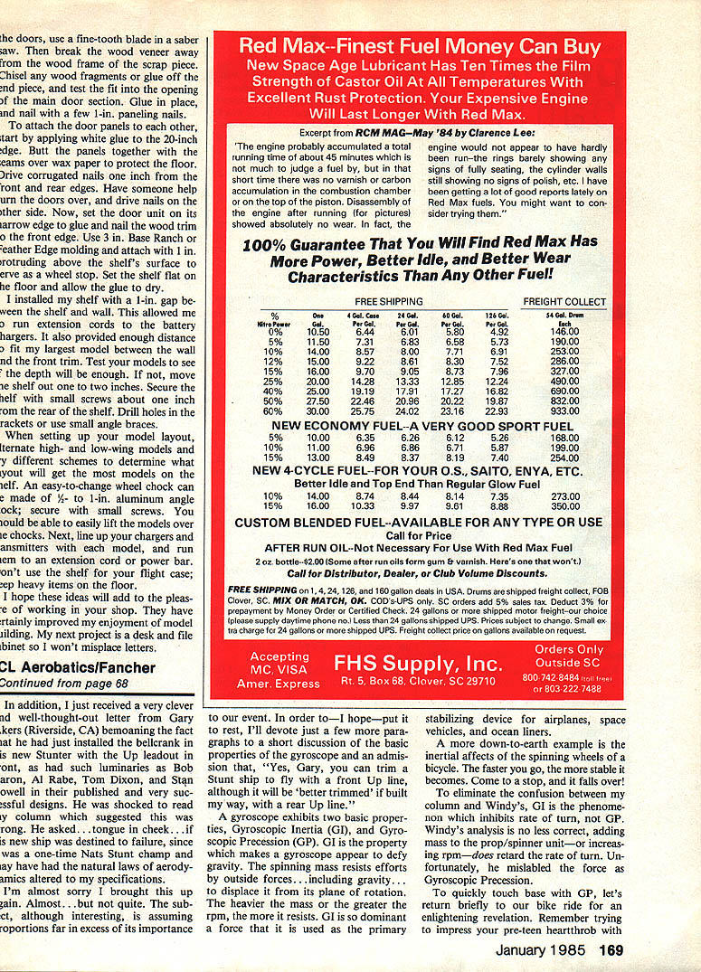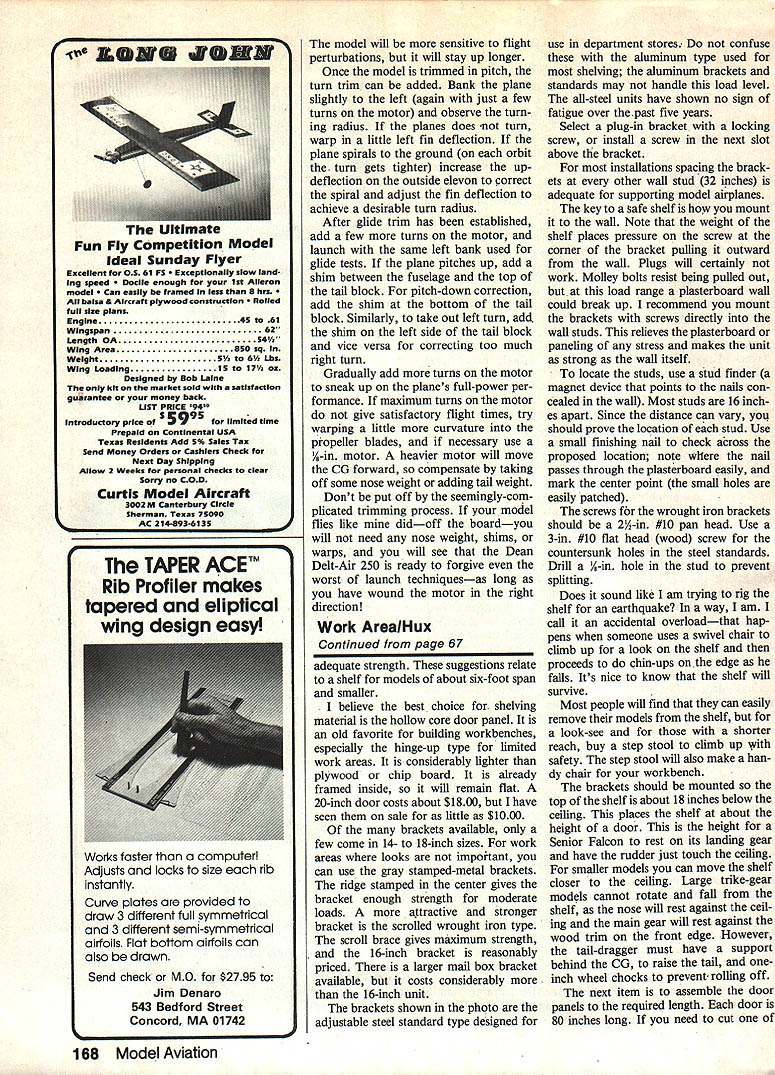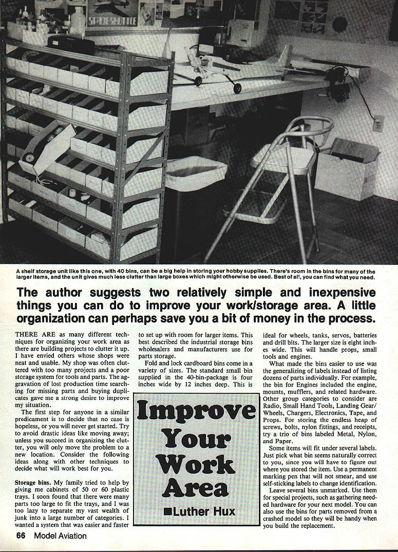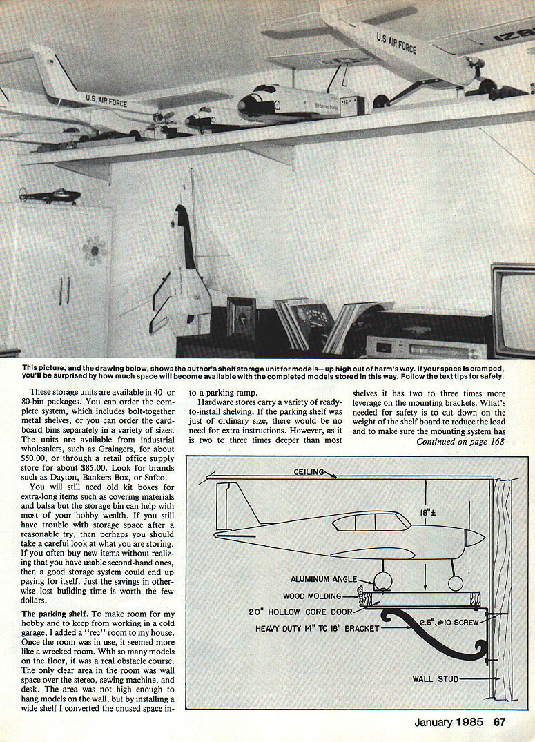 A shelf storage unit like 40 bins can big heip storing hobby supplies Theres room bins iarger items unit gives much iess ciutterthan iarge boxes might otherwise used Best al can find what need author suggests two relatively simple inexpensive things can improve worklstorage area little organization can perhaps save bit money process THERE ARE different tech niques organizing work area building projects clutter up have envied others shops neat usable shop often clut tered too projects poor storage system tools parts ag gravation lost production time search ing missing parts buying dupli cates gave strong desire improve situation first step anyone similar predicament decide no case hopeless will never get started Try avoid drastic ideas like moving away unless succeed organizing clut ter will move problem new location Consider following ideas along other techniques decide what will work best Storage bins family tried help giving cabinets 50 60 plastic trays soon found parts too large fit trays too lazy separate vast wealth junk large number categories wanted system easier faster set up room larger items best described industrial storage bins wholesalers manufacturers use parts storage Fold lock cardboard bins come variety sizes standard small bin supplied 40-bin-package four inches wide 12 inches deep ideal wheels tanks servos batteries drill bits larger size eight inch es wide will handle props small tools engines What made bins easier use generalizing labels instead listing dozens parts individually example bin Engines included engine mounts mufflers related hardware Other group categories consider Radio Small Hand Tools Landing Gear Wheels Chargers Electronics Tape Props storing endless heap screws bolts nylon fittings receipts try trio bins labeled Metal Nylon Paper Some items will fit under several labels Just pick what bin seems naturally correct since will have figure out stored item Use permanent marking pen will smear use self-sticking labels change identification Leave several bins unmarked Use special projects such gathering need ed hardware next model can also use bins parts removed crashed model will handy build replacement 86 Model Aviation picture drawing below showsthe authors shelf storage unitfor modelsup high out harms way lfyourspace cramped youll surprised much space will become available completed models stored way Follow text tips safety storage units available 40- 80-bin packages can order com plete system includes bolt-together metal shelves can order card board bins separately variety sizes units available industrial wholesalers such Graingers about $5000 through retail office supply store about $8500 Look brands such Dayton Bankers Box Safco will still need old kit boxes extra-long items such covering materials balsa storage bin can help hobby wealth still have trouble storage space after reasonable try perhaps should take careful look what storing often buy new items realiz ing have usable second-hand ones good storage system could end up paying itself Just savings other wise lost building time worth few dollars parking shelf make room hobby keep working cold garage added rec room house Once room use seemed like wrecked room models floor real obstacle course clear area room wall space over stereo sewing machine desk area high enough hang models wall installing wide shelf converted unused space parking ramp Hardware stores carry variety readyto-install shelving parking shelf just ordinary size would no need extra instructions However two three times deeper shelves has two three times leverage mounting brackets Whats needed safety cut down weight shelf board reduce load make sure mounting system has Continued page 168 I-eu u WOOl MOLDING January1985 67 7 2O HOLLOW CORE DOORI HEAVY DUTY 14 TD 18 BRACKET WALL STUD %e LONS oztaO model Will sensitive flight perturbations will stay up longer Once model trimmed pitch turn trim can added Bank plane slightly left again just few turns motor observe turn ing radius planes does turn warp little left fin deflection plane spirals ground orbit turn gets tighter increase updeflection outside elevon correct spiral adjust fin deflection achieve desirable turn radius After glide trim has established add few turns motor launch same left bank used glide tests plane pitches up add shim between fuselage top tail block pitch-down correction add shim bottom tail block Similarly take out left turn add shim left side tail block vice versa correcting too much right turn Gradually add turns motor sneak up planes full-power per formance maximum turns motor give satisfactory flight times try warping little curvature propeller blades necessary use A-in motor heavier motor will move CO forward compensate taking off some nose weight adding tail weight Dont put off seemingly-com plicated trimming process model flies like didoff boardyou will need nose weight shims warps will see Dean Delt-Air 250 ready forgive worst launch techniquesas long have wound motor right direction Work ArealHux Continued page 67 use department stores confuse aluminum type used shelving aluminum brackets standards may handle load level all-steel units have shown no sign fatigue over past five years Select plug-in bracket locking screw install screw next slot above bracket installations spacing brack ets other wall stud 32 inches adequate supporting model airplanes key tafe shelf mount wall Note weight shelf places pressure screw corner bracket pulling outward wall Plugs will certainly work Molley bolts resist being pulled out load range plasterboard wall could break up recommend mount brackets screws directly wall studs relieves plasterboard paneling stress makes unit strong wall itself locate studs use stud finder magnet device points nails con cealed wall Most studs 16 inch es apart Since distance can vary should prove location stud Use small finishing nail check across proposed location note nail passes through plasterboard easily mark center point small holes easily pa