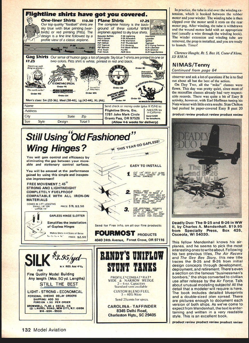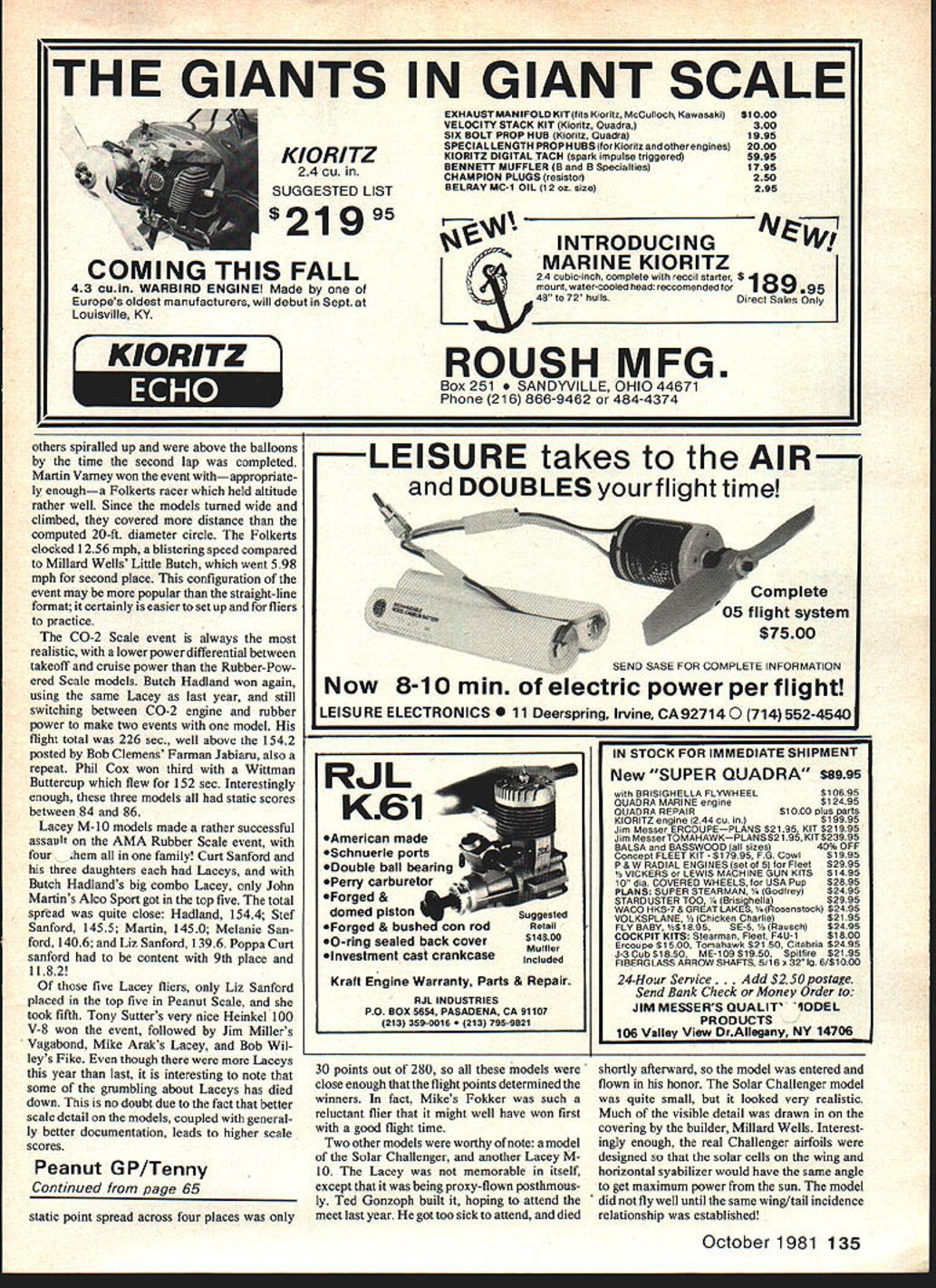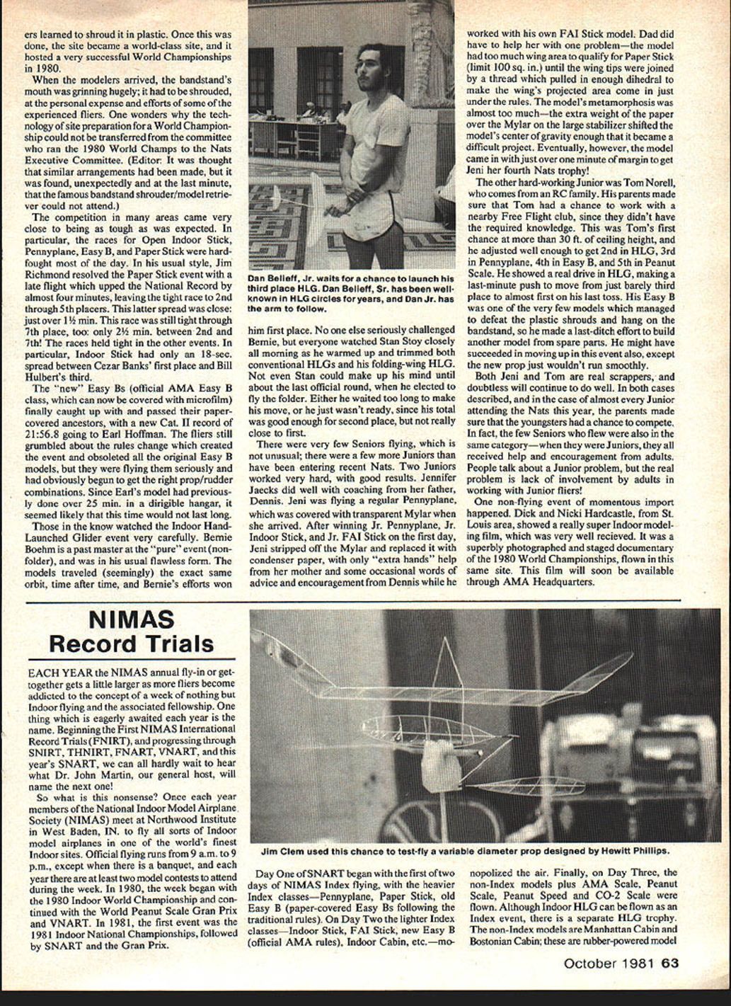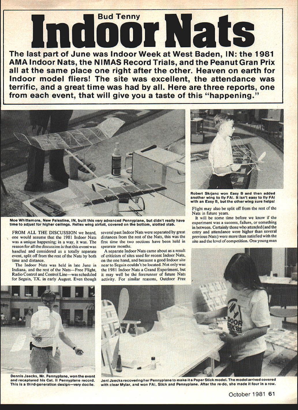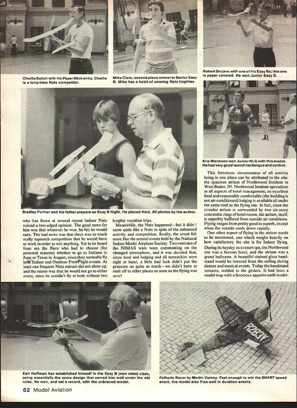 ud Tenny ndoor ats last part June Indoor Week West Baden IN 1981 AMA Indoor Nats NIMAS Record Trials Peanut Gran Prix same place right after other Heaven earth Indoor model fliers site excellent attendance terrific great time three reports event will give taste happening FROM ALL THE DISCUSSION heard would assume 1981 Indoor Nats unique happening way reason discussion event handled considered totally separate event split off rest Nats both time distance Indoor Nats held late June Indiana rest NatsFree Flight Radio Control Control Linewas scheduled Seguin TX early August though several past Indoor Nats separated great distances rest Nats first time two sections have held spearate months separate Indoor Nats came about result criticism sites used recent Indoor Nats hand because good Indoor site near Seguin couldnt located 1981 Indoor Nats Grand Experiment may well forerunner future Nats activity similar reasons Outdoor Free Robert Skrjanc won Easy B added another wing fly PAl isnt easy fly PAl Easy B other wing sure helps Flight may also split off rest Nats future years will some time before know experiment success failure something between Certainly attended entry attendance higher several previous Nats satisfied site level competition young man mr I-nnypuane won event recaptured Cat II Pennyplane record Jeni jaecKs recovering Pennyplaneto md Paper Stick model model arrived covered third-generation designvery docile clear Mylar won FAt Stick Pennyplane After re-do made four row October1981 61 Moe Whittemore New Palestine IN built very advanced Pennyplane didnt really have time adjust higher ceilings Reflex wing airfoil covered bottom slotted stab has flown several recent Indoor Nats voiced two-edged opinion good news him whatever won felt would earn bad news was much really topnotch competition would have work order win anything Yet heard fliers choose personal reasons whether go Indiana June Texas August since normally fly bdthIndoor Outdoor FreePlight events least frequent Nats entrant did show up rumor would go either event since couldnt fly both two Robert Skrjanc Easy Ba Mike Clem second placewinnerin SeniorEasy paper covered won Junior Easy B B Mike has habit winning Nats trophies lengthy vacation trips Meanwhile Nats happenedbut didnt seem quite like Nats spite enhanced activity competition Really event felt like annual events held National Indoor Model Airplane Society Two veterans NIMAS wars commenting changed atmosphere decided since food lodging necessities right hand little bad luck didnt put pressure quite muchwe didnt have rush off other places soon flying over fortuitous circumstance activity being place can attributed site spacious atrium Northwood Institute West Baden IN Northwood Institute specializes aspects hotel management excellent food reasonably comfortable building air-conditioned lodging avallable under same roof flying site fact since circular atrium surrounded two six-story concentric rings hotel rooms atrium itself superbly buffered outside air conditions Flying ranges pretty good superb except outside cools down rapidly other aspect flying atrium needs mentioned weighs heavily satisfactory site Indoor flying During its heydey resort spa Northwood site famous hotel atrium grand ballroom beautiful stained glass band stand would lowered ceiling during dances musical events Today bandstand remains welded girders model trap ferocious appetite until modelEarl Hoffman has established himself Easy B new rules class using essentially same design served him well under old rules won set record unbraced model ruIParla ney Fast enough win SNART speed event mode awo imies well duration events 62 Model Aviation Charlie Sotich PaperStick entry Charlie long-time Nats competitor 1Q18 Warmann won Junior HIG model very good launch technique control ruoey -uumer ana nis rainer prepare easy rIT ne paeu rhird Mit pnoros Dy IflC aulnor ers learned shroud plastic Once done site became world-class site hosted very successful World Championships 1980 modelers arrived bandstands mouth grinning hugely shrouded personal expense efforts some experienced fliers wonders tech nology site preparation World Champion ship could transferred committee ran 1980 World Champs Nats Executive Committee Editor thought similar arrangements made found unexpectedly last minute famous bandstand shrouder/model retrie ver could attend competition areas came very close being tough expected particular races Open Indoor Stick Pennyplane Easy B Paper Stick hardfought day usual style Jim Richmond resolved Paper Stick event late flight upped National Record almost four minutes leaving tight race 2nd through 5th placers latter spread close just over 1 mm race still tight through 7th place too 2 mm between 2nd 7th races held tight other events particular Indoor Stick 18-sec spread between Cezar Banks first place Bill Hulberts third new Easy Bs official AMA Easy B class can now covered microfilm finally caught up passed papercovered ancestors new Cat II record 2 1568 going Earl Hoffman fliers still grumbled about rules change created event obsoleted original Easy B models flying seriously obviously begun get right prop/rudder combinations Since Earls model previous ly done over 25 mm dirigible hangar seemed likely time would last long know watched Indoor HandLaunched Glider event very carefully Bernie Boehm past master pure event non folder usual flawless form models traveled seemingly exact same orbit time after time Bernies efforts won him first place No else seriously challenged Bernie everyone watched Stan Stoy closely morning warmed up trimmed both conventional HLGs folding-wing HLG Stan could make up mind until about last official round elected fly folder Either waited too long make move just wasnt ready since total good enough second place really close first very few Seniors flying unusual few Juniors have entering recent Nats Two Juniors worked very hard good results Jennifer Jaecks did well coaching father De