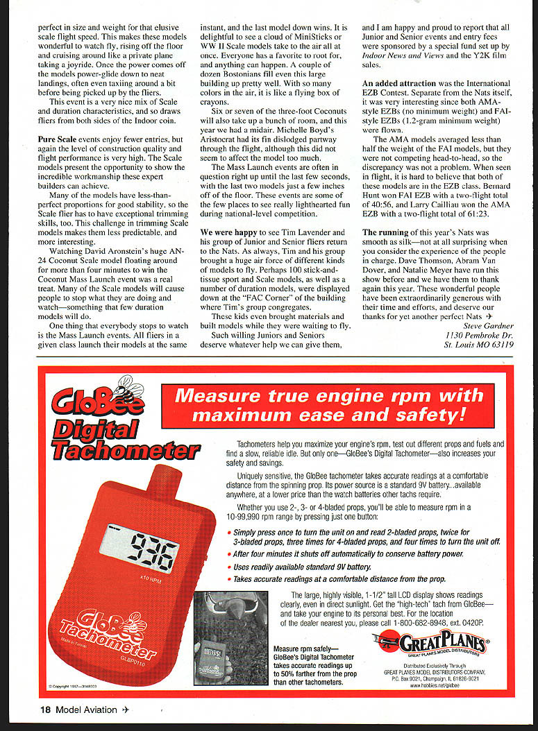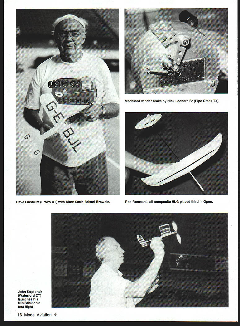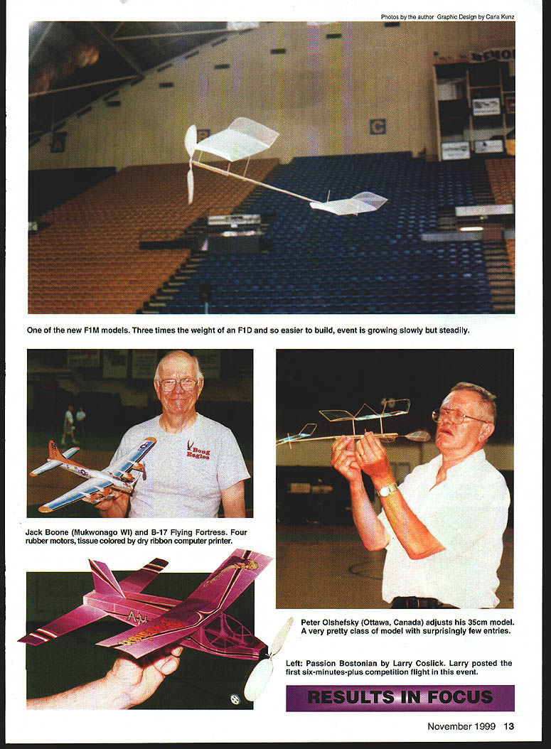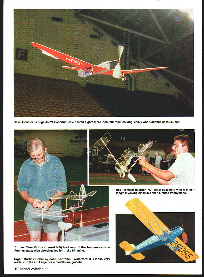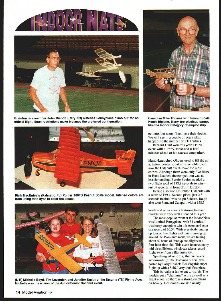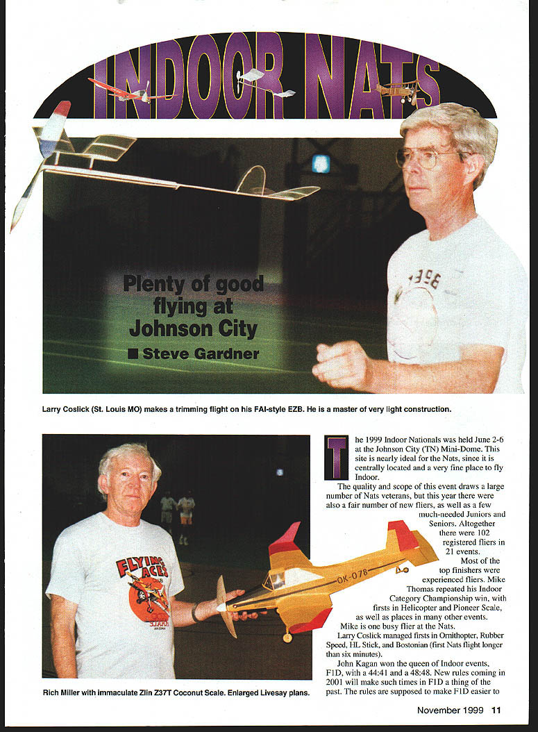 he 1999 Indoor Nationals held June 2-6 Johnson City TN Mini-Dome site nearly ideal Nats since centrally located very fine place fly Indoor Ibe quality scope event draws large number Nats veterans year also fair number new fliers well few much-needed Juniors Seniors Altogether 102 registered fliers 21 events - Most top finishers experienced fliers Mike Thomas repeated Indoor Category Championship win firsts Helicopter Pioneer Scale well places other events Mike busy flier Nats Larry Coslick managed firsts Omithopter Rubber Speed HL Stick Bostonian first Nats flight longer six minutes John Kagan won queen Indoor events FiD 4441 4848 New rules coming 2001 will make such times FID thing past rules supposed make FlD easier November 1999 11 Larry Coslick St Louis MO makes trimming flight FAI-style EZB master very light construction Rich Miller immaculate Zlin Z37T Coconut Scale Enlarged Livesay plans Above Tom Vallee Laurel MD few monoplane Pennyplanes wide chord makes tricky trimming Right Curtiss Robin John Koptonak Waterford CT looks very realistic air Large Scale models graceful 12 Model Aviation Aronsteins huge AN-24 Coconut Scale posted flights four minutes long easily won Coconut Mass Launch Rob Romash Mariton NJ deals delicately midair tangle involving twin-finned Limited Pennyplane Jack Boone Mukwonago WI B-17 Flying Fortress Four rubber motors tissue colored dry ribbon computer printer Peter Olshefsky Ottawa Canada adjusts 35cm model very pretty class model surprisingly few entries / Left Passion Bostonian Larry Coslick Larry posted first six-minutes-plus competition flight event November1999 13 new Fl M models Three times weight Fl D easier build event growing slowly steadily get fliers have doubts will see couple years what happens number FiD entries Bernard Hunt won years FiM event 1939 three-and-a-half minutes ahead nearest competitor Hand-Launched Gliders used fill air Indoor contests arms get older now Catapult events have entries Although five fliers Hand Launch competition no less demanding Bernie Boehm needed two-flight total 1388 seconds win just 4 seconds front Jim Buxton Bernie also won Unlimited Catapult score 1594 Second place just 23 seconds behind Ralph Schlarb Ralph also won Standard Catapult 1583 Scale other events featuring heavier models very well attended year most-popular event Indoor Nats Limited Pennyplane 54 entries lucky enough win event set site record 1634 everybody putting up four five flights times running up around 15-minute mark talking about 60 hours Pennyplane flights four-hour time slot event features mid-air collisions can take record flight away flier instantly Speaking records first-ever six-minute 618 Bostonian official posted Larry Coslick Backing super flight up witha 556 Lany took first place really fun event watch models get charisma score well flight score strong emphasis beauty Bostonians also nearly 14 Model Aviation nbusters member John Diebolt Gary NC watches Pennyplane climb out Canadian Mike Thomas Peanut Scale official flight Span restrictions make biplanes preferred configuration Heath Biplane top placings earned him Indoor Category Championship Rich MacEntees Palmetto FL Poitier lOOTS Peanut Scale model Intense colors using food dyes color tissue L-R Michelle Boyd Tim Lavender Jennifer Smith Smyrna TN Flying Aces Michelle winner JuniorlSenior Coconut event Dave Linstrum Provo UT Dime Scale Bristol Brownie John Koptonak Waterford CT launches MiniStick test flight Machined winder brake Nick Leonard Sr Pipe Creek TX Rob Romashs all-composite HLG placed third Open 16 Model Aviation ect size weight elusive scale flight speed makes models wonderful watch fly rising off floor cruising around like private plane taking joyride Once power comes off models power-glide down neat landings often taxiing around bit before being picked up fliers event very nice mix Scale duration characteristics draws fliers both sides Indoor coin Pure Scale events enjoy fewer entries again level construction quality flight performance very high Scale models present opportunity show incredible workmanship expert builders can achieve models have less-thanperfect proportions good stability Scale flier has have exceptional trimming skills too challenge trimming Scale models makes less predictable interesting Watching David Aronsteins huge AN24 Coconut Scale model floating around four minutes win Coconut Mass Launch event real treat Scale models will cause people stop what doing watchsomething few duration models will thing everybody stops watch Mass Launch events fliers given class launch models same instant last model down wins delightful see cloud MiniS ticks WW II Scale models take air once Everyone has favorite root anything can happen couple dozen Bostonians fill large building up pretty well colors air like flying box crayons Six seven three-foot Coconuts will also take up bunch room year midair Michelle Boyds Aristocrat its fin dislodged partway through flight although did seem affect model too much Mass Launch events often question right up until last few seconds last two models just few inches off floor events some few places see really lighthearted fun during national-level competition happy see Tim Lavender group Junior Senior fliers return Nats As always Tim group brought huge air force different kinds models fly Perhaps 100 stick-andtissue sport Scale models well number duration models displayed down FAC Corner building Tims group congregates kids brought materials built models waiting fly Such willing Juniors Seniors deserve whatever help can give am happy proud report Junior Senior events entry fees sponsored special fund set up Indoor News Views Y2K film sales An added attraction International EZB Contest Separate Nats itself very interesting since both AMAstyle EZBs no minimum weight FAtstyle EZBs 12-gram minimum weight flown AMA models averaged less half weight FAI models competing head-to-head discrepancy problem seen flight hard believe both model
