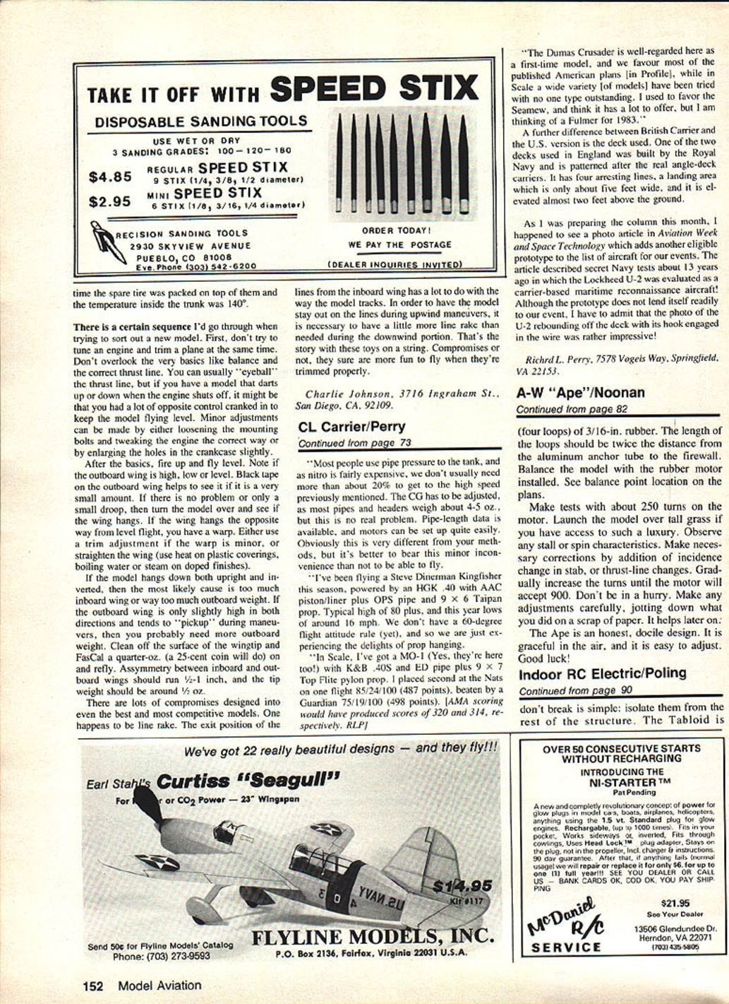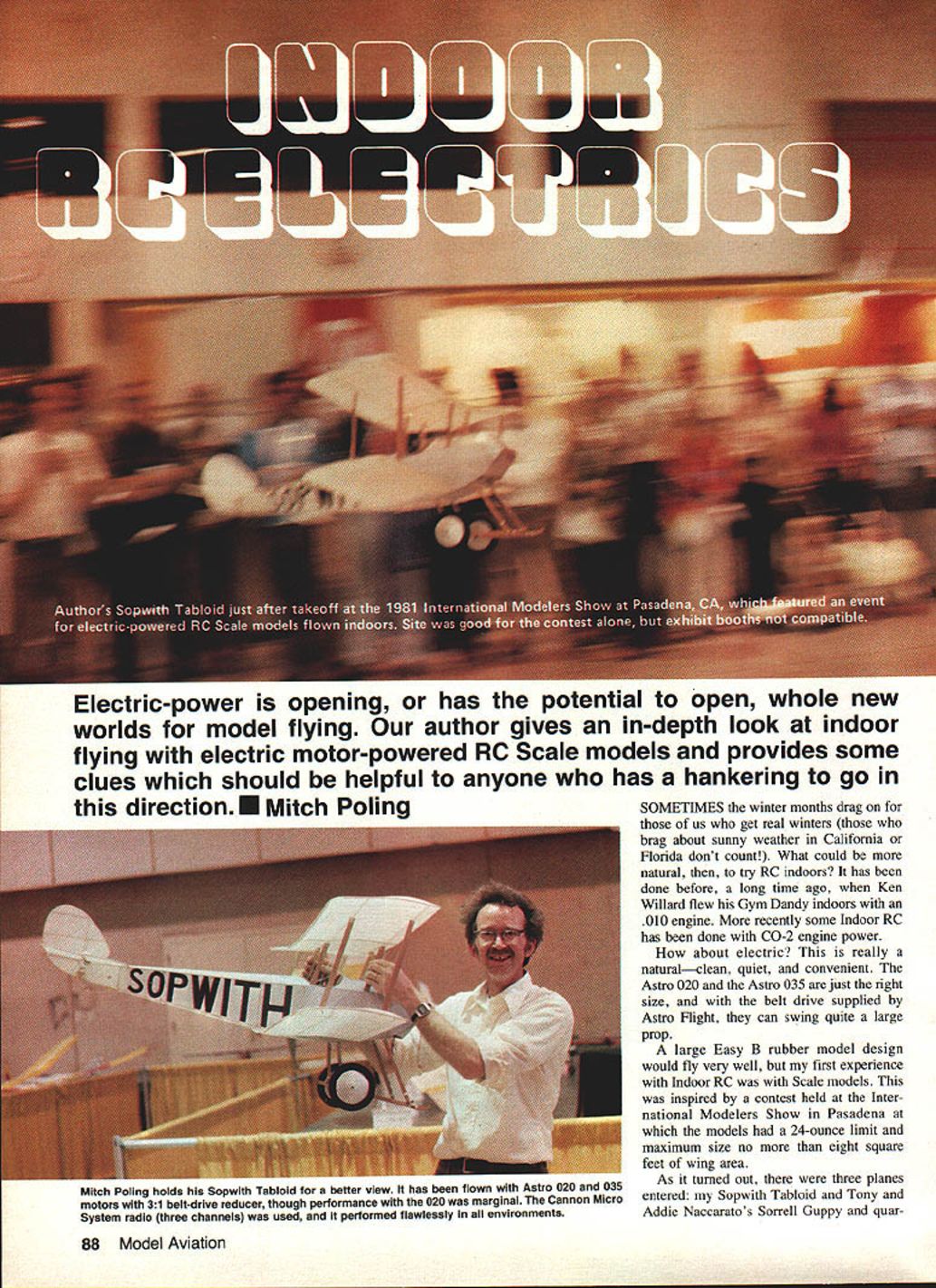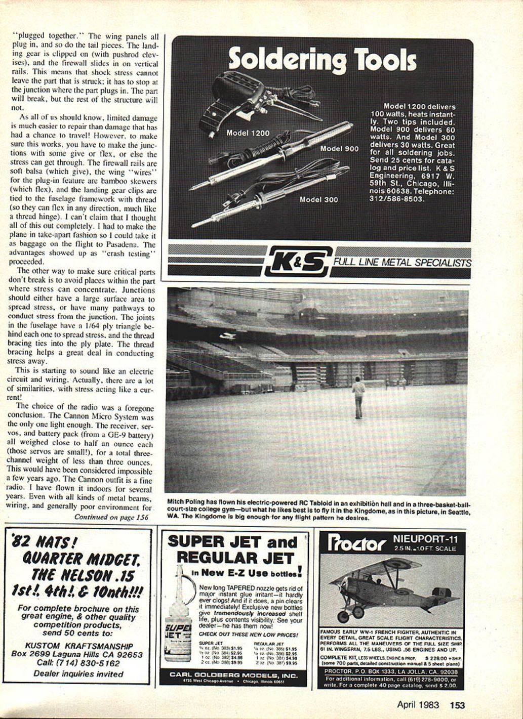 Electric-power opening has potential open whole new worlds model flying author gives in-depth look indoor flying electric motor-powered RC Scale models provides some clues should helpful anyone has hankering go direction U Mitch Poling SOMETIMES winter months drag us get real winters brag about sunny weather California Florida dont count What could natural try RC indoors has done before long time ago Ken Willard flew Gym Dandy indoors 010 engine recently some Indoor RC has done CO-2 engine power about electric really naturalclean quiet convenient Astro 020 Astro 035 just right size belt drive supplied Astro Flight can swing quite large prop large Easy B rubber model design would fly very well first experience Indoor RC Scale models inspired contest held Inter national Modelers Show Pasadena models 24-ounce limit maximum size no eight square feet wing area As turned out three planes entered Sopwith Tabloid Tony Addie Naccaratos Sorrell Guppy quar 88 Model Aviation Mitch Poling holds Sopwith Tabloid better view has flown Astro 020 035 motors 31 belt-drive reducer though performance 020 marginal Cannon Micro System radio three channels used performed flawlessly environments ter scale Farman Mosquito planes flew well Farman par ticularly impressive event really historic first proved Indoor RC Scale both pos sible practical whole new world plane floats air much like huge Peanut Scale model Pumpkin Scale everything has slow dreamlike quality flights usually five six minutes long seem much longer Thats because pilot anxiety just reverse Its because beauty flight fact makes appreciate subtlety flight quite unexpected way almost have say have see lieve have flown Tabloid both threebasketball-court college gym Kingdome enormous domed stadium Seattle college gym flights mostly circling flights due room Kingdome fantasticflights over 100 feet high flying speed about jog gers pace could easily keep up plane wanted Sound interesting Perhaps might like try too approaches Tony Addie used get success fact success first tries initial challenge pick plane sure would fly well effort involved would very discouraging first try didnt work built Tabloid before flown very well Astro 020 historic documentation Tabloid agreed full-scale plane delight fly pilots airplane think really important real flew well find model also will planned use three controls rudder ele vator motor prototype Tabloid first flown 1913 no ailerons used wing warping fitted well plans didnt care landing skids prototype go along As turned out skids help smoothed out bad landings prevented damage prop motor firewall Next came philosophical part Again experience counted lot have flown lot Peanut Scale models felt Peanut Scale approach structure would right onethat minimum structure doubt leave out early airplanes Tabloid good example exactly philos ophy because low-power engines much like ultralights today Studying way real Tabloid built tremendous help pioneers really under stood build light make building decisions used same structures real As turned out Indoor RC model almost exactly true scale internally because al forced strength weight requirements As example structure cable braced polyester sewing thread adds really amazing strength resis tance shock almost no weight penApril 1983 89 Tony Addle Naccaratos Sorrell Guppy its lifelike profile pilot figure successfully flown indoors U Show also has flown outdoors Mile Square Tony Addle used same approaches author described text large lightweight structures Internal structure Tabloid almost exactly same full-scale prototype Early full-scale designers needed strong lightweight structures low-power engines best-flying RC Scale electric-powered models U Show Tony Addle Nac caratos Farman Moustique models follow Peanut Scale philosophy doubt leave out alty brings up last part philos ophy resistance shock crashes took approach some parts plane sacrificial others im portant should break unless things really drastic sacrificial parts plane landing gear motor firewall center sec tion top wing easy repair must break parts fuselage except firewall wing panels tail surfaces philosophy has tested quite se verely though willingly works have broken landing gear fireFinished wing tail surfaces Tabloid Curved outlines lami nated 1/32 balsa bent around cardboard form after steaming make jig-type ribs slice Fulton Hungerford pioneered method works well Tabloid models airfoil scale 90 Model Aviation Interplane struts Tabloid clip onto wing spars Carl Goldberg Mini-Snaps pushrods Mini-Snaps tied spars Partial assembly Tabloid framework Its built take-apart sections breaks down wingwall top wing section crashes panels landing gear fuselage rudder stabilizer also helps crash resistanceyou would swear plane could survive collision post flight damage has above quickly repaired slow flight speed helps great deal flies fast jog collisions just dont have lot energy use up way make sure critical parts Continued page 152 Completely assembled Tabloid framework sight beholdand shame cover weighed 13 oz after covering less radio power unit Fuselage uses 1/8 sq balsa throughout Note thread bracing functionalmakes lightweight strong structure TAKE IT OFF WITH SPEED STIX DISPOSABLE SANDING TOOLSIA 53 USE WET OR DRY 3 SANDING GRADES 100 120 1803 REGULAR SPEED STIXII $4859 STIX 1/4 3/8 1/2 diameter $295 MINI SPEED STIX 8 STIX 1/8 3/16 1/4 diameter RECISION SANDING TOOLS 2930 SKYVIEW AVENUE PUEBLO CO 81008 Eve Phone linat 42-6200 time spare tire packed top temperature inside trunk 1400 certain sequence Id go through trying sort Out new model First dont try tune engine trim plane same time Dont overlook very basics like balance correct thrust line can usually eyeball thrust line have model darts up down engine shuts off might lot opposite control cranked keep model flying level Minor adjustments can made either loosening mounting bolts tweaking engine correct way enlarging holes crankcase slightly After basics fire up fly level No