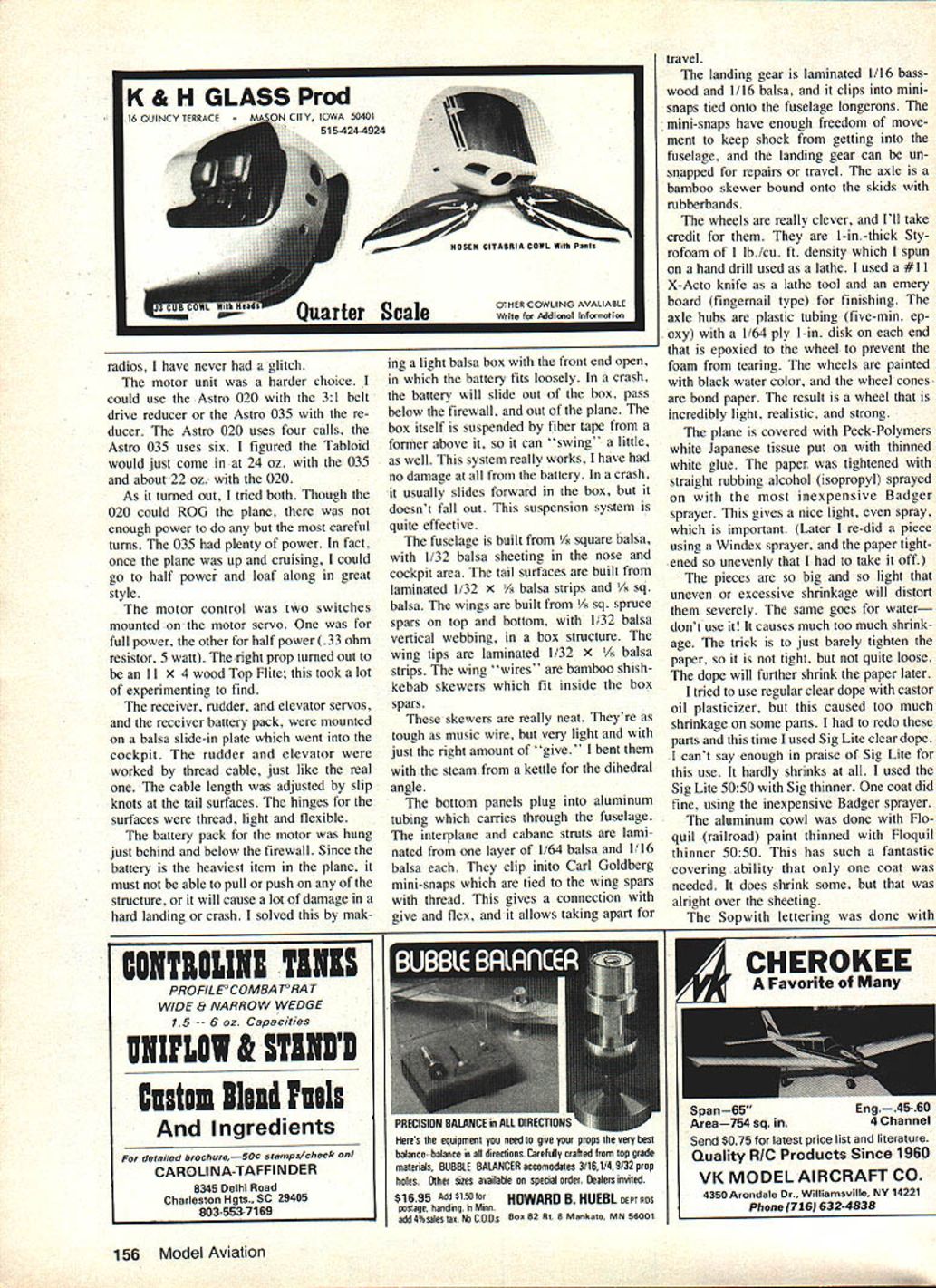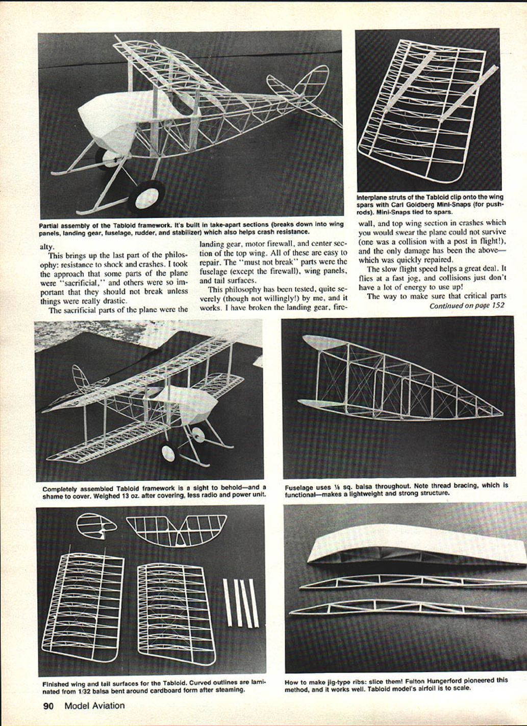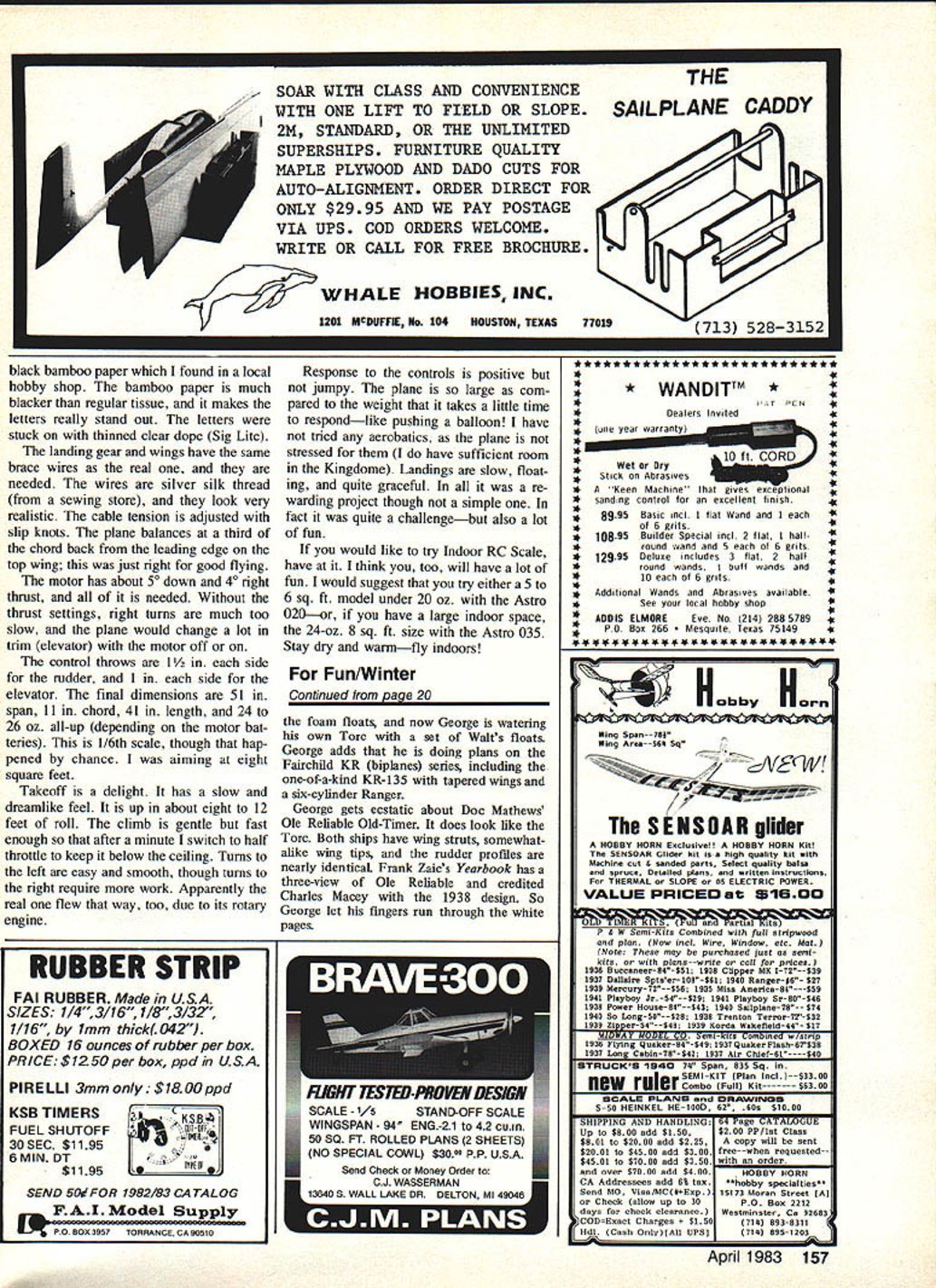 Electric-power opening has potential open whole new worlds model flying author gives in-depth look indoor flying electric motor-powered RC Scale models provides some clues should helpful anyone has hankering go direction U Mitch Poling SOMETIMES winter months drag us get real winters brag about sunny weather California Florida dont count What could natural try RC indoors has done before long time ago Ken Willard flew Gym Dandy indoors 010 engine recently some Indoor RC has done CO-2 engine power about electric really naturalclean quiet convenient Astro 020 Astro 035 just right size belt drive supplied Astro Flight can swing quite large prop large Easy B rubber model design would fly very well first experience Indoor RC Scale models inspired contest held Inter national Modelers Show Pasadena models 24-ounce limit maximum size no eight square feet wing area As turned out three planes entered Sopwith Tabloid Tony Addie Naccaratos Sorrell Guppy quar 88 Model Aviation Mitch Poling holds Sopwith Tabloid better view has flown Astro 020 035 motors 31 belt-drive reducer though performance 020 marginal Cannon Micro System radio three channels used performed flawlessly environments ter scale Farman Mosquito planes flew well Farman par ticularly impressive event really historic first proved Indoor RC Scale both pos sible practical whole new world plane floats air much like huge Peanut Scale model Pumpkin Scale everything has slow dreamlike quality flights usually five six minutes long seem much longer Thats because pilot anxiety just reverse Its because beauty flight fact makes appreciate subtlety flight quite unexpected way almost have say have see lieve have flown Tabloid both threebasketball-court college gym Kingdome enormous domed stadium Seattle college gym flights mostly circling flights due room Kingdome fantasticflights over 100 feet high flying speed about jog gers pace could easily keep up plane wanted Sound interesting Perhaps might like try too approaches Tony Addie used get success fact success first tries initial challenge pick plane sure would fly well effort involved would very discouraging first try didnt work built Tabloid before flown very well Astro 020 historic documentation Tabloid agreed full-scale plane delight fly pilots airplane think really important real flew well find model also will planned use three controls rudder ele vator motor prototype Tabloid first flown 1913 no ailerons used wing warping fitted well plans didnt care landing skids prototype go along As turned out skids help smoothed out bad landings prevented damage prop motor firewall Next came philosophical part Again experience counted lot have flown lot Peanut Scale models felt Peanut Scale approach structure would right onethat minimum structure doubt leave out early airplanes Tabloid good example exactly philos ophy because low-power engines much like ultralights today Studying way real Tabloid built tremendous help pioneers really under stood build light make building decisions used same structures real As turned out Indoor RC model almost exactly true scale internally because al forced strength weight requirements As example structure cable braced polyester sewing thread adds really amazing strength resis tance shock almost no weight penApril 1983 89 Tony Addle Naccaratos Sorrell Guppy its lifelike profile pilot figure successfully flown indoors U Show also has flown outdoors Mile Square Tony Addle used same approaches author described text large lightweight structures Internal structure Tabloid almost exactly same full-scale prototype Early full-scale designers needed strong lightweight structures low-power engines best-flying RC Scale electric-powered models U Show Tony Addle Nac caratos Farman Moustique models follow Peanut Scale philosophy doubt leave out alty brings up last part philos ophy resistance shock crashes took approach some parts plane sacrificial others im portant should break unless things really drastic sacrificial parts plane landing gear motor firewall center sec tion top wing easy repair must break parts fuselage except firewall wing panels tail surfaces philosophy has tested quite se verely though willingly works have broken landing gear fireFinished wing tail surfaces Tabloid Curved outlines lami nated 1/32 balsa bent around cardboard form after steaming make jig-type ribs slice Fulton Hungerford pioneered method works well Tabloid models airfoil scale 90 Model Aviation Interplane struts Tabloid clip onto wing spars Carl Goldberg Mini-Snaps pushrods Mini-Snaps tied spars Partial assembly Tabloid framework Its built take-apart sections breaks down wingwall top wing section crashes panels landing gear fuselage rudder stabilizer also helps crash resistanceyou would swear plane could survive collision post flight damage has above quickly repaired slow flight speed helps great deal flies fast jog collisions just dont have lot energy use up way make sure critical parts Continued page 152 Completely assembled Tabloid framework sight beholdand shame cover weighed 13 oz after covering less radio power unit Fuselage uses 1/8 sq balsa throughout Note thread bracing functionalmakes lightweight strong structure TAKE IT OFF WITH SPEED STIX DISPOSABLE SANDING TOOLSIA 53 USE WET OR DRY 3 SANDING GRADES 100 120 1803 REGULAR SPEED STIXII $4859 STIX 1/4 3/8 1/2 diameter $295 MINI SPEED STIX 8 STIX 1/8 3/16 1/4 diameter RECISION SANDING TOOLS 2930 SKYVIEW AVENUE PUEBLO CO 81008 Eve Phone linat 42-6200 time spare tire packed top temperature inside trunk 1400 certain sequence Id go through trying sort Out new model First dont try tune engine trim plane same time Dont overlook very basics like balance correct thrust line can usually eyeball thrust line have model darts up down engine shuts off might lot opposite control cranked keep model flying level Minor adjustments can made either loosening mounting bolts tweaking engine correct way enlarging holes crankcase slightly After basics fire up fly level No