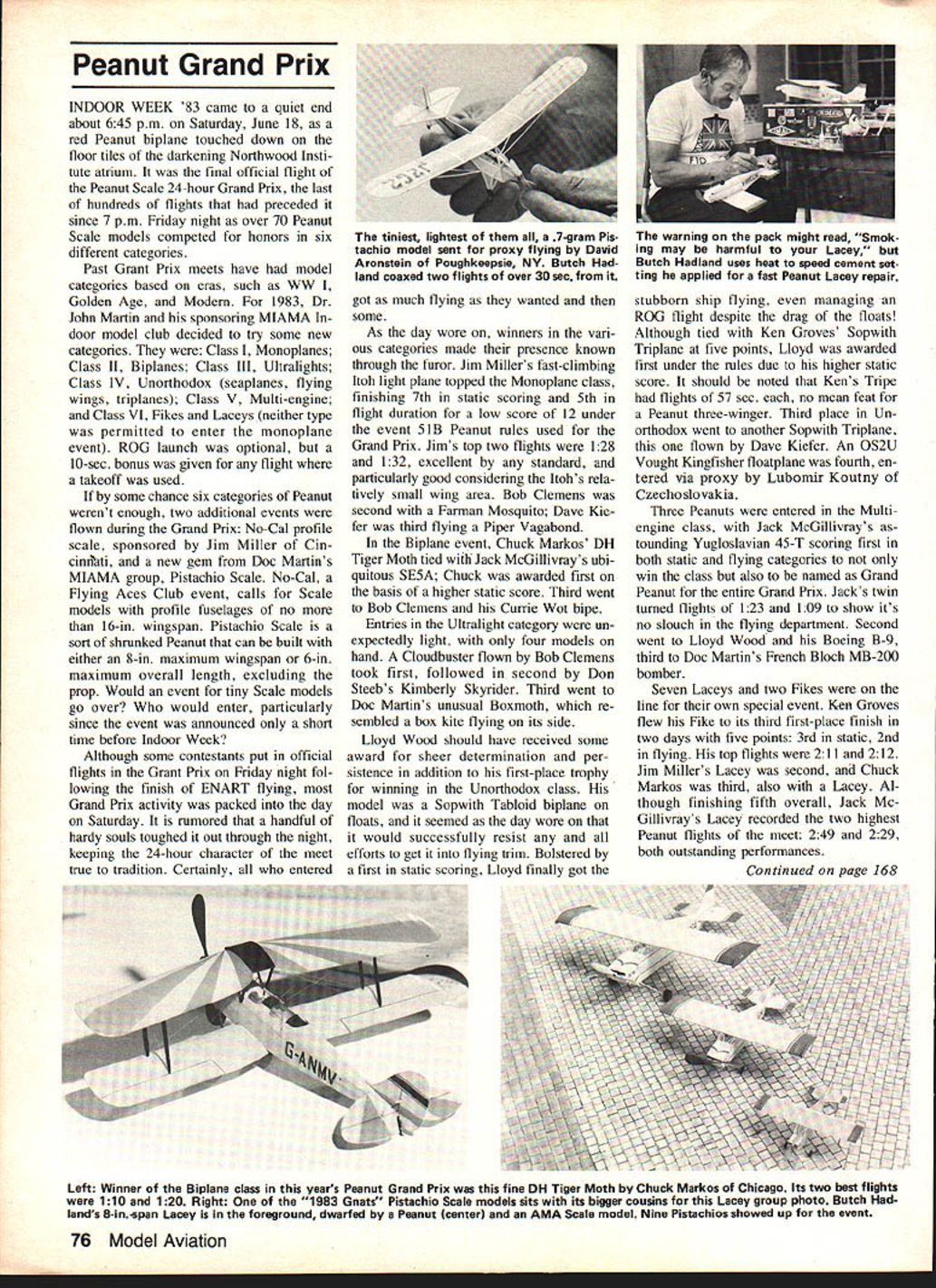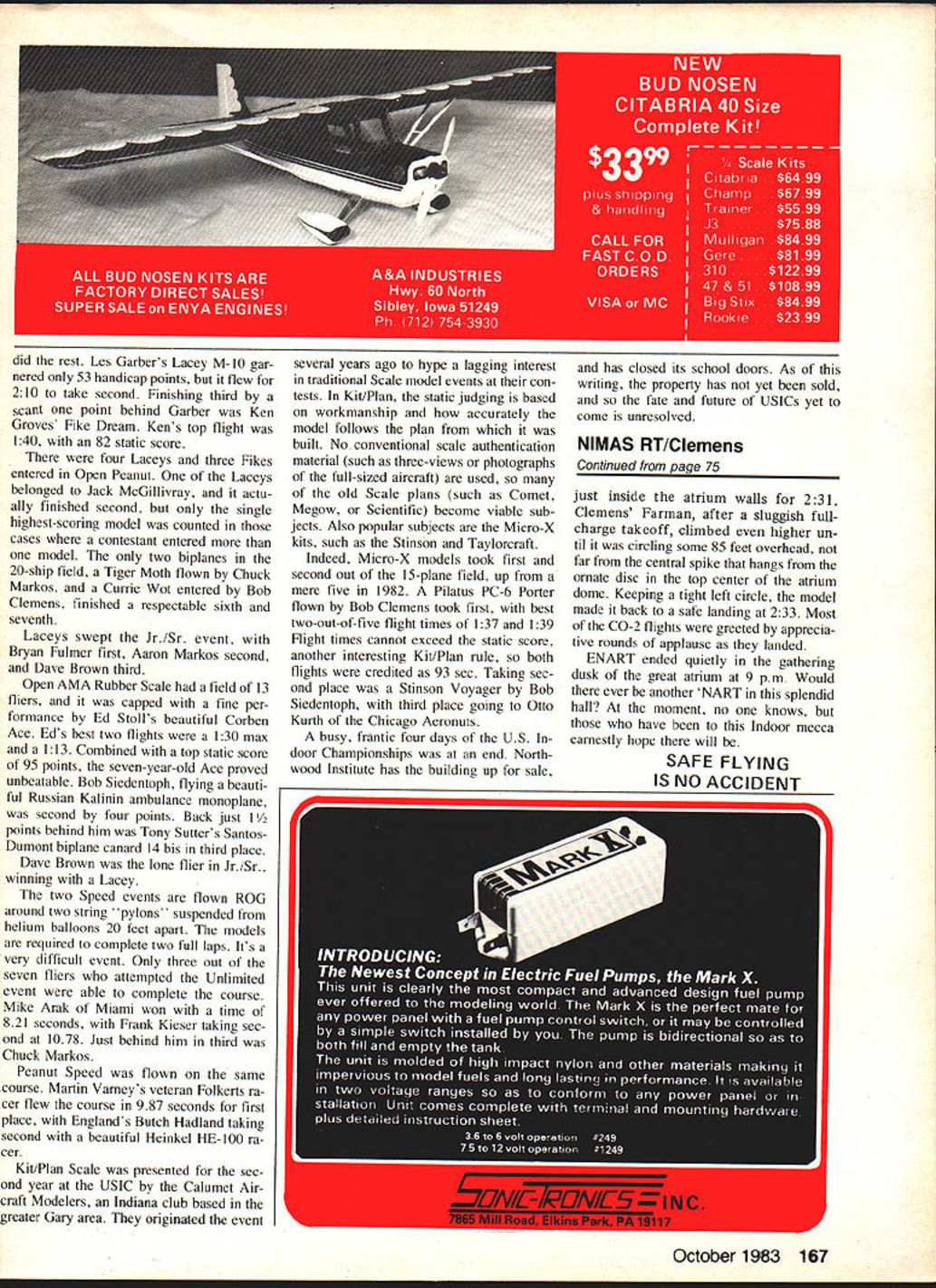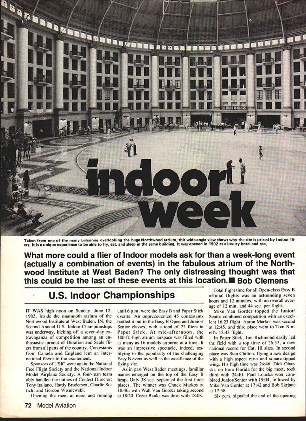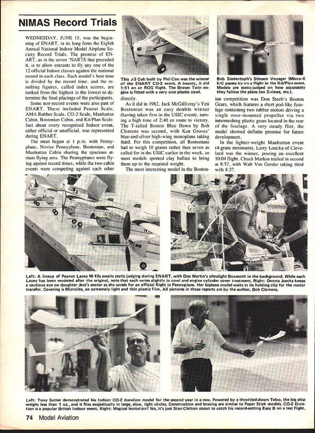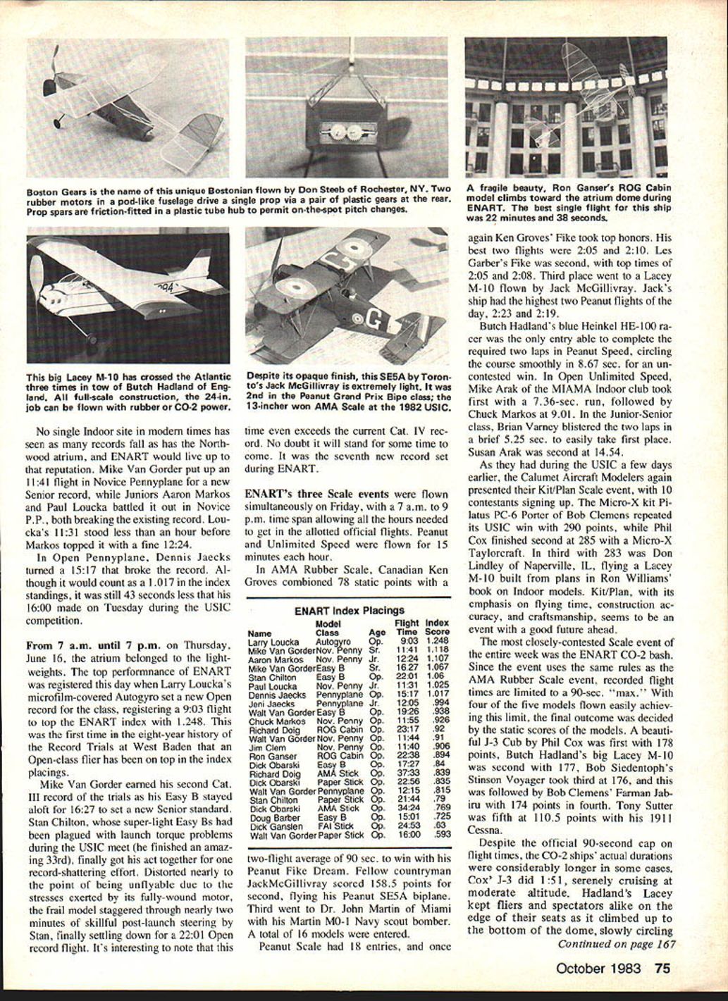 I Taken balconies overlooking huge Northwooa atrium tnis wiae-angie view snows wny tne site prizeo oy mnaoor TEl ers unique experience able fly eat sleep same building opened 1902 luxury hotel spa What could flier Indoor models ask week-long event actually combination events fabulous atrium Northwood Institute West Baden distressing thought could last events IocationE Bob Clemens IT WAS high noon Sunday June 12 1983 Inside mammoth atrium Northwood Institute West Baden IN Second Annual US Indoor Championships underway kicking off seven-day ex travaganza competition among en thusiastic turnout Duration Scale fli ers parts country Contestants Canada England lent inter national flavor excitement Sponsors USIC again National Free Flight Society National Indoor Model Airplane Society four-man team ably handled dutues Contest Director Tony Italiano Hardy Brodersen Charlie So tich Gordon Wisniewski Opening meet noon running until 6 pm Easy B Paper Stick events An unprecedented 45 contestants battled out Easy B Open Junior Senior classes total 22 fliers Paper Stick mid-afternoon 100-ft-high atrium airspace filled 16 models airborne time impressive spectacle indeed tes tifying popularity challenging Easy B event well excellence flying site As past West Baden meetings familiar names emerged top Easy B heap Only 38 sec separated first three places winner Chuck Markos 1846 Walt Van Gorder taking second 1820 Cezar Banks third 1808 72 Model Aviation Total flight time Open-class Easy B official flights astounding seven hours 12 minutes overall aver age 12 mm 44 sec per flight Mike Van Gorder topped Junior Senior-combined competition excel lent 1623 flight Aaron Markos second 1245 third place went Tom Nor elIs 1243 flight Paper Stick Jim Richmond easily led field top time 2657 new national record Cat III sites second place Stan Chilton flying new design high aspect ratio square-tipped wing high time 2446 Dick Obar ski up Florida big meet took third 2440 Paul Loucka won com bined Junior/Senior 1904 followed Mike Van Gorder 1742 Bob Skrjanc 1238 Six pm signaled end opening -J US Indoor Championships Chuck Aaron Markos active fa ther-son team dad holds Aaron dopes trim Lacey built USIC won 2nd later JrISr Peanut Del Ogren has reputation unusual Bos tonian entries canard pusher 1981 Bee Gee 1982 year Coarse Aire What would Pappy Boyington say days official flying atrium turned over FAI fliers FID practice time Competition began again Monday Left All eyes up Ed Stoll attempts retrieve FiD model after caught atrium domes supporting beams 100 ft overhead Hes using helium-filled balloon tached monofilament line fishing pole Right Down comes Eds model wing tail badly damaged Scenes like uncommon midairs ceiling beam hangups Super Pietenpol Air Camper Phil Cox Second place AMA Scale went Rus 26 Peanuts entered Conden- sian Kalinin ambulance plane Bob Sieden ser paper covering dyed orange Has Hun- toph Received 84 static points averaged gerford wheels impeccable craftsmanship 885 sec its best two flights morning 8 am Hand-Launched Glider event Past West Baden heave-ho battles Open class have seen some keen competition between Bernie Boehm flying traditional fixed-wing sheet-balsa glider Stan Stoy amazing folding-wing design Stan missing years meet Bernie again used great arm smooth technique put him well out front nearest competitor put up 1076 eighth official flight Continued page 165 October 1983 73 Left Ron Ganser keeps critical eye FiD microfilm-covered model climbs out just after launching High-torque effects fullywound rubber motor make first few seconds flight very critical Right What Scale modelers have break between flying sessions talk about Scale models coursel Englands genial Scale ace Butch Hadland right Indianas Bob Siedentoph lend ear off-camera Phil Cox during impromptu Scale bull session during lull action Social aspects just important competitions Showing scars flights Pea nut Speed course Martin Varneys Folkerts Foo has moments rest Marty Foo successfully defended Peanut Speed title NIMAS Record Trials WEDNESDAY JUNE 15 begin ning ENART its long form Eighth Annual National Indoor Model Airplane So ciety Record Trials premise ENART seven NARTS preceded allow entrants fly 12 official Indoor classes against national record class models best time divided record time re sulting figures called index scores ranked highest lowest de termine final placings participants Some non-record events also part ENART included Peanut Scale AMA Rubber Scale CO-2 Scale Manhattan Cabin Bostonian Cabin Kit/Plan Scale Just about recognized Indoor event either official unofficial represented during ENART meet began 1 pm Pennyplane Novice Pennyplane Bostonian Manhattan Cabin sharing spacious rium flying area Pennyplanes fly ing against record times two cabin events competing against other directly As did 1982 Jack McGillivrays Yeti Bostonian easy double winner having taken first USIC event turn ing high time 240 en route victory T-tailed Boston Blue flown Bob Clemens second Ken Groves blue-and-silver high-wing monoplane taking third competition Bostonians weigh 10 grams rather seven called USIC earlier week models sported clay ballast bring up required weight interesting model Boston pi ian competition Don Steebs Boston Gears features short pod-like fuse lage containing two rubber motors driving single nose-mounted propeller via two intermeshing plastic gears located rear fuselage very steady flier model showed definite promise future development lighter-weight Manhattan event 4-gram minimum Larry Loucka Cleve land winner posting excellent 1004 flight Chuck Markos trailed second 857 Walt Van Gorder taking third 837 74 Model Aviation J-3 Cub built Phil Cox winner Bob Siedentophs Stinson Voyager Micro-X ENART CO-2 event beauty did kit passes flight Kit/Plan event 151 ROG flight Brown Twin en- Models static-judged accurately gine fitted very nice plastic cowl follow plans no 3-views etc Left lineup Peanut Lacey M-lOs awaits s