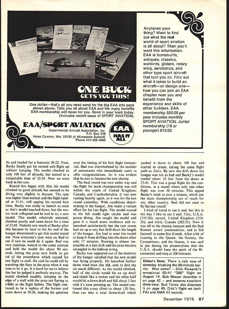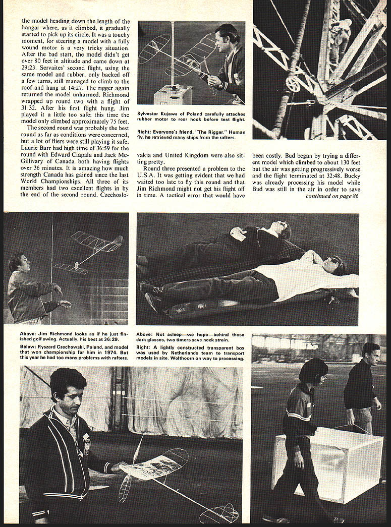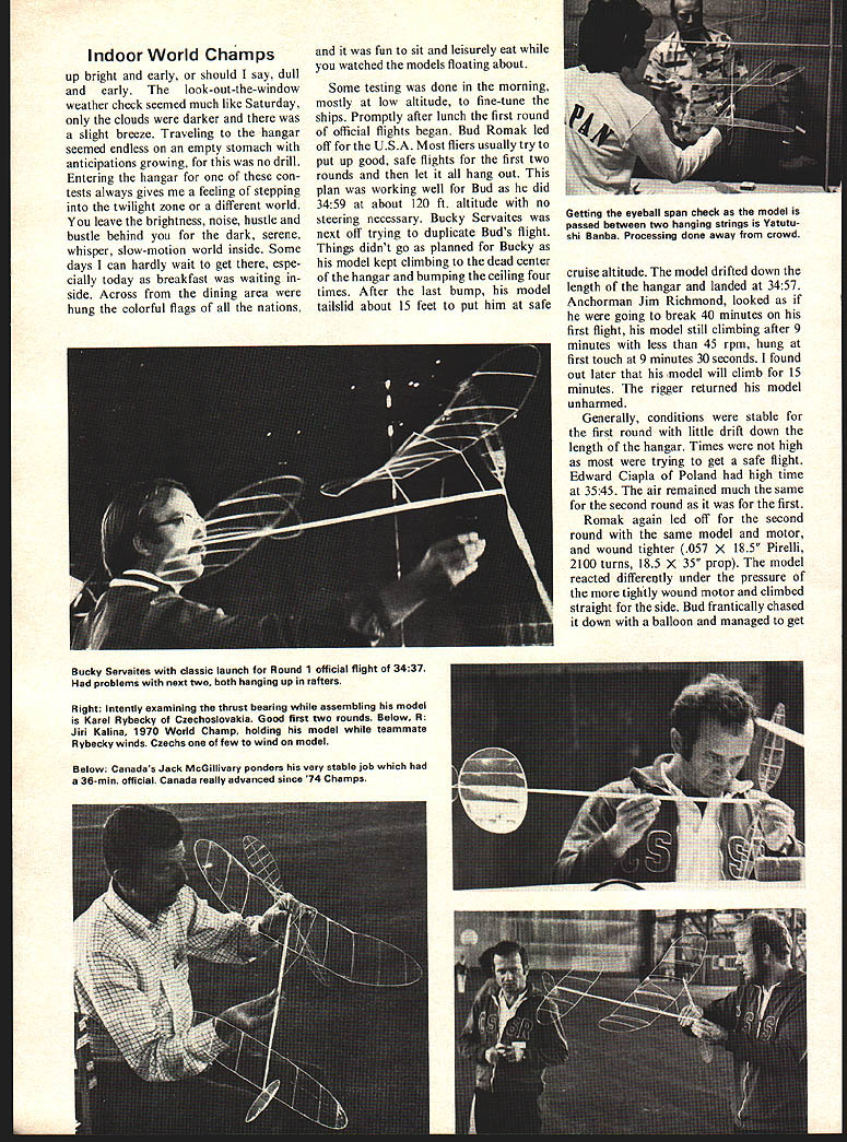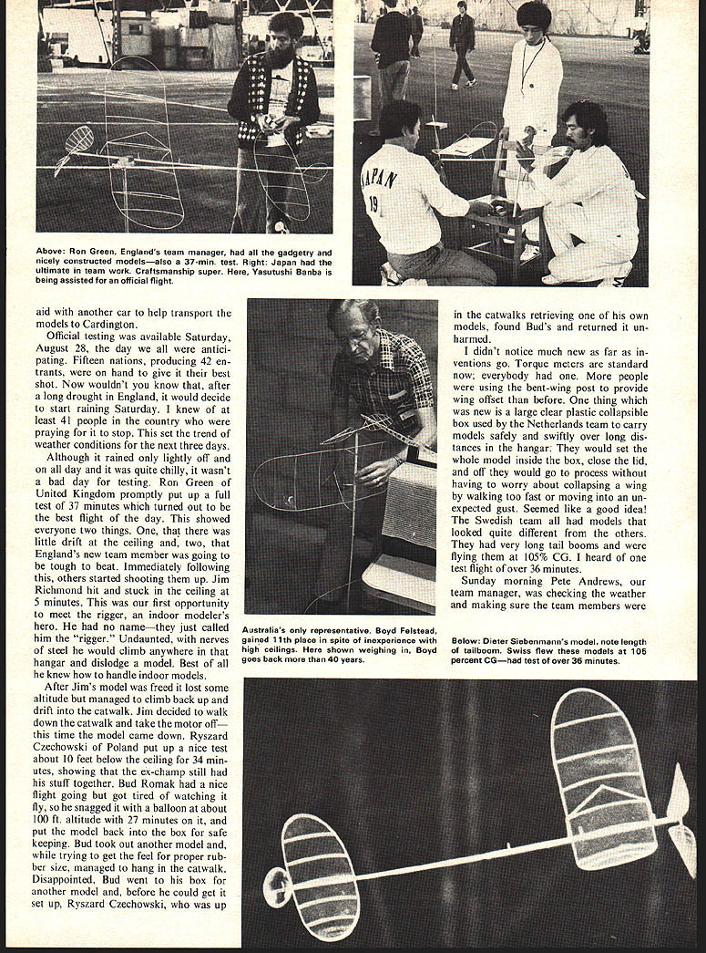 The 1976 World Champion Bud Romak Welldeserved win too overcoming some set-backs stride photo Bill Hartill Polands work bench models display looks like modern art gallery Polands Ciapela ran second Bud Romak ndoor World Chamrz SINCE THE beginning FAI Indoor World Championships 1961 has taken 15 years USA regain its title gives great pleasure report grand style captured outstanding performances member team highlighted high scores Bud Romak won Rushbrooke trophy Kopecky trophy well give USA clean sweep awards Quite bit controversy arose over new point system team selection pro gram USA ways pick team odds will win throughout years will still remain same Most participants agreed program managed select some best fliers through cross-section country strongest teams ever previous team members proven competitors Bucky Servaites Centerville 0 Jim Richmond Davidson NC Bud Romak Moraga Cal Cardington England August 28-30 US Team made clean sweep awards Text Photos Larry Cailliau United Kingdom host 1976 World Championshipsas 1972 site returned RlOl Air ship Shed Cardington England near quaint town Bedford hangar 156 feet height clear floor space proving popular best available sites world Royal Aero Club United Kingdom Society Model Aeronautical Engineers Ltd SMAE responsible organization contest Accommo dations available contestants RAF Henlow Beds approximately nine miles Cardington buffet style breakfast lunch served side hangar complete bar service beers nervous competitors during official flights big problem indoor models safety transportation flight England uneventful fact didnt hear competitors sustaining substantial damage probably record its own right Upon arrival found minibus re served hand small problem Laurie Barr came aid another car help transport models Cardington Official testing available Saturday August 28 day antici pating Fifteen nations producing 42 en trants hand give best shot Now wouldnt know after long drought England would decide start raining Saturday knew least 41 people country praying stop set trend weather conditions next three days Although rained lightly off day quite chilly wasnt bad day testing Ron Green United Kingdom promptly put up full test 37 minutes turned out best flight day showed everyone two things little drift ceiling two Englands new team member going tough beat Immediately following others started shooting up Jim Richmond hit stuck ceiling 5 minutes first opportunity meet rigger indoor modelers hero no namethey just called him rigger Undaunted nerves steel would climb anywhere hangar dislodge model Best knew handle indoor models After Jims model freed lost some altitude managed climb back up drift catwalk Jim decided walk down catwalk take motor off time model came down Ryszard Czechowski Poland put up nice test about 10 feet below ceiling 34 min utes showing ex-champ still stuff together Bud Romak nice flight going got tired watching fly snagged balloon about 100 ft altitude 27 minutes put model back box safe keeping Bud took out another model trying get feel proper rub ber size managed hang catwalk Disappointed Bud went box another model before could get set up Ryszard Czechowski up catwalks retrieving own models found Buds returned un harmed didnt notice much new far ventions go Torque meters standard now everybody people using bent-wing post provide wing offset before thing new large clear plastic collapsible box used Netherlands team carry models safely swiftly over long dis tances hangar would set whole model inside box close lid off would go process having worry about collapsing wing walking too fast moving un expected gust Seemed like good idea Swedish team models looked quite different others very long tail booms flying 105% CG heard test flight over 36 minutes Sunday morning Pete Andrews team manager checking weather making sure team members Above Ron Green Englands team manager gadgetry nicely constructed modelsalso 37-mm test Right Japan ultimate team work Craftsmanship super Yasutushi Banba being assisted official flight Australias representative Boyd Feistead gained 11th place spite inexperience Below Dieter Siebenmanns model note length high ceilings shown weighing Boyd tailboom Swiss flew models 105 goes back 40 years percent CGhad test over 36 minutes Indoor World Champs up bright early should say dull early look-out-the-window weather check seemed much like Saturday clouds darker slight breeze Traveling hangar seemed endless empty stomach anticipations growing no drill Entering hangar con tests always gives feeling stepping twilight zone different world leave brightness noise hustle bustle behind dark serene whisper slow-motion world inside Some days can hardly wait get espe cially today breakfast waiting side Across dining area hung colorful flags nations fun sit leisurely eat watched models floating about Some testing done morning mostly low altitude fine-tune ships Promptly after lunch first round official flights began Bud Romak led off USA Most fliers usually try put up good safe flights first two rounds let hang out plan working well Bud did 3459 about 120 ft altitude no steering necessary Bucky Servaites next off trying duplicate Buds flight Things didnt go planned Bucky model kept climbing dead center hangar bumping ceiling four times After last bump model tailslid about 15 feet put him safe Below Canadas Jack McGillivary ponders very stable job 36-mm official Canada really advanced since 74 Champs cruise altitude model drifted down length hangar landed 3457 Anchorman Jim Richmond looked going break 40 minutes first flight model still climbing after 9 minutes less 45 rpm hung first touch 9 minutes 30 seconds found out later model will climb 15 minutes rigger returned model unharmed Generally conditions stable first round little drift down length hangar Times high trying get safe flight Edward Ciapla Poland high time 3545 air remained much same second round first Romak again led off second round same model motor wound tighter