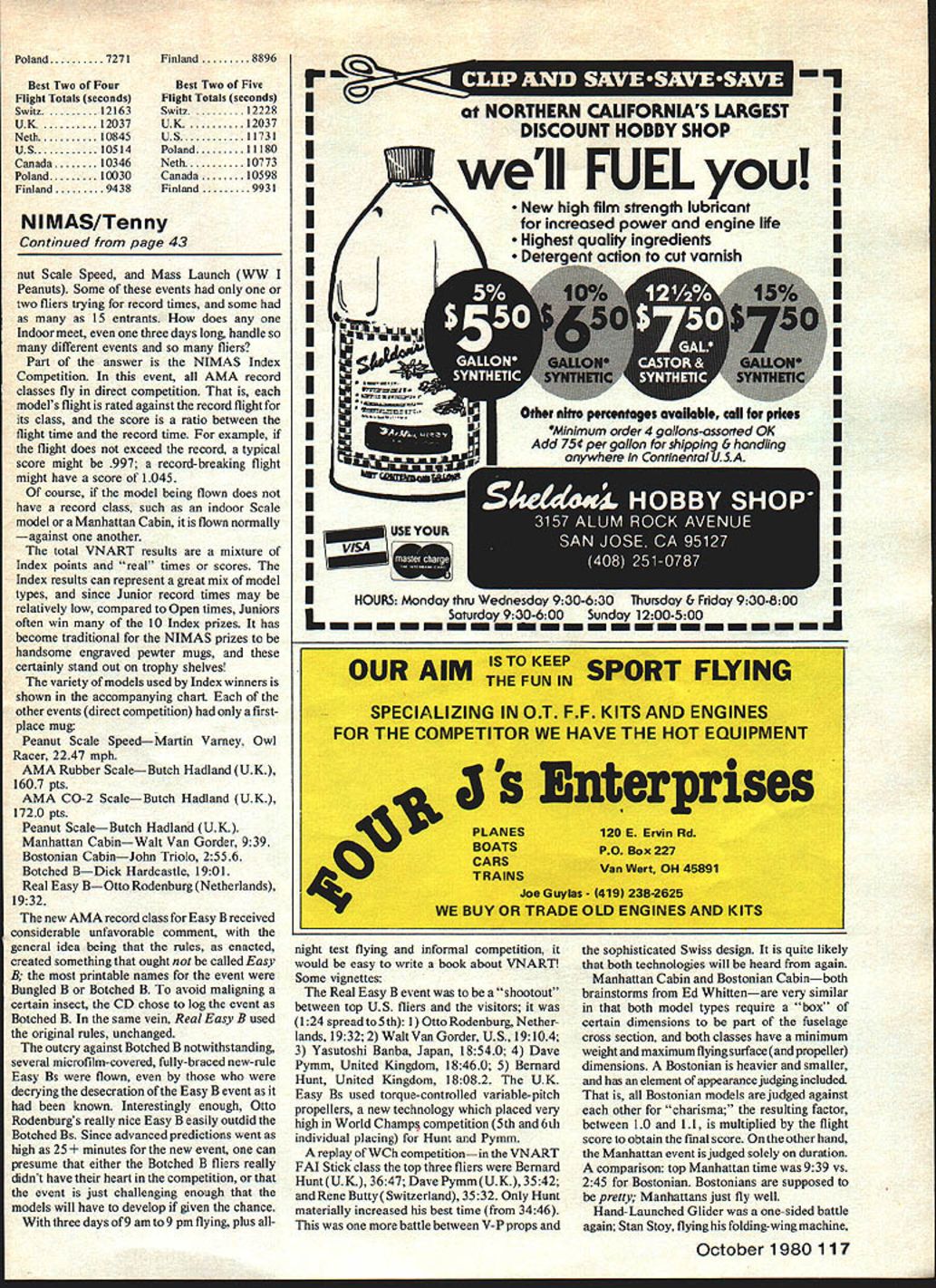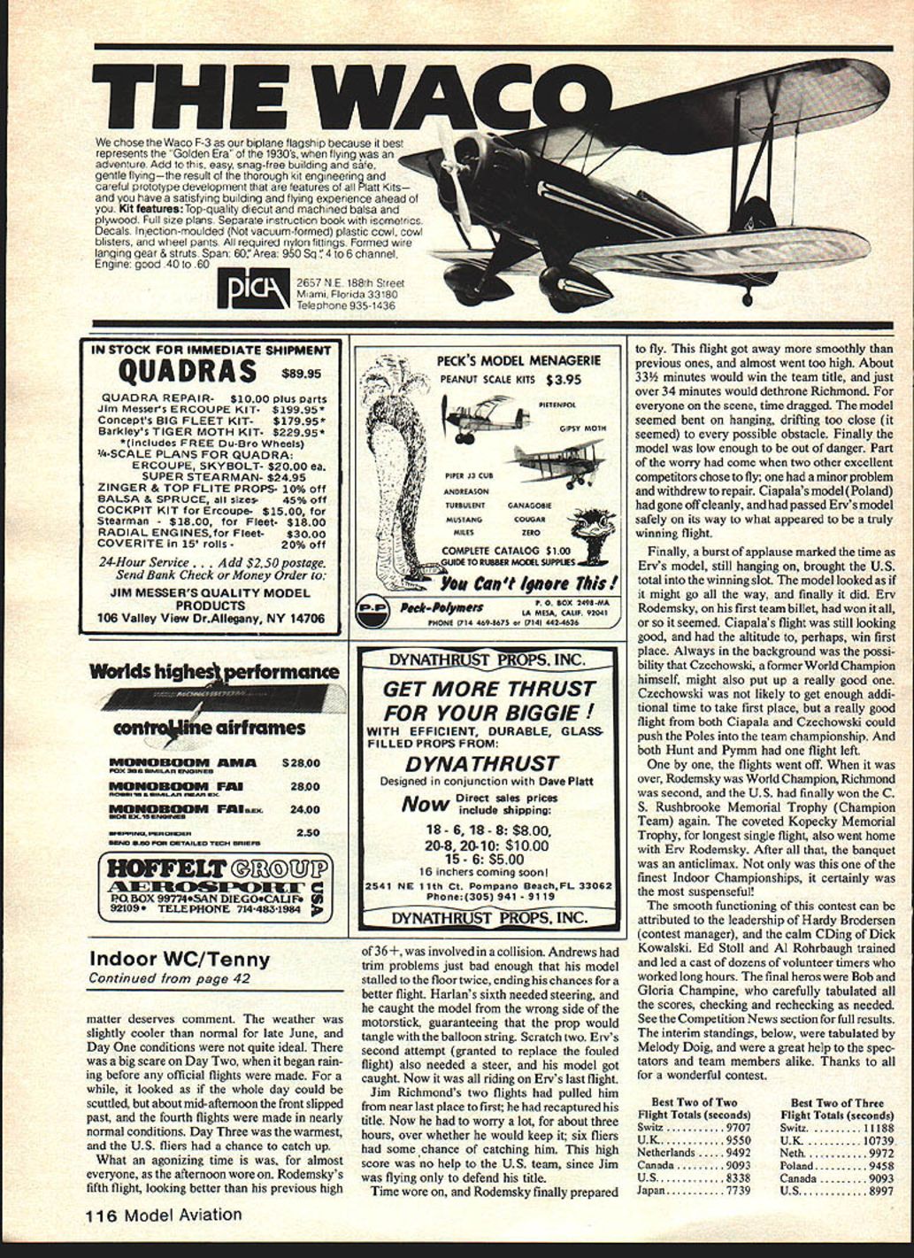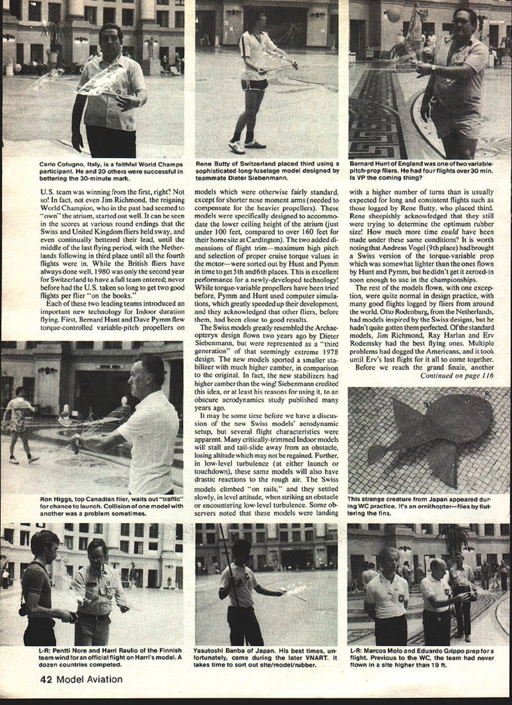 40 Model Aviation atrium Northwood Institute West Baden INwhich has kicked up ruckus Indoorcommunity overwhatAMA ceiling category belongs unquestionably Al Ceiling Cat Ill FAI measurement openings ceiling differs AMA Super flying site ALTHOUGH some preliminary arrivals June20 1980 international Indoor modeling clan began largest gathering Indoor fliers history sport Fliers 12 nations team supporters officials AMA enthusiastic US Indoor fliers settled put what may become known harmonious World Championships ever During remarks victory banquet Ian Kaynes Great Britain chairman Inter national Jury credited competitors volunteer timers AMA officials having staged outstanding meet Jury view meet write report Mr Kaynes said Since protest official rulings un WEST #1 winning US team Lower level L-R Erv Rodemsky Bay Harlan Pete Andrews Elevated very happy team manager Bill Hulbert Going last round US team third sportsmanlike conduct competitors anyimportant idea sport since other impediment fair contest must bestrong preference large hangars World resolved Jury indeed high praiseChampionships caliber Indoor flying As result Other members Jury Peter Ailnut ofmany countries dirigible hangars have Canada Joseph Bucky Servaites thebeen reluctant host time has USseemed harder find organizer Perhaps agreed other point drivencountries convention sites having about flhome necessary stage Indoor World100-ft ceilings will now plan host future W Championships dirigible hangars anevents event held smaller site normalthe atrium Northwood Institute West Baden INbut excellent flying condi tions plus eating sleeping same location made pleasant Indoor World Championships times Coin bin ing Peanut Grand Prix Annual NIMAS Record Trials World Champs made fora week-long three-ring extravaganza top off US won Individual Team World Championships Most competitors unanimous approval contest sitethe atrium Northwood Institute West Baden IN historic site unique structure built 1902 resort hotel access mineral water springs area recent years building has scene annual flying get-togethers National Indoor Model Airplane Society NIMAS founded 1961 help preserve then-waning sport Indoor model airplane competition 1976 NIMAS held first low-key Indoor competitions aim members could assemble fine building fly models have companionship fliers over country idea merging World Champs NIMAS event came during 1979 event people worked make happen atrium itself part Northwood facility flying area surrounded six floors European-style hotel rooms both inner circle rooms overlook atrium outer circle rooms overlooking beautiful grounds wooded areas institute teaches cooking hotel management related subjects result visitors have low-cost housing reasonably-priced excellent food setting easy see competitors such favorable reaction atrium best sites world Indoor flying no need transporta tion housing restaurants fact competitors others attended 1980 World Championships found themselves im mersed own particular form modeling activity 24 hours day very limited access suitable flying sites own country atriums stable air conditions 24-hour total availability represented unique opportunity fliers felt little need additional test flying volunteer timers other officials brought no models other ones used later week Peanut Scale Grand Prix NIMAS VNART contests chance get acquainted international fliers also golden opportunity Since families accompanied volunteer timers also chance social activities unrelated model events younger family members opportunities become acquainted people other countries competition itself set number prece dents site US team members almost intimate knowledge course October 1980 41 Close-up Swiss model tailpiane Notethatstab camber very high stab incidence adjustable Swiss models impressive Two membQrs Polish team L-R Manager Kazimierz Lapinski Edward Ciapala latter placed fourth overall Erv Rodemsky good 2nd Round flight 3623 couldnt match another good until waning hours last round As seconds ticked off last flight came 35 minutes 36 secondsgood forthe Indi vidual World Championships enough nudge outtheSwissfOrtheTeam World Championship finish 1980 Indoor WC dramatic Jim Richmond shown defending 1978 win having mostly bad luck firatfourrounds hegot3617 paired 6th 3512 top timetwo flight total Rodemskys later flight knocked Jim out title spot Probably talked-about models World Champs on-TuseIge Juu eruLereu uy Switzerland models tail-booms unplugged allow compact box shown US team winning first right fact Jim Richmond reigning World Champion past seemed own atrium started out well can seen scores various round endings Swiss United Kingdom fliers held sway continually bettered lead until middle last flying period Nether lands following third place until fourth flights British fliers have always done well 1980 second year Switzerland have full team entered never before US taken long get two good flights per flier books two leading teams introduced Important new technology Indoor duration flying First Bemard Hunt Dave Pymm flew torque-controlled variable-pitch propellers models otherwise fairly standard except shorter nose moment arms needed compensate heavier propellers models specifically designed accommo date lower ceiling height atrium just under 100 feet compared over 160 feet home site Cardington two added di mensions flight trimmaximum high pitch selection proper cruise torque values motorwere sorted out Hunt Pymm time toget5th and6th places excellent performance newly-developed technology torque-variable propellers have tried before Pymm Hunt used computer simula tions greatly speeded up development acknowledged other fliers before close good results Swiss models greatly resembled Archae opteryx design flown two years ago Dieter Siebenmann represented third generation seemingly extreme 1978 design new models sported smaller sta bilizer much higher camber comparison original fact new stabilizers higher camber wing Siebenmann