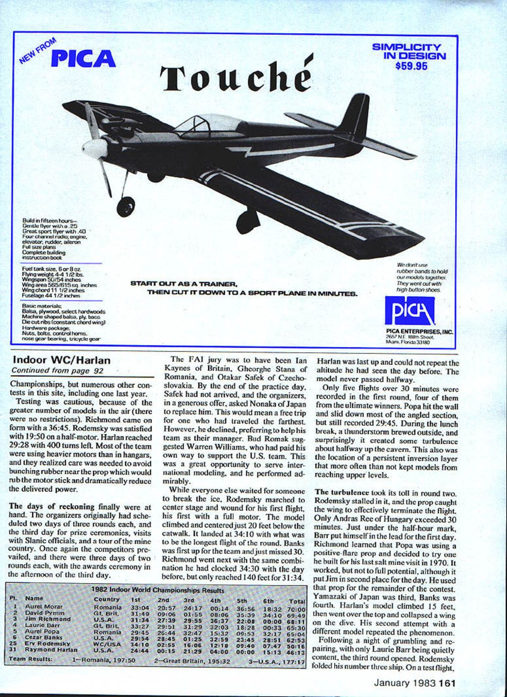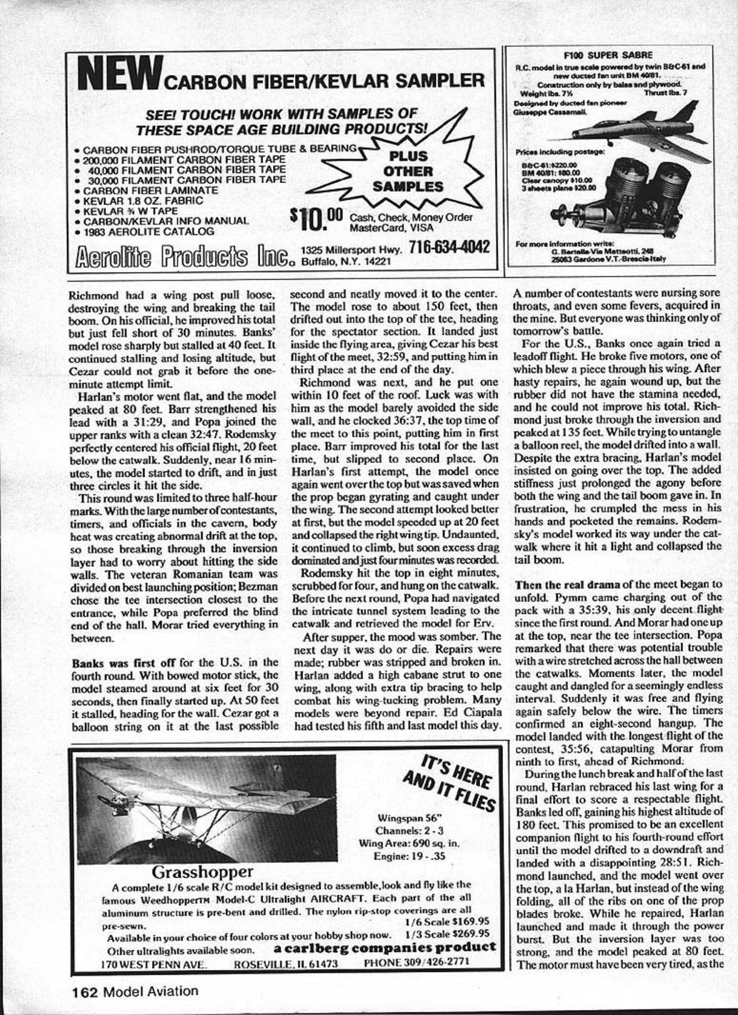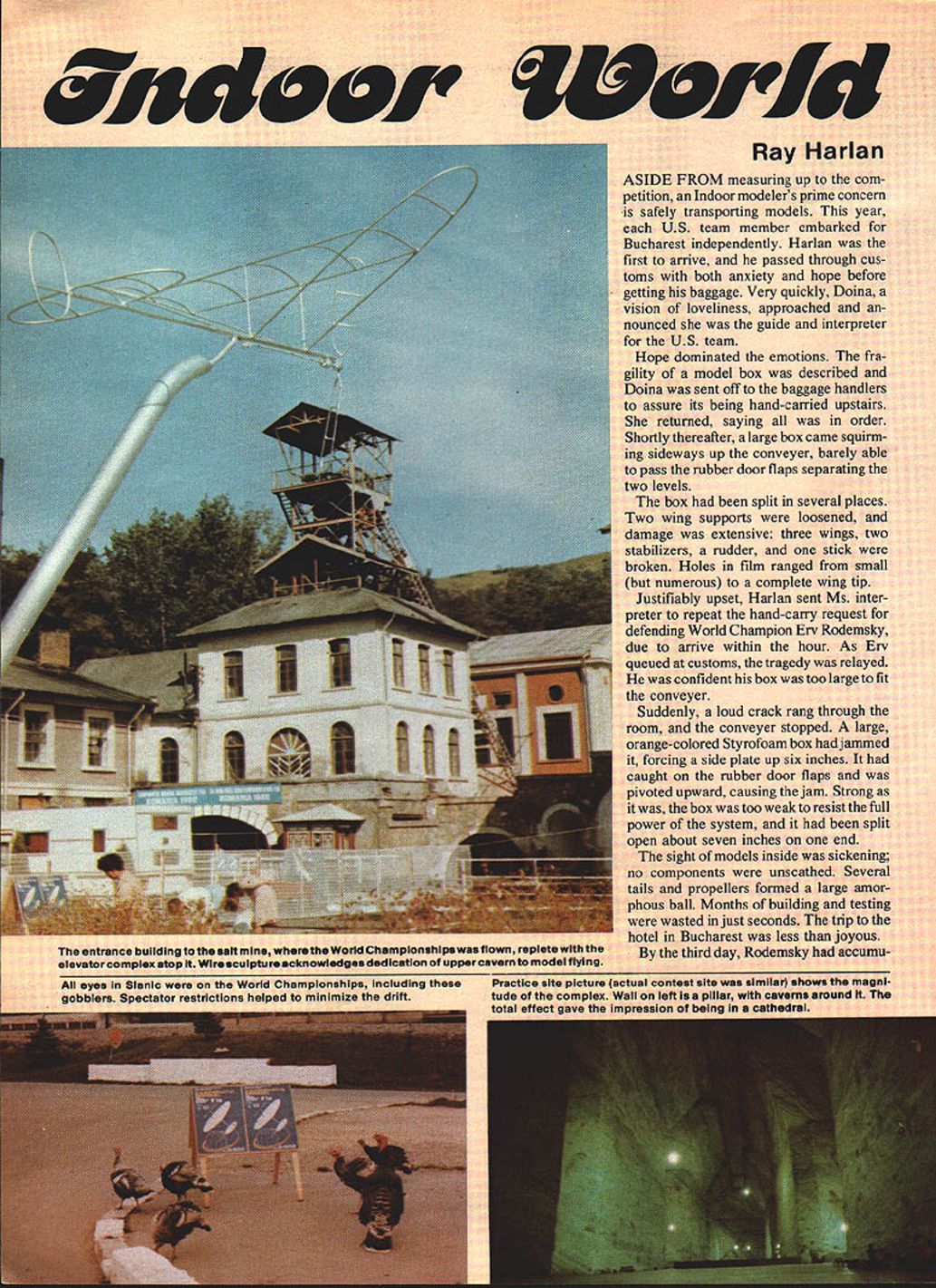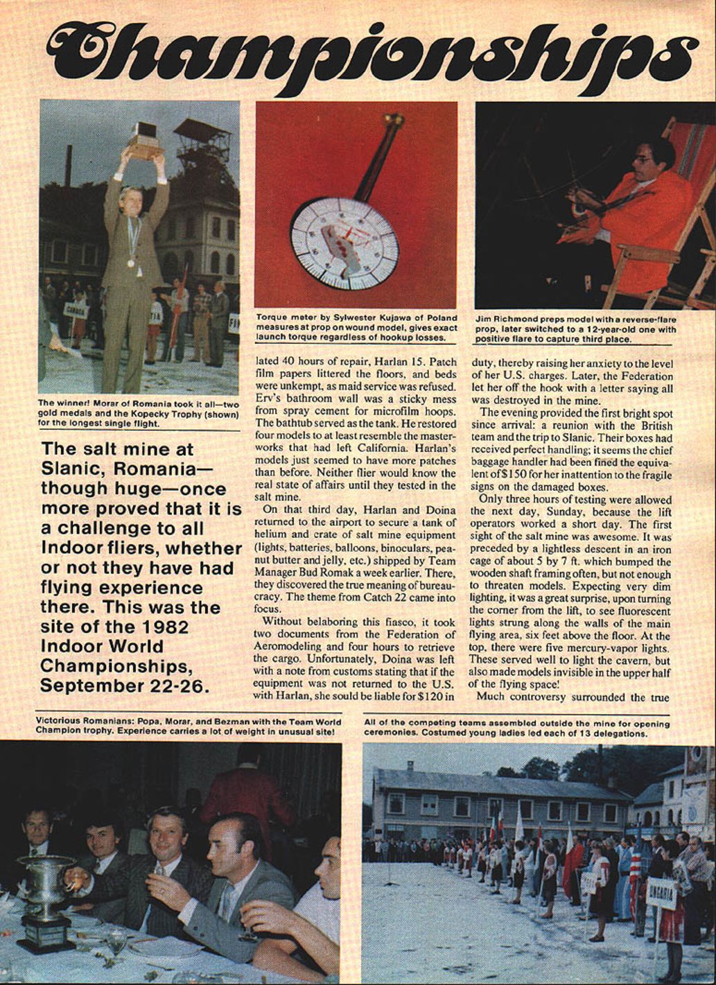 ~wih5 WMGGJ World Ray Harlan entrance building saft w elevstorcompiexatop Wire sculpture mmpionshipswasflown replete uudlC5tiOfl upper cavern mod4 Including drift Practice Siti tude thei total effect ASIDE FROM measuring up com petition Indoor modelers prime concern safely transporting models year US team member embarked Bucharest independently Harlan first arrive passed through cus toms both anxiety hope before getting baggage Very quickly Doina vision loveliness approached nounced guide interpreter US team Hope dominated emotions fra gility model box described Doina sent off baggage handlers assure its being hand-carried upstairs returned saying order Shortly thereafter large box caine squirm ing sideways up conveyer barely able pass rubber door flaps separating two levels box split several places Two wing supports loosened damage extensive three wings two stabilizers rudder stick broken Holes film ranged small numerous complete wing tip Justifiably upset Harlan sent Ms inter preter repeat hand-carry request defending World Champion Erv Rodemsky due arrive within hour As En queued customs tragedy relayed confident box too large fit conveyer Suddenly loud crack rang through room conveyer stopped large orange-colored Styrofoam box jammed forcing side plate up six inches caught rubber door flaps pivoted upward causing jam Strong box too weak resist full power system split about seven inches end sight models inside sickening omponents unscathed Several propellers formed large amor ball Months building testing wasted just seconds trip Bucharest less joyous third day Rodemsky accumu untest site slmiiafl left pillar cmv being eyes Sianic World Char gobblers Spectator restrictions helped salt Slanic Romania though hugeonce proved challenge Indoor fliers whether have flying experience site 1982 Indoor World Championships September 22-26 lated 40 hours repair Harlan 15 Patch film papers littered floors beds unkempt maid service refused Ervs bathroom wall sticky mess spray cement microfilm hoops bathtub served tank restored four models least resemble masterworks left California Harlans models just seemed have patches before Neither flier would know real state affairs until tested salt third day Harlan Doina returned airport secure tank helium crate salt equipment lights batteries balloons binoculars pea nut butter jelly etc shipped Team Manager Bud Romak week earlier discovered true meaning ofbureau cracy theme Catch 22 came focus Without belaboring fiasco took two documents Federation Aeromodeling four hours retrieve cargo Unfortunately Doina left note customs stating equipment returned US Harlan sould liable $120 duty thereby raising anxiety level US charges Later Federation let off hook letter saying destroyed evening provided first bright spot since arrival reunion British team trip Slanic boxes received perfect handling seems chief baggage handler fifled equiva lent of$ 150 inattention fragile signs damaged boxes Only three hours testing allowed next day Sunday because lift operators worked short day first sight salt awesome preceded lightless descent iron cage about 5 7 ft bumped wooden shaft framing often enough threaten models Expecting very dim lighting great surprise upon turning corner lift see fluorescent lights strung along walls main flying area six feet above floor top five mercury-vapor lights served well light cavern also made models invisible upper half flying space Much controversy surrounded true 9ompeting teams assembled outside opening ceremonies Costumed young ladies led 13 delegations Torque meter Sylwester Kujawa Poland measures prop wound model gives exact launch torque regardless hookup losses winner Moray Romania took alltwo gold medals Kopecky Trophy shown longest single flight Jim Richmond preps model reverse-flare prop later switched 1 2-yearotd positive flare capture third place Victorious Romanlans Pops Morar Bezman Team World Champion trophy Experience carries lot weight unusual site height numbers 57 65 69 75 meters have published federation claimed 54 official invi tation center hall Harlan aided Romanian Aurel Popa measured 212 feet 65 meters helium balloon floor 106 394 feet sides straight 112 feet taper top measures 36 feet between catwalks floor presented surprise saltcutting machine left small steps two inches four feet very careful could produce disastrous results carrying model three hours testing barely enough get few flights Rodemsky Harlan both used half-motors begin sorting out props rubber Instead 19 22-minute flights made blimp hangars 15 common Jim Richmond arrived others pack ing up next day heralded arrival Cezar Banks Bud Romak Originally no test flying day next will competitors domi nated allowed fly Rich mond got 29 30 minutes Harlan 27 32 Banks saw 30 31 Rodemsky seemed content Richmond stretched motor slip off winder shoot past torque meter wipe out stabilizer best model twenty-first organizers said would no flying contest cavern because would moving tables shooting down salt stalactites rifle protect public Unfor tunately Richmond did hear about about availability second hail below first returned Ploesti relatives cavern second stop lift far complex World Championships site having corridors halls included large sculptured battle scene along wall health spa aiding asthma sufferers sleeping accommo dations well cafeteria volleyball tennis courts flying area 182 feet high well separated other activities Testing permitted afternoon lower level temperature two degrees F warmer surpris ingly made difference Romak brought couple models just get some experience turned 34 minutes first try following day official practice competing teams arrived including Poles However three entries did show France Australia Czechoslovakia last especially surprising Jiri Kalina undisputed king salt having won 1970 World Continued page 161 Conventional rugged Romanian models small low-pitch props 1 O29 long thin rubber Note positive flare Popas broken model US contin