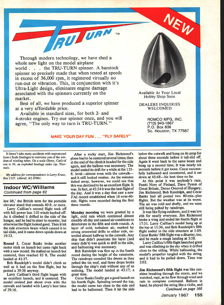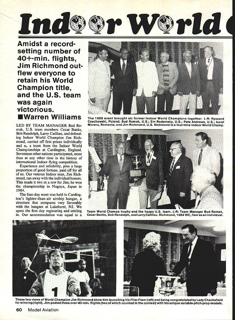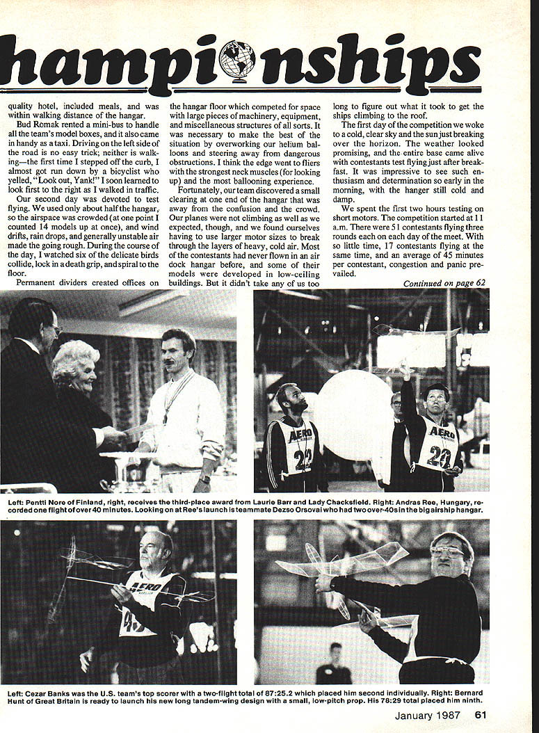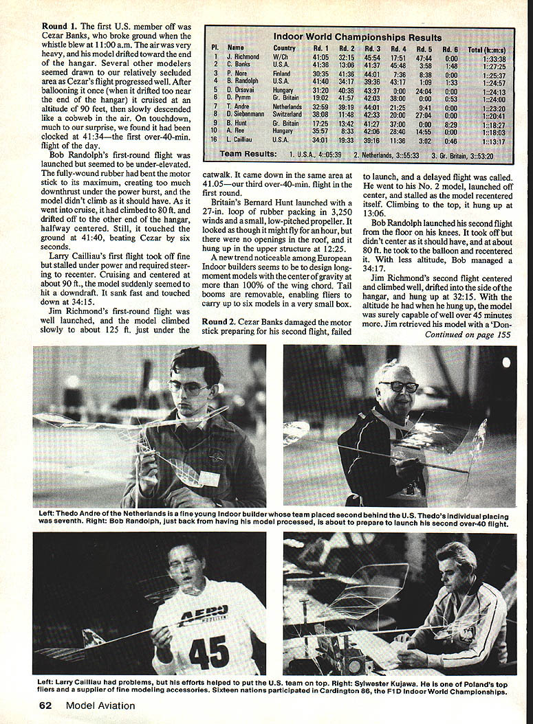 Amidst recordsetting number 40-mm flights Jim Richmond outflew everyone retain World Champion title US team again victorious EWarren Williams LED BY TEAM MANAGER Bud Ro mak US team members Cezar Banks Bob Randolph Larry Caihiau defend ing Indoor World Champion Jim Rich mond carried off first prizes individually a team Indoor World Championships Cardington England Seventeen other nations participated other time history international Indoor flying competition Experience reliability plus large proportion good fortune paid off us veteran Indoor man Jim Rich mond ran away individual honors made two row Jim won championship Nagoya Japan 1984 four-day meet held Cardingtons lighter-than-air airship hangar structure compares very favorably hangars Lakehurst NJ spent first day registering settling m accommodation equal two views World Champion Jim Richmond show him launching Film-Plain left being congratulated Lady Chacksfield forwinning right Jim posted three over-40-min fiights two counted contest unique variable-pitch-prop models 60 Model Aviation 1986 event brought six former indoor World Champions together L-R Ryszard Czechowski Poland Bud Romak US Erv Rodemsky US Pete Andrews US Aurel Moraru Romanla Jim Richmond US Richmond four-time indoor World Champ Team World Champs trophy happy US team L-R Team Manager Bud Romak Cezar Banks Bob Randolph Larry Caiiliau Richmond 1984 WC flew individual hampiS uships quality hotel included meals within walking distance hangar Bud Rcmak rented mini-bus handle teams model boxes also came handy taxi Driving left side road no easy trick neither walk ingthe first time stepped off curb almost got run down bicyclist yelled Look out Yank soon learned look first right walked traffic second day devoted test flying used about half hangar airspace crowded point oounted 14 models up once wind drifts rain drops generally unstable air made going rough During course day watched six delicate birds collide lock death grip spiral floor Permanent dividers creited Affice An hangar floor competed space large pieces machinery equipment miscellaneous structures sorts necessary make best situation overworking helium bal loons steering away dangerous obstructions think edge went fliers strongest neck muscles looking up ballooning experience Fortunately team discovered small clearing end hangar away confusion crowd planes climbing well expected though found ourselves having use larger motor sizes break through layers heavy cold air Most contestants never flown air dock hangar before some models developed low-ceiline hiii1dino Tht didnt tiI orn long figure out what took get ships climbing roof first day competition woke cold clear sky sun just breaking over horizon weather looked promising entire base came alive contestants test flying just after break fast impressive see such en thusiasm determination early morning hanger still cold damp spent first two hours testing short motors competition started 11 am 51 contestants flying three rounds day meet little time 17 contestants flying same time average 45 minutes per contestant congestion panic pre vailed W~v Left Pentti Nore Finland right receives third-place award Laurie Barr Lady Chacksfield Right Andras Ree Hungary re corded flight over4O minutes Looking Rees launch isteammate Dezso Orsoval two over-40s big airship hangar Left Cezar Banks US teams top scorer two-flight total 87252 placed him second individually Right Bernard Hunt Great Britain ready launch new long tandem-wing design small low-pitch prop 7829 total placed him ninth January1987 61 Round 1 first US member off Cezar Banks broke ground whistle blew 1100 am air very heavy model drifted toward end hangar Several other modelers seemed drawn relatively secluded area Cezars flight progressedwell After ballooning once drifted too near end hangar cruised altitude 90 feet slowly descended like cobweb air touchdown much surprise found clocked 4134the first over-40-min flight day Bob Randolphs first-round flight launched seemed under-elevated fully-wound rubber bent motor stick its maximum creating too much downthrust under power burst model didnt climb should have As went cruise climbed 80 ft drifted off other end hangar halfway centered Still touched ground 4140 beating Cezar six seconds Larry Cailliaus first flight took off fine stalled under power required steer ing recenter Cruising centered about 90 ft model suddenly seemed hit downdraft sank fast touched down 3415 Jim Richmonds first-round flight well launched model climbed slowly about 125 ft just under catwalk came down same area 4105our third over-40-min flight first round Britains Bernard Hunt launched 27-in loop rubber packing 3250 winds small low-pitched propeller looked though might fly hour no openings roof hung up upper structure 1225 new trend noticeable among European Indoor builders seems to design longmoment models center gravity 100% wing chord Tail booms removable enabling fliers carry up six models very small box Round 2 Cezar Banks damaged motor stick preparing second flight failed ups Resi Rd4 RdI 4744 3M 8 1 launch delayed flight called went No 2 model launched off center stalled model recentered itself Climbing top hung up 1306 Bob Randolph launched second flight floor knees took off didnt center should have about 80 ft took balloon recentered it With less altitude Bob managed 3417 Jim Richmonds second flight centered climbed well drifted side hangar hung up 3215 altitude hung up model surely capable well over 45 minutes Jim retrieved model Don Continued page 155 Left e Netherlands isa fine young indoor builder team placed second behind US Thedos individual placing seventh Right Bob Randolph just back having model processed about prepare launch second over-40 flight Left Larry Cailliau problems efforts helped put US team top Right Syiwester Kujawa Polands top fliers supplier fine modeling accessories Sixteen nations participated Cardington 56 Fl D Indoor World Championships 62 Model Aviation InI Va ult