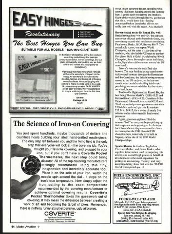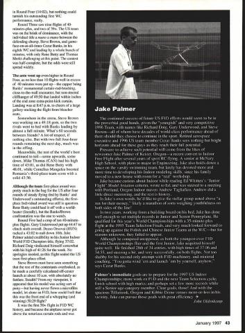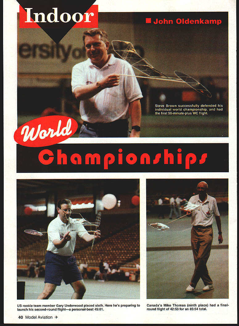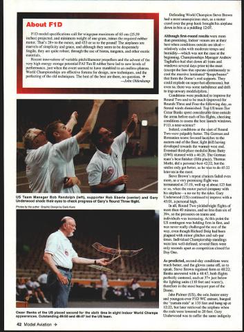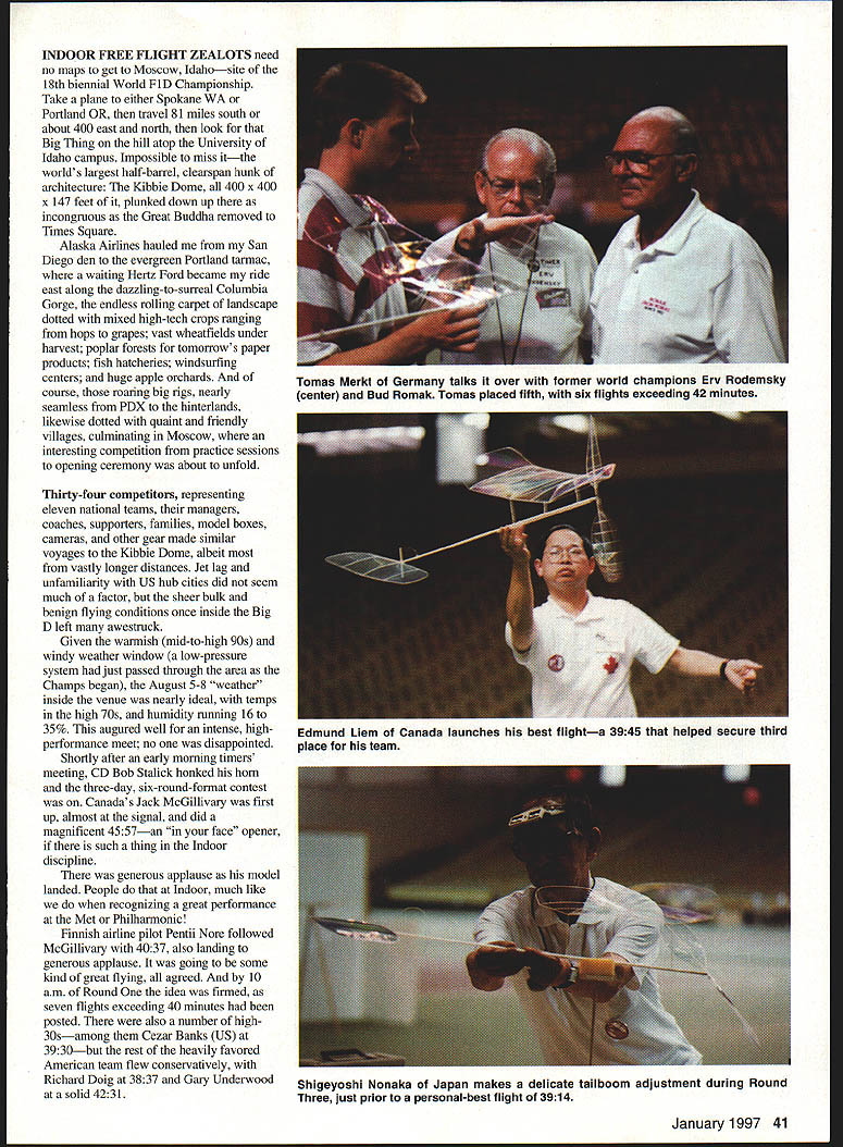 US rookie team member Gary Underwood placed sixth hes preparing Canadas Mike Thomas ninth place final launch second-round flighta personal-best 4501 round flight 4253 8554 total 40 Model Aviation OR FREE FLIGHT ZEALOTS need no maps get Moscow Idahosite 18th biennial World FiD Championship Take plane either Spokane WA Portland OR travel 81 miles south about 400 east north look Big Thing hill atop University Idaho campus Impossible miss itthe worlds largest half-barrel clearspan hunk architecture Kibbie Dome 400 x 400 x 147 feet plunked down up incongruous Great Buddha removed Times Square Alaska Airlines hauled San Diego den evergreen Portland tarmac waiting Hertz Ford became ride east along dazzling-to-surreal Columbia Gorge endless rolling carpet landscape dotted mixed high-tech crops ranging hops grapes vast wheatfields under harvest poplar forests tomorrows paper products fish hatcheries windsurfing centers huge apple orchards course roaring big rigs nearly seamless PDX hinterlands likewise dotted quaint friendly villages culminating Moscow interesting competition practice sessions opening ceremony about unfold Thirty-four competitors representing eleven national teams managers coaches supporters families model boxes cameras other gear made similar voyages Kibbie Dome albeit vastly longer distances Jet lag unfamiliarity US hub cities did seem much factor sheer bulk benign flying conditions once inside Big D left awestruck Given warmish mid-to-high 90s windy weather window low-pressure system just passed through area Champs began August 5-8 weather inside venue nearly ideal temps high 70s humidity running 16 35% augured well intense highperformance meet no disappointed Shortly after early morning timers meeting CD Bob Stalick honked horn three-day six-round-format contest Canadas Jack McGillivary first up almost signal did magnificent 4557an face opener such thing Indoor discipline generous applause model landed People Indoor much like recognizing great performance Met Philharmonic Finnish airline pilot Pentii Nore followed McGillivary 4037 also landing generous applause going some kind great flying agreed 10 am Round idea firmed seven flights exceeding 40 minutes posted also number high 30samong Cezar Banks US 3930but rest heavily favored American team flew conservatively Richard Doig 3837 Gary Underwood solid 4231 January 1997 41 Tomas Merkt Germany talks over former world champions Erv Rodemsky center Bud Romak Tomas placed fifth six flights exceeding 42 minutes Edmund Liem Canada launches best flighta 3945 helped secure third place team Shigeyoshi Nonaka Japan makes delicate tailboom adjustment during Round Three just prior personal-best flight 3914 Defending World Champion Steve Brown unauspicious start motor crawl over prop hook brought airplane down bits piddling 1207 Although first-round results promising Indoor venues best conditions outside ideal relatively calm moderate temps humiditywhich case beginning Championships Manager Andrew Tagliafico shut down vents windows several days prior meet except fans operate continuously cool massive laminated hoops/beams fonn Domes end supports could explode super-hot afternoons some turbulence drift trap unwary models/pilots Conditions predicted improve Round Two much-improved Rounds Three Four following day frontal winds diminished Top US team flier Cezar Banks spent considerable time outside arena before flights checking conditions assess best launch windows FlD near-science Indeed conditions start Round Two palpably better German Romanian teams favored launches eastern end floor light drift having developed towards warmer west end Eventual third-place medalist Rene Butty SWI stunned 4626 German teams best finisher fifth place Thomas Merkt did personal-best 4232 smiles got better 4522 later meet Steve Browns repeat chances faded very promising flight terminated 3719 well up about 125 feet motor parted company airplanea no-no rules Gary Underwood US continued impress 4501 personal high Round Two yielded eight flights 40 minutes no less six 39 pressures teams individuals increasing point US contingent holding firm first never really challenged rest way though Richard Doig plagued minor glitches sub-par times Individual Championship standings less well-defined several fliers seconds apart competition closed Day As predicted second-day conditions much better gloves came off speak Steve Brown regained form 4822 Banks answered 4847 both flights perfectly centered 37 just below lighting units 110 feet warm therefore buoyant part Dome Jake Palmer US sole Junior entry youngest-ever FlD WC entrant banged curtain rods 135 feet hung up 1222 later retrieved airplane rods lowered 20 feet Gary Underwood suffer same indignity 42 Model Aviation 4About FID FiD model specifications call wingspan maximum 65 cm 2559 inches projected minimum weight gram minus required rubber motor Thats 28 ounce 453 pound airplanes marvels simplicity grace although seem desperately fragile quite robust through use boron tungsten other exotic materials Recent innovations variable pitch/diameter propellers advent very high energy storage potential FAI Tan II rubber have led new levels performance just event seemed have stumbled endless plateau World Championships effective forums design new techniques perfecting old techniques best best no question 4John Oldenkamp US Team Manager Bob Randolph left supporter Rob Eberle center Gary Underwood shade eyes check progress Garys Round Three flight h, sign Carla Kunz Cezar Banks US placed second sixth time eight Indoor World Champs appearances Outstanding 4950 4847 led US team Round Four 1402 nothing could tarnish outstanding first WC performance really Round Three saw nine flights 40minutes-plus two 39 US team brink dominance individual title mano mano between defending champ Steve Brown gameface-on-at-all-times Cezar Banks eighth WC leading whole bunch minutes Rene Butty Thomas Merkt challenging point contest half-complete odds stil