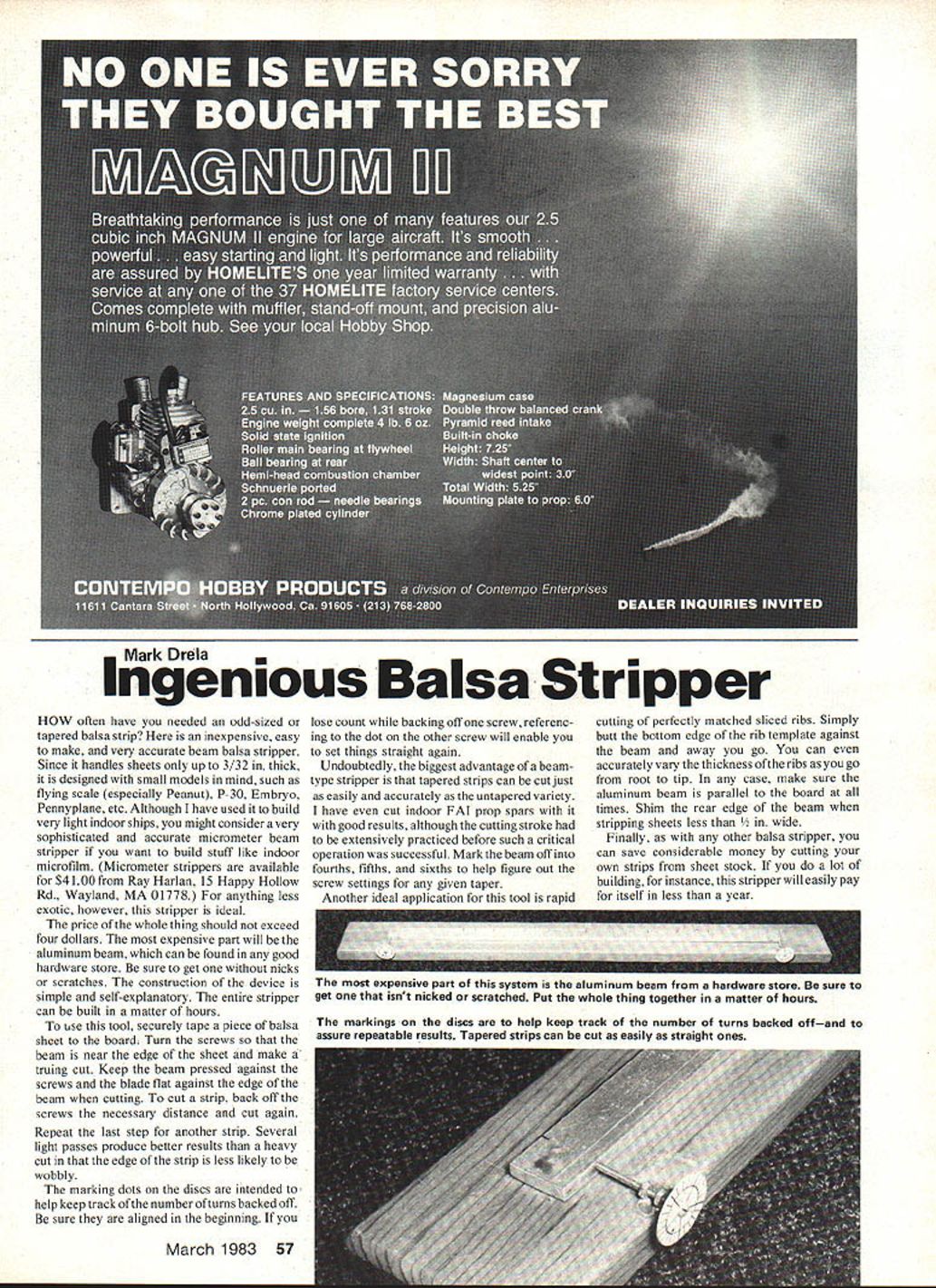 HOW often have needed odd-sized tapered balsa strip inexpensive easy make very accurate beam balsa stripper Since handles sheets up 3/32 thick designed small models mind such flying scale especially Peanut P-30 Embryo Pennyplane etc Although have used itto build very light indoor ships might consider very sophisticated accurate micrometer beam stripper want build stuff like indoor microfilm Micrometer strippers available $4100 Ray Harlan 15 Happy Hollow Rd Wayland MA 01778 anything less exotic however stripper ideal price whole thing should exceed four dollars expensive part will aluminum beam can found good hardware store sure get nicks scratches construction device simple selfexplanatory entire stripper can built matter hours use tool securely tape piece balsa sheet board Turn screws beam near edge sheet make truing cut Keep beam pressed against screws blade flat against edge beam cutting cut strip back off screws necessary distance cut again Repeat last step another strip Several light passes produce better results heavy cut edge strip less likely wobbly marking dots discs intended help keep track number turns backed off sure aligned beginning March 1983 57 lose count backing off screw referenc ing dot other screw will enable set things straight again Undoubtedly biggest advantage beamtype stripper tapered strips can cut just easily accurately untapered variety have cut indoor FA prop spars with good results although cutting stroke extensively practiced before such critical operation successful Mark beam off fourths fifths sixths help figure out screw settings given taper Another ideal application tool rapid cutting perfectly matched sliced ribs Simply butt bottom edge 3f rib template against beam away go can accurately vary thickness ofthe ribs go root tip case make sure aluminum beam parallel board times Shim rear edge beam stripping sheets less 12 wide Finally other balsa stripper can save considerable money cutting own strips sheer stock lot building instancethis stripperwill easily pay itself less year Mark Drela Ingenious Balsa Stripper expensive part system aluminum beam haraware store e sure get isnt nicked scratched Put whole thing together matter hours markings discs help keep track number turns backed offand assure reDeatable results Taoered strips can cut easily straight ones