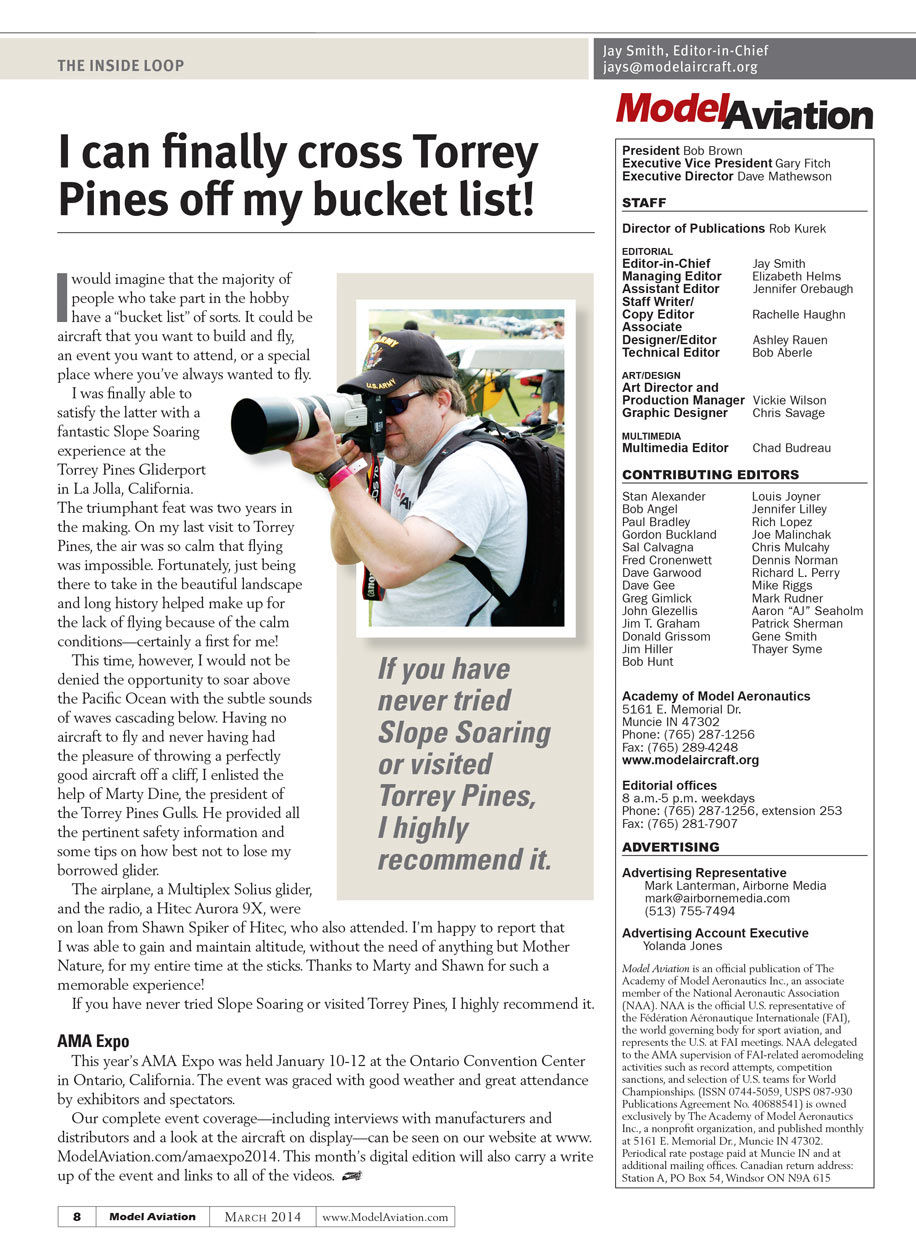 Our complete event coverage—including interviews with manufacturers and distributors and a look at the aircraft on display—can be viewed on our website at www.ModelAviation.com/amaexpo2014. This month’s digital edition will also carry a write up of the event and links to all of the videos.