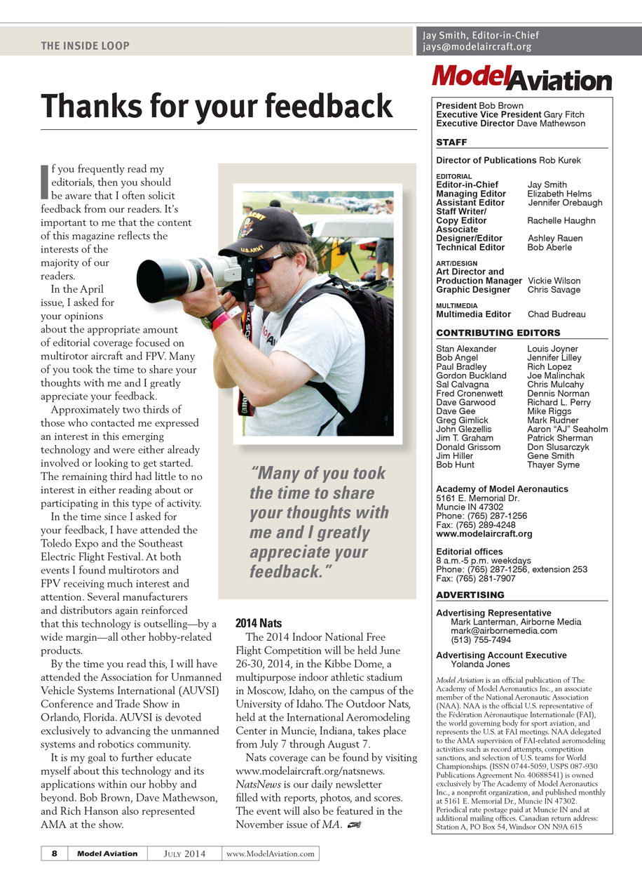 In the April issue, I asked for your opinions about the appropriate amount of editorial coverage focused on multirotor aircraft and FPV. Many of you took the time to share your thoughts with me and I greatly appreciate your feedback.
