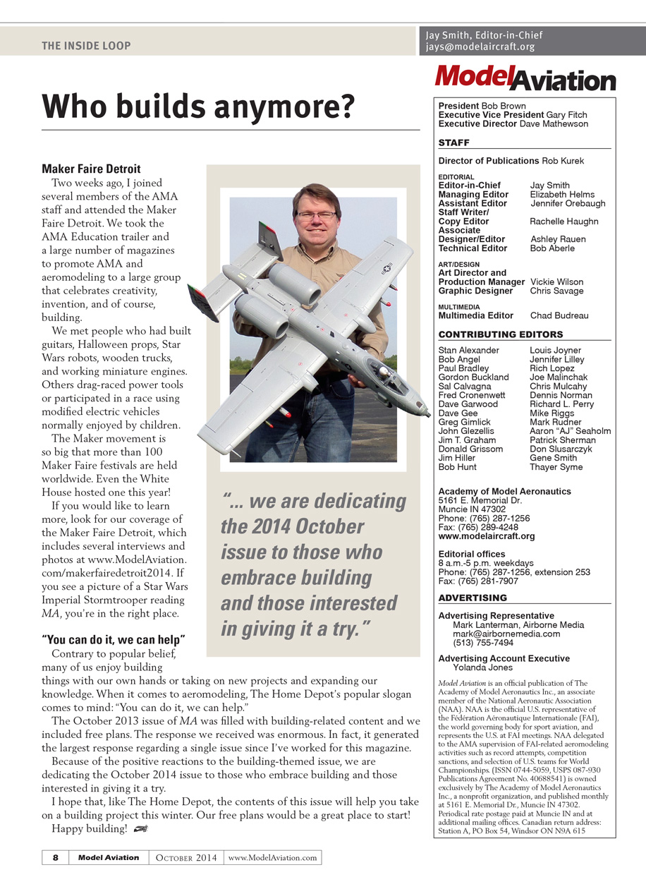 If you would like to learn more, look for our coverage of the Detroit Maker Faire, which includes several interviews and photos at www.ModelAviation.com/makerfairedetroit2014. If you see a picture of a Star Wars Imperial Stormtrooper reading MA, you’re in the right place.