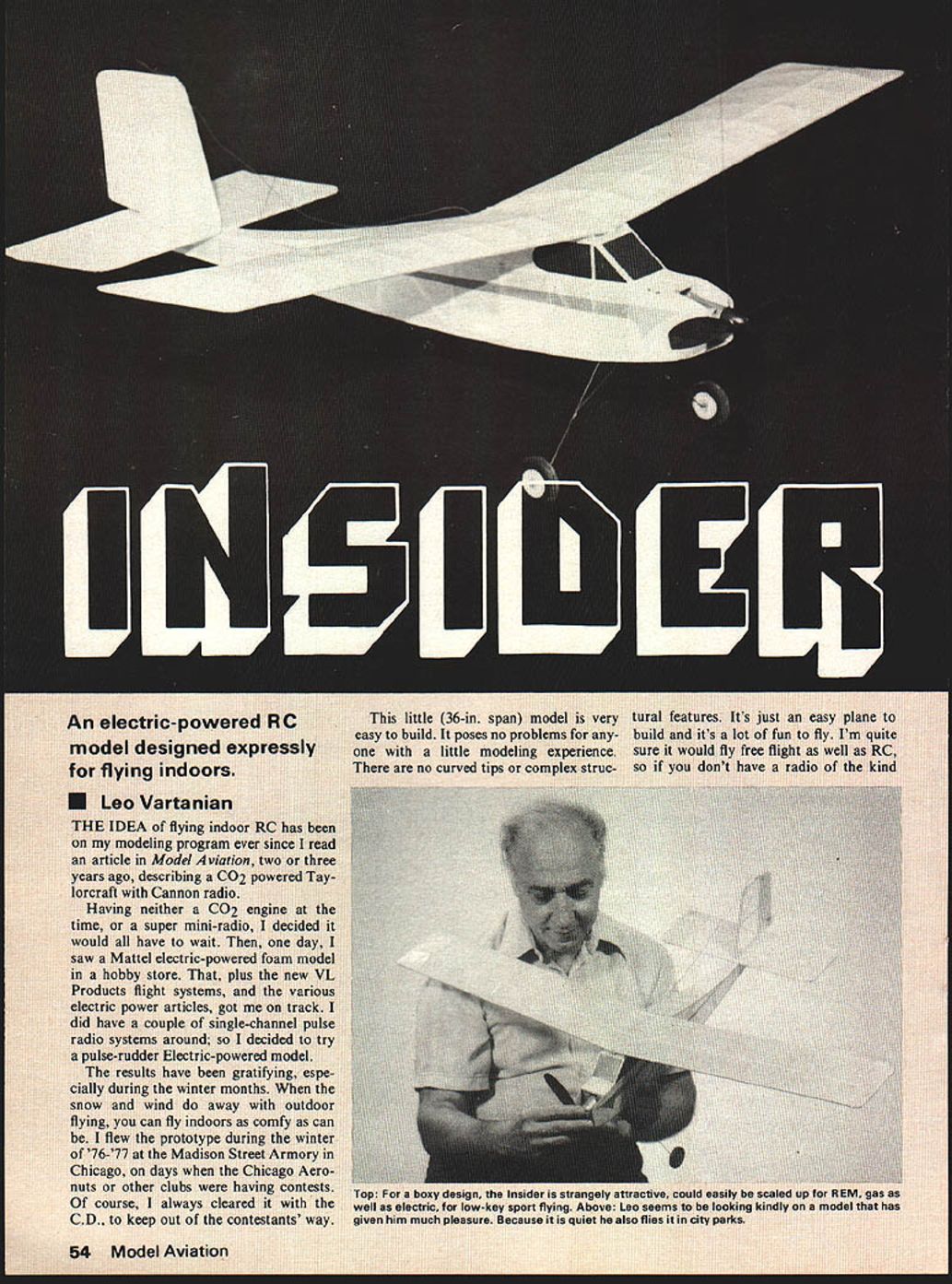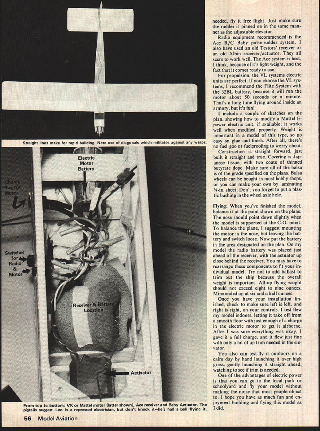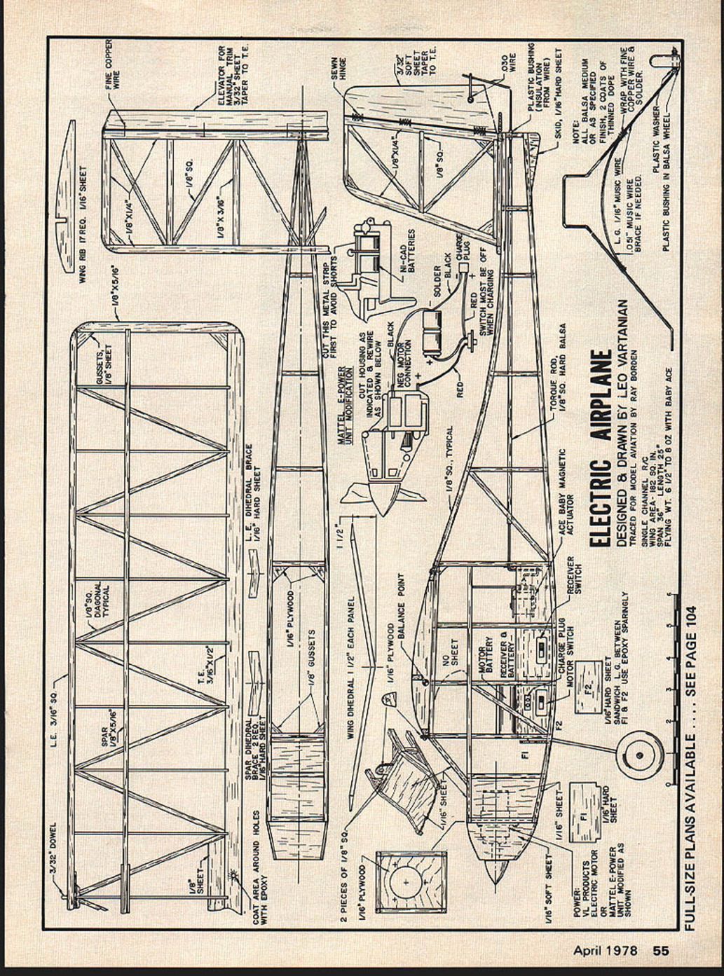 little 36-in sp2Its build poses fl little ere no curved hobby Products flight electric power did have 5/32 DOWELLE 5/16 SQ WING RIB REQ I/IS SHEET PARIIOIAGOt4ALTYPICALItGUSSETS 1-j iiVB SHEET -~~Xw__-COAT AREA AROUND HOLES WiTH EPOXY SPAR DIHEDRAl DR E 2 REQ LJ i/I HARD 4FT .-I/8X5/16 J L E C,rnL BRACE I/16 HARD SHEET I/8SQ I/BX 3/IS LI __GUSSETS PLYWOOOAI~ METAL STRIP F1RST TO AIOTB 2 PIECES OF I/B SQWING DIHEDRAL 1/2 EACH PANEL CUT HOUSING AS 1/16 PLYWOOD BALANCE POINT I/CO1/8SQ TYPICALI_RI/8 SQ / ERY RECEIVER 8 I/IS SOFT SHEET POWERIT1 VL PRODUCTS1FI.zr] ELECTRIC MOTOR OR1/10 HARD MATTEL E-POWERSHEET UNIT MODIFIED AS SHOWN - IIAV-i V -CHARGE PWG MOTOR SWITCH VIHARD SHEET SANDWICH L G BETWEEN Fl SF2 USE EPOXY SPARINGLY FINE cOPPE WIRE ELEVATORFOR MANUAL TRIM II 3/32 SHEET TAPER TO TE /SEWN HINGE SOFT SHEET TAPER TO TE tPLASTIC BUSHING FROM WIRE BABY MAGNETICI/8SQ HARD BALSASKID I/16HARD SHEET RECEIVERACTUATOR SWITCH m NOTE IL ALL BALSA MEDIUM OR AS SPECIFIED ELECTRIC AIRPLANE 4jNED DOPE FINISH 2 COATS OF DESIGNED B DRAWN B LEO VARTANIAN LG 1/16 MUSIC WIRE WRAP WITH FINE 051 MUSIC WIRECOPPER WIRE S TRACED FOR MODEL AVIATION BY RAY BORDENBRACE IF NEEDED SOLDER SINGLE CHANNEL ft/C7N WING AREA- 182 50 INPLASTIC WASHER SPAN 56 LENGTH 25PLASTIC BUSHING IN BALSA WHEEL.%NIi p4pFLYING WT 6 I/2TO 80Z WITH BABY ACE FULL-SIZE PLANS AVAILABLE .. SEE PAGE 104 neflight Just make sure same man eelevator recommended ulse-rudder system Testors receiver /actuator Ace system best its light weight ready use VL systems electric [f choose VL sys Flite System because will run seconds minute jung time flying around inside its fun include couple sketches showing modify Mattel E er electric unit available works well modified properly Weight important model type go easyAfter theres no ftofing worry about straight forward just true Covering Jap , ,ith two coats thinned dope Make sure balsa 2rade specified plans Balsa bought hobby shops make own laminating forget put plas i tne wheel axle hole youve finished model point shown plans point down slightly supported CG point plane suggest mounting nose leaving bat fitch loose Now put battery designated plan radio battery placed just receiver actuator up d receiver may have components fit nodel Try add ballast ship because overall important All-up flying weight exceed eight nine ounces ended up six half ounces e have installation finto make sure left left igrn controls test flew l indoors letting take off tn floor just enough charge electric motor get airborne sure everything okay full charge flew just fine bit up trim needed ele also can test-fly outdoors Lay hand launching over high launching straight ahead ee trim needed tages can md pigtail