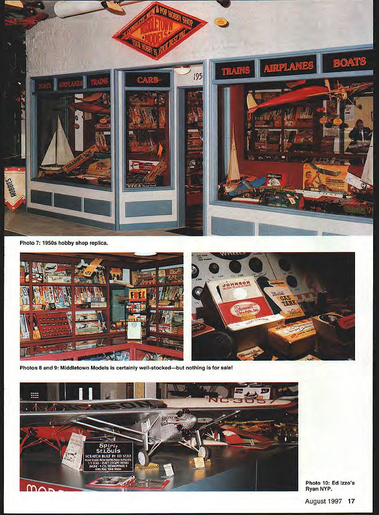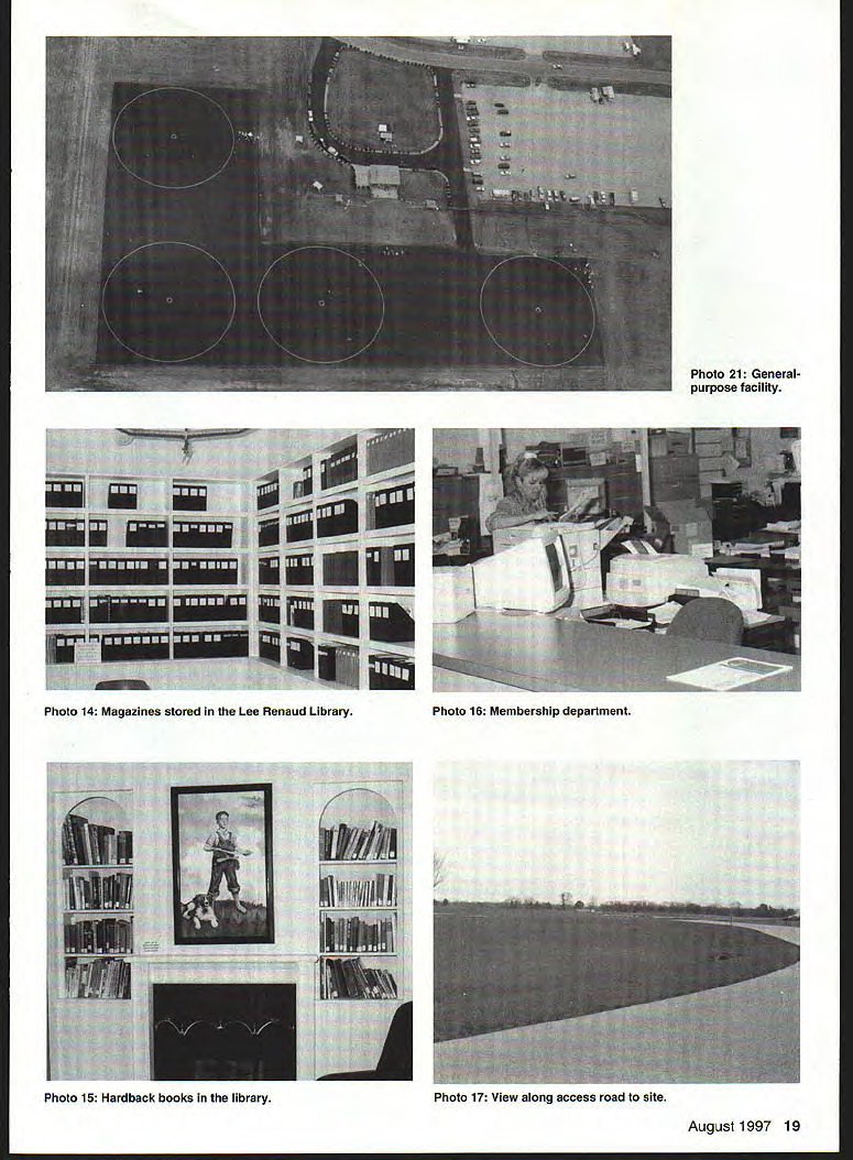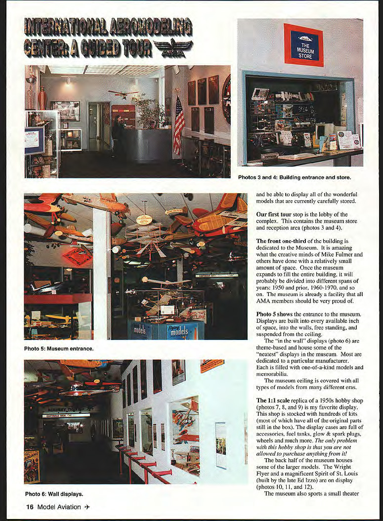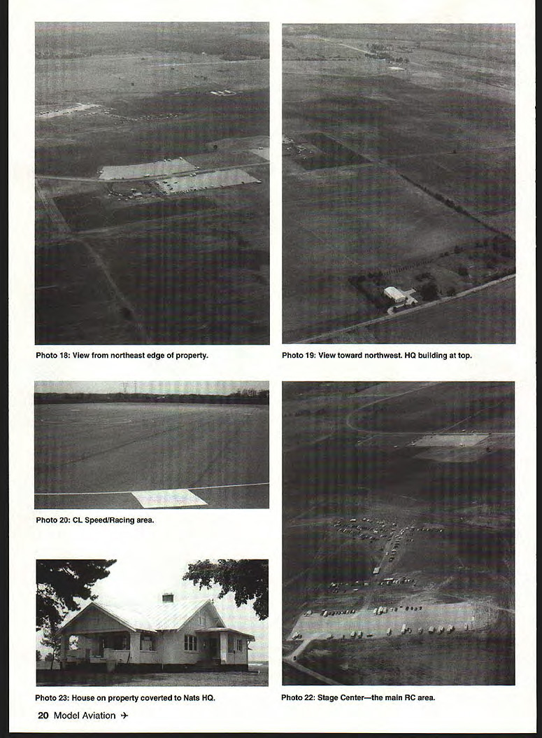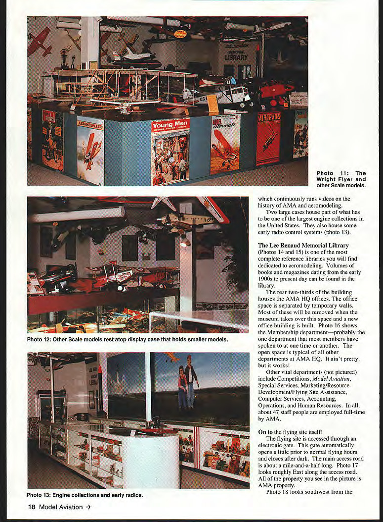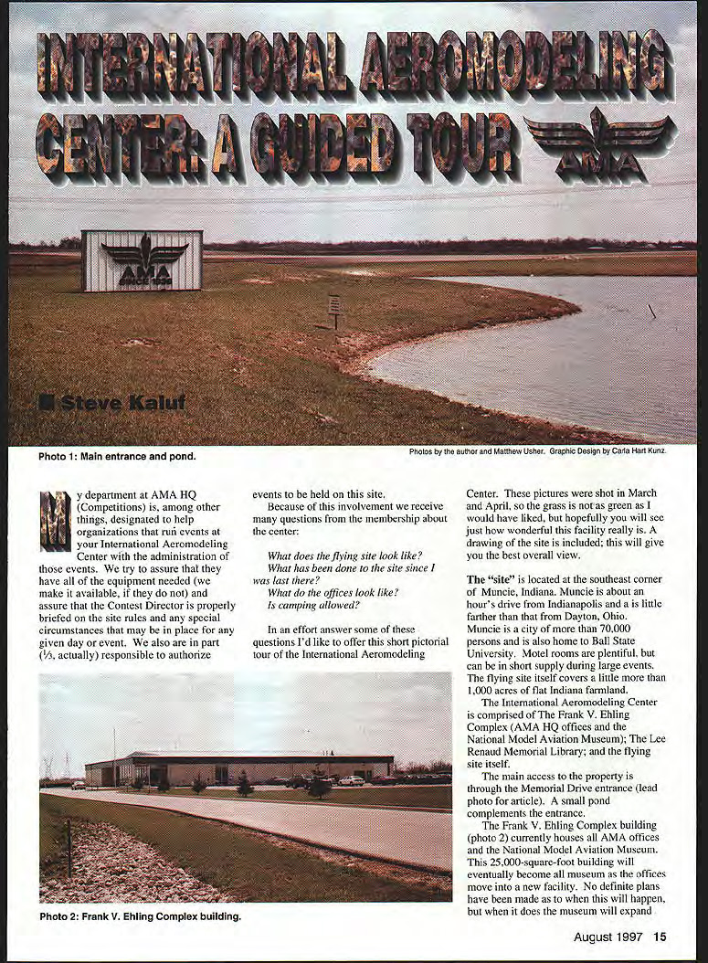 fly department AMA HQ Competitions among other things designated help organizations ruii events International Aeromodeling Center administration events try assure have equipment needed make available assure Contest Director properly briefed site rules special circumstances may place given day event also part 1A actually responsible authorize events held site Because involvement receive questions membership about center What does flying site look like What has done site since last What offices look like camping allowed effort answer some questions Id like offer short pictorial tour International Aeromodeling Center pictures shot March April grass green would have liked hut hopefully will see just wonderful facility really drawing site included will give best overall view site located southeast corner Muncie Indiana Muncie about hours drive Indianapolis little farther Dayton Ohio Muncie city 70000 persons also home Ball State University Motel rooms plentiful can short supply during large events flying site itself covers little 1000 acres flat Indiana farmland International Aeromodeling Center comprised Frank V Ehling Complex AMA HQ offices National Model Aviation Museum Lee Renaud Memorial Library flying site itself main access property through Memorial Drive entrance lead photo article small pond complements entrance Frank V Ehling Complex building photo 2 currently houses AMA offices National Model Aviation Museum 25000-square-foot building will eventually become museum offices move new facility No definite plans have made will happen does museum will expand August1997 15 Photo 2 Frank V Ehling Complex building able display wonderful models currently carefully stored first tour stop lobby complex contains museum store reception area photos 3 4 front one-third building dedicated Museum amazing what creative minds Mike Fulmer others have done relatively small amount space Once museum expands fill entire building will probably divided different spans years 1950 prior 1960-1970 museum already facility AMA members should very proud Photo 5 shows entrance museum Displays built available inch space walls free standing suspended ceiling wall displays photo 6 theme-based house some neatest displays museum Most dedicated particular manufacturer filled one-of-a-kind models memorabilia museum ceiling covered types models different eras 11 scale replica 195 Os hobby shop photos 7 8 9 favorite display shop stocked hundreds kits have original parts still box display cases full accessories fuel tanks glow & spark plugs wheels much problem hobby shop allowed purchase anything hack half museum houses some larger models Wright Flyer magnificent Spirit St Louis built late Ed Izzo display photos 10 11 12 museum also sports small theater 16 Model Aviation os 3 4 Building entrance store Photo 5 Museum entrance p Photo 6 WaIl displays Photo 7 1950s hobby shop replica Photo 10 Ed Izzos Ryan NYP August1997 17 Photos 8 9 Middletown Models certainly well-stockedbut nothing sale Photo 11 The Wright Flyer other Scale models continuously runs videos history AMA aeromodeling Two large cases house part what has largest engine collections United States also house some early radio control systems photo 13 Lee Renaud Memorial Library Photos 14 15 complete reference libraries will find dedicated aeromodeling Volumes books magazines dating early 1900s present day can found library rear two-thirds building houses AMA HQ offices office space separated temporary walls Most will removed museum takes over space new office building built Photo 16 shows Membership departmentprobably department members have spoken time another open space typical other departments AMA HQ aint pretty works Other vital departments pictured include Competitions Model Aviation Special Services Marketing/Resource Development/Flying Site Assistance Computer Services Accounting Operations Human Resources about 47 staff people employed full-time AMA flying site itself flying site accessed through electronic gate gate automatically opens little prior normal flying hours closes after dark main access road about mile-and-a-half long Photo 17 looks roughly East along access road property see picture AMA property Photo 18 looks southwest 18 Model Aviation o 12 Other Scale models rest atop display case holds smaller models Photo 13 Engine collections early radios Photo 15 Hardback books library Photo 21 Generalpurpose facility August1997 19 Photo 14 Magazines stored Lee Renaud Library Photo 16 Membership department Photo 17 View along access road site Photo 23 House property coverted Nats HO 20 Model Aviation o 22 Stage Centerthe main RC area Photo 18 View northeast edge property Photo 19 View toward northwest HO building top Photo 20 CL Speed/Racing area edge AMA property open field southern % property favorite site Free Flight contests test flying offers open area gives best drift over rest property center picture can just see main RC runway general-purpose area L-pad clearly visible Photo 19 looks north toward new RC Soaring Control Line grass area Work area completed fall 1996 New grass growing area expected used 1997 Nationals area 600 x 600 feet graded smooth grass large enough nine Control Line circles launch area Soaring Nationals Photo 20 shows asphalt Control Line Speed Racing area pad has two circles marked properly Speed Racing events Speed pylon bases permanently installed center circle Photo 21 shows pavilion general-purpose facility first flying surface installed site has used fly RC Control Line marked four Control Line circles L configuration used Nationals Control Line Aerobatics truly versatile surface Looking north toward main RC runways photo 22 staff has dubbed area Stage Center large RC events flown complex Two 700-foot runways X configuration provide members wind situation time runway has 200foot grass overrun area end formal asphalt pit area gravel parking lot south runways simple house photo 23 east side property spring 1996 renovated tur