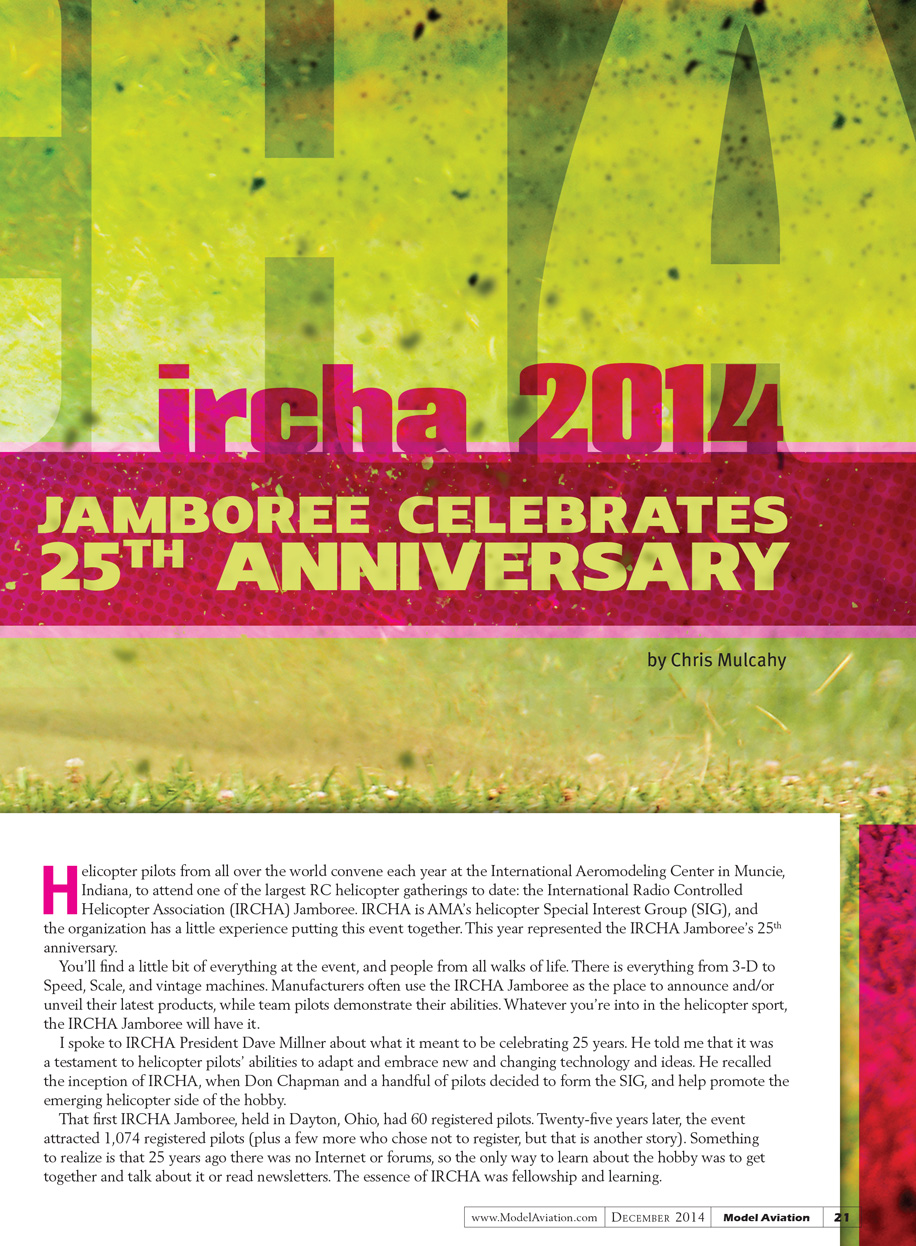 Helicopter pilots from all over the world convene each year at the International Aeromodeling Center in Muncie, Indiana, to attend one of the largest RC helicopter gatherings to date: the International Radio Controlled Helicopter Association (IRCHA) Jamboree. IRCHA is AMA’s helicopter Special Interest Group (SIG), and the organization has a little experience putting this event together. This year represented the IRCHA Jamboree’s 25th anniversary.