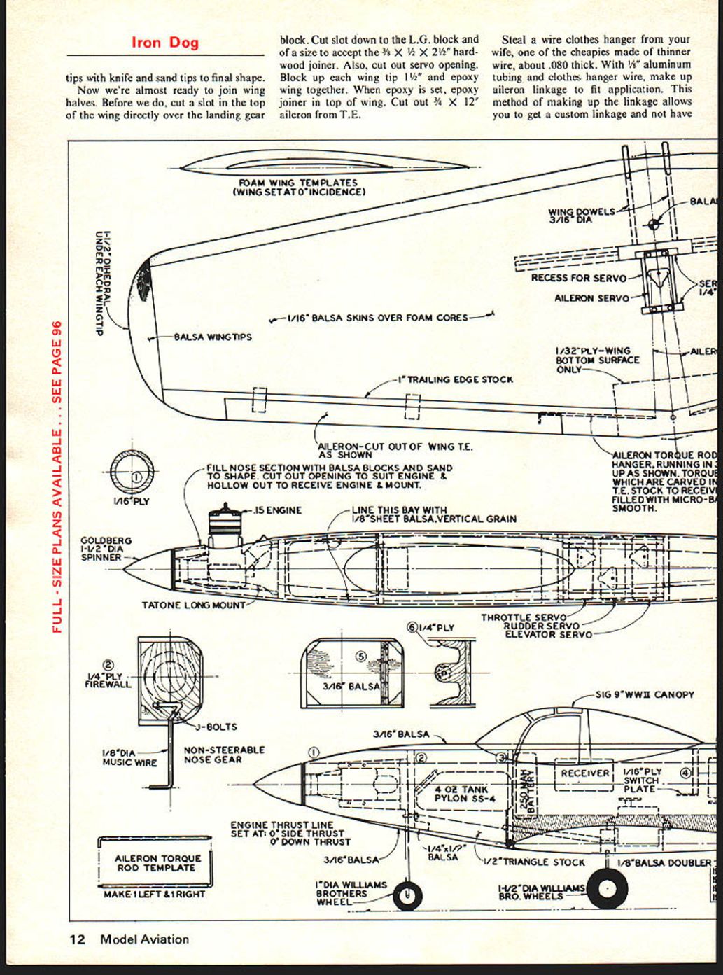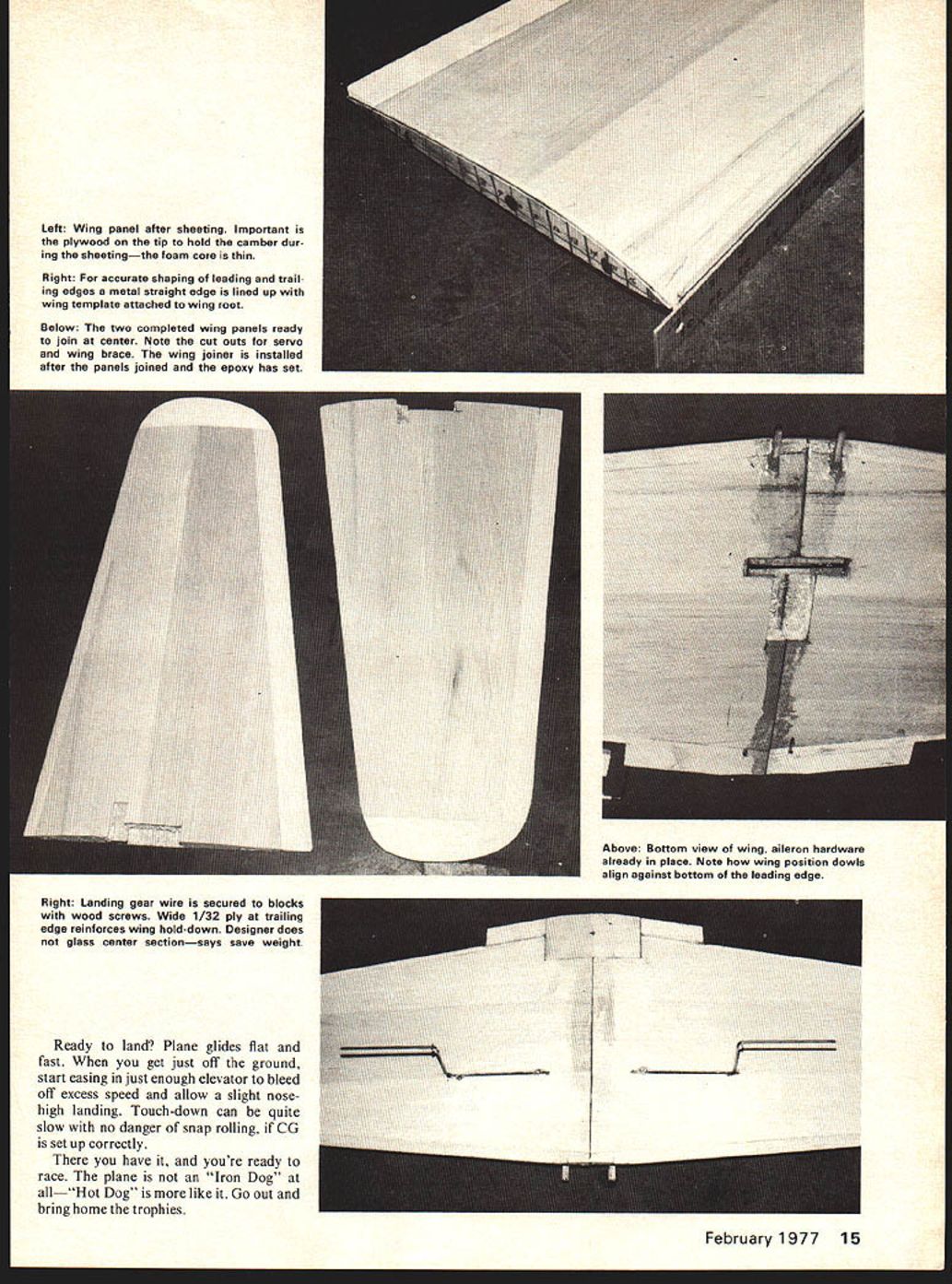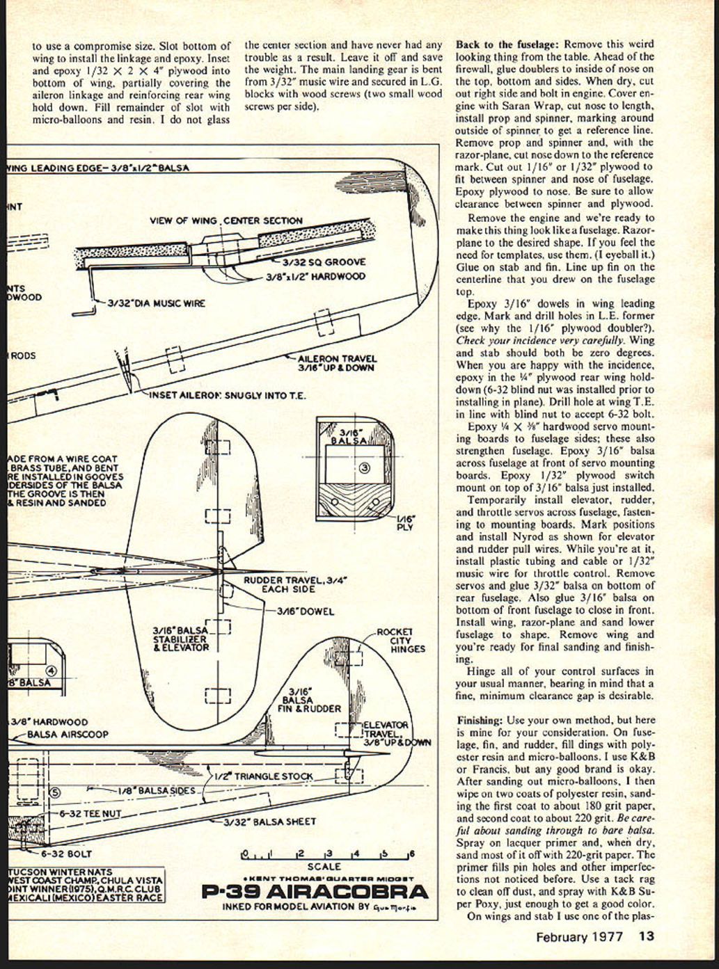 Kent E Thomas s.. S.. SS .. 5SSSSb SSSS S 55 SSS S 55 SSS S 5555S SSSS S 5555 S S S S55SSS 555 S S S SS 1LJ RON DOGE SSSSSSSS 55 S S S S SSSSS SS 555 SS S 555 SSSSSS SS SSS S 555555 .SS. S 5S SS SSS 55555 P55 S S S S 555SS S5 S 55S FOR THE P-39 Airacobra Iron Dog complimentary name such clean beautifully proportioned air plane sleek streamlined shape absence cheek cowls large airscoops makes good subject quarter-mid get racer full-scale plane raced great success just after WW II does qualify eligible design As quarter-midget racer has development about three years past 24 months has brought home trophies other quarter midget Southern California have something good going youre going smileKent Iron Dog Long nose results fact real ship amidships engine location extension shaft running under cockpit prop Start always choose lightest wood can find light airplane close 2 lhs possible desirable Strength has no problem use aliphatic resin glue five-minute epoxy construction except gluing wing sheeting together sheeting wing Zap Hot Stuff will speed up fuselage construction pressed time Fuselage Lay out cut identical right left sides 1/8 balsa Firmly mark LE TE formers firewall thrustline locations inside Glue /2 triangles /8 wing saddle doublers 1/s nose doublers drying cut out 3/16 balsa LE TE formers ood firewall Mark vertical centerline three also mark thrust line firewall usually mark front rear above Cut out LE former tank cradle epoxy 1/16 plywood doubler across bottom support wing dowels Tank cradle cut centerline tank w thrust line use 4-ounce slant Sullivan tank Using centerlines previ ously drawn firewall locate Tatone mount drill holes insert 6-32 blind nuts Mount Tatone mount 6-32 screws Bend /s music wire nose gear Drill firewall below Tatone mount J bolt nose gear firewall Top 1 picture better thousand wordsthe installation Note wing hold-down point Above Conventional aileron linkage aluminum shroud shields servo foul ups Decorative scheme individualistic stand out well air use steerable nose gear Take offs started full throttle rud der steering very positive creating over control plane usually ahead pack going #1 pylon after takeoff due superior ground handling though have go get plane after landing advantage offsets Draw centerline end end 3/16 X 3 balsa fuselage top both sides Pin top flat surface ac curately mark position firewall LE IE formers Epoxy LE TE formers top using L square accu rate alignment Lay out sides using Xacto saw make about four cuts through /2 triangle just behind IE 10 Model Aviation High point winner 1975 QMRC Southern California 22 trophies P-39 Airacobra better Quarter Midgets nation restricted Goodyear types Quarter Midget rules allow wide variety racing planes such P-39 Cobras flew post-war races Thanks engine location real ship very clean nose results model former position Cut through triangle s top bottom triangle Also make about six cuts just ahead LE former top bottom cuts allow fuselage sides bend around formers Epoxy sides together tail post being certain square will create twist fuselage sides glued top usually pinning sides TE former lining marks sides former pull rear together over centerline pin epoxy Now about ready put parts together Get out least large C clamp large enough use across width fuselage scrap pieces ply wood glue pins Before proceeding try fuselage sides proper fit align ment formers Using liberal amount glue thin water necessary glue pin fuselage sides top form ers Using C clamps padded scrap plywood pull sides ahead leading edge until pressing against firewall sides firewall coated glue pressed back against nose doublers sure no down- up-thrust built sighting down along Tatone mount aligning centerline top can assure no side-thrust being built sure centerline firewall aligned center line top everything lined up pin solid double check leave overnight dry Use aliphatic glue allows working time alignment Using care fuselage will come out straight true Well come back fuselage later Tail Cut out stabilizer fin rudder elevator 3/16 balsa Complete ele vator R L cut piece mark ing cutting out Vee center razor-plane sandpaper taper rudder elevator shape LE elevator cut 3/16 3 notch Epoxy 3/16 square hardwood notch epoxy has cured cut out Vee separate R L elevator assures alignment elevators Wing Cut core conventional manner no washout core cut thin great amount care necessary prevent warps twists ing built during skinning process core tip about /s thick al transparent say cant cut foam wings Buy Jack Stafford P-5 quarter-midget wing kit proceed follows First epoxy landing gear boards marked plan cut LE core balsa LE off TE balsa TE top part foam block secured flat table core pinned block epoxy 1/32 plywood tip Use wax paper plywood wont ad block epoxy has cured insert row pins next plywood pinning core tip block Angle-pin root core other pins will removed Core should exact spot cut block Using model cement glue 1/16 balsa sheeting together before skinning wing Using available adhe sives glue sheeting core Place other half block top section just sheeted weight down work other panel both panels sheeted side sheet bottom first re move block trim sheeting Nail other half block table pin core down before sheet second side Weight before Remove later trim Pin cores back blocks glue lead ing trailing edge balsa core using epoxy aliphatic glue glue dry remove cores blocks cut off 1/32 plywood tips trim tips end sheeting Match lengths R L panels trimming tips Reinstall templates used cutting cores mark center leading trailing edges both ends Use straightedge draw line root tip LE TE Get out trusty razor-plane rough shape using reference lines just drawn guide Starting look like wing isnt Finally glue tip block plane sand top bottom curve Cut rounded February 1977 11 Iron Dog tips knife sand tips final shape Now almost ready join wing halves Before cut slot top wing directly over landing gear block Cut slot down LG block ofasizetoacceptthe X ard