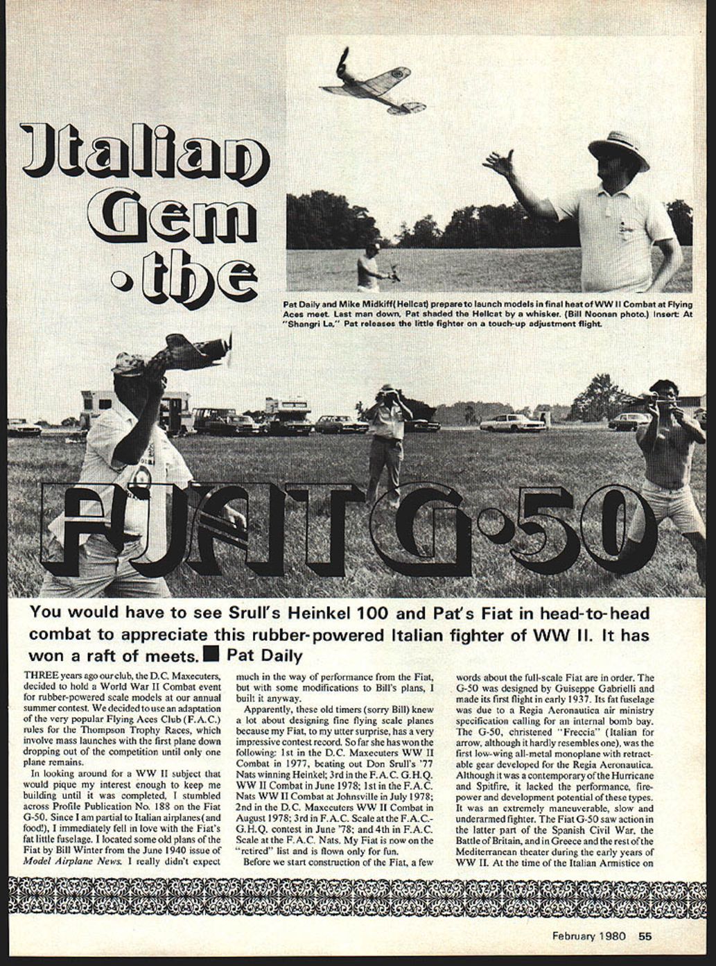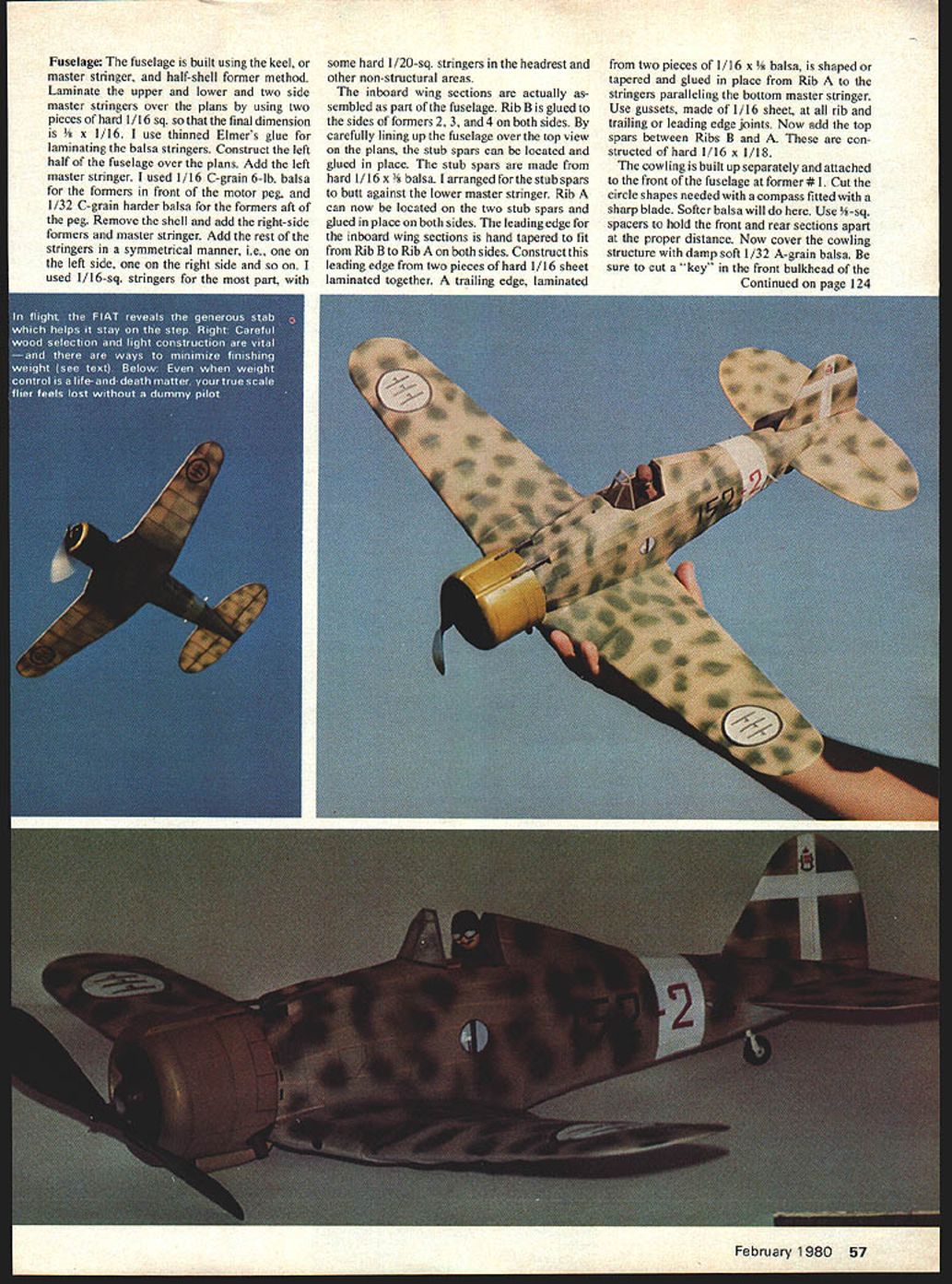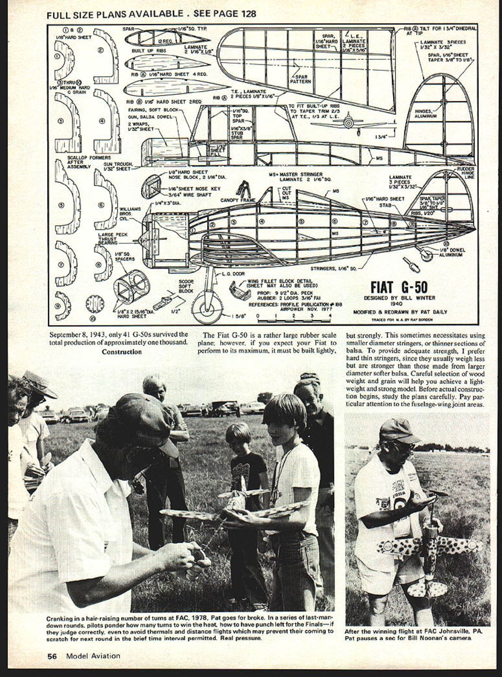 You would have see Srulls Heinkel 100 Pats Fiat head-to-head combat appreciate rubber-powered Italian fighter WW Il has won raft meets U Pat Daily THREE years ago club DC Maxecuters decided hold World War II Combat event rubber-powered scale models annual summer contest decided use adaptation very popular Flying Aces Club FAC rules Thompson Trophy Races involve mass launches first plane down dropping Out competition until plane remains looking around WW II subject would pique interest enough keep building until completed stumbled across Profile Publication No 188 Fiat G-50 Since Jam partial Italian airplanes food immediately fell love Fiats fat little fuselage located some old plans Fiat Bill Winter June 1940 issue Model Airplane News really didnt expect much way performance Fiat some modifications Bills plans built anyway Apparently old timers sorry Bill knew lot about designing fine flying scale planes because Fiat utter surprise has very impressive contest record So far has won following 1st DC Maxecuters WW II Combat 1977 beating out Don Srulls 77 Nats winning Heinkel 3rd FAC GHQ WW II Combat June 1978 1st FAC Nats WW II Combat Johnsville July 1978 2nd DC Maxecuters WW II Combat August 1978 3rd FA C Scale FA C GHQ contest June 78 4th FAC Scale F C Nats Fiat now retired list flown fun Before start construction Fiat few words about full-scale Fiat order G-50 designed Guiseppe Gabrielli made its first flight early 1937 Its fat fuselage due Regia Aeronautica air ministry specification calling internal bomb bay G-50 christened Freccia Italian arrow although hardly resembles first low-wing all-metal monoplane retract able gear developed Regia Aeronautica Although contemporary Hurricane Spitfire lacked performance fire power development potential types extremely maneuverable slow underarmed fighter Fiat G-50 saw action latter part Spanish Civil War Battle Britain Greece rest ofthe Mediterranean theater during early years WW II time Italian Armistice 4-4 February 1980 55 FULL SIZE PLANS AVAILABLE SEE PAGE 128 Os AR_______------RIB TILT FOR 3/4 DIHEDR 6HARO SEETSPAR1LE.AT IP I/I6HARD LAMINATELAMINATE SPIECES 1/32 X 3/32 BULTUPRBS2V6X -------SPAR I/16SHEET 3 THRU4RB6 HARD SHEET 4REQ. I/IS MEDIIU HARD C GRA N FNRIB ECES I/BXI/16 TO FIT BUILT-UP RIBS FAIRING SOFT BLOCKVI6SQTO TAPER TRIM 2HINGES RB RD SHEET 2REO GUN BALSA DOWELTOPAT TE 1/3 AT L SCALLOP FORMERSMS AFTER ASSEMBLYGUN TROUGH________ RUDDER MS MASTER STR NGERHINGE LAMINATELINE LAM NATE 26 SQ3 PIECES CUTI/32X3/32 6 WRE AJOUTMS ANOfY FRA I/lB HARD SHEET TA STAB3/B TO VB _B LARGE PECK THRUST EAR HG 8 50 SPACERS FIAT u-au _____STRINGERS6 50 HG F LLET BLOCK DETAIL HEET MAY ALSO BE USED oCREFERENCES PROP 9 2 DA PECK RUBBER 2 LOOPS 3 6 FADESIGNED BY BILL WINTER PROF LE PUBLICATION # I8 1940 AIRPOWER NOV 977MODIFIED S REDRAWN BY PAT DAILY HARD SHEET5/B0254 September 8 1943 41 G-50s survIved Fiat G-5O rather large rubber scale total production approximately thousand plane however expect Fiat Constructionperform its msximum must built lightly Cranking hair-raising number turns I-AU IIn rat goes oroke Series last- mandown rounds pilots ponder turns win heat have punch left Finalsif judge Correctly avoid thermals distance flights may prevent coming scratch next round brief time interval permitted Real pressure strongly sometimes necessitates using smaller diameter stringers thinner sections balsa provide adequate strength prefer hard thin stringers since usually weigh less stronger made larger diameter softer balsa Careful selection wood weight grain will help achieve light weight strong model Before actual construc tion begins study plans carefully Pay par ticular attention fuselage-wing joint areas 56 Model Aviation Aster tne winning tiignt iML Jannsvuile r4 Pat pauses sec Bill NOonans camera Fuselage fuselage built using keel master stringer half-shell former method Laminate upper lower two side master stringers over plans using two pieces hard 1/16 sq final dimension Vs x 1/16 1 use thinned Elmers glue laminating balsa stringers Construct left half fuselage over plans Add left master stringer used 1/16 C-grain 6-lb balsa formers front motor peg 1/32 C-grain harder balsa formers aft peg Remove shell add right-side formers master stringer Add rest stringers symmetrical manner ie left side right side used 1/16-sq stringers part some hard 1/20-sq stringers headrest other non-structural areas inboard wing sections actually sembled part fuselage Rib B glued sides form ers 2 3 4 both sides carefully lining up fuselage over top view plans stub spars can located glued place stub spars made hard 1/16 x balsa Iarrangedforthestubspars butt against lower master stringer Rib can now located two stub spars glued place both sides leading edge inboard wing sections hand tapered fit Rib B Rib both sides Construct leading edge two pieces hard 1/16 sheet laminated together trailing edge laminated two pieces 1/16 x a shaped tapered glued place Rib stringers paralleling bottom master stringer Use gussets made 1/16 sheet rib trailing leading edge joints Now add top spars between Ribs B con structed hard 1/16 x 1/18 cowling built up separately attached front fuselage former #1 Cut circle shapes needed compass fitted sharp blade Softer balsa will Use -sq spacers hold front rear sections apart proper distance Now cover cowling structure damp soft 1/32 A-grain balsa sure cut key front bulkhead Continued oaae 124 February 1980 57 Survival Kit guess could call rump pack belly pack depending whether facing north south put great carrying odds ends camera binoculars liquid refreshments compass DT fuse extra rubber bands perhaps spare pastrami sandwich snake-bite kit etc Stuff would like have close hand too bulky fit pockets Flip around front get stuff out flip behind will out way rye using decades got ski shoppe years ago Shops specializing rockclimbing back-packing sometimes have too now market designed especially vo0 does enclose required cubic footage addition soft light-