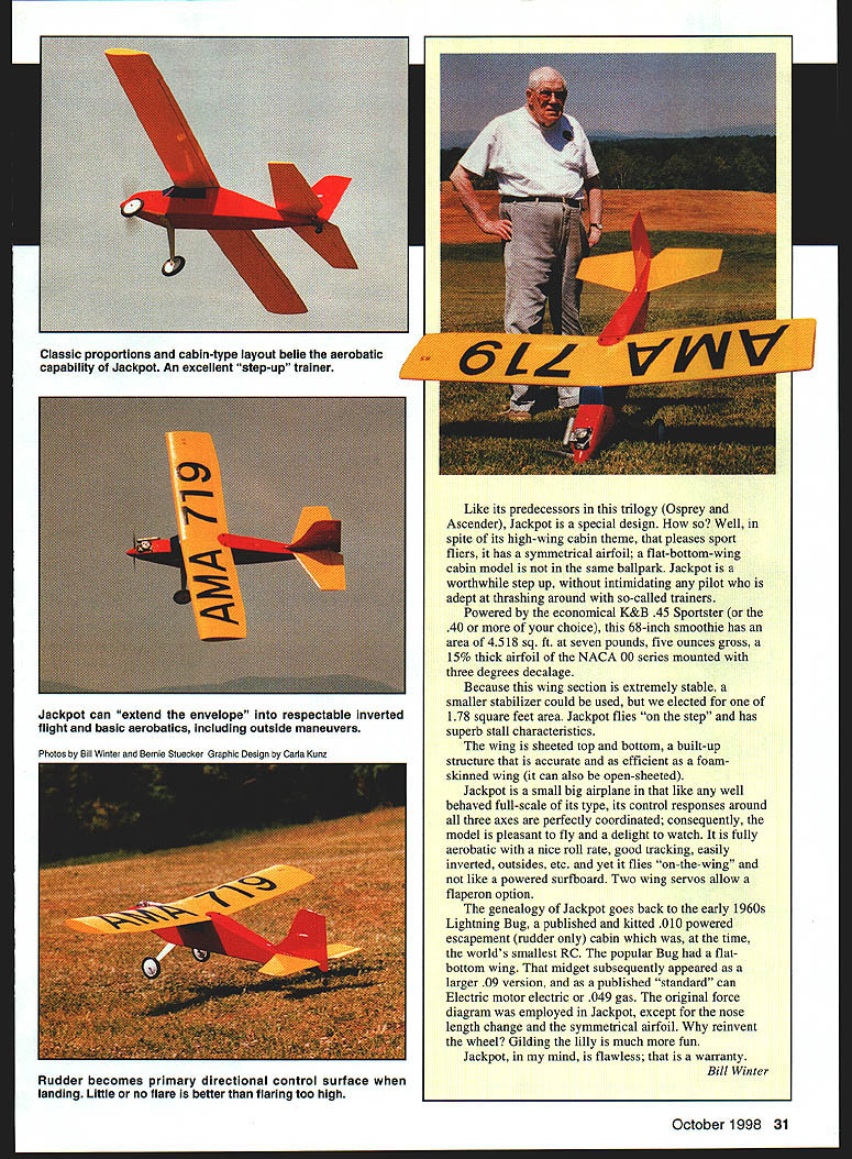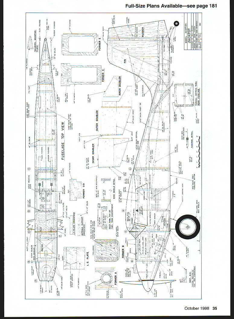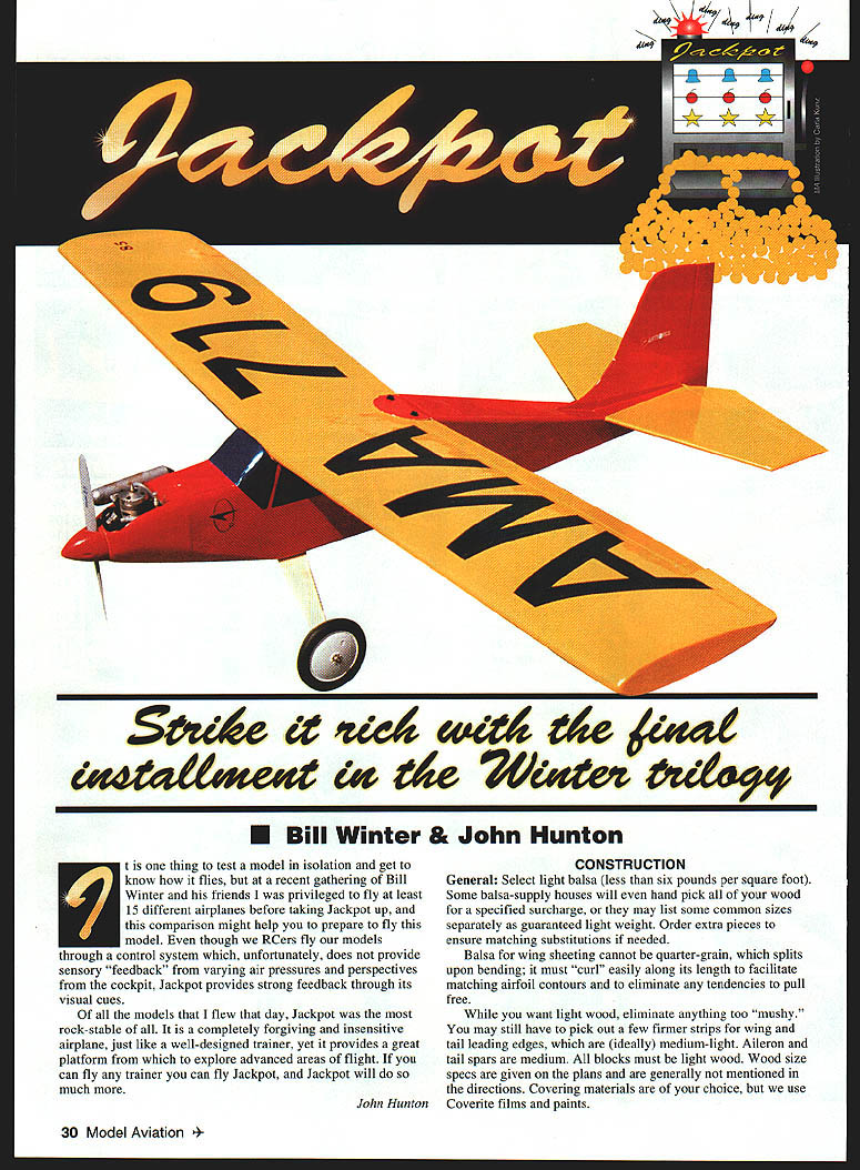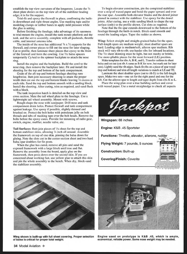 Sszce icd c#ie4 t4e eveaI i#e4ta&ueaC e4 4iate $i4j U Bill Winter & John Hunton thing test model isolation get know flies recent gathering Bill Winter friends privileged fly least 15 different airplanes before taking Jackpot up comparison might help prepare fly model though RCers fly models nruugn control system unfortunately does provide sensory feedback varying air pressures perspectives cockpit Jackpot provides strong feedback through its visual cues models flew day Jackpot rock-stable completely forgiving insensitive airplane just like well-designed trainer yet provides great platform explore advanced areas flight can fly trainer can fly Jackpot Jackpot will much CONSTRUCTION General Select light balsa less six pounds per square foot Some balsa-supply houses will hand pick wood specified surcharge may list some common sizes separately guaranteed light weight Order extra pieces ensure matching substitutions needed Balsa wing sheeting cannot quarter-grain splits upon bending must curl easily along its length facilitate matching airfoil contours eliminate tendencies pull free want light wood eliminate anything too mushy may still have pick out few firmer strips wing tail leading edges ideally medium-light Aileron tail spars medium blocks must light wood Wood size specs given plans generally mentioned directions Covering materials choice use John Hunton Coverite films paints 30 Model Aviation sic proportions cabin-type layout belie aerobatic capability Jackpot An excellent step-up trainer Photos Bill Winter Bernie Stuecker Graphic Design Carla Kunz Like its predecessors trilogy Osprey Ascender Jackpot special design Well spite its high-wing cabin theme pleases sport fliers has symmetrical airfoil flat-bottom-wing cabin model same ballpark Jackpot worthwhile step up intimidating pilot adept thrashing around so-called trainers Powered economical K&B 45 Sportster 40 choice 68-inch smoothie has area 4518 sq ft seven pounds five ounces gross 15% thick airfoil NACA 00 series mounted three degrees decalage Because wing section extremely stable smaller stabilizer could used elected 178 square feet area Jackpot flies step has superb stall characteristics wing sheeted top bottom built-up structure accurate efficient foamskinned wing can also open-sheeted Jackpot small big airplane like well behaved full-scale its type its control responses around three axes perfectly coordinated consequently model pleasant fly delight watch fully aerobatic nice roll rate good tracking easily inverted outsides etc yet flies on-the-wing like powered surfboard Two wing servos allow flaperon option genealogy Jackpot goes back early 1 960s Lightning Bug published kitted 010 powered escapement rudder cabin time worlds smallest RC popular Bug flatbottom wing midget subsequently appeared larger 09 version published standard can Electric motor electric 049 gas original force diagram employed Jackpot except nose length change symmetrical airfoil reinvent wheel Gilding lilly much fun Jackpot mind flawless warranty Bill Winter October1998 31 Jackpot can extend envelope respectable inverted flight basic aerobatics including outside maneuvers Rudder becomes primary directional control surface landing Little no flare better flaring too high frame has noteworthy features wing optional open framing stabilizer sheeted balsa top bottom aft top bottom fuselage sheeting runs lengthwise fuselage flying surfaces true efficient strong wood selected indicated gross weight quite acceptable Fuselage Make thin cardboard side template fuselage profile wing mount using front butt tine side sheeting baseline cut another template aft end extending forward station stab leading edge Use templates marking outlines guaranteeing precise duplication relative incidence angles wing stab complete assembly windshield area until holes two wing hold-down dowels have drilled through predrilled former holes wing grabber plate Note dowels integral fuselage True edges side sheeting clamping metal straightedge over sheet bench top trim #11 XActoTM knife Extend sheeting required kerfed joint cannot get 48-inch balsa sides Use pins and/or masking tape hold seams together Join cyanoacrylate CyA glue Align bottom edges both side sheets clamp bench opposite sides up mark off former positions soft pencil T-square Downthrust side thrust right provided tilting slanting firewall side will preassembled far possible before joining Cut inner outer nose doublers trial-fit attach outer doublers spray contact cement such 3MTM repeat inner doublers Pin CyA longerons cross pieces place Cut firewall bulkheads formers similar plywood parts Drill required holes including fuel lines throttle linkage etc firewall Drill blind nuts landing gear plate install epoxy Place completed sides flat bench trial-fit key bulkheads side time Install formers C E side using yellow carpenters glue allow shifting parts precise positioning Start former C position right angles side using small triangle repeat former E recheck alignment before glue finally sets Note former C above bottom line side sheet E flush top surface bottom sheeting Lay down remaining side trial-fit completed first side projecting firewall former glue place Make sure formers have reached rock bottom Check alignment repeatedly small triangle Rest partial fuselage its bottom Both sides must flush board sides right angles bench dry test-pull fuselage together aft end insure will join accurately end-to-end Invert fuselage glue landing gear plate place member will serve fixture hold structure true Weigh down ensure good tight glue joint Locate two 1/4 squares extend top inner doubler between C E install plywood holddown plate drill boles yet ensures fuselage will distort rear end joined Before joining sides rear use pins and/or appropriate clamps trial-fit fin-post joint Place fuselage over top view plan adjust until joint precisely centerline vertical board Flow some thin CyA back up thicker CyA needed Former DD located lower fuselage 
