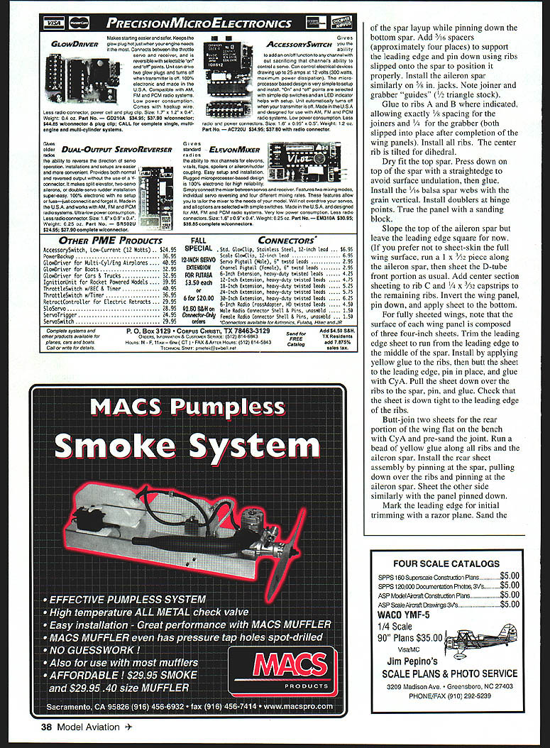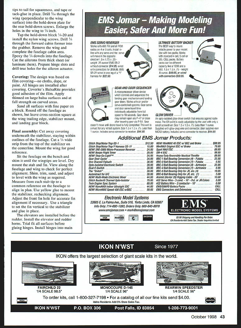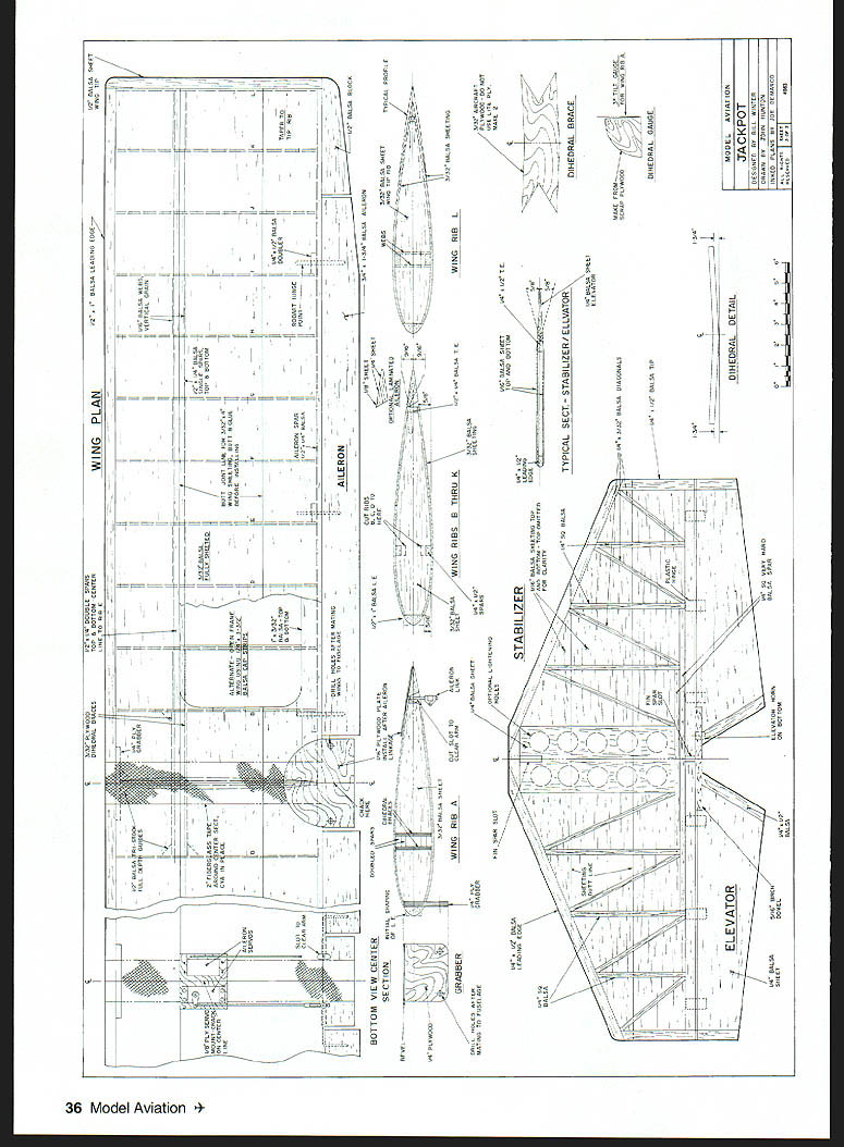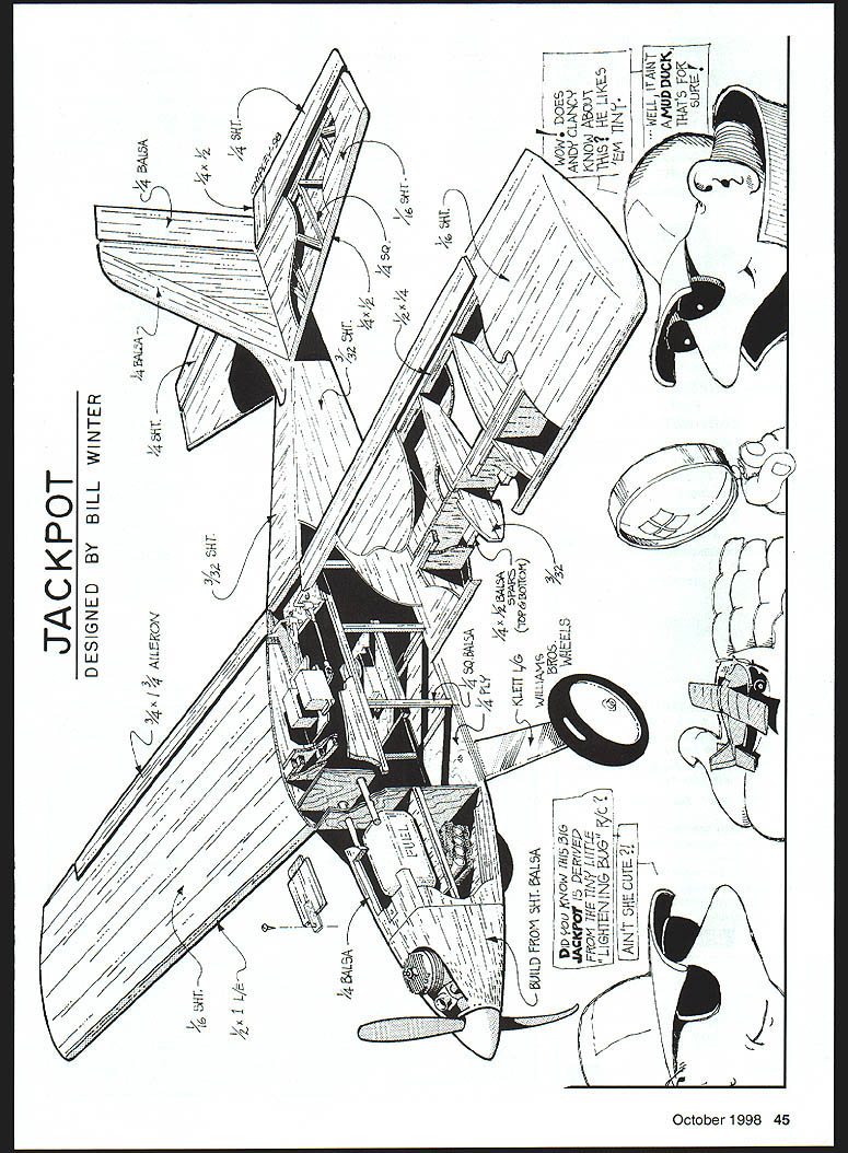 Sszce icd c#ie4 t4e eveaI i#e4ta&ueaC e4 4iate $i4j U Bill Winter & John Hunton thing test model isolation get know flies recent gathering Bill Winter friends privileged fly least 15 different airplanes before taking Jackpot up comparison might help prepare fly model though RCers fly models nruugn control system unfortunately does provide sensory feedback varying air pressures perspectives cockpit Jackpot provides strong feedback through its visual cues models flew day Jackpot rock-stable completely forgiving insensitive airplane just like well-designed trainer yet provides great platform explore advanced areas flight can fly trainer can fly Jackpot Jackpot will much CONSTRUCTION General Select light balsa less six pounds per square foot Some balsa-supply houses will hand pick wood specified surcharge may list some common sizes separately guaranteed light weight Order extra pieces ensure matching substitutions needed Balsa wing sheeting cannot quarter-grain splits upon bending must curl easily along its length facilitate matching airfoil contours eliminate tendencies pull free want light wood eliminate anything too mushy may still have pick out few firmer strips wing tail leading edges ideally medium-light Aileron tail spars medium blocks must light wood Wood size specs given plans generally mentioned directions Covering materials choice use John Hunton Coverite films paints 30 Model Aviation sic proportions cabin-type layout belie aerobatic capability Jackpot An excellent step-up trainer Photos Bill Winter Bernie Stuecker Graphic Design Carla Kunz Like its predecessors trilogy Osprey Ascender Jackpot special design Well spite its high-wing cabin theme pleases sport fliers has symmetrical airfoil flat-bottom-wing cabin model same ballpark Jackpot worthwhile step up intimidating pilot adept thrashing around so-called trainers Powered economical K&B 45 Sportster 40 choice 68-inch smoothie has area 4518 sq ft seven pounds five ounces gross 15% thick airfoil NACA 00 series mounted three degrees decalage Because wing section extremely stable smaller stabilizer could used elected 178 square feet area Jackpot flies step has superb stall characteristics wing sheeted top bottom built-up structure accurate efficient foamskinned wing can also open-sheeted Jackpot small big airplane like well behaved full-scale its type its control responses around three axes perfectly coordinated consequently model pleasant fly delight watch fully aerobatic nice roll rate good tracking easily inverted outsides etc yet flies on-the-wing like powered surfboard Two wing servos allow flaperon option genealogy Jackpot goes back early 1 960s Lightning Bug published kitted 010 powered escapement rudder cabin time worlds smallest RC popular Bug flatbottom wing midget subsequently appeared larger 09 version published standard can Electric motor electric 049 gas original force diagram employed Jackpot except nose length change symmetrical airfoil reinvent wheel Gilding lilly much fun Jackpot mind flawless warranty Bill Winter October1998 31 Jackpot can extend envelope respectable inverted flight basic aerobatics including outside maneuvers Rudder becomes primary directional control surface landing Little no flare better flaring too high frame has noteworthy features wing optional open framing stabilizer sheeted balsa top bottom aft top bottom fuselage sheeting runs lengthwise fuselage flying surfaces true efficient strong wood selected indicated gross weight quite acceptable Fuselage Make thin cardboard side template fuselage profile wing mount using front butt tine side sheeting baseline cut another template aft end extending forward station stab leading edge Use templates marking outlines guaranteeing precise duplication relative incidence angles wing stab complete assembly windshield area until holes two wing hold-down dowels have drilled through predrilled former holes wing grabber plate Note dowels integral fuselage True edges side sheeting clamping metal straightedge over sheet bench top trim #11 XActoTM knife Extend sheeting required kerfed joint cannot get 48-inch balsa sides Use pins and/or masking tape hold seams together Join cyanoacrylate CyA glue Align bottom edges both side sheets clamp bench opposite sides up mark off former positions soft pencil T-square Downthrust side thrust right provided tilting slanting firewall side will preassembled far possible before joining Cut inner outer nose doublers trial-fit attach outer doublers spray contact cement such 3MTM repeat inner doublers Pin CyA longerons cross pieces place Cut firewall bulkheads formers similar plywood parts Drill required holes including fuel lines throttle linkage etc firewall Drill blind nuts landing gear plate install epoxy Place completed sides flat bench trial-fit key bulkheads side time Install formers C E side using yellow carpenters glue allow shifting parts precise positioning Start former C position right angles side using small triangle repeat former E recheck alignment before glue finally sets Note former C above bottom line side sheet E flush top surface bottom sheeting Lay down remaining side trial-fit completed first side projecting firewall former glue place Make sure formers have reached rock bottom Check alignment repeatedly small triangle Rest partial fuselage its bottom Both sides must flush board sides right angles bench dry test-pull fuselage together aft end insure will join accurately end-to-end Invert fuselage glue landing gear plate place member will serve fixture hold structure true Weigh down ensure good tight glue joint Locate two 1/4 squares extend top inner doubler between C E install plywood holddown plate drill boles yet ensures fuselage will distort rear end joined Before joining sides rear use pins and/or appropriate clamps trial-fit fin-post joint Place fuselage over top view plan adjust until joint precisely centerline vertical board Flow some thin CyA back up thicker CyA needed Former DD located lower fuselage 