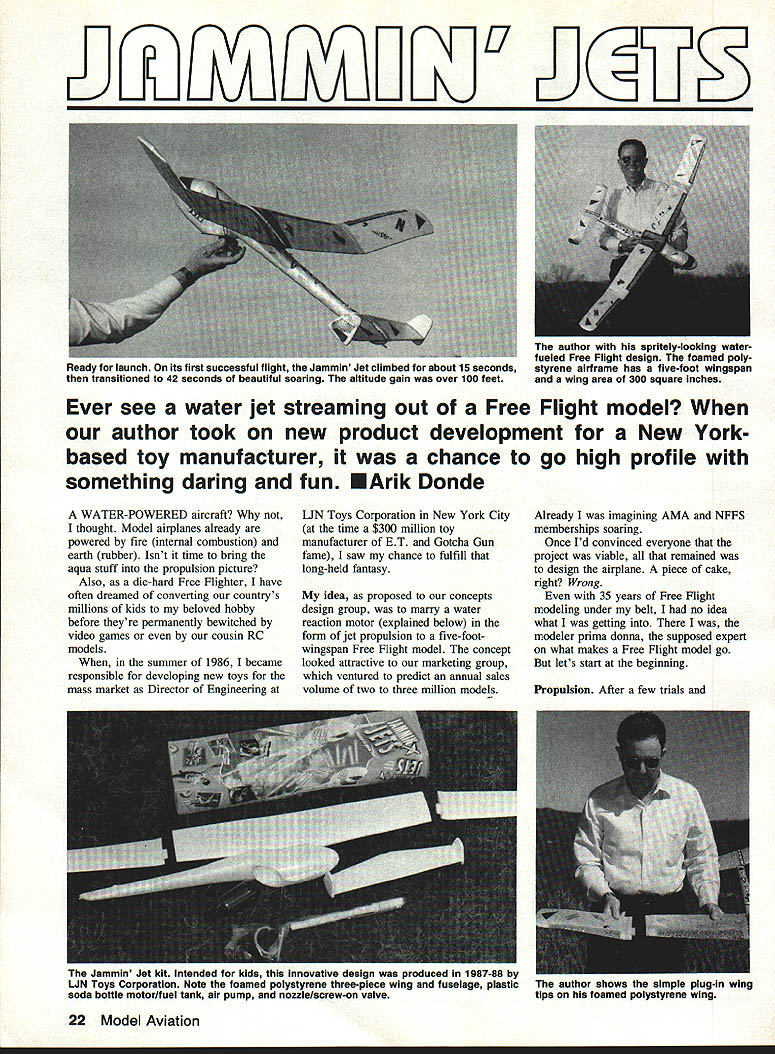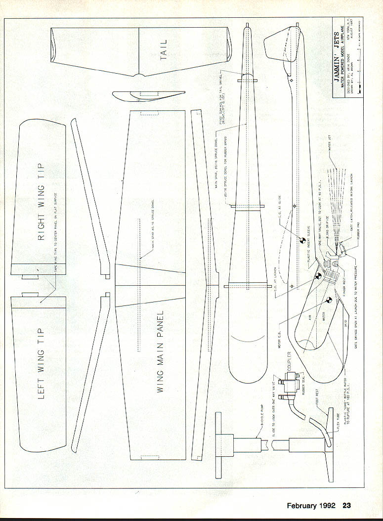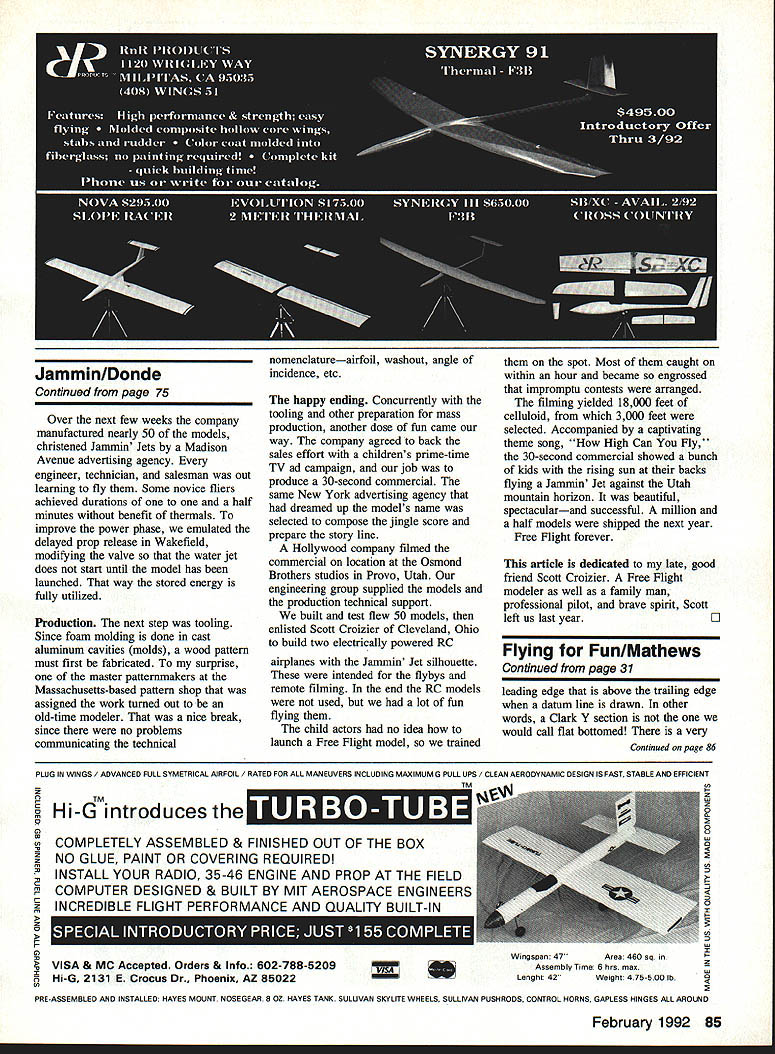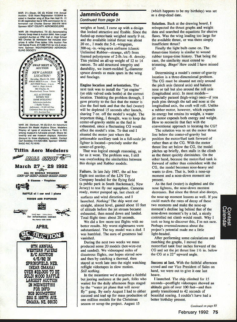 ELI WLYJ2LiWEIDJ Ever see water jet streaming out Free Flight model author took new product development New Yorkbased toy manufacturer chance go high profile something daring fun HAnk Donde WATER-POWERED aircraft thought Model airplanes already powered fire internal combustion earth rubber Isnt time bring aqua stuff propulsion picture Also die-hard Free Flighter have often dreamed converting countrys millions kids beloved hobby before theyre permanently bewitched video games cousin RC models summer 1986 became responsible developing new toys mass market Director Engineering UN Toys Corporation New York City time $300 million toy manufacturer ET Gotcha Gun fame saw chance fulfill long-held fantasy idea proposed concepts design group marry water reaction motor explained below form jet propulsion five-footwingspan Free Flight model concept looked attractive marketing group ventured predict annual sales volume two three million models Already imagining AMA NFFS memberships soaring Once Id convinced everyone project viable remained design airplane piece cake right Wrong 35 years Free Flight modeling under belt no idea what getting modeler prima donna supposed expert what makes Free Flight model go lets start beginning Propulsion After few trials 22 Model Aviation Ready launch its first successful flight Jammin Jet climbed about 15 seconds transitioned 42 seconds beautiful soaring altitude gain over 100 feet author sprltely-looking waterfueled Free Flight design foamed poly styrene airframe has five-foot wingspan wing area 300 square inches Jammin Jet kit Intended kids innovative design produced 1987-88 UN Toys Corporation Note foamed polystyrene three-piece wing fuselage plastic soda bottle motor/fuel tank air pump nozzle/screw-on valve author shows simple plug-In wing tips foamed polystyrene wing TA L PIVOT S ACE 0 0 E SWIVEL 07 10 DFRGE DOWEL F RUBBER BOLOS RIGHT EV C DC AL SE DE 00 COCA OVER ONE WAY VA ~ WOTOR 00 G AT O OE A- CQULER- ONEWAD OALAESET TO LEAR AR 00 P51 $040 ORIFICE LEO TABEVBVBZiZ ----JAMMIN JETS WATER POWERED MODEL AIRPLANE FASRIC COKE ROTTLE RATED TO RUPOERE AR 100 P51DESIONED WV AR 00900NEW VORAND CAVE AOEIIBELEASED BEFORE LABUCADRAWN BY AL WROBO AGOYT 1987 GATE SW NOD OPEL AT LAUNEB DUE TO WATER PRESSORE BOBBER EAO brainstorming sessions design group narrowed its focus motor/fuel tank thought would work concept simple Wed start 12-oz plastic soda bottle half fill plain old tap water manually pump up other half air remember ordinary bicycle pump 60 psi bottle rated 160 psi rapture pressure screw-on valve designed ensure leakage some rascal try overpressurize bottle corner gas station 60-ft steel cable strung six feet high along lab accept pulley/carriage gizmo soda bottle motor hung bottle pumped up testing began duration distance acceleration weight rate water discharge thrust After some iterative refinements miles videotape decided nozzle diameter 004 data collected indicated jet run 13 16 seconds initial velocity 20 30 feet per second up 20 ounces thrust water jet eruption spectacular toyand drenching So far testing turned up nothing new What conventional reaction motor Water jet momentum exchanged model momentum propelling aircraft forward Time vs thrust curves indicated nonlinear decay expected compressed gas/water mixture released through small orifice aka exhaust pipe initial high burst rapid 10% total motor run decay knee followed longer shallower 60% decay sudden drop zero As well know after 25 years experience flying rubber-powered models time history released energy stored wound rubber can mathematically modeled after perfect gas behavior yet failed detect similarities first blind spot time arrived successful model configuration support new product almost ran out read gets better Configurationairframe design data thrust duration estimated Continued page 75 24 Model Aviation Made 12-az plastic soda bottle motor/fuel tank has 004-in-diameter noz zle screw-on valve ensures leakage case overpressurization fle motorfluel tank halt tilled water soda bottle motor/tank nozzle pumped bicycle pump 160 psi bicycle pump air hose nozzle Above Installing motor four inches forward center-of-gravity setting jet thrust line 1 below CG 22 rd angle achieves nicely controlled climb low water jet efflux still strongly concentrated model begins its climb DE MAR 21Dover DE E KCAM 11th Annual Auction 1200 Noon Regiafration 1000AM lo cated theather wing Blue Hen Mall Rt 13 $100 registration fee & 10% commission formation call Charles Sterner 302878 0618 Sponsor KENT COUNTY AEROMODELERS TX MAR 28Weatherford TX E Aeromodeling Society Swap Meet & Auction 8AM New Larger Local ion Auction 1PM Half Jr High School 902 Charles $5 Admission fee includes door prizes & raffle Free tables 10% Auction Fee Call Sandy Frank 817-S99-7131 info & direc lions Sponsor WEATHERFORD AEROMOD ELING SOCIETY pIOMq ~SWAP MEET & AUCTION f NEW LARGER TION iSaturday Maeeh 28 1992 Hall Jr High School SWAPMEETSaos-Naan r AUCTION Noon-4 pot 902 Charlro StL Weatherfoed Tenao 76086 ALL ACTIVITIES WI THIN THE SAME BUILDING Admission includes 5 Raffle Tickets Adotisaiso 5 Day Unlimited Free Swap Space 10 Auction Fee kCvvvvvvvvv4w WI MAR 28Oshkosh WI E EM Air Adventure Museum 5th Model Airplane Show Modelers Display types airplanes Plastic RIC among museums lull-scale aircraft Share fel lowship see museum displays Admision discount displaying models Contact Carl Swickley 414-428-4800 Sponsor WINNE BAGO RIC FLYERS TIff Aero Modelers ~ March 27 29 1992 ALL RB MODULE WELCOME U CIa.. Tesphla RAPPLE 1 cas d plasm VIDEOS AND PICTURES Infurmailon contact e~ see-sees APRIL Jammin/Donde Continued page 24 weights hand came up design looked attractive flyable Since fueled-up motor/tank weighed nearly 9 oz available initial thrust about 20 oz made 5-ft-wingspan 300-sq-in-wing-area airframe classic Unlimited Rubberstrange eh foamed polystyrene 2-1W/cu-ft density yielded all-up weight 12 14 ounces add structural integrity durability inse