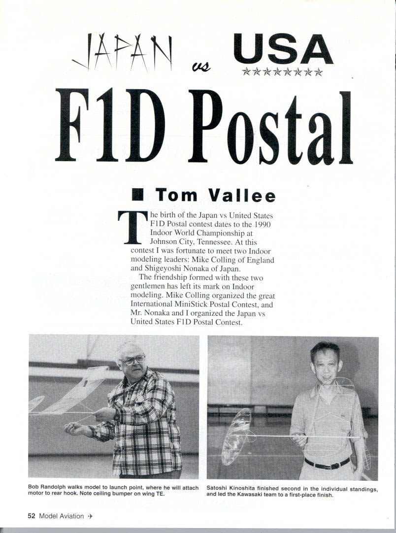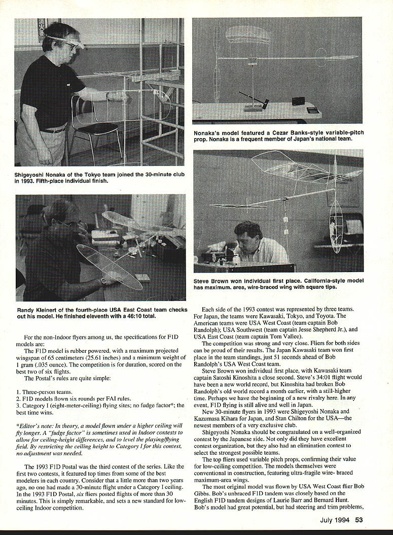 4AAM F1D USA Postal U Tom Vallee birth Japan vs United States FiD Postal contest dates 1990 Indoor World Championship Johnson City Tennessee contest fortunate meet two Indoor modeling leaders Mike Colling England Shigeyoshi Nonaka Japan friendship formed two gentlemen has left its mark Indoor modeling Mike CoIling organized great International MiniStick Postal Contest Mr Nonaka organized Japan vs United States FiD Postal Contest 52 Model Aviation Randolph walks model launch point will attach Satoshi Kinoshita finished second individual standings motor rear hook Note ceiling bumper wing TE led Kawasaki team first-place finish non-Indoor flyers among us specifications FiD models FiD model rubber powered maximum projected wingspan 65 centimeters 2561 inches minimum weight 1 gram 035 ounce competition duration scored best two six flights Postals rules quite simple 1 Three-person teams 2 FiD models flown six rounds per FAI rules 3 Category eight-meter-ceiling flying sites no fudge factor* best time wins *Editors note theory model flown under higher ceiling will fly longer fudge factor sometimes used Indoor contests allow ceiling-height differences level playing/flying field restricting ceiling height Category Ifor contest no adjustment needed 1993 FlD Postal third contest series Like first two contests featured top times some best modelers country Consider little two years ago no made 30-minute flight under Category ceiling 1993 FlD Postal six fliers posted flights 30 minutes simply remarkable sets new standard lowceiling Indoor competition side 1993 contest represented three teams Japan teams Kawasaki Tokyo Toyota American teams USA West Coast team captain Bob Randolph USA Southwest team captain Jesse Shepherd Jr USA East Coast team captain Tom Vallee competition strong very close fliers both sides can proud results Japan Kawasaki team won first place team standings just 51 seconds ahead Bob Randolphs USA West Coast team Steve Brown won individual first place Kawasaki team captain Satoshi Kinoshita close second Steves 3401 flight would have new world record Kinoshita broken Bob Randolphs old world record month earlier still-higher time Perhaps have beginning new rivalry event FlD flying still alive well Japan New 30-minute flyers 1993 Shigeyoshi Nonaka Kazumasa Kihara Japan Stan Chilton USAthe newest members very exclusive club Shigeyoshi Nonaka should congratulated well-organized contest Japanese side did have excellent contest organization also elimination contest select strongest possible teams top fliers used variable pitch props confirming value low-ceiling competition models themselves conventional construction featuring ultra-fragile wire- braced maximum-area wings original model flown USA West Coast flier Bob Gibbs Bobs unbraced FlD tandem closely based English FiD tandem designs Laurie Barr Bernard Hunt Bobs model great potential steering trim problems July1994 53 Shigeyoshi Nonaka Tokyo team joined 30-minute club 1993 Fifth-place individual finish Nonakas model featured Cezar Banks-style variable-pitch prop Nonaka frequent member Japans national team Randy Kleinert fourth-place USA East Coast team checks out model finished eleventh 4610 total Steve Brown won individual first place California-style model has maximum area wire-braced wing square tips gave him trouble adjusting low ceiling particular tandem FiD little wild burst high launch torque beginning flight spite problems am convinced Bobs approach valid will see tandem FiDs future am grateful team captains Bob Randolph Jesse Shepherd Jr efforts would like extend special thanks Jesse efforts organizing USA Southwest team night before part contest large model box dropped just wrong way models destroyed Jesse flew contest airplane put together parts old models Despite problems Jesse enthused 30-minute flying teammate Stan Chilton looks forward flying next contest better models Thanks also Jim Clem last-minute substitute Jesses dad Jesse Shepherd Sr models also destroyed accident Fl D Postal has proved can just about same time Cat room Tokyo can similar room Loma Linda California Bedford Texas Greenbelt Maryland contest results much what would expect contestants flying same room same day postal contest provides unique opportunity Indoor fliers willing work organizing team can fly world-class international competition against some strongest fliers world local Category gym armory hope opportunity will lead renewed interest FiD modeling will encourage new fliers try luck FlD Helping organize fly friendly contest best Japanese Indoor fliers has real pleasure would like congratulate fliers collective efforts have given us such good contest odel Aviation Gibbs radical unbraced tandem model based British Fl D designs Barr Hunt Showed great potential