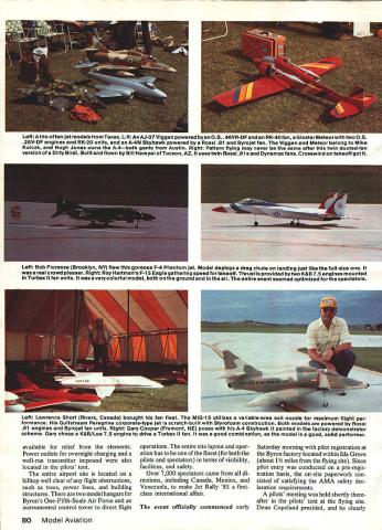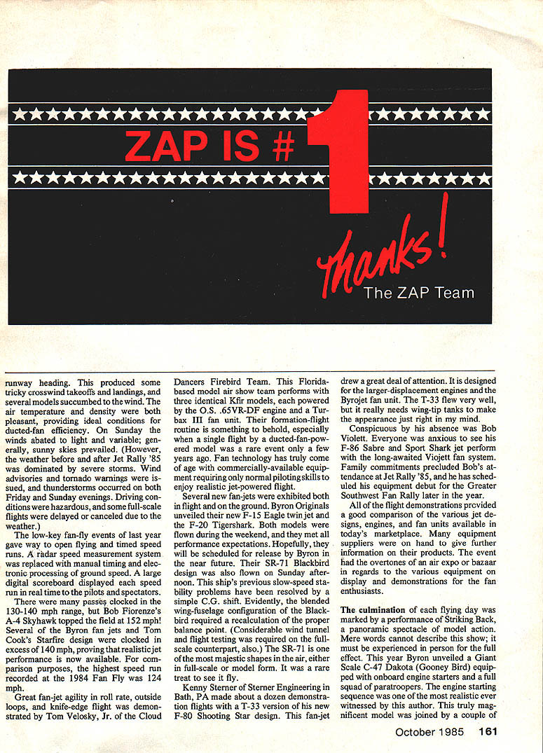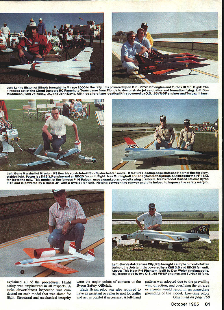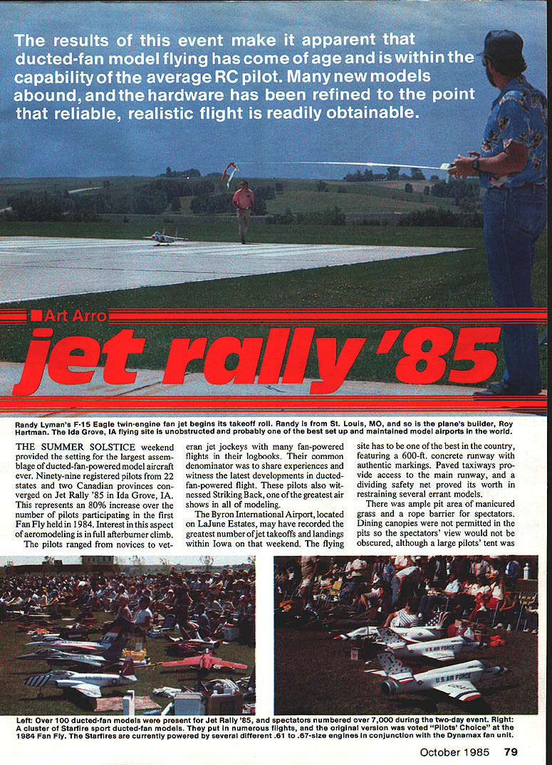 Randy Lymans F-15 Eagle twin-engine fan jet begins its takeoff roll Randy St Louis MO planes builder Roy Hartman Ida Grove IA flying site unobstructed probably best set up maintained model airports world THE SUMMER SOLSTICE weekend provided setting largest assem blage ducted-fan-powered model aircraft ever Ninety-nine registered pilots 22 states two Canadian provinces con verged Jet Rally 85 Ida Grove IA represents 80% increase over number pilots participating first Fan Fly held 1984 Interest aspect aeromodeling full afterburner climb pilots ranged novices veteran jet jockeys fan-powered flights logbooks common denominator share experiences witness latest developments ducted fan-powered flight pilots also wit nessed Striking Back greatest air shows modeling Byron International Airport located LaJune Estates may have recorded greatest number ofjet takeoffs landings within Iowa weekend flying site has best country featuring 600-ft concrete runway authentic markings Paved taxiways pro vide access main runway dividing safety net proved its worth restraining several errant models ample pit area manicured grass rope barrier spectators Dining canopies permitted pits spectators view would obscured although large pilots tent Lull LUF uu uuluuTun moouu wuru pruuuni ior jul nummy o upulluluru riuriiuruu uvur II~- cluster Starfire sport ducted-fan models put numerous flights originalwas voteaLhoice 1984 Fan Fly Starfires currently powered several different 61 67-size engines conjunction mu uynamax fan unit October 1985 79 Left A trio fan-jet models Texas L-R An AJ-37 Viggen powered byan 05 46VR-DF RK-4Ofan Gloater Meteorwith two 05 25V-OF engines RK-20 units A-4N Skyhawk powered Rossi 81 Byrojet fan Viggen Meteor belong Mike Kulczk Hugh Jones owns A-4both gents Austin Right Pattern flying may never same after twin ducted-fan version Dirty Birdi Built flown Bill Hempel Tucson AZ uses twin Rossi 81s Dynamax fans Crosswind takeoff got Left Bob Fiorenze Brooklyn NY flew goreous F-4 Phantom jt Model deploys drag chute landing just like full-size real crowd pleaser Right Roy Hartmans F-i 5 Eagle gathering speed fortakeoff Thrust provided two K&B 75 engines mounted Turbax ii fan units very colorful model both ground air entire event seemed optimized forthe spectators Left Lawrence Short Rivers Canada brought fan fleet MiG-iS utilizes variable-area exit nozzle maximum flight per formance Guifstream Peregrine corporate-type jet scratch-bulit Styrofoam construction Both models powered Rossi 81 engines Byrojet fan units Right Gary Cooper Fremont NE poses A-4 Skyhawk ii painted factory demonstrator scheme Gary chose K&B/Lee 75 engine drive Turbax ii fan good combination modei good solid performer available relief elements Power outlets overnight charging well-run transmitter impound also located pilots tent entire airport site located hilltop well clear flight obstructions such trees power lines building structures two model hangars Byrons One-Fifth-Scale Air Force instrumented control tower direct flight operations entire site layout oper ation has finest both pilots spectators terms visibility facilities safety Over 7000 spectators came di rections including Canada Mexico Venezuela make Jet Rally 85 firstclass international affair event officially commenced early Saturday morning pilot registration Byron factory located within Ida Grove about 1 miles flying site Since pilot entry conducted pre-regis tration basis on-site paperwork con sisted satisfying AMA safety dec laration requirements pilots meeting held shortly after pilots tent flying site Dean Copeland presided clearly 80 Model Aviation Left Lynn Elaton Illinois brought Mirage 2000 rally powered 05 B5VR-DF engine Turbax iii fan Right Firebirds act Cloud Dancers RC Parachute Team came Florida demonstrate jet aerobatics formation flying L-R Don Muddiman Tom Veloskey Jr John Davis three aircraft Identical Kfirs powered OS 65VR-DF engines Turbax lii fans Left Gene Marshall Mission KS flew scratch-built 510-Fly ducted-fan model features leading edge slats Hoernertips slow stable flight Power isa K&B 35 engine RK-20 fan unit Right Ivan Munlnghoff son Colorado Springs CO broughttheir F-i 6XL fan jet rally model famous F-i 6 Falcon uses cranked-arrow delta wing pianform Ivans model started life Byron F-i 6 powered Rossi 81 Byrojet fan unit Netting between runway pits helped improve safety margin explained procedures Flight safety emphasized respects strict airworthiness inspection con ducted model slated flight Structural mechanical integrity Left Jim Vestal Kansas City KS brought simple colorful fan trainer Jeteter powered K&B 35 RK-20 fan unit Above Navy F-4 Phantom built Don Welch Indianapolis IN powered two 0S 65 VR-DF engines Turbax ill fans major points concern pattern adopted due prevailing Byron Safety Officials wind direction overflying pit area flying pilot also required crowds would result immediate have assistant caller spot traffic grounding model Low-time pilots act copilot necessary left-hand Continued page 160 October 1985 81 marking have found quite satisfac tory strips /4-inch drywall material drywall plasterboard called area usually sandwiched between two pieces paper Y-inch plasterboard makes excellent tool marking circle pavement usually cut off about five-foot section six inches wide use mark off circle using like piece chalk go back put additional lines markings quite durable during day first rain following con test will remove majority asphalt concrete area important school shopping center parking lots utilized contest sites As always comments welcomed John C Ballard 10102 Kimblewick Dr Louisville KY 40223 CL Speed/Hempel Continued page 71 should wish change perhaps suggestion would welcome As myself would suggest change think elimination pipe monoline would direc tion making attractive old-timers still around may still have interest rekindled came out thought Proto Speed much commend about Proto Speed class Dbut difference addition win