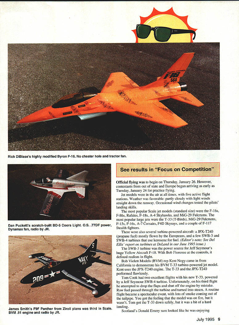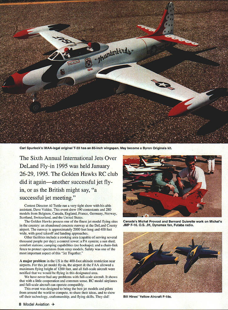 NO OCR TEXT Carl Spurlocks IMAA-Iegal original T-33 has 85-inch wingspan May become Byron Originals kit Sixth Annual International Jets Over DeLand Fly-in 1995 held January 26-29 1995 Golden Hawks RC club did againanother successful jet flyin British might say successful jet meeting Contest Director Al Tuttle ran very tight show able assistant Dave Valdez event drew 190 contestants 280 models Belgium Canada England France Germany Norway Scotland Switzerland United States Golden Hawks possess finest jet model flying sites country abandoned concrete runway DeLand County airport runway approximately 2000 feet long 400 feet wide good takeoff landing approaches Other facilities include cooking area capable serving several thousand people per day control tower PA system sun shed comfort stations camping capabilities no hookups chain-link fence protect spectators stray models Safety important aspect Jet Together major problem US 400-foot altitude restriction near airports jet model fly-in airport & FAA allowed maximum flying height 1200 feet full-scale aircraft notified would flying designated area have never problems full-scale aircraft shows little cooperation common sense RC model airplanes full-scale aircraft can operate compatibly event designed bring best jet models pilots around world compete share ideas show off technology craftsmanship flying skills did 8 Model Aviation 4Canadas Michal Provost Bernard Gurette work Michals JMP F-16 0S 91 Dynamax fan Futaba radio Bill Hines Yellow Aircraft F-18s See results Focus Competition Official flying begin Thursday January 26 However contestants out state Europe began arriving early Tuesday January 24 practice flying Jet models air times five active flight stations Weather favorable partly cloudy light winds straight down runway Occasional wind changes tested pilots landing skills popular Scale jet models standard size F-16s F-86s Rafales F-18s A-4 Skyhawks MiG-29 Fulcrums popular large jets T-33 T-Birds MiG-29 Fulcrums F-15s F-16s A-7 Corsairs F4D Skyrays couple F-117 Stealth fighters also several turbine-powered aircraft JPX-T240 propane fuel mostly flown Europeans few SWB-3 SWB-4 turbines use kerosene fuel Editors note See Del Ellis report turbines DeLand June 1995 issue SWB-3 turbine power source Jeff Seymours huge Yellow Aircraft F-18 Bob Fiorenze controls defined realism flight Bob Violett Models BVM rep Kent Nogy came California demonstrate BVM T-33 turbine-powered jet model Kent uses JPX-T240 engine T-33 JPX-T240 performed flawlessly Tom Cook two excellent flights new T-33 powered Jeff Seymour SWB-4 turbine Unfortunately third flight attempted drop flaps shut off engine mistake Raw fuel passed through turbine turned steam routine flight became spectacular event lots smoke coming out tailpipe got feeling model fire wasnt Tom got T-33 down safely bit hard landing Scotlands Donald Emery sure looked like enjoying July1995 9 Rich DiBiases highly modified Byron F-16 No cheater hole tractor fan Dan Pucketts scratch-built BD-5 Coors Light 0S 77DF power Dynamax fan radio JR James Smiths F9F Panther Ziroli plans third Scale BVM 91 engine radio JR himself flying Fiate G-9 1 powered JPX-T240 turbine model finished Italian acrobatic livery flew great After watching listening wonderful turbine jet models fly question two jet models competinga ducted fan turbine-powered modelhow would score realism flight some really spectacular ducted-fan models jet meet particular new BVM twin-engine F-4 Phantom really no building modelits just assembled like plastic model kit hard points attachment points wing mounting landing gear installation fan mounting molded place Inlet ducts thrust tubes prefabricated ready installation hardest part completing model finish choose apply Phantom won Technical Achievement Award 1995 Gator Shoot-Out Eric Meys highly detailed A-6 Intruder powered single OS 9lDF engine Dynamax fan used Futaba RC system A-6 flies well singe engine however think would awesome two OS 46 ducted fans just thought Eric A-6 manufactured Meys High Tech Hobby Inc Bob Fiorenze flew Yellow Aircrafts new smaller-size single- engine F-18 extremely stable model powered 05 91 Dynamax fan Bob uses Futaba nine-channel PCM radio F18 could excellent entrylevel jet model advanced sport flier Bob also flew showstopping award-winning Yellow Aircraft F- 1 17A Stealth fighter Bob flies model really holds spectators attention Marshal Emmendorfer came down Michigan stunning JMP T-33 very large model flies 05 10 Model Aviation Meys highly detailed A-6 Intruder Hes proprietor Meys High Tech Hobby manufactures model Jeff Seymours SWB-3 turbine large Yellow Aircraft F-18A First place Scale went Clark Hopkins Miami Florida Bob Violetts new twin-engine F-4 Phantom ready touch down T-33 Bob Violett Models kit Mike Burkes very large F-4 Phantom TIP Australian kit Twin Viojett fans 91 using Dynamax fan T-33 built composite materials fiberglass carbon fiber KevlarTM also highly prefabricated kit can use ducted-fan model turbine power has top speed about 160 mphnot bad big model airplane Ralph DiBiase beautiful modified Byron F- 16 Ralph made some major changes accommodate Dynamax fan closed up unsightly cheater hole added sequential gear doors believe gained additional 25-30 mph changes Peter Rutimon member Swiss team beautiful Rafale-A model powered OS 91 engine using Ramtec fan Rafale built Avonds kit James Smith brought three beautiful models Jim Fox BAE Hawk powered OS 91 Ramtec fan JR radio stunning F-106 Delta Dart Sickles kit powered OS 91 Ramtec fan JR RC system Spring Air retracts beautiful F9F Panther Ziroli plans Panther powered BVM-9 1 engine uses JR radio above models finished acrylic enamel clear coat Reco Compos new jet model manufacturer Miami area brought new F- 18 sport jet Its little smaller Yellow Aircrafts Parkinsons F-18 sport jets Compos fuselage composite material honeycomb structure Reco claims can assemble model ready fly fourteen hoursWe arc beginning see mor
