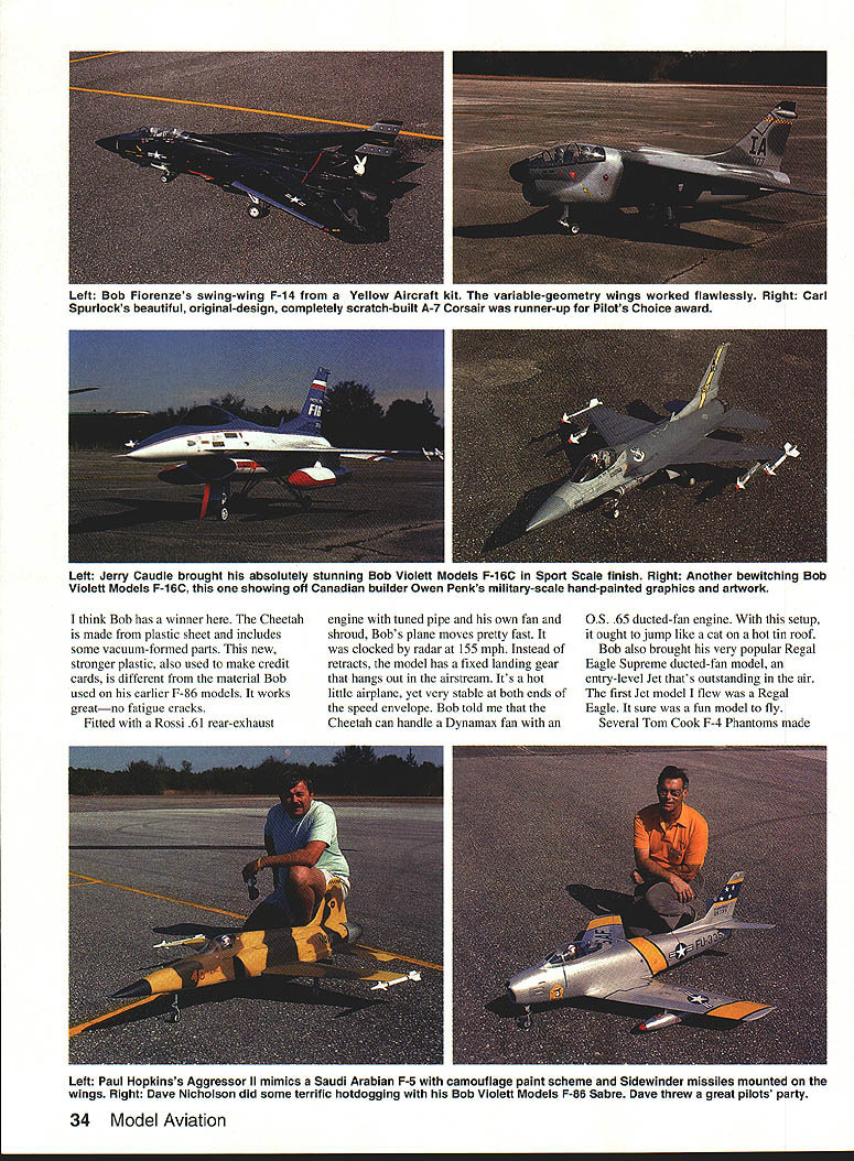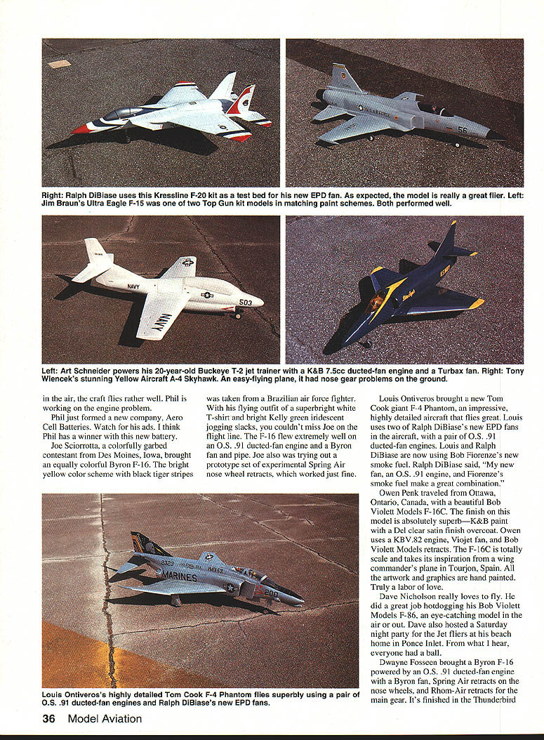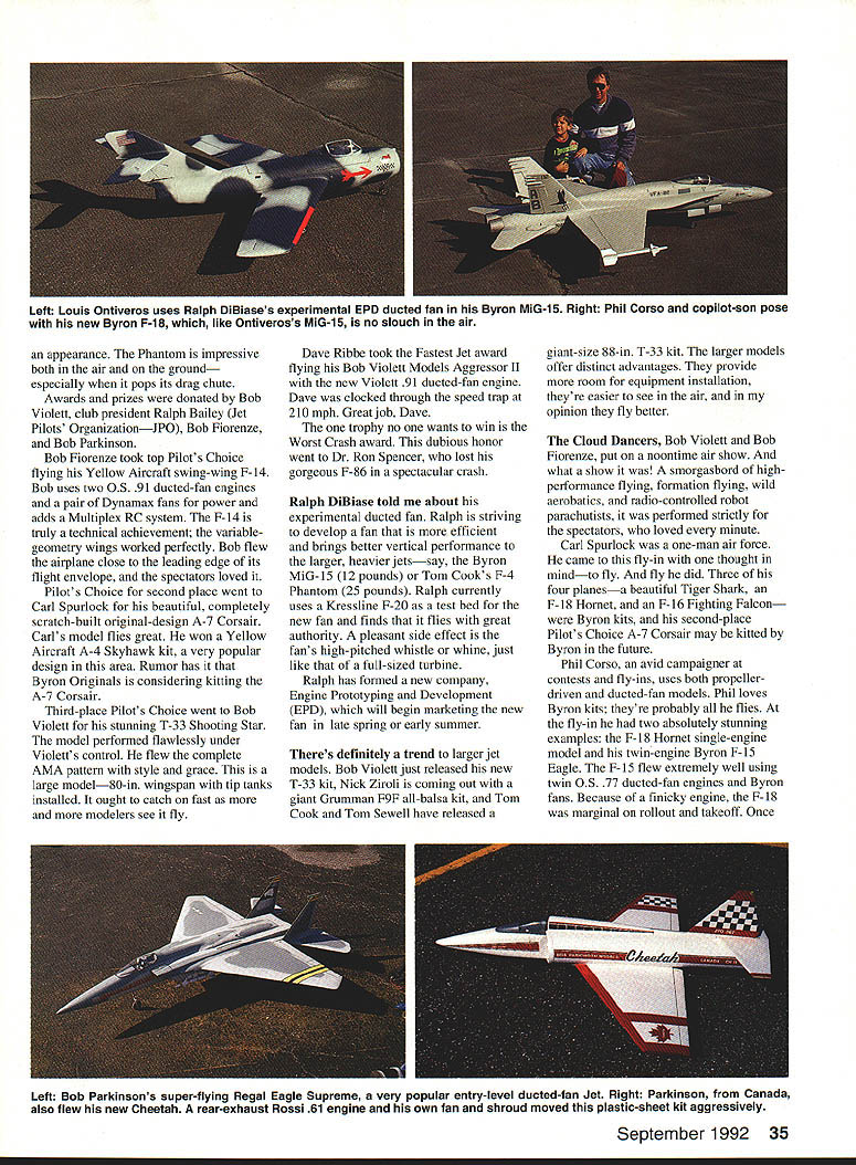 WITH 55 registered pilots 85 ducted-fan models unlimited flying Deland Golden Hawks RC Clubs second annual RC Ducted-Fan Model Fly-In held January 25-26 1992 Deland Florida bigger successful last years premier running Contest Director ramrod Ken Basso lots help club members putting event together first-class operation best flying sites anywhere Golden Hawks flying field has 2000 500-foot paved runway bordered close-cut grass club provided professional announcers describe Jet models pilots maneuvers Food soft drink souvenir concessions catered spectators plenty parking space campsites available came motor homes Ducted-fan Jet modeling has come age thanks American ingenuity pioneering spirit such men Bob Violett Byron Godberson Bob Kress Tom Cook George Miller Larry Wolf Bob Fiorenze Bob Parkinson Dr Tse Nick Ziroli name few now have ducted fan engines dont self-destruct large variety top-quality kits choose reliable RC systems meet sophisticated needs ducted-fan models As television commercial once put Weve come long way baby enough editorializing Lets get back fly-in As usual Bob Violett Models planes outnumbered others Bob has strong followingat least part think because strong product line Aggressor Ils Vipers Super Sharks F-86s F-l6Cs Bobs newly released T-33 Shooting Star hand its surprising least two three Violett galaxy air given moment Byron Originals well represented selection F-16s MiG-15s F-86s F-18 Hornets T-20s good variety Yellow Aircraft designs hand swing-wing F-14 twin-engine model flown Bob Fiorenze proved popular several F-4 Phantoms F-i 6A s F- 18 Hornets A-4 Skyhawk Bob Parkinson came way Canada show off new Cheetah kit September 1992 33 Big picture Joe Sciorrotta painted Byron F-16 bright yellow black tiger stripes Above Bob Violetts new highly prefabricated T-33 Shooting Star kit Model flies great Left Jerry Caudle brought absolutely stunning Bob Violett Models F-16C Sport Scale finish Right Another bewitching Bob Violett Models F-16C showing off Canadian builder Owen Penks military-scale hand-painted graphics artwork think Bob has winner Cheetah made plastic sheet includes some vacuum-formed parts new stronger plastic also used make credit cards different material Bob used earlier F-86 models works greatno fatigue cracks Fitted Rossi 61 rear-exhaust engine tuned pipe own fan shroud Bobs plane moves pretty fast clocked radar 155 mph Instead retracts model has fixed landing gear hangs out airstream Its hot little airplane yet very stable both ends speed envelope Bob told Cheetah can handle Dynamax fan OS 65 ducted-fan engine setup ought jump like cat hot tin roof Bob also brought very popular Regal Eagle Supreme ducted-fan model entry-level Jet thats outstanding air first Jet model flew Regal Eagle sure fun model fly Several Tom Cook F-4 Phantoms made 34 Model Aviation Left Bob Fiorenzes swing-wing F-14 Yellow Aircraft kit variable-geometry wings worked flawlessly Right Carl Spurlocks beautiful original-design completely scratch-built A-7 Corsair runner-up Pilots Choice award Left Paul Hopkinss Aggressor II mimics Saudi Arabian F-5 camouflage paint scheme Sidewinder missiles mounted wings Right Dave Nicholson did some terrific hotdogging Bob Violett Models F-86 Sabre Dave threw great pilots party appearance Phantom impressive both air groundespecially pops its drag chute Awards prizes donated Bob Violett club president Ralph Bailey Jet Pilots OrganizationIPO Bob Fiorenze Bob Parkinson Bob Fiorenze took top Pilots Choice flying Yellow Aircraft swing-wing F-14 Bob uses two OS 91 ducted-fan engines pair Dynamax fans power adds Multiplex RC system F-14 truly technical achievement variablegeometry wings worked perfectly Bob flew airplane close leading edge its flight envelope spectators loved Pilots Choice second place went Carl Spurlock beautiful completely scratch-built original-design A-7 Corsair Carls model flies great won Yellow Aircraft A-4 Skyhawk kit very popular design area Rumor has Byron Originals considering kitting A-7 Corsair Third-place Pilots Choice went Bob Violett stunning T-33 Shooting Star model perfonned flawlessly under Violetts control flew complete AMA pattern style grace large modelSO-in wingspan tip tanks installed ought catch fast more modelers see fly Dave Ribbe took Fastest Jet award flying Bob Violett Models Aggressor II new Violett 91 ducted-fan engine Dave clocked through speed trap 210 mph Great job Dave trophy no wants win Worst Crash award dubious honor went Dr Ron Spencer lost gorgeous F-86 spectacular crash Ralph DiBiase told about experimental ducted fan Ralph striving develop fan efficient brings better vertical performance larger heavier jetssay Byron MiG-iS 12 pounds Tom Cooks F-4 Phantom 25 pounds Ralph currently uses Kressline F-20 test bed new fan finds flies great authority pleasant side effect fans high-pitched whistle whine just like full-sized turbine Ralph has formed new company Engine Prototyping Development EPD will begin marketing new fan late spring early summer Theres definitely trend larger jet models Bob Violett just released new T-33 kit Nick Ziroli coming out giant Grumman F9F all-balsa kit Tom Cook Tom Sewell have released giant-size 88-in T-33 kit larger models offer distinct advantages provide room equipment installation theyre easier see air opinion fly better Cloud Dancers Bob Violett Bob Fiorenze put noontime air show what show smorgasbord highperformance flying formation flying wild aerobatics radio-controlled robot parachutists performed strictly spectators loved minute Carl Spurlock one-man air force came fly-in thought mindto fly fly did Three four planesa beautiful Tiger Shark F- 18 Hornet F- 16 Fighting Falconwere Byron kits second-place Pilots Choice A-7 Corsair may kitted Byron future Phil Corso avid campaigner contests fly-ins uses both propellerdriven ducted-fan models Phil loves Byron kits theyre probably flies fly-in two absolutely stunning examples F- 18 Hornet single-engine model twin-engine Byro