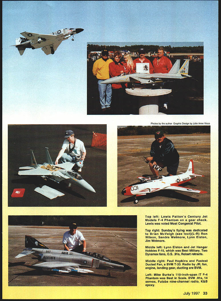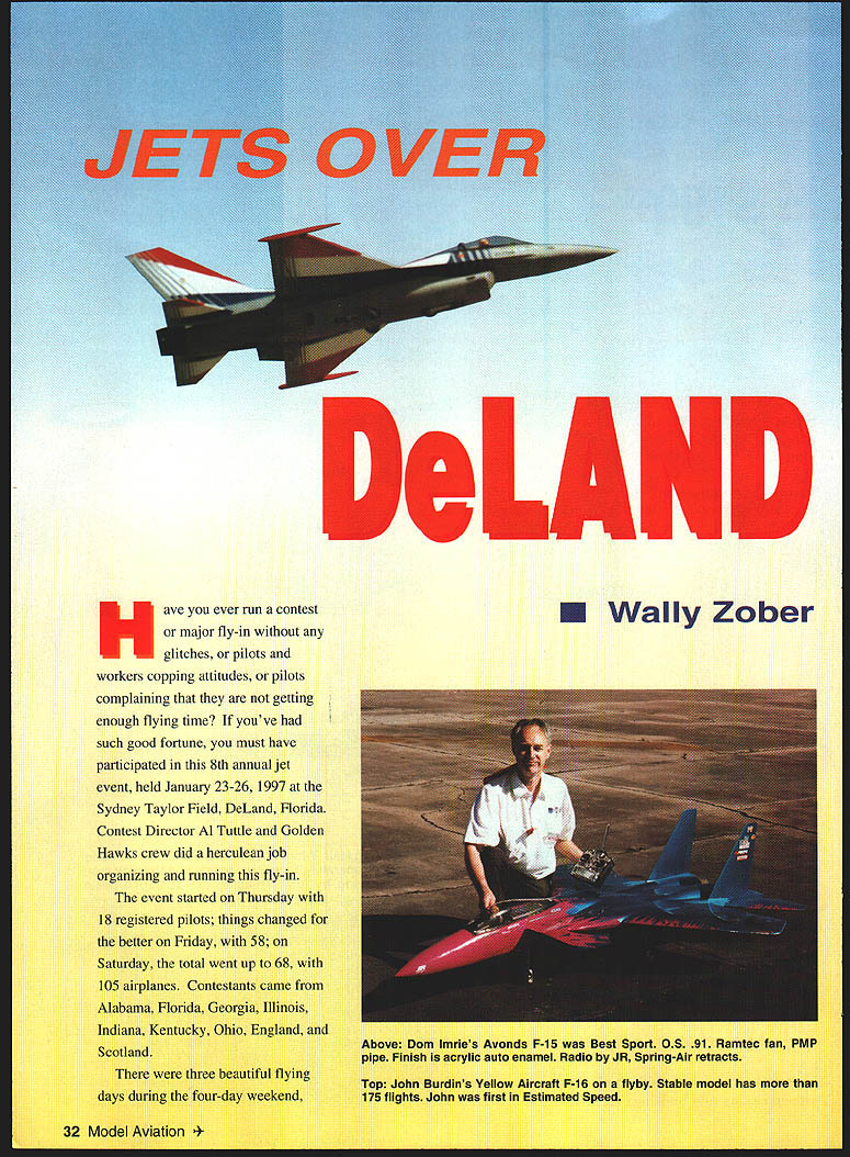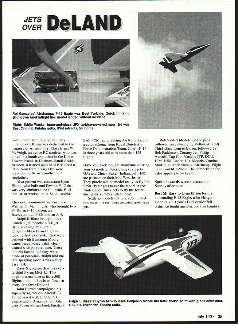 Have ever run contest major fly-in glitches pilots workers copping attitudes pilots complaining getting enough flying time youve such good fortune must have participated 8th annual jet event held January 23-26 1997 Sydney Taylor Field DeLand Florida Contest Director Al Tuttle Golden Hawks crew did herculean job organizing running fly-in event started Thursday 18 registered pilots things changed better Friday 58 Saturday total went up 68 105 airplanes Contestants came Alabama Florida Georgia Illinois Indiana Kentucky Ohio England Scotland three beautiful flying days during four-day weekend 32 Model Aviation llyZober Above Dam lmries Avonds F-15 Best Sport OS 91 Ramtec fan PMP pipe Finish acrylic auto enamel Radio JR Spring-Air retracts Top John Burdins Yellow Aircraft F-16 flyby Stable model has 175 flights John first Estimated Speed Top left Lewis Pattons Century Jet Models F-4 Phantom gear check Lewis voted Most Congenial Pilot Top right Sundays flying dedicated Brian McVeigh see textL-R Ron Wilson Sandra Wetmore Lynn Elston Jim Wetmore Middle left Lynn Elston Jet Hangar Hobbies F-15 Best Military Two Dynamax fans 0S 91s Robart retracts Middle right Paul Hopkins Fastest Ducted Fan BVM T-33 Radio JR fan engine landing gear ducting BVM Left Mike Burkes 110-Inch-span IT F-4 Phantom Best Scale BVM 915 14 servos Futaba nine-channel radio K&B epoxy July1997 33 JETS DLAND OVER Right Eddie Weeks foam-and-glass JPX turbine-powered sport jet Best Original Futaba radio BVM retracts 50 flights intermittent rain Saturday Sundays flying dedicated memory Airman First Class Brian W McVeigh active RC modeler killed bomb explosion Kobar Towers Hotel Dhahran Saudi Arabia noon framed picture Brian letter Capt Craig Dye presented Brians mother stepfather Also present contestant Lynn Elston built flew F-15 very similar full-scale F-15 Brian worked Saudi Arabia years one-man air force William F Manning Jr brought two F-lSs F-16 Falcon Interceptor F-86 A-4 Ralph DiBiase brought three beautiful jet models jet fly stunning MiG-29 gorgeous MiG-15 greatlooking A-4 Skyhawk painted Benjamin Moore water-based house paint clearcoated polyurethane models looked like made porcelain Ralph told spraying models very easy task Dave Nicholson flew everfaithful Byron MiG-IS airplane must have least 500 flights itit has flown Jets Over DeLand John Burdin campaigned super-flying Yellow Aircraft F16 powered OS 91 engine Dynamax fan John uses Power Master Fuel Futaba 9 ZAP PCM radio Spring Air Retracts color scheme Royal Dutch Air Force Demonstration Team Johns F-16 three years old 175 flights Have ever thought about time-sharing jet model Peter Laing Lafayette GA Chuck Baker Indianapolis IN partners Mid-West Jester purchased model ready-to-fly $250 Peter gets use model winter Chuck gets fly Jester during summer Neat idea Scale jet models 84 total dominated meet rest assorted sport-type jets Bob Violett Models led pack followed very closely Yellow Aircraft Third place went Byron followed Bob Parkinson Century Jet Philip Avonds Top Gun Models ITP DCU JPM JHM Usher JD Models Combat Models Sterner Models Airchamp Flight Tech Mid-West competition sales appears heavy Special awards presented Sunday afternoon Best Military Lynn Elston outstanding F-15 Eagle Jet Hangar Hobbies kit Lynns F-15 carries full ordnance eight missiles two bombs July1997 35 Rel Gonzales Airchamps F-iS Eagle Best Turbine Quick thinking shut down brief inflight fire model landed incident Ralph DiBiases Byron MiG-iS uses Benjamin Moore flat latex house paint gloss clear coat OS 91 Byron fan Futaba radio Depend hold its own V Easy use insert firm ground position model youre ready start V Built 3/4 steel tubing 3/8 steel down rod V Arc-welded down rod angled provide secure grip V Protective padding uprights protect model V White powder coat finish prevent corrosion Stock #811 AE ROMAT model highly detailed full cockpit interior Power two Dynamax fans two 05 91s using Jet Model Products tuned pipes Glennis wheels brakes Robart retracts scale operating landing gear doors Radio JR-PCM-lO using 18 servos 2800mAh flight pack Finish Testors Model Master plastic model paint clearcoated two-part K&B flat paint fuelproofing Best Sport Model went Don Jmrie Glasgow Scotland Philip Avonds F-iS Eagle Don spends winter vacations central Florida attends Jets Over DeLand year Power 0S 91 Ramtec fan PMP tuned pipe Spring-Air retracts JR PCM-l0 radio model carries seven servos uses three flying two servos differential elevator acts ailerons elevator servo throttle control other servos used inflight mixture control retracts brakes steerable nose wheel model finished two-part auto acrylic enamel Designer Philip Avonds claims model used entry level jet model trainerit rock-solid air Best Original Design went Eddie Weeks three unique jets molded StyrofoamTMandglass fuselages two-ounce glass cloth outside one-ounce glass cloth insidestrong very light Two models JPX-260 turbines other model twin 0S 91s Dynamax fans models weighed 15-17 pounds dry flown Futaba radios using nine servos Spring Air retracts BVM wheels brakes models have average 50 flights off grass Best Scale First Place Mike Burkes ITP F-4E Phantom Australian kit big 110 inches long model powered two BVM 91 ducted-fan engines glass-and-foam model finished K&B epoxy uses 14 servos flown Futaba ninechannel radio Best Scale Second Place Lewis Pattons CJM F-4one authentic reproductions F-4 Phantom have seen could Top Gun contender beautifully crafted greatflying model lost high-speed low pass catastrophic wing failure possibly hard landing Scale Masters Qualifier contest two weeks earlier might have caused unnoticed hairline crack main wing spar Lewis able continue flying meet sister ship lost flew no problems Best Scale Third Place Paul Tirones stunning Byron T-20 Tiger Shark Paul also won Most Spectacular Flight award Paul taking off high speed rotated about 30 climbout angle altitude about 100 feet F-20 suddenly dove straight 