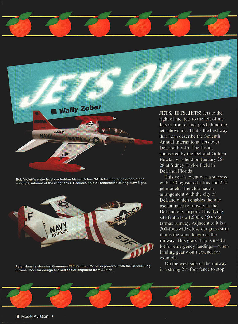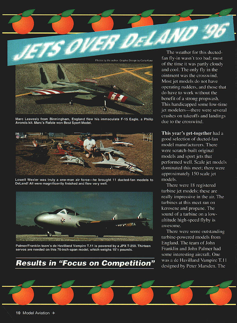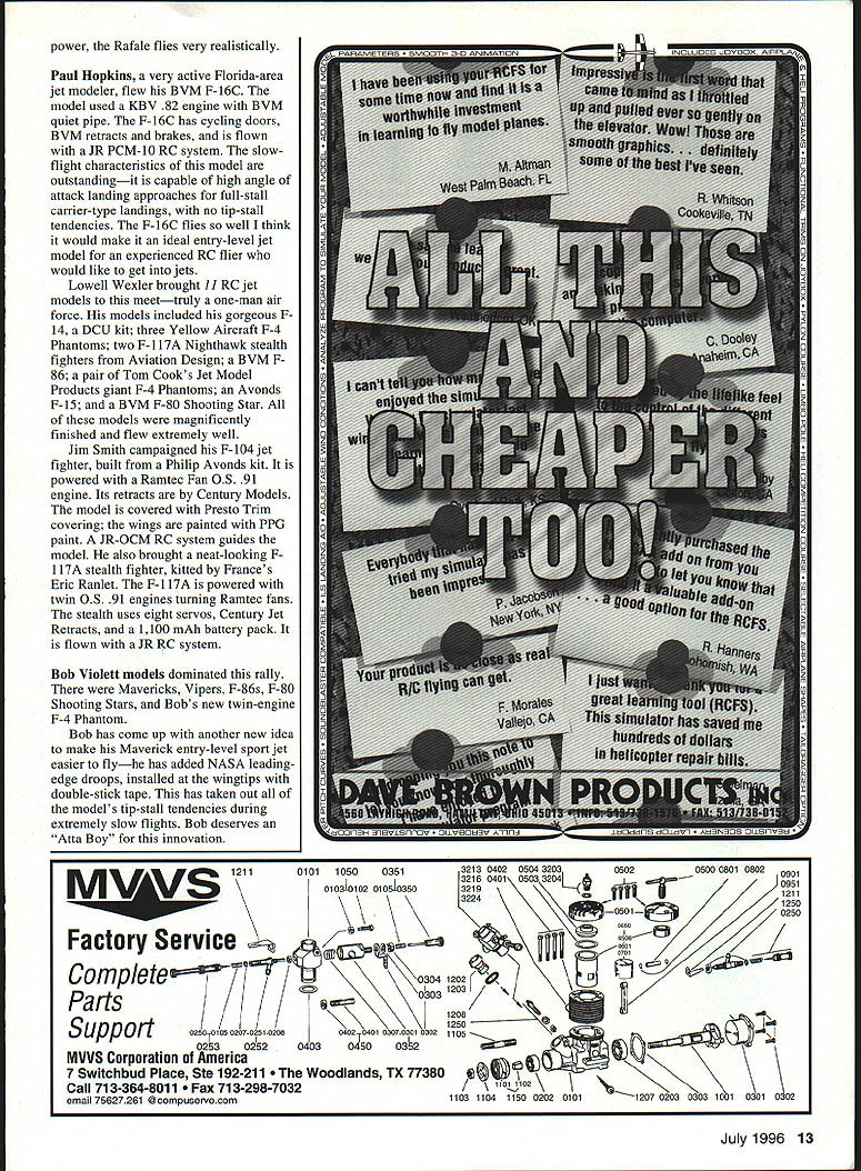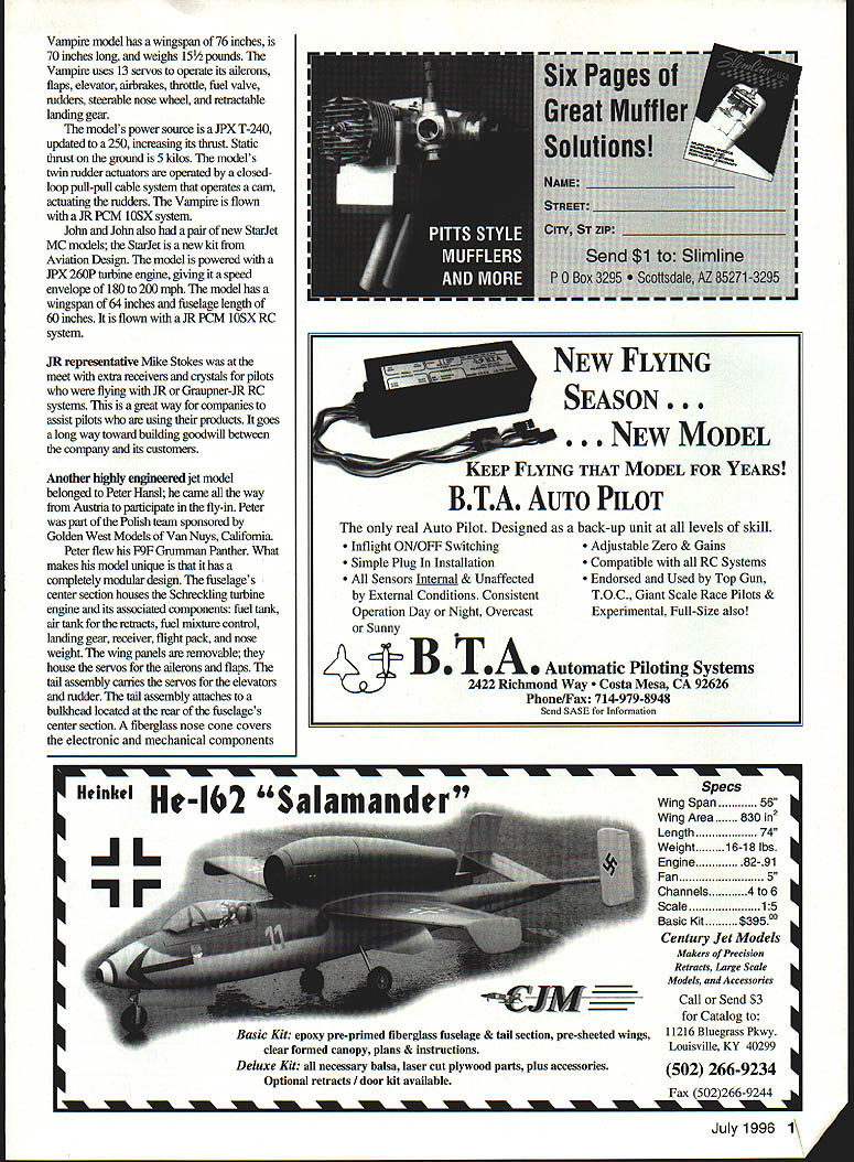 NO OCR TEXT NO OCR TEXT NO OCR TEXT Vampire model has wingspan 76 inches 70 inches long weighs 15 pounds Vampire uses 13 servos operate its ailerons flaps elevator airbrakes throttle fuel valve rudders steerable nose wheel retractable landing gear models power souxce JPX T-240 updated 250 increasing its thrust Static thrust ground 5 kilos models twin rudder actuators operated closedloop pull-pull cable system operates cam actuating rudders Vampire flown aJRPCM 1OSX system John John also pair new StarJet MC models StarJet new kit Aviation Design model powered iPX 260P flntine engine giving speed envelope 180 200 mph model has wingspan 64 inches fuselage length 60 inches flown JR PCM lOSX RC system JR representative Mike Stokes meet extra receivers crystals pilots flying JR Graupner-IR RC systems great way companies assist pilots using products goes long way toward building goodwill between company its customers Another highly engineered jet model belonged Peter Hansl came way Austria participate fly-in Peter part Polish team sponsored Golden West Models Van Nuys California Peter flew F9F Grumman Panther makes model unique has completely modular design fuselages center section houses Schreckling tuxtine engine its associated components fuel tank air tank retracts fuel mixture control landing gear receiver flight pack nose weight wing panels removable house servos ailerons flaps tail assembly canies servos elevators rudder tail assembly attaches bulkhead located rear fuselages center section fiberglass nose cone covers electronic mechanical components NEW FLYING SEASON. .NEW MODEL ixEEP FLYING THAT MODEL FOR YEARS BTA AUTO PILOT real Auto Pilot Designed back-up unit levels skill Inflight ON/OFF Switching Simple Plug Installation Sensors Internal & Unaffected External Conditions Consistent Operation Day Night Overcast Sunny matic Piloting Systems Z%Q 1TA 2422 Richmond Way Costa Mesa CA 92626 Phone/Fax 714-979-8948 Send SASE Information Adjustable Zero & Gains Compatible RC Systems Endorsed Used Top Gun TOC Giant Scale Race Pilots & Experimental Full-Size also Basic Kit epoxy pre-primed fiberglass fuselage & tail section pre-sheeted wings clear formed canopy plans & instructions Deluxe Kit necessary balsa laser cut plywood parts plus accessories Optional retracts door kit available U U U Specs Wing Span56 h 2 Wing Area830 Length74 Weight16-18 lbs Engine82-91 Fan5 Channels4to6 Scale15 c Kit Centuiy Jet Models Makers Precision Retracts large Scale Models Accessories Call Send $3 Catalog 11216 Bluegrass Pkwy Louisville KY 40299 502 266-9234 Fax 502266-9244 u u u m U U U U U U 1996 1\ r U U U U U U U U U Heinhel He-I2 Salamander U U U U uA located up front design innovations made easier ship large model Austria US years Jets over DeLand event new ideas new designsand still come An original-design ducted-fan model caught attention pilots model builders spectators Peter Brenners YF-24 ducted fan lifting body Approximately 50% models lifting force comes fuselagethe balance lift comes its wings stabilizer YF-24 powered three Tom Cook Dynamax fans three OS 91 ducted-fan engines model has fiberglass fuselage Its foam wing cores sheeted balsa covered lightweight glass cloth resin stabilizer elevator finished same way has wingspan 60 1/2 inches length 93 inches finished K&B Super Poxy YF-24 has operating landing-gear doors Jet Model Products retracts flown Futaba Super-7 PCM RC system Another talented model builder designer entrepreneur attended meet Tadeusz Krzanowski Hes partner Bob Wilcox Golden West Models carries Schreckling turbine engines Tad brought gorgeous Golden West-designed Albatross LZ59 soon Golden West Models kit Albatross designed ducted fan power new Schreckling kerosene-powered turbine engine LZ59 Albatross finished automotive lacquer flies extremely well JR PCM RC system talking Tad learned partner Bob Wilcox own WKR Productionsthey have produced models special effects several famous movies including Clifjhanger Terminal Velocity Executive Decision Steven Segals Under Siege II Bob Wilcox campaigned gorgeous Rafale Aeroloft kit powered Schreckling FD 3/67 turbine engine Rafale flown JR-PCM RC system model finished clearcoated automotive lacquer turbine RIC SERVICE AT ITS BEST Sales Service Anything Radio Controlled Repairs Updates Custom Modifications Frequency Changes 6 Meter conversions ACE Airtronics Aristo-craft Cirrus EK Futaba Hitec Heathkit Hobby Shack JR Kraft KGL KSE Kline KoPropo Pro-Line RCD Tower Hobbies World Engines & others Calibrated Equipment Quick Turnaround Walk-in daily service 800 am-500 pm Send Legal sized SAEfor 1996 Catalog containing lists R/C maintenance hints Discover MCard VISA COD UPS USMAIL FEDEX etc 12 Model Aviation 7420 Seven Mile Rd Northville Michigan 48167 Ph 810-486-4800 Fax 810-486-1603 power Rafale flies very realistically Paul Hopkins very active Florida-area jet modeler flew BVM F-16C model used KBV 82 engine BVM quiet pipe F-16C has cycling doors BVM retracts brakes flown JR PCM-l0 RC system slowflight characteristics model outstandingit capable high angle attack landing approaches full-stall carrier-type landings no tip-stall tendencies F-16C flies well think would make ideal entry-level jet model experienced RC flier would like get jets Lowell Wexler brought 11 RC jet models meettruly one-man air force models included gorgeous F14 DCU kit three Yellow Aircraft F-4 Phantoms two F-i 17A Nighthawk stealth fighters Aviation Design BVM F86 pair Tom Cooks Jet Model Products giant F-4 Phantoms Avonds F-15 BVM F-80 Shooting Star models magnificently finished flew extremely well Jim Smith campaigned F- 104 jet fighter built Philip Avonds kit powered Ramtec Fan OS 91 engine Its retracts Century Models model covered Presto Trim covering wings painted PPG paint JR-OCM RC system guides model also brought neat-looking F 1 17A stealth fighter kitted Frances Eric Ranlet F-li 7A powered twin OS 91 engines turning Ramtec fans stealth uses eight servos Century 
