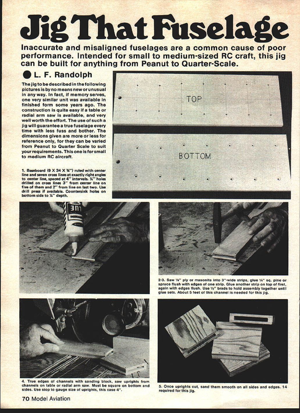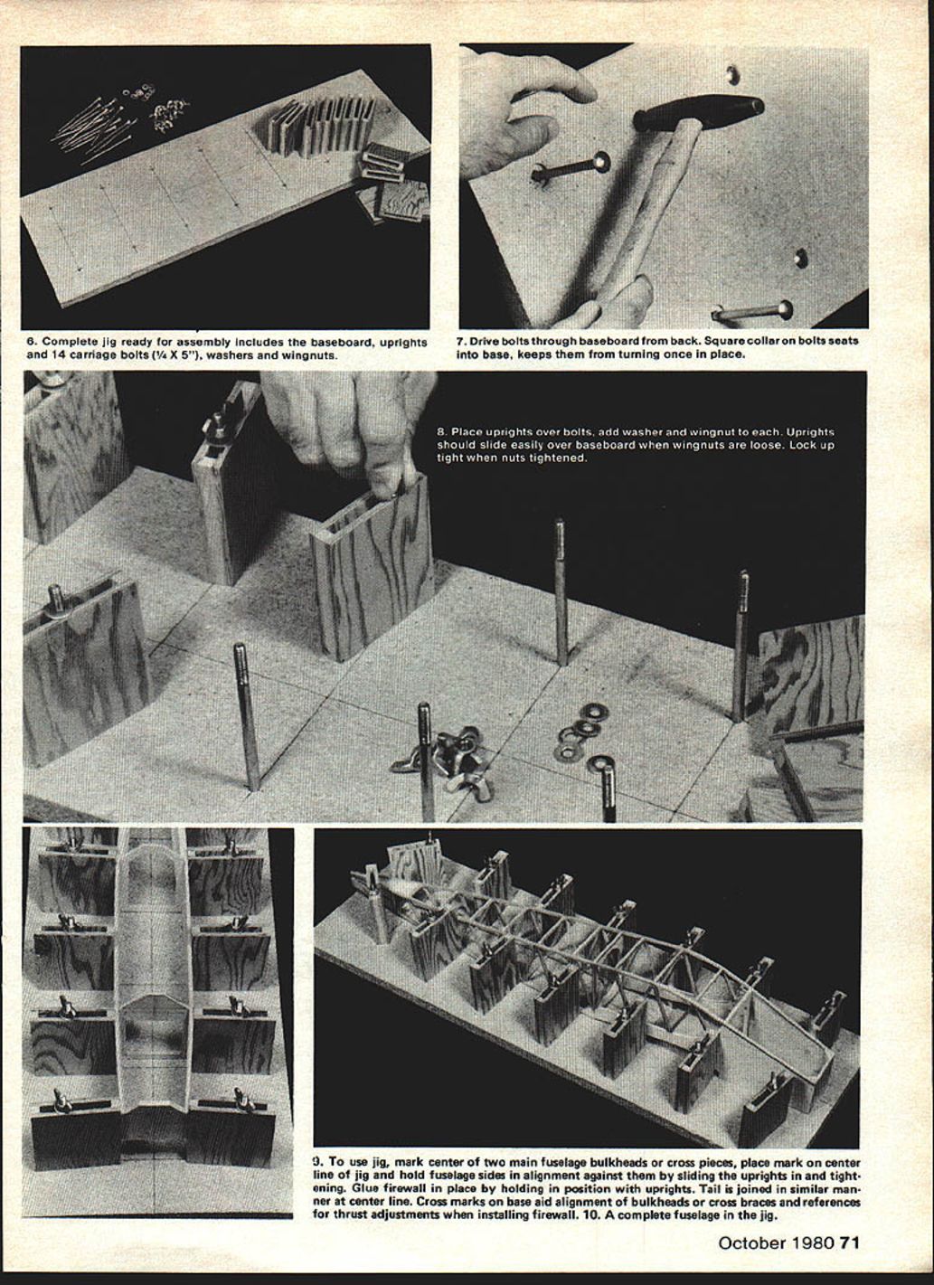 Jit Euse1ae Inaccurate misaligned fuselages common cause poor performance Intended small medium-sized RC craft jig can built anything Peanut Quarter-Scale L F Randolph jig described following pictures no means new unusual way fact memory serves very similar unit available finished form some years ago construction quite easy table radial arm saw available very well worth effort use such jig will guarantee true fuselage time less fuss bother dimensions given less reference can varied Peanut Quarter Scale suit yourrequirementsThisone isforsmall medium RC aircraft 1 Baseboard 9 X 34 X % ruled center line seven cross lines exactly right angles center line spaced 4 intervals K holes drilled cross lines 3 center line five 2 line last two Use drill press available Countersink holes bottom side K depth 2-3 Saw 1/s~ ply masonite 3-wide strips glue /4 sq pine spruce flush edges strip Glue another strip top first again edges flush Use /2 brads hold assembly together until glue sets About 5 feet channel needed jig 4 True edges channels sanding block saw uprights channels table radial arm saw Must square bottom sides Use stop gauge size uprights case 4 70 Model Aviation 5 Once uprights cut sana inem smooth sides eages 14 required jig 9 To use jig mark center two main fuselage bulkheads cross pieces place mark center line jig hold fuselage sides alignment against sliding uprights tight ening Glue firewall place holding position uprights Tail joined similar man ner center line Cross marks base aid alignment bulkheads cross braces references thrust adjustments installing firewall 10 complete fuselage jig October 198071 6 Complete jig ready assembly includes baseboard uprights 7 Drive boltsthrough baseboard back Square collaron bolts seats 14 carriage bolts /4 X 5 washers wingnuts base keeps turning once place