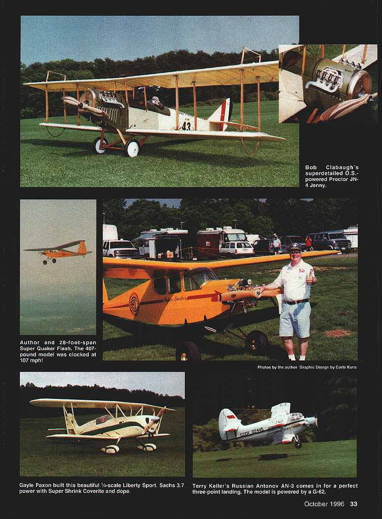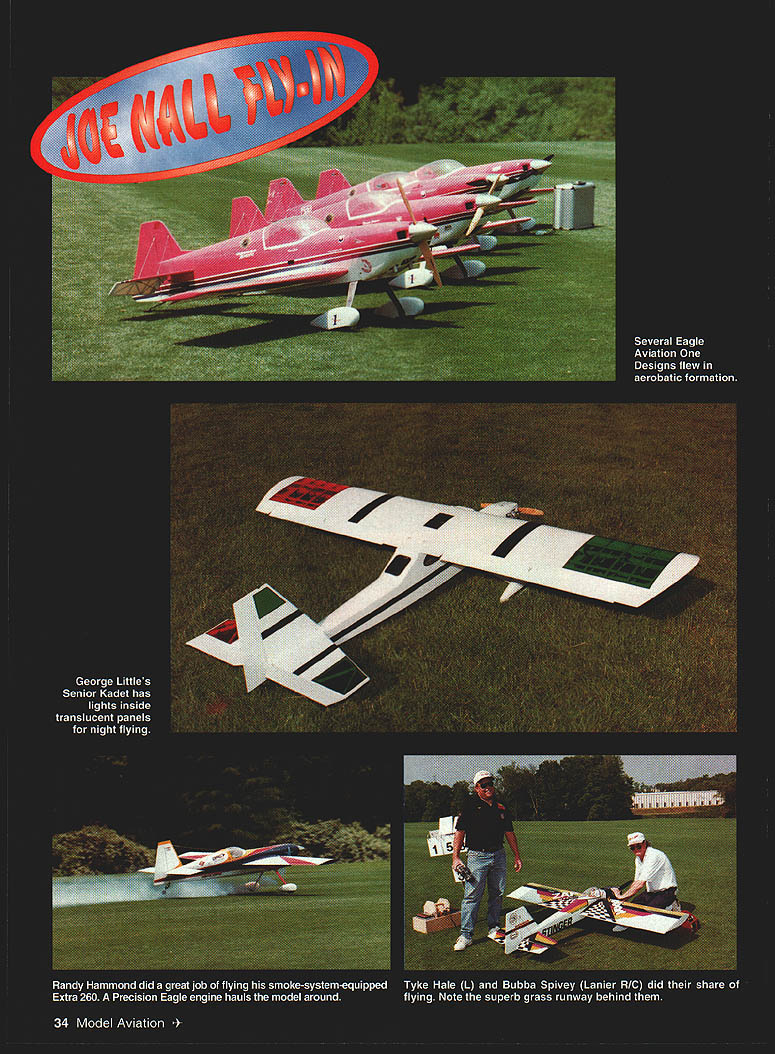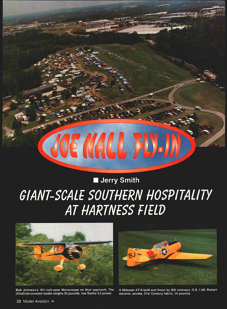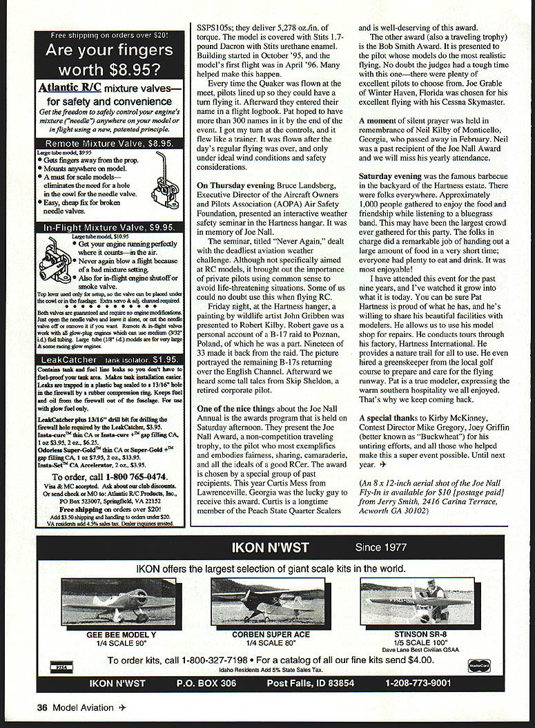 NO OCR TEXT NO OCR TEXT NO OCR TEXT THE JOE NALL Giant Scale Fly-In unquestionably premier event Southeast Giant Scale airplanes fourday annual event held May 16-19 1996 Hartness Field private 400-acre estate Greenville South Carolina years fly-in sponsored International Miniature Aircraft Association IMAA Chapter 94 hosted Pat Hartness generously allows happen front yard After 14 years event well-organized registration flightline controlled computer database high-tech system makes happen easily possible arrived Wednesday 15th could have sworn event already started According Event Coordinator Kirby McKinney some fliers arrived early previous Sunday stake-out good place flightline word fully describes event Overwhelming An annual event such soon ingrained culture modeling world much like Nats Toledo WRAM show other long-running modeling events have become popular make Joe Nall Fly-In part vacation plans camp out whole week knowing will see old friends meet new ones learn new techniques Yes its big social event can get few flights better wasnt always called Joe Nall Fly-In Back 1982 simply Greenville name changed Joe Nall Fly-In 1990 Joe Nall event named honor him Joe Nall true believer general aviation participated fullyas pilot flight instructor ground-school operator ultimately high-ranking member National Transportation Safety Board spent years attending Greenville Fly-In always doing announcing Joe died aircraft accident near Caracas Venezuela 1989 Joe close friend Pat Hartness Pat named event honor Joes memory Joes close friends Ken Pappard survived crash attends event year present Joe Nall Trophy weather event extremely hot winds light variable allowing flights Although IMAA portion flying took place 9 am 5 pm models flown dawn until after sunset After dark night fliers brought out models lighting up skies weird light patterns smart move partit enabled get flights after-hours flying brought out some really neat airplanes noted Two-Meter Hawk Sailplane highly modified Sidney Clement Bridgeton New Jersey Its powered Webra 32 glass-tuned pipe Running 25% nitromethane swings 8 x 9 prop airframe modified carbon fiber has servo elevator wing set l0 Its top speed 127 mph Sid hopes reach 140 mph someday star event unusual Giant Scale airplane 67inch 1936 Free Flight design Super Quaker Flash scaledup five times Pat Hartness Its flown three channels rudder elevator throttle 28-foot wingspan its slightly smaller J-3 Cub model powered Christine 1200cc 43 hp engine half VW engine turning 62 x 22 propeller weighs 407 pounds wet has wing loading 4 lb/sq ft. servos rudder elevator Seico October 1996 35 Joe Grables winning Cessna Skymaster 40-pound model completely built-up glassed epoxy resin Joe Grable won Bob Smith Trophy awarded pilot flew realistically Joe flew Cessna Skymaster 1995 Joe Nail Trophy winner RB Kincaid center presents award 1996 winner Curtis Mees 1 Ken Peppard R looks a-Large tribe modal $995 Gets fingers away pr Mounts anywhere model must scale models eliminates need hole cowl needle valve Easy dicap fix broken needle valves etasbeanodel $1095 Gd engine naming perfedly countsrn air Never again blow flight because bad mixture setting O Alao in-flight engine shutoff smoke valve Top levor used fir satup valve can placed andor cowl fuadage Extra sanyo & adj drannel required Both valvec guaranteed require no cogine modifications Just opas needle valve leave alone cot needle valve off ranove want Runote & rn-flight valvus work glow-pleg anaganra can use medium 3/32 id flsrlaibin& Large tube 1/5 id models viny large &somerausrggtowaagaasec Contains tank fuel line leaks dont have fisel-proof tank area Makes tank installation easier Leaks trapped ins plantic bag sealed 13/16 hole die firewall tubber compression ring Keeps fuel oil firma firewall out fuselage rue glow fuel LaakCatctaer plus 13/16 drill bit drilling lirewall hole required LeakCatcher $395 lasts-cure5 thin CA lusts-cure 5 gap filling CA 107 $395 2 ox $623 Odusleas Super-Geld' thin CA Super.Gold 5 gap falling CA 107 $793 2 oz $1395 Inata-Set CA Accelerutur 2 or. $395 order call 1-800 765-0474 Visa & MC accepted Ask about club discounts send check MO Allastic R/C Products Inc P0 hex 523007 Springfield VA 22152 Free shippisag orders over $201 Add $350 shipping handling orators aindor $20 VA rusadnias add 45% sales tax Dinlormnqaaiaies invited SSPS lOSs deliver 5278 ozIin torque model covered Stits 17pound Dacron Stits urethane enamel Building started October 95 models first flight April 96 helped make happen time Quaker flown meet pilots lined up could have turn flying Afterward entered name flight logbook Pat hoped have 300 names end event got turn controls flew like trainer flown after days regular flying over under ideal wind conditions safety considerations Thursday evening Bruce Landsberg Executive Director Aircraft Owners Pilots Association AOPA Air Safety Foundation presented interactive weather safety seminar Hartness hangar memory Joe Nall seminar titled Never Again dealt deadliest aviation weather challenge Although specifically aimed RC models brought out importance private pilots using common sense avoid life-threatening situations Some us could no doubt use flying RC Friday night Hartness hanger painting wildlife artist John Gribben presented Robert Kilby Robert gave us personal account B-17 raid Poznan Poland part Nineteen 33 made back raid picture portrayed remaining B-17s returning over English Channel Afterward heard some tall tales Skip Sheldon retired corporate pilot nice things about Joe Nall Annual awards program held Saturday afternoon present Joe Nail Award non-competition traveling trophy pilot exemplifies embodies fairness sharing camaraderie ideals good RCer award chosen special group past recipients year Curtis Mess Lawrenceville Georgia lucky guy receive award Curtis longtime member Peach State Quarter Scalers well-deserving award other award also traveling trophy Bob Smith Award presented pilot mo