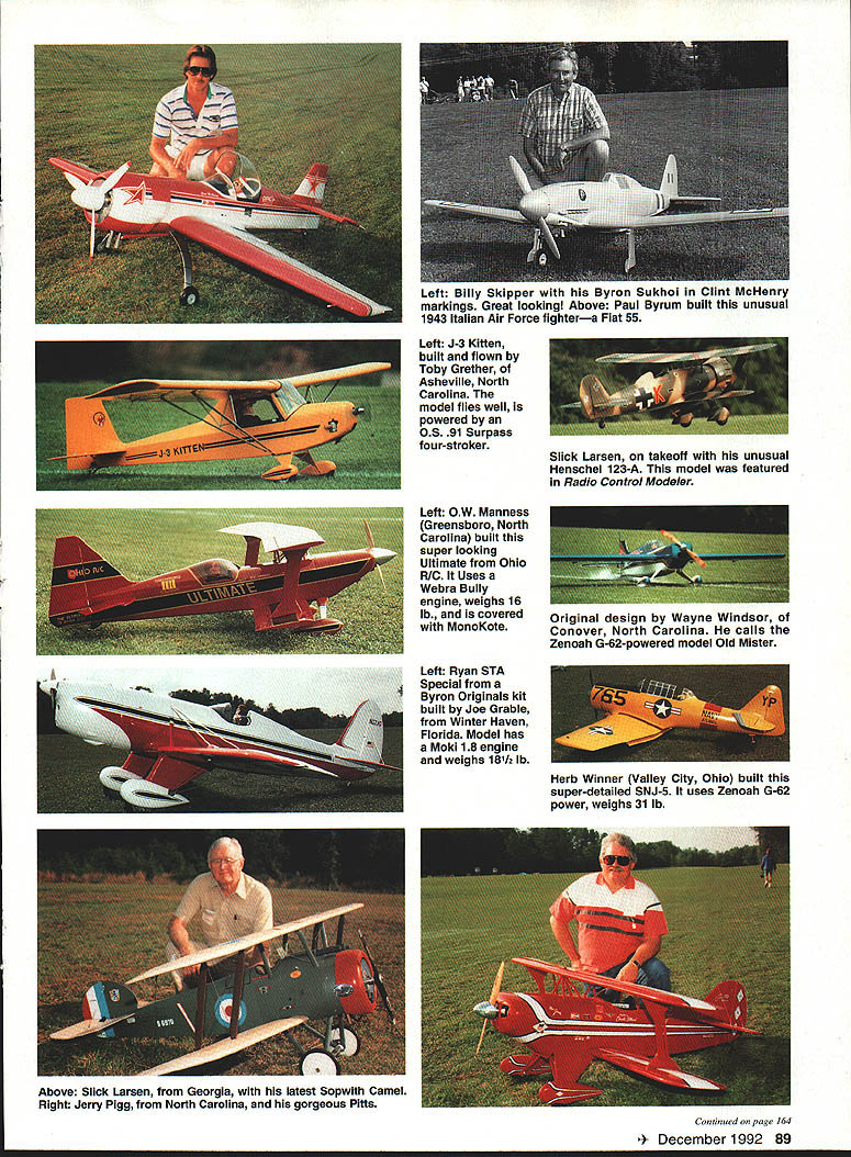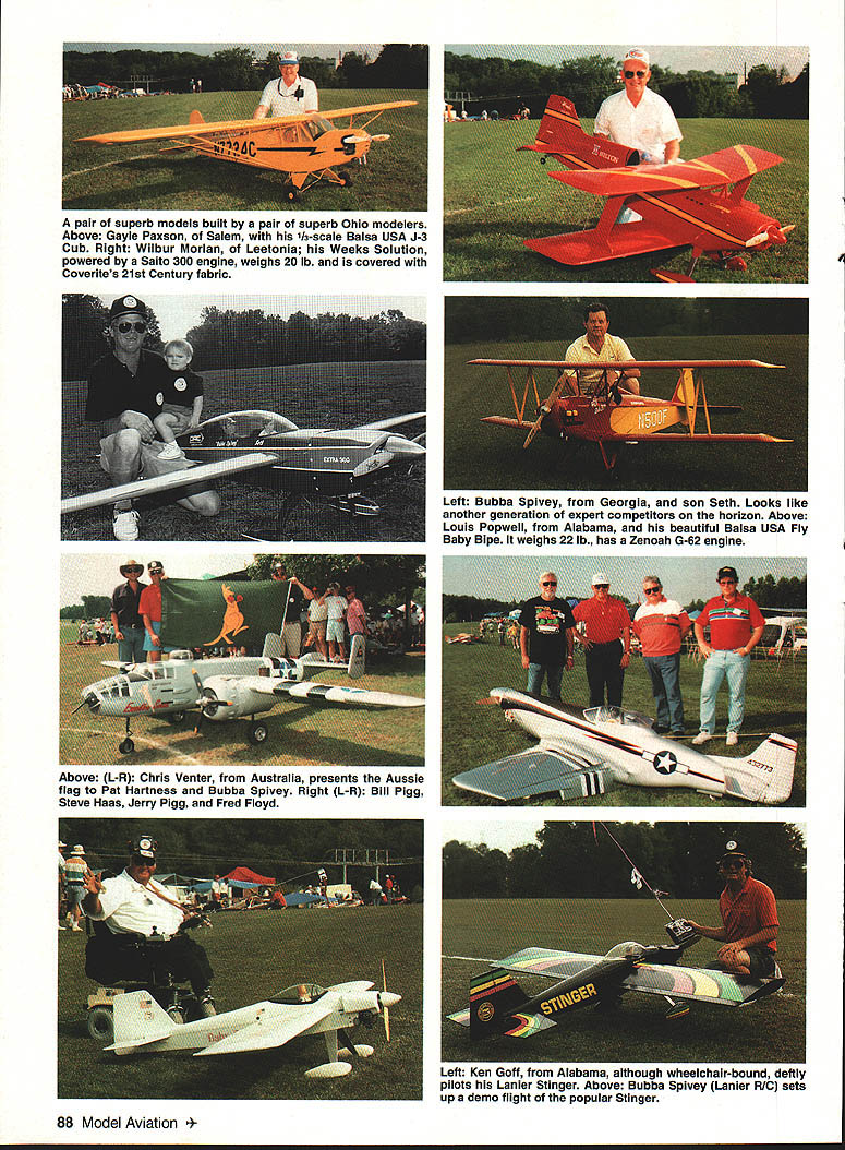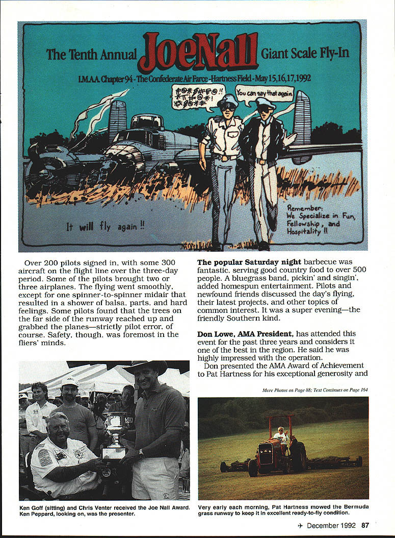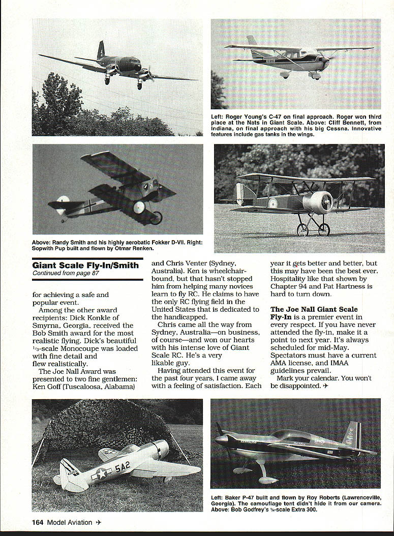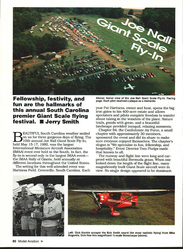 BEAUTIFUL South Carolina weather smiled us three gorgeous days flying 10th annual Joe Nail Giant Scale Fly-In held May 15-17 1992 largest International Miniature Aircraft Association IMAA event ever held South fact fly-in second largest IMAA event IMAA Rally Giants held annually different locations throughout United States setting well-attended event Hartness Field Greenville South Carolina year Pat Hartness owner host opens big iron gates 400-acre estate allows spectators pilots complete freedom wander about taking wonders place Nature trails ponds geese beautiful landscape provided tranquil relaxing moments Chapter 94 Confederate Air Force small chapter approximately 30 members sponsored event did its share make sure everyone enjoyed themselves chapters slogan specialize fun fellowship hospitality Event Director Tom Phelps made known runway flight line long car peted beautiful Bermuda grass looked down length flight line magnificently built Giant Scale aircraft view No single design appeared dominant 86 Modei Aviation oship festivity andAbove Aerial view Joe Nail Giant Scale Fly-In Facing page pilot received plaque memento fun hallmarks annual South Carolina premier Giant Scale flying festival U Jerry Smith Left Dick Konkle accepts Bob Smith award realistic flying Mike Bogardis Dick flew magnificent lI3scale Monocoupe above Over 200 pilots signed some 300 aircraft flight line over three-day period Some pilots brought two three airplanes flying went smoothly except spinner-to-spinner midair resulted shower balsa parts hard feelings Some pilots found trees far side runway reached up grabbed planesstrictly pilot error course Safety though foremost fliers minds popular Saturday night barbecue fantastic serving good country food over 500 people bluegrass band pickin singin added homespun entertainment Pilots newfound friends discussed days flying latest projects other topics common interest super eveningthe friendly Southern kind Don Lowe AMA President has attended event past three years considers best region said highly impressed operation Don presented AMA Award Achievement Pat Hartness exceptional generosity mber 1992 87 Photos Page 88 Text Continues Page 164 Ken Goff sifting Chris Venter received Joe Nail Award Ken Peppard looking presenter Very early morning Pat Hartness mowed Bermuda grass runway keep excellent ready-to-fly condition pair superb models built pair superb Ohio modelers Above Gayle Paxson Salem 1/3scale Balsa USA J-3 Cub Right Wilbur Morlan Leetonia Weeks Solution powered Saito 300 engine weighs 20 lb covered Coverites 21st Century fabric Above L-R Chris Venter Australia presents Aussie flag Pat Hartness Bubba Spivoy Right L-R Bill Pigg Steve Haas Jerry Pigg Fred Floyd 88 Model Aviation Bubba Spivey Georgia son Seth Looks liKe another generation expert competitors horizon Above Louis Popwell Alabama beautiful Balsa USA Fly Baby Bipe weighs 22 lb has Zenoah G-62 engine Len Ken iofl tram Alabama although wheelchair-bound deftly pilots Lanier Stinger Above Bubba Spivey Lanier RIC sets up demo flight popular Stinger Above Slick Larsen Georgia latest Sopwith Camel Right Jerry Pigg North Carolina gorgeous PiUs Left J-3 Kitten built flown Toby Grether Asheville North Carolina model flies well powered OS 91 Surpass four-stroker Slick Larsen takeoff unusual Hensohel 123-A model featured Radio Control Modeler Left OW Manness Greensboro North Carolina built super looking Ultimate Ohio RIC Uses Webra Bully engine weighs 16 lb covered MonoKote Left Ryan STA Special Byron Originals kit built Joe Grable Winter Haven Florida Model has Moki 18 engine weighs 18112 lb Herb Winner Valley City Ohio built super-detailed SNJ-5 uses Zenoah G-62 power weighs 31 lb Continued page 164 December 1992 89 Original design Wayne Windsor Conover North Carolina calls Zenoah G-62-powered model Old Mister Left Billy Skipper Byron Sukhoi Clint MoHenry markings Great looking Above Paul Byrum built unusual 1943 Italian Air Force fightera Fiat 55 4 Giant Scale Fly-In/Smith Continued page 87 achieving safe popular event Among other award recipients Dick Konkle Smyrna Georgia received Bob Smith award realistic flying Dicks beautiful /3-scale Monocoupe loaded fine detail flew realistically Joe Nail Award presented two fine gentlemen Ken Goff Tuscaloosa Alabama Chris Venter Sydney Australia Ken wheelchairbound hasnt stopped him helping novices learn fly RC claims have RC flying field United States dedicated handicapped Chris came way Sydney Australiaon business courseand won hearts intense love Giant Scale RC Hes very likable guy Having attended event past four years came away feeling satisfaction year gets better better may have best ever Hospitality like shown Chapter 94 Pat Hartness hard turn down Joe Nail Giant Scale Fly-In premier event respect have never attended fly-in make point next year Its always scheduled mid-May Spectators must have current AIVIA license ITVLAA guidelines prevail Mark calendar wont disappointed Model Aviation 4Left Roger Youngs C-47 final approach Roger won third place Nats Giant Scale Above Cliff Bennett Indiana final approach big Cessna Innovative . ures include gas tanks wings Above Randy Smith highly aerobatic Fokker D-VII Right Sopwith Pup built flown Otmar Renken Left Baker P-47 built flown Roy Roberts Lawrenceville Georgia camouflage tent didnt hide camera Above Bob Godfreys /4-scale Extra 300