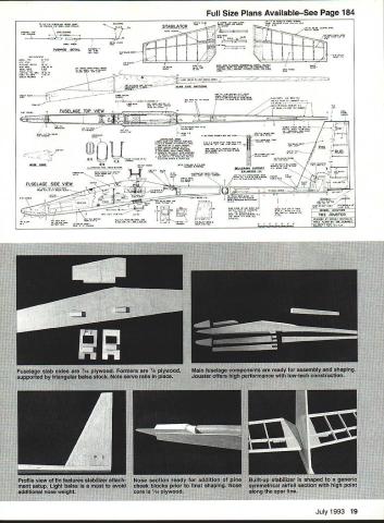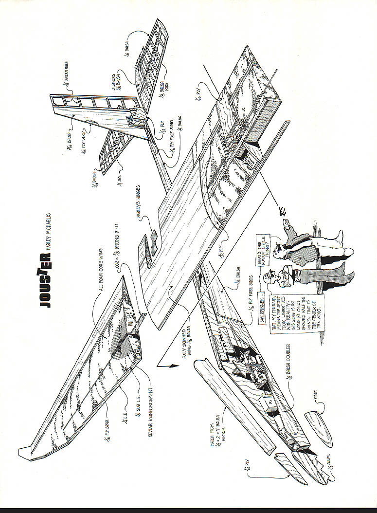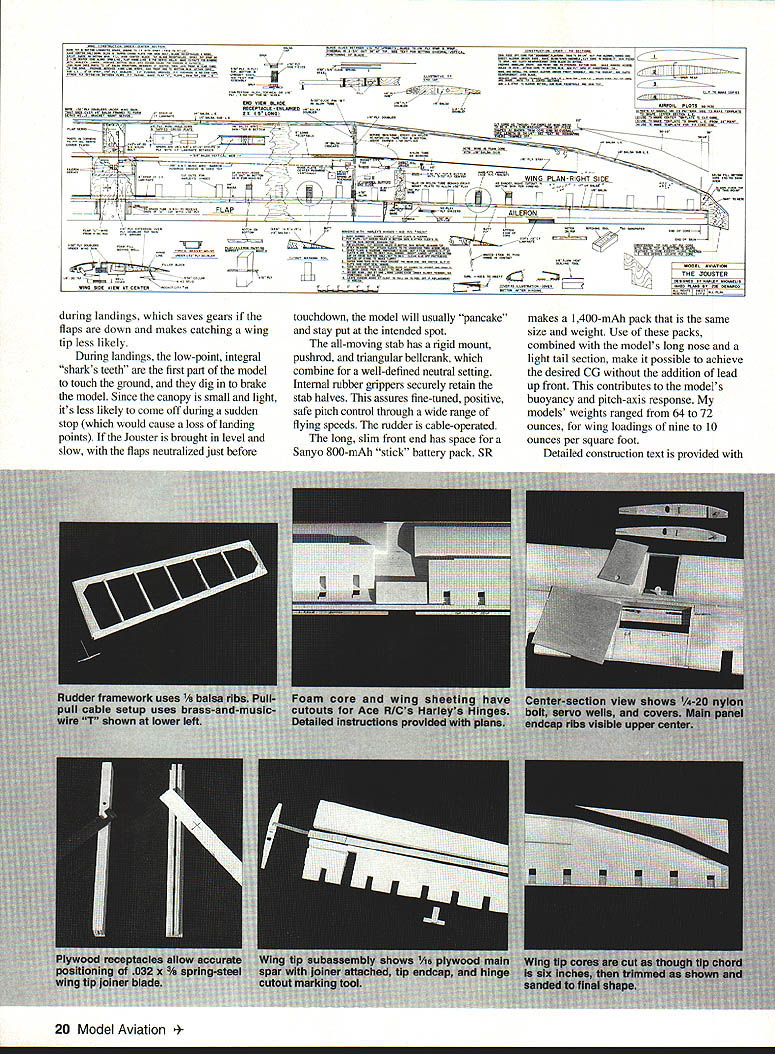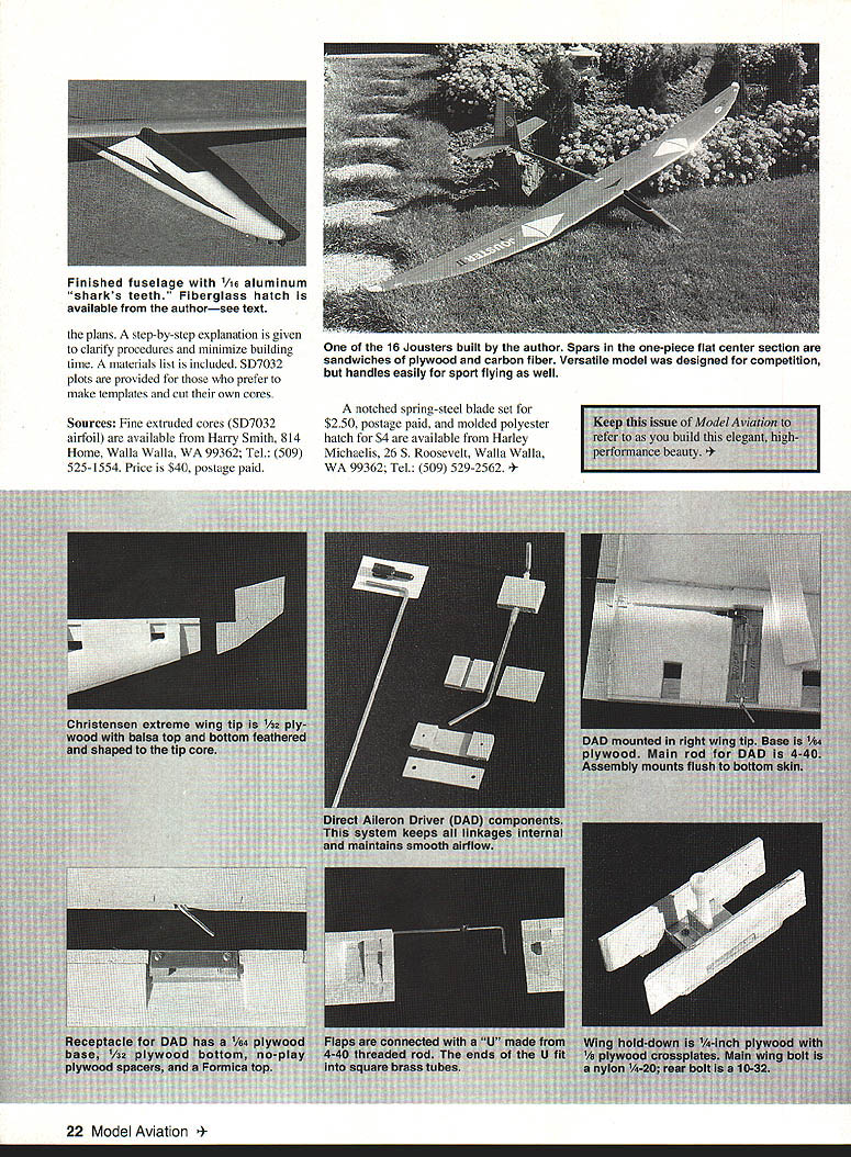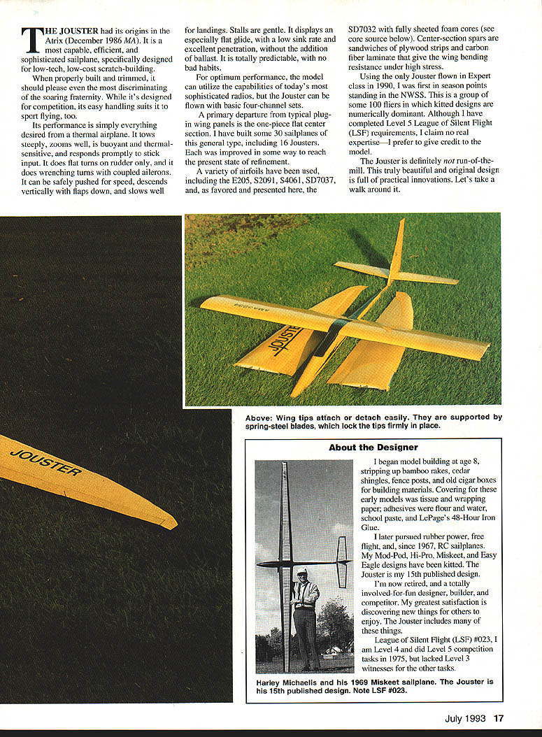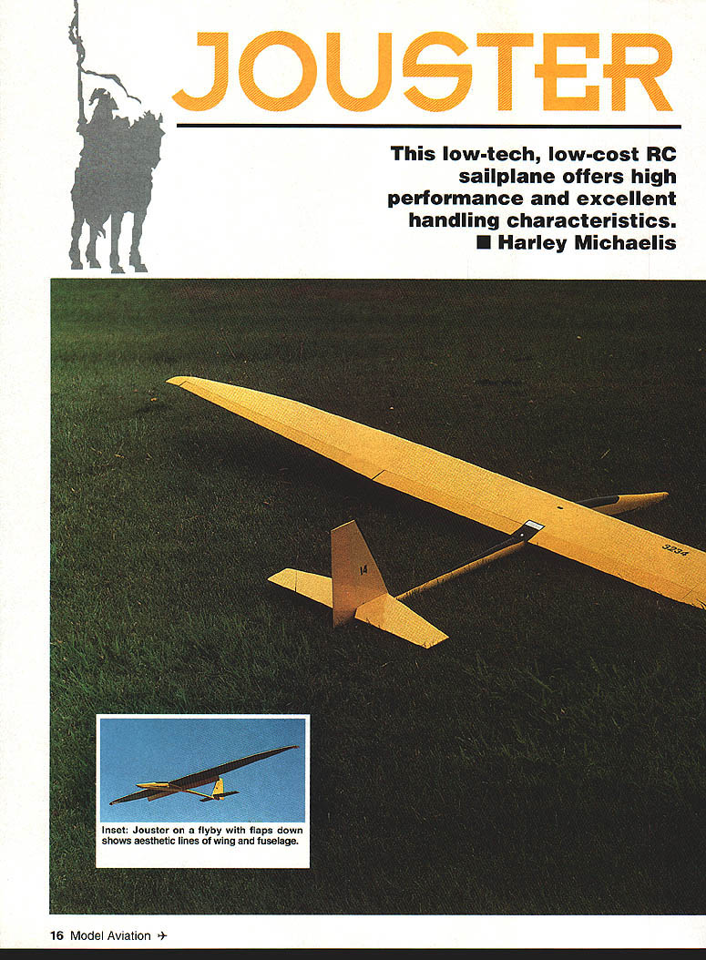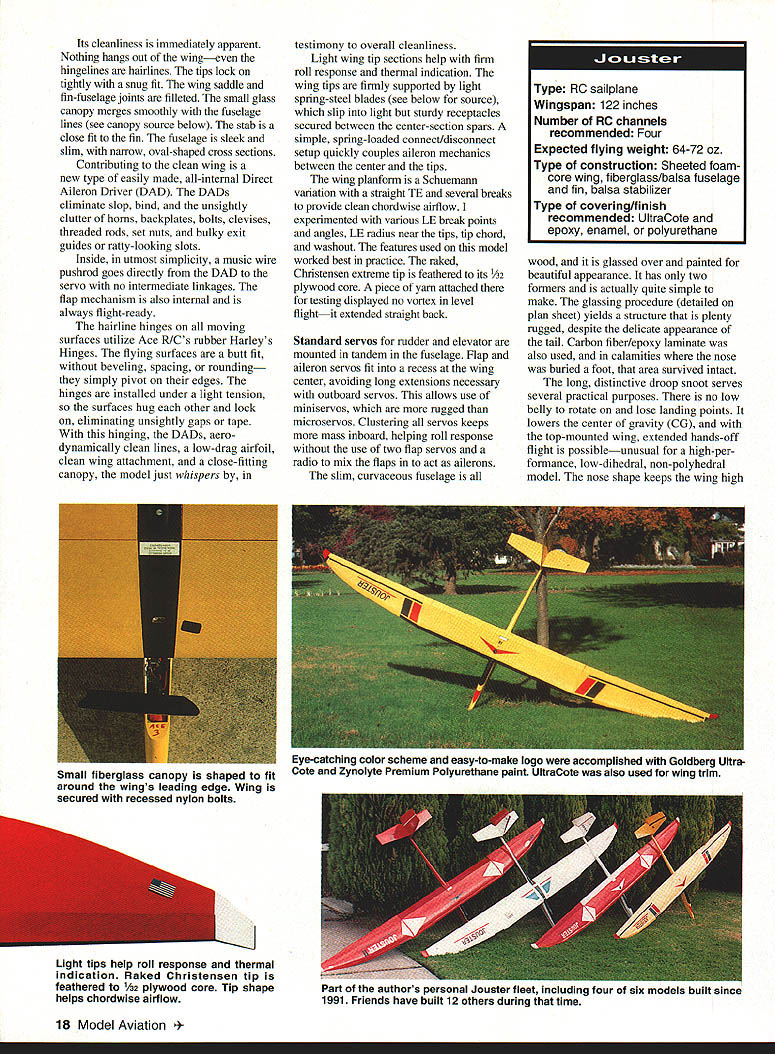 A -tech low-cost RC sailplane offers high performance excellent handling characteristics U Harley Michaelis 16 Model Aviation JOUSTER its origins Atrix December 1986 MA capable efficient sophisticated sailplane specifically designed low-tech low-cost scratch-building properly built trimmed should please discriminating soaring fraternity its designed competition its easy handling suits sport flying too Its performance simply everything desired thermal airplane tows steeply zooms well buoyant thermalsensitive responds promptly stick input does flat turns rudder does wrenching turns coupled ailerons can safely pushed speed descends vertically flaps down slows well landings Stalls gentle displays especially flat glide low sink rate excellent penetration addition ballast totally predictable no bad habits optimum performance model can utilize capabilities todays sophisticated radios Jouster can flown basic four-channel sets primary departure typical plugin wing panels one-piece flat center section have built some 30 sailplanes general type including 16 Jousters improved some way reach present state refinement variety airfoils have used including E205 S2091 S4061 5D7037 favored presented 5D7032 fully sheeted foam cores see core source below Center-section spars sandwiches plywood strips carbon fiber laminate give wing bending resistance under high stress Using Jouster flown Expert class 1990 first season points standing NWSS group some 100 fliers kitted designs numerically dominant Although have completed Level 5 League Silent Flight LSF requirements claim no real expertiseI prefer give credit model Jouster definitely mn-of-themill truly beautiful original design full practical innovations Lets take walk around Above Wing tips atfach detach easily supported spring-steel blades lock tips firmly place July1993 17 began model building age 8 stripping up bamboo rakes cedar shingles fence posts old cigar boxes building materials Covering early models tissue wrapping paper adhesives flour water school paste LePages 48-Hour Iron Glue later pursued rubber power free flight since 1967 RC sailplanes Mod-Pod Hi-Pro Miskeet Easy Eagle designs have kitted Jouster 15th published design Im now retired totally involved-for-fun designer builder competitor greatest satisfaction discovering new things others enjoy Jouster includes things League Silent Eight LSF #0231 am Level 4 did Level 5 competition tasks 1975 lacked Level 3 witnesses other tasks Harley Michaelis 1969 Miskeet sailplane Jouster 15th published design Note LSF #023 Its cleanliness immediately apparent Nothing hangs out wingeven hingelines hairlines tips lock tightly snug fit wing saddle fin-fuselage joints filleted small glass canopy merges smoothly fuselage lines see canopy source below stab close fit fin fuselage sleek slim narrow oval-shaped cross sections Contributing clean wing new type easily made all-internal Direct Aileron Driver DAD DADs eliminate slop bind unsightly clutter horns backplates bolts devises threaded rods set nuts bulky exit guides ratty-looking slots Inside utmost simplicity music wire pushrod goes directly DAD servo no intermediate linkages flap mechanism also internal always flight-ready hairline hinges moving surfaces utilize Ace RICs rubber Harleys Hinges flying surfaces butt fit beveling spacing rounding simply pivot edges hinges installed under light tension surfaces hug other lock eliminating unsightly gaps tape hinging DADs aero dynamically clean lines low-drag airfoil clean wing attachment close-fitting canopy model just whispers testimony overall cleanliness Light wing tip sections help firm roll response thermal indication wing tips firmly supported light spring-steel blades see below source slip light sturdy receptacles secured between center-section spars simple spring-loaded connect/disconnect setup quickly couples aileron mechanics between center tips wing planform Schuemann variation straight TE several breaks provide clean chordwise airflow experimented various LE break points angles LE radius near tips tip chord washout features used model worked best practice raked Christensen extreme tip feathered its /32 plywood core piece yam attached testing displayed no vortex level flightit extended straight back Standard servos rudder elevator mounted tandem fuselage Flap aileron servos fit recess wing center avoiding long extensions necessary outboard servos allows use miniservos rugged microservos Clustering servos keeps mass inboard helping roll response use two flap servos radio mix flaps act ailerons slim curvaceous fuselage Type RC sailplane Wingspan 122 inches Number RC channels recommended Four Expected flying weight 64-72 oz Type construction Sheeted foamcore wing fiberglass/balsa fuselage fin balsa stabilizer Type covering/finish recommended UltraCote epoxy enamel polyurethane wood glassed over painted beautiful appearance has two formers actually quite simple make glassing procedure detailed plan sheet yields structure plenty rugged despite delicate appearance tail Carbon fiber/epoxy laminate also used calamities nose buried foot area survived intact long distinctive droop snoot serves several practical purposes no low belly rotate lose landing points lowers center gravity CG top-mounted wing extended hands-off flight possibleunusual high-per formance low-dihedral non-polyhedral model nose shape keeps wing high 18 Model Aviation l fiberglass canopy shaped fit around wings leading edge Wing secured recessed nylon bolts Eye-catching color scheme easy-to-make logo accomplished Goldberg Ultra Cote Zynolyte Premium Polyurethane paint UltraCote also used wing trim Light tips help roll response thermal indication Raked Christensen tip feathered /32 plywood core Tip shape helps chordwise airflow Part authors personal Jouster fleet inciuaing tour OT six moaeis Duilt since 1991 Friends have built 12 others during time / P000000 Elf TAIL Full Size Plans AvailableSee Page 184 STABILATORARA 1/BYBBERHAY jII~ FUSELAGE 