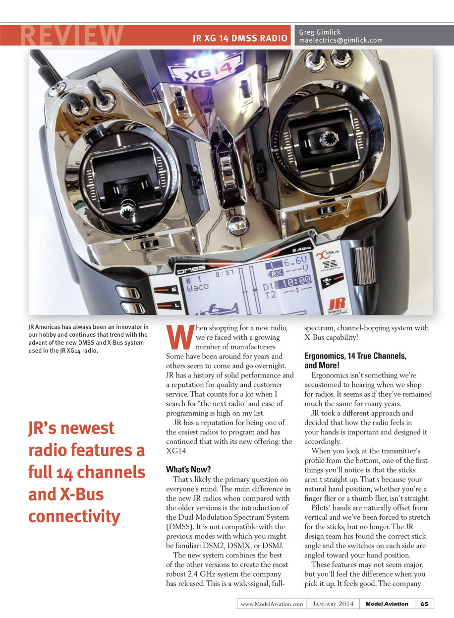 When shopping for a new radio, we’re faced with a growing number of manufacturers. Some have been around for years and others seem to come and go overnight. JR has a history of solid performance and a reputation for quality and customer service. That counts for a lot when I search for “the next radio” and ease of programming is high on my list. JR has a reputation for being one of the easiest radios to program and has continued that with its new offering: the XG14.