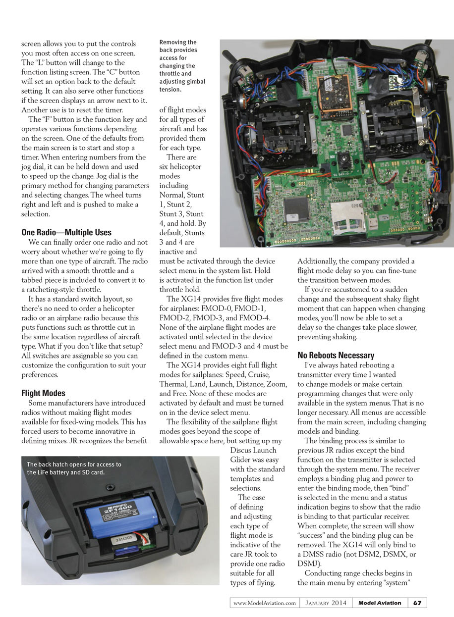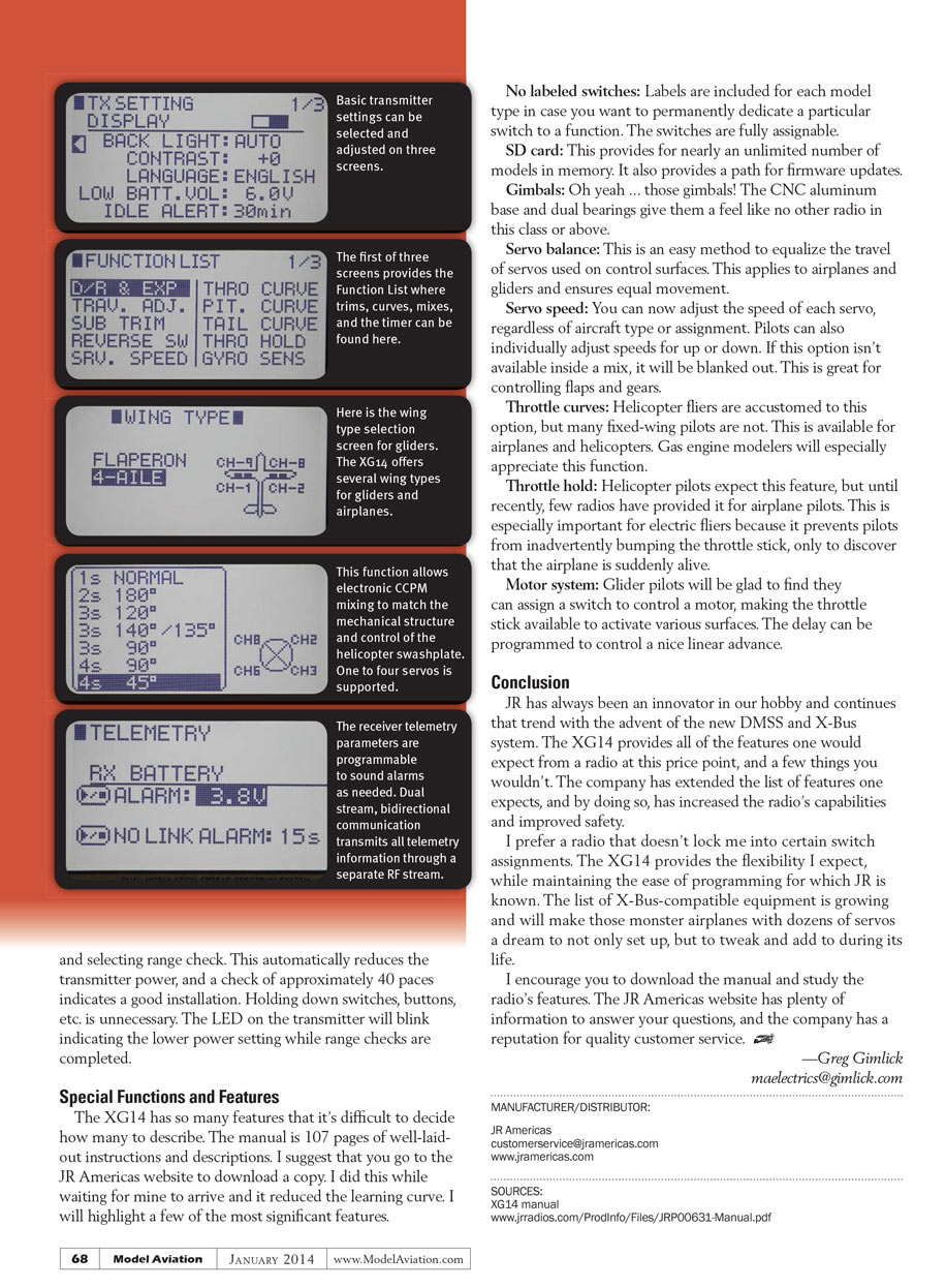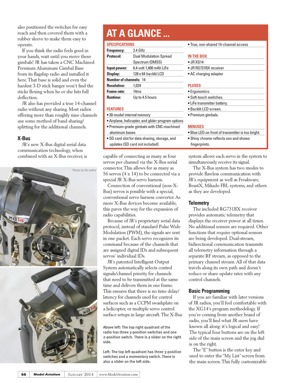 I prefer a radio that doesn’t lock me into certain switch assignments. The XG14 provides the flexibility I expect, while maintaining the ease of programming for which JR is known. The list of X-Bus-compatible equipment is growing and will make those monster airplanes with dozens of servos a dream to not only set up, but to tweak and add to during its life.