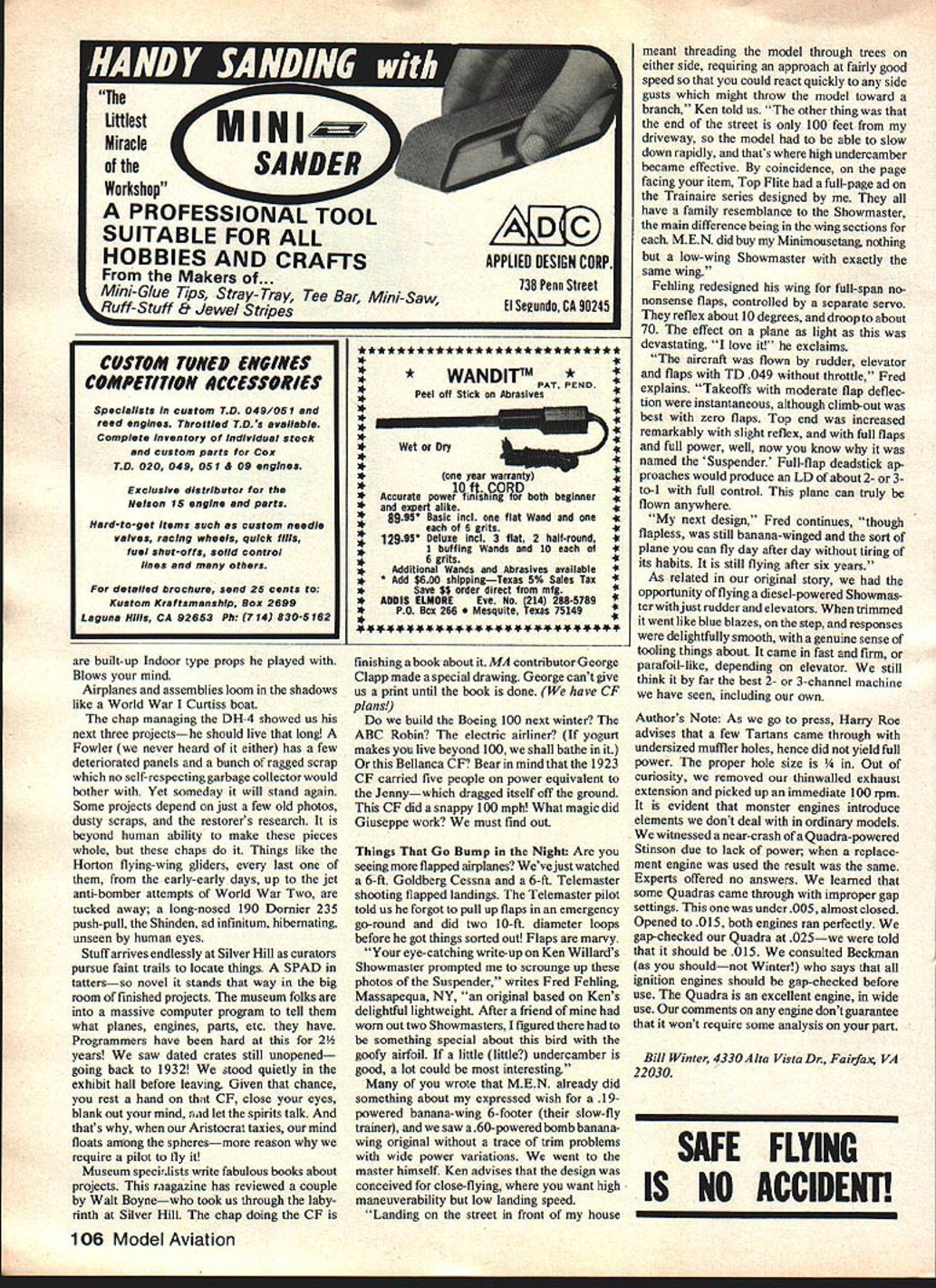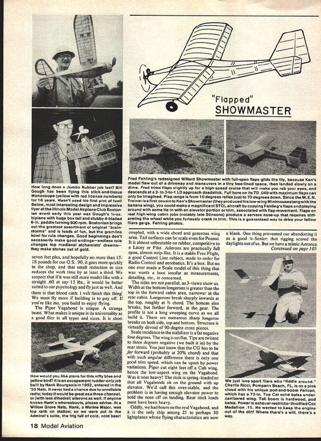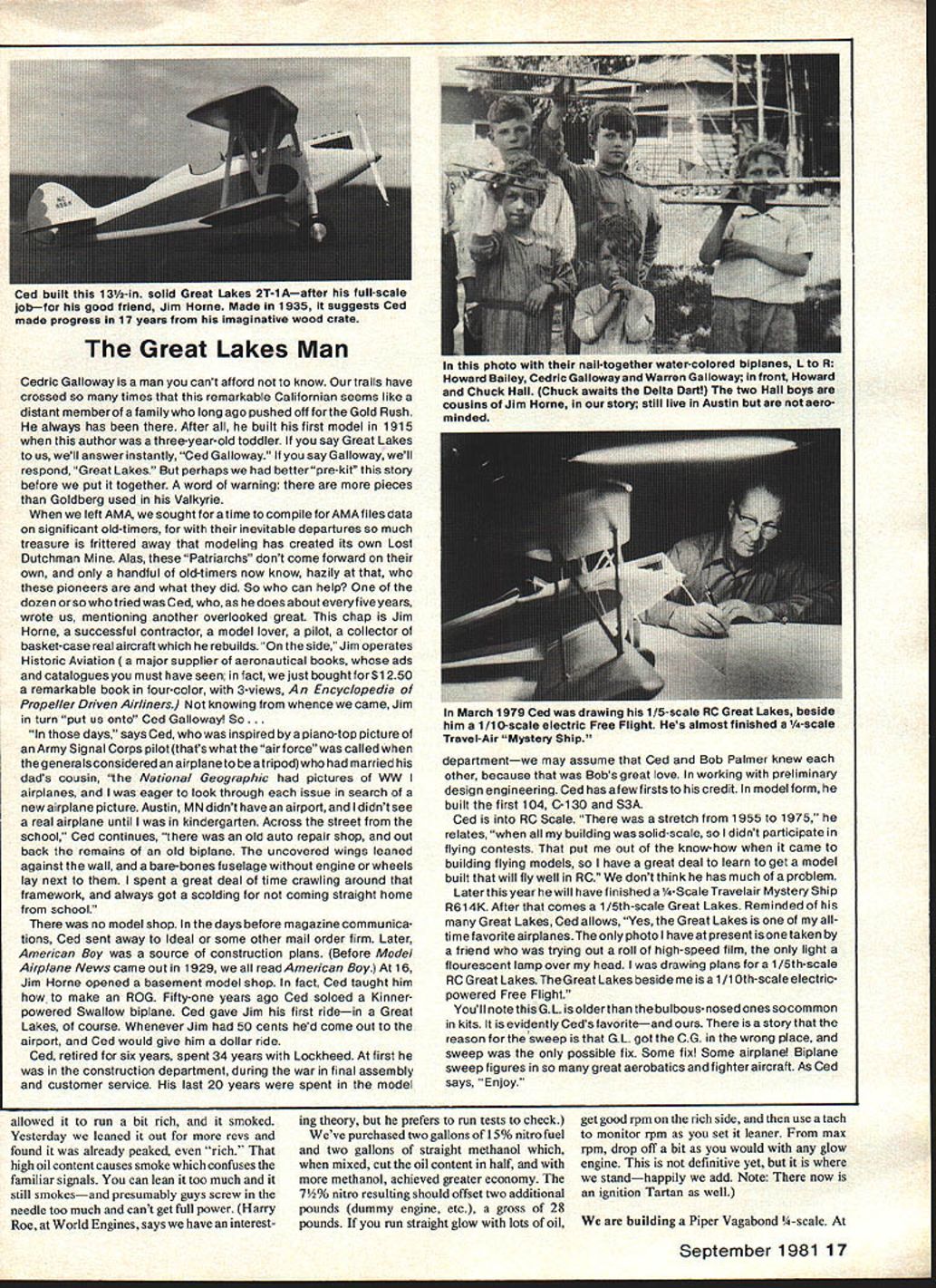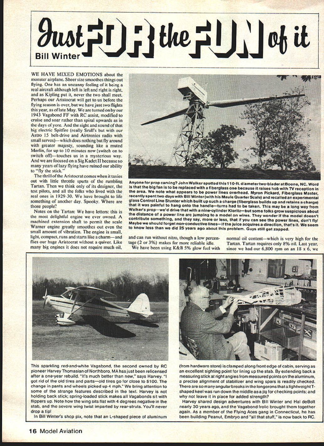 WE HAVE MIXED EMOTIONS about monster airplane Sheer size smoothes things out flying has uncanny feeling being real aircraft although left left right right Kipling put never two shall meet Perhaps Aristocrat will get us before flying season over have just two flights year late May turned 1943 Vagabond FF RC assist modified cruise soar rather spiral upwards days yore sight sound big electric Spitfire really Srulls Astro 15 belt-drive Airtronics radio small servoswhich does nothing fly around greater majesty sounding like muted Merlin up 10 minutes now switch switch ofttouches us mysterious way focused Sig Kadet II because years lazy flying have ruined ability fly stick thrill Aristocrat comes taxies Out little throttle spurts rumbling Tartan think its designer test pilots folks lived real ones 1929-30 have brought life something another day Spooky people Notes Tartan have letters delightful engine ever owned machined extension shaft permit scale Warner engine greatly smoothes out small amount vibration engine small light compact runs starts like charmand flies huge Aristocrat quiver Like big engines does require much oil can run nitro though low percen tage 2 3% makes reliable idle have using K&B 5% glow fuel normal oil contentwhich very high Tartan Tartan requires 8% oil Last year since 6800 rpm 18 x 6 sparkling red-and-white Vagabond second owned RO pioneerHarveyThomasianofNorthboro MAhasjustbeenrelicensed after one-year rebuild Its much better new says Harvey got rid old tires partsold tires go close $100 change pants wheels picked up 4 mph bring attention some strange features described text Harvey holding back stick spring-loaded stick makes Vagabonds sit flippers up Note wing sits flat 4 degrees negative stab severe wing twist imparted rear-struts Youll never drop tipl Bill Winters shop pix note L-shaped piece aluminum hardware store clamped along front edge cabin serving excellent sighting point lining up stab extending back measuring stickat right anglestrom measured points aluminum precise alignment stabilizer wing spars readily checked manyangularbreaks longeronathata lightweightT shaped keel run down middle jig checking points leave place added strength Harvey shared design adventures Bill Winter Hal deBolt nearly 30 years ago Vagabond frolic brought together again As member Flying Aces gang Connecticut has building Peanut Embryo stuff now back RO 16 Model Aviation BillWinter41UM Anyone prop carving John Walker spotted 110-ft diametertwo-bladerat Boone NC Word big fan replaced fiberglass because raises hob TV reception area note what appears power lines overhead Myron Pickard Fiberglass Master recently spent two days Bill Winter Maule Quarter Scale recalled experimental glass Control Line Stunter built up such charge fiberglass builds up retains charge painful hang onto handleturns taken may long way Walkers propwed drive nine-cylinder Kiorltzbut some folks grow suspicious about distance power line arc jumping model wires wonder model doesnt contribute something say less can see power lines dont fly Maybe should forget non-conductive linesif juice acquires direction thats seem know less did 25 years ago about problem Guys still get zapped Cedric Galloway man cant afford know trails have crossed times remarkable Californian seems like distant memberof family long ago pushed off Gold Rush always has After built first model 1915 author three-year-old toddler say Great Lakes us well answer instantly Ced Galloway say Galloway well respond Great Lakes perhaps betterpre-kit story before put together word warning pieces Goldberg used Valkyrie left AMA sought time compile forAMAfiles data significant old-timers inevitable departures much treasure frittered away modeling has created its own Lost Dutchman Mine Alas Patriarchs dont come forward own handful old-timers now know hazily pioneers what did So can help dozen tried Ced does about everyfive years wrote us mentioning another overlooked great chap Jim Home successful contractor model lover pilot collector basket-case real aircraft rebuilds side Jim operates Historic Aviation r supplier aeronautical books ads catalogues must have seen fact just bought forsi 250 remarkable book four-color 3-views An Encyclopedia Propeller Driven Airliners knowing whence came Jim turn put us onto Ced Gallowayl So days says Ced inspired piano-top picture Army Signal Corps pilot thats what airforce called generals considered airplane tripod married dads cousin National Geographic pictures WW airplanes eager look through issue search new airplane picture Austin MN didnt havean airport didntsee real airplane until kindergarten Across street school Ced continues old auto repair shop out back remains old biplane uncovered wings leaned against wall bare-bones fuselage engine wheels lay next spent great deal time crawling around framework always got scolding coming straight home school no model shop days before magazine communica tions Ced sent away Ideal some other mail order firm Later American Boy source construction plans Before Model Airplane News came out 1929 read American Boy 16 Jim Home opened basement model shop fact Ced taught him make ROG Fifty-one years ago Ced soloed Kinner powered Swallow biplane Ced gave Jim first ridein Great Lakes course Whenever Jim 50 cents hed come out airport Ced would give him dollar ride Ced retired six years spent 34 years Lockheed first construction department during war final assembly customer service last 20 years spent model departmentwe may assume Ced Bob Palmer knew other because Bobs great love working preliminary design engineering Ced has afewfirsts credit model form built first 104 C-i 30 53A Ced RC Scale stretch 1955 1975 relates building solid-scale sol didnt participate flying contests put out know-how came building flying models have great deal learn get model built will fly well RC dont think has much problem Laterthis year will have finished -Scale Travelair Mystery Ship R61 4K After comes 1/5th-scale Gre