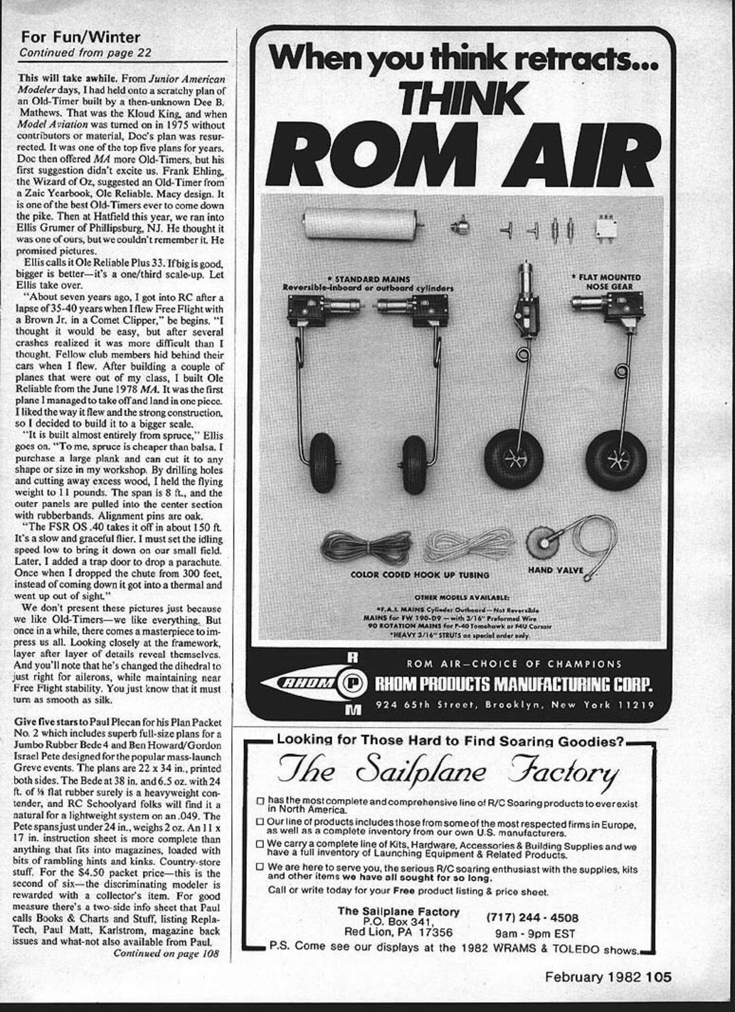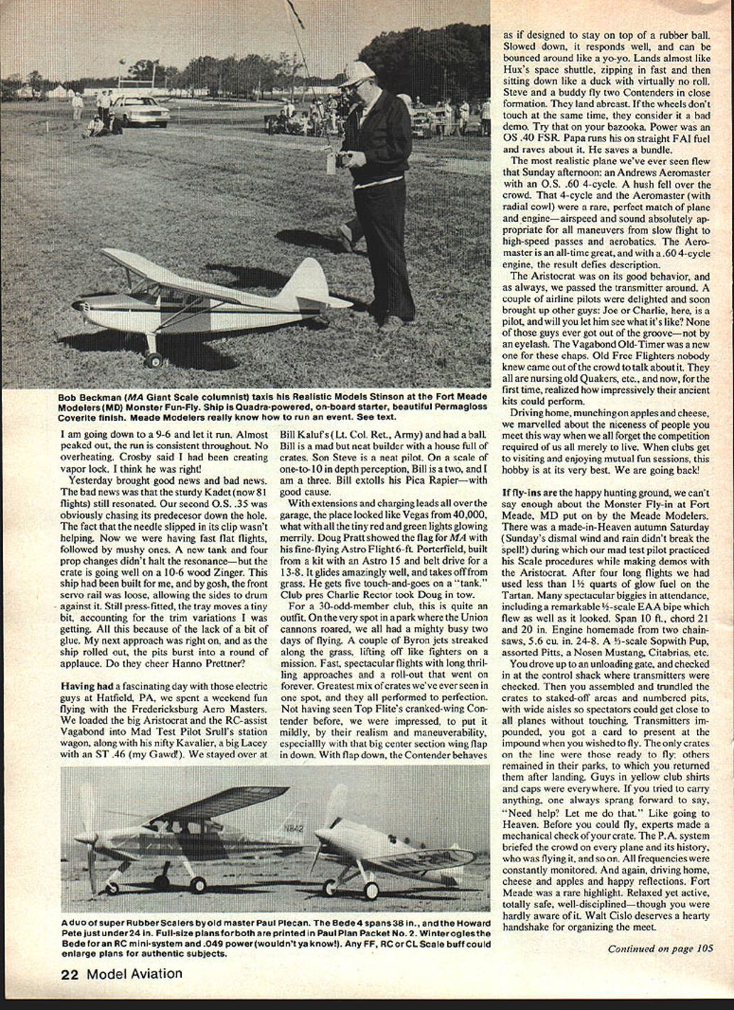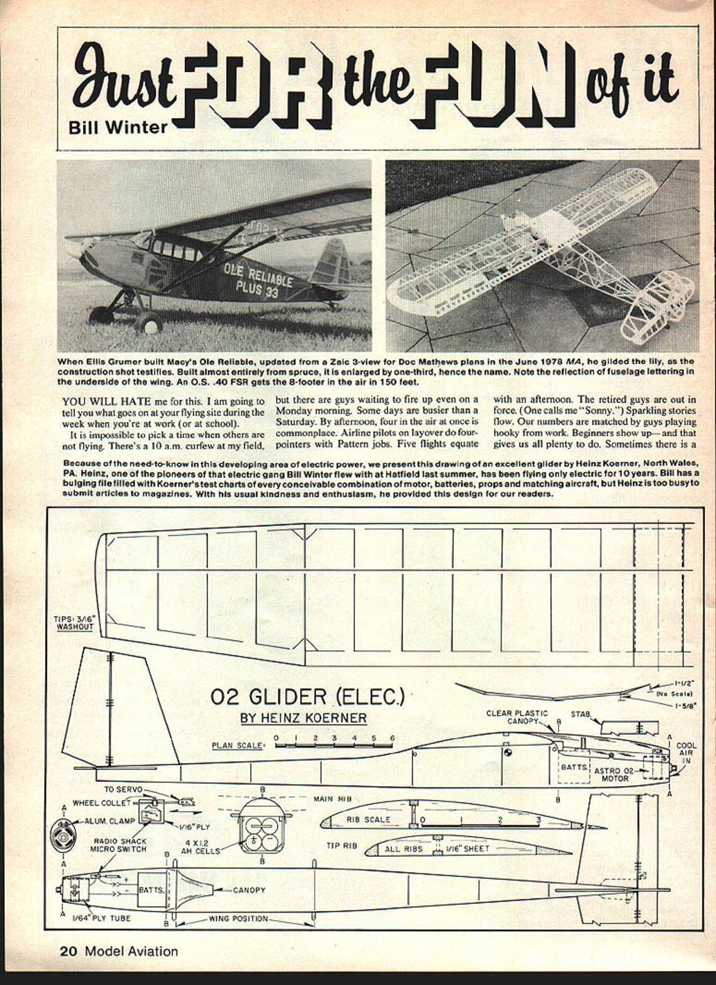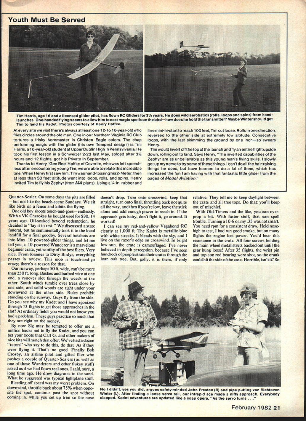 YOU WILL HATE am going guys waiting fire up afternoon retired guys out tell what goes flying site during Monday morning Some days busier force calls Sonny Sparkling stories week youre work school Saturday afternoon four air once flow numbers matched guys playing impossible pick time others commonplace Airline pilots layover four- hooky work Beginners show upand flying Theres 10 am curfew field pointers Pattern jobs Five flights equate gives us plenty Sometimes Because need-to-know developing area electric power present drawing excellent glider Heinz Koerner North Wales PA Heinz pioneers electric gang Bill Winter flew Hatfield last summer has flying electric 10 years Bill has bulging filefilled Koerners teat charts conceivable combination motor batteries props matching aircraft Heinz too busyto submit articles magazines usual kindness enthusiasm provided design readers / ______/_ ___________ -T TiPS 3/16 WASHOUT / 02 GLIDER ELEC BY HEINZ KOERNERCLEAR PLASTICSTAB 0I23456~A PLAN SCALE.I COOL S -AIR BATTSIN ASTRO 02-4 UMOTOR ERVO A WHEEL CO LET________________ ALUM CLAMP RAOO SHACK4X 2____ M CR0 SW TCHAH CE LS 20 Model Aviation 1 \jrnt Bill Winter Ellis Grumer built Macys Ole Reliable updated Zaic 3-view Doc Mathews plans June 1978 MA gilded lily construction shot testifies Built almost entirely spruce enlarged one-third hence name Note reflection fuselage lettering underside wing An OS 40 FSR gets 8-footer air 150 feet Youth Must Served site visit theres always least 12-to 16-year-old flies circles around old men Northern Virginia RC Club tortures frisky Aeromaster Christen Eagle colors chap performing magic glider own Tempest design Tim Harris 16-year-old student UpperDublin High Pennsylvania took first lesson Schweizer 2-23 last May soloed after 31/2 hours 12 flights got Private September Thanks Henry Gee BeeHaffke Coverite left speech less after encountering young Tim able relate incredible tale Henryfirst saw him Timwas hand-tossing 2-Meter less 50 feet altitude went loops rolls spins Henry invited Tim fly Zephyr MA plans Using 1/4-in rubber line mini-hi-start reach 100 feet Tim cut loose Rolls onedirection reversed other side extremely low altitude Consecutive loops last skimming ground inchso swears Henry Tim would invert off thetop launch andflyan entireflight upside down rolling out land Says Henry inverted capabilities Zephyr unbelievable young mans flying skills slowly got up nerve totrysomeofthesethings cant doallthe hair-raising things does have learned lot has increased fun am having fantastic little glider pages Model Aviation Quarter-Scaler some days pits filled like beach-scene Sundays sit like birds fence kibitz flying old boy shoots touch-and-goesendlessly VK Cherokee bought used $30 14 years ago Oil-soaked beyond redemption decided lay rest discussed state funeral sentimentally took local landfill final goodby Several hotshots Max 10 powered-glider things let tell a10-powered Wanderer marvelous beginner crate yet worthy best fliers Very nice foamies Dirty Birdys everything passes review mob touch-and-go crazy theres reason runway perhaps 50 ft wide cant 250 ft long Bushes barbed wire end runover slot through weeds other South winds tumble over trees close side solid woods right under downwind other side Rules prohibit standing runway Guys fly side see Kadet have agonized through 73 flights get approaches slot ordinary fields would know problem guys practice much right money now Sig may tempted offer million bucks fly Kadet can bet boots Carl G other makers nice kits will match offer Weve dozen tutors say As flying Thats no good Finally Bob Crosby airline pilot gifted flier pushes couple Quarter-Scalers well Wanderers other flukey stuft asked us flown real ones said sure long time ago drew diagrams sand What suggested typical lightplane stuff Bleeding off speed worst problem downwind throttle back about 75% oppo site spot continue past spot coming set up trim nose doesnt drop Turn onto crosswind keep straight turn onto final throttling back quite way youre low leave stick alone add enough power reach approach gets hairy dont fight go around worked can see red-and-yellow Vagabond RC clearly 1000 ft Kadet metallic blue white streaks blends sky live razors edge crosswind bright low sun crate camouflaged Ive never believed depth perception because Ive seen hundreds people strain crates through loan oak tree golly relative tell keep daylight between crate tree tops youll keep out mischief Old-Timers like can overprop bit faster stuff can spell trouble Turnings 10-6 35 smart need rpm consistent draw Held nosehigh test run good smoke flights engine lost power Youd hear resonance crate four screws holding main wheel metal struts backed out until gear hung loose After 35 flights wrist pin top con rod bearing shot crank could hit side case Horrible isnt So February 1982 21 Tim Harris age 16 licensed glider pilot has flown RC Gliders 31/2 years does wild aerobatics rolls loops ano spinsj irom nano launches One-handed flying seemsto allow him tocast magic spellsonthe birdhowdoes hold thetransmitter Maybe Wintershould get Tim land Kadet Photos courtesy Henry Haffke RU i UUII o rngues ssleIy-munueu Jonn rresion tiij ano pipe-pulling von iiinloYurl Winter L After finding loose servo rail intrepid ace made nifty approach Everybody clapped Kadet adventures updated like soap opera As servo turns. am going down 9-6 let run Almost peaked out run consistent throughout No overheating Crosby said creating vapor lock think right Yesterday brought good news bad news bad news sturdy Kadet now 81 flights still resonated second OS 35 obviously chasing its predecesor down hole fact needle slipped its clip wasnt helping Now having fast flat flights followed mushy ones new tank four prop changes didnt halt resonancebut crate going well 10-6 wood Zinger ship built gosh front servo rail loose allowing sides drum against Still press-fitted tray moves tiny bit accounting trim variations getting because lack