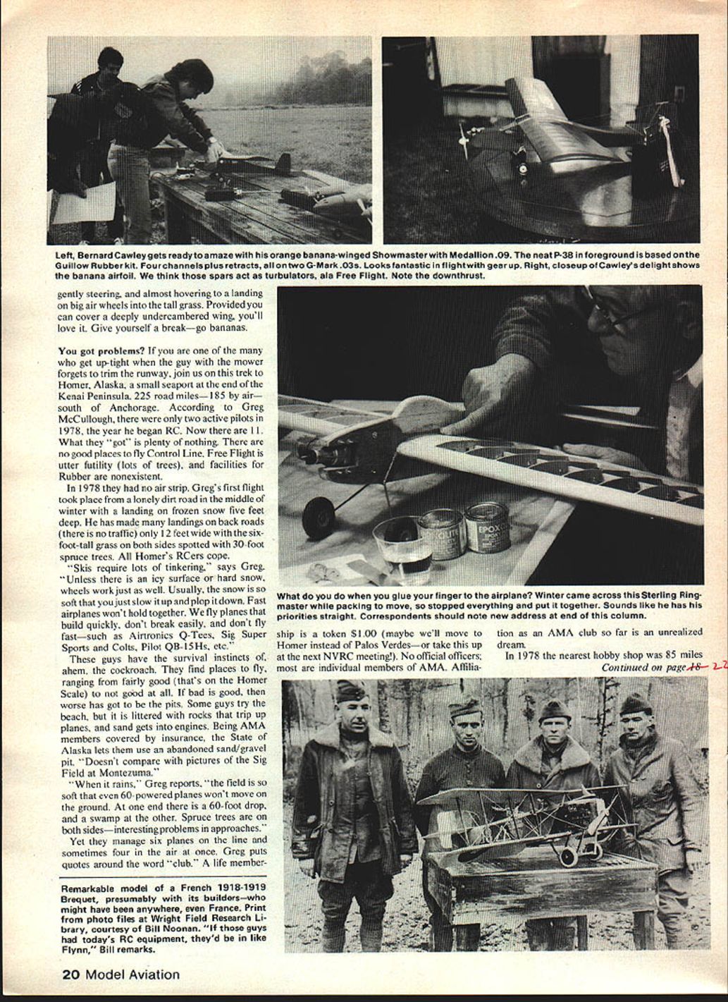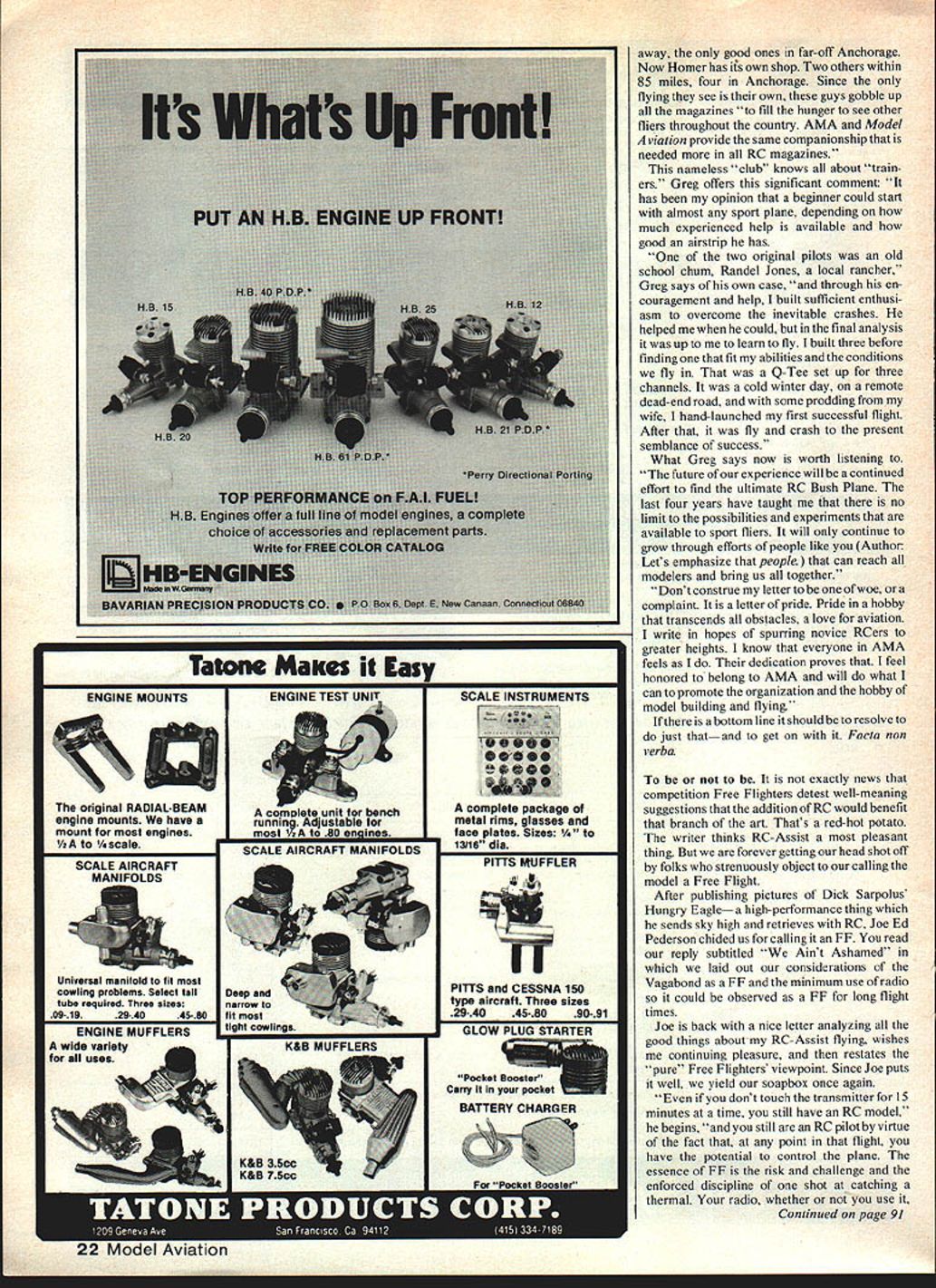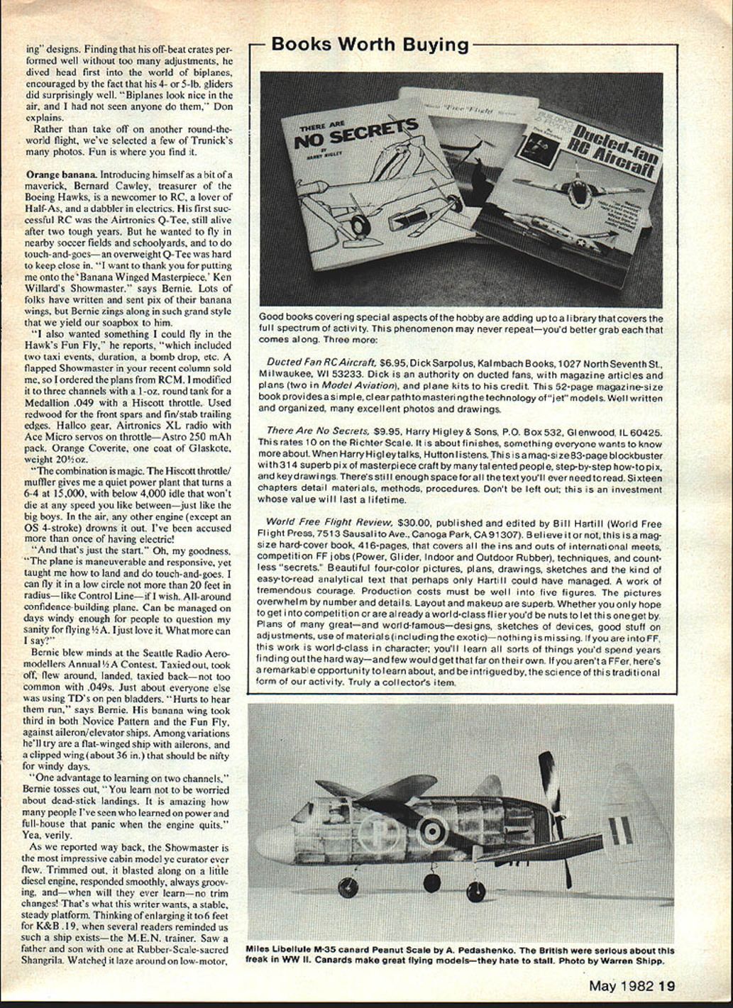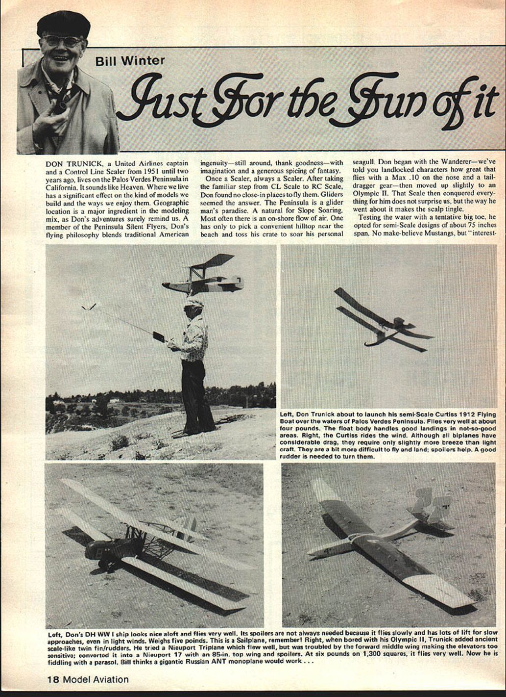 DON TRUNICK United Airlines captain Control Line Scaler 195 1 until two years ago lives Palos Verdes Peninsula California sounds like Heaven live has significant effect kind models build ways enjoy Geographic location major ingredient modeling mix Dons adventures surely remind us member Peninsula Silent Flyers Dons flying philosophy blends traditional American ingenuitystill around thank goodnesswith imagination generous spicing fantasy Once Scaler always Scaler After taking familiar step CL Scale RC Scale Don found no close-in places fly Gliders seemed answer Peninsula glider mans paradise natural Slope Soaring Most often on-shore flow air has pick convenient hilltop near beach toss crate soar personal seagull Don began Wandererweve told landlocked characters great flies Max 10 nose taildragger gearthen moved up slightly Olympic II Scale conquered thing him does surprise us way went about makes scalp tingle Testing water tentative big toe opted semi-Scale designs about 75 inches span No make-believe Mustangs interest Left Don Trunick about launch semi-Scale Curtiss 1912 Flying Boat over waters Palos Verdes Peninsula Flies very well about four pounds float body handles good landings not-so-good areas Right Curtiss rides wind Although biplanes have considerable drag require slightly breeze light craft bit difficult fly land spoilers help good rudder needed turn 18 Model Aviation Lert lJons Liii VYVV i snip lOOKS nice aion ano iiies very well mis spoilers always needed because flies slowly has lots lift slow approaches light winds Weighs five poinds isa Sailplane rememberl Right bored Olympic II Trunick added ancient scale-like twin fin/rudders tried Nieuport Triplane flew well troubled forward middle wing making elevators too sensitive converted Nieuport 17 85-in top wing spoilers six pounds 1300 squares flies very well Now fiddling parasol Bill thinks gigantic Russian ANT monoplane would work designs Finding off-beat crates per formed well too adjustments dived head first world biplanes encouraged fact 4- 5-lb gliders did surprisingly well Biplanes look nice air seen anyone Don explains Rather take off another round-theworld flight weve selected few Trunicks photos Fun find Orange banana Introducing himself abitofa maverick Bernard Cawley treasurer Boeing Hawks newcomer RC lover Half-As dabbler electrics first suc cessful RC Airtronics Q-Tee still alive after two tough years wanted fly nearby soccer fields schoolyards touch-and-goesan overweight Q-Tee hard keep close want thank putting onto Banana Winged Masterpiece Ken Willards Showmaster says Bernie Loss folks have written sent pix banana wings Bernie zings along such grand style yield soapbox him also wanted something could fly Hawks Fun Fly reports included two taxi events duration bomb drop etc flapped Showmaster recent column sold ordered plans RCM modified three channels 1-oz round tank Medallion 049 Hiscott throttle Used redwood front spars fin/stab trailing edges HalIco gear Airtronics XL radio Ace Micro servos throttle Astro 250 mAh pack Orange Coverite coat Glaskote weight 20oz combination magic Hiscott throttle muffler gives quiet power plant turns 6-4 15000 below 4000 idle wont die speed like betweenjust like big boys air other engine except OS 4-stroke drowns out Ive accused once having electric thats just start Oh goodness plane maneuverable responsive yet taught land touch-and-goes can fly low circle 20 feet radiuslike Control Lineif wish All-around confidence-building plane Can managed days windy enough people question sanity flying t love What can say Bernie blew minds Seattle Radio Aero modellers Annual Contest Taxied Out took off flew around landed taxied backnot too common 049s Just about everyone else using TDs pen bladders Hurts hear run says Bernie banana wing took third both Novice Pattern Fun Fly against aileron/elevator ships Among variations hell try flat-winged ship ailerons clipped wing about 36 should nifty windy days advantage learning two channels Bernie tosses out learn worried about dead-stick landings amazing people Ive seen learned power full-house panic engine quits Yea verily As reported way back Showmaster impressive cabin model ye curator ever flew Trimmed out blasted along little diesel engine responded smoothly always groov ing andwhen will ever learnno trim changes Thats what writer wants stable steady platform Thinking enlarging itto6 feet K&B 19 several readers reminded us such ship existsthe MEN trainer Saw father son Rubber-Scale-sacred Shangrila Watched laze around low-motor Books Worth Buying Ducted Fan RCAircra ft $695 Dick Sarpol us Kal mbach Books 1027 North Seventh St Milwaukee WI 53233 Dick authority ducted fans magazine articles plans two Mode/Aviation plane kits hia credit 52-page magazine-size book provides simple ci earpath mastering technology et models Well written organized excellent photos drawings Are No Secrets $995 Harry Higley& Sons PO Box 532 Glenwood IL 60425 rates 10 Richter Scale about finishes something everyone wants know about Harry Higi ey talks Hutton istens mag-si zeB3-page blockbuster 314 superb pi x masterpiece craft talented people step-by-step how-to pix key drawings Theressti II enough spacefor text youll ever need read Sixteen chapters detail materials methods procedures Dont left out investment value will last lifetime World Free Flight Review $3000 published edited Bill Hartill World Free Flight Press 7513 Sausal ito Ave Canoga Park CA 91307 Believe isa mag size hard-cover book 416-pages covers ins outs international meets competition FF obs Power Glider Indoor Outdoor Rubber techniques count less secrets Beautiful four-color pictures plans drawings sketches kind easy-to-read analytical text perhaps Hartill could have managed work tremendous courage Production costs must well five figures pictures overwhelm numberanddetails Layoutand makeuparesuperb Whetheryou hope get competition already world-class fI i eryoud nuts let get Plans greatand world-famousde