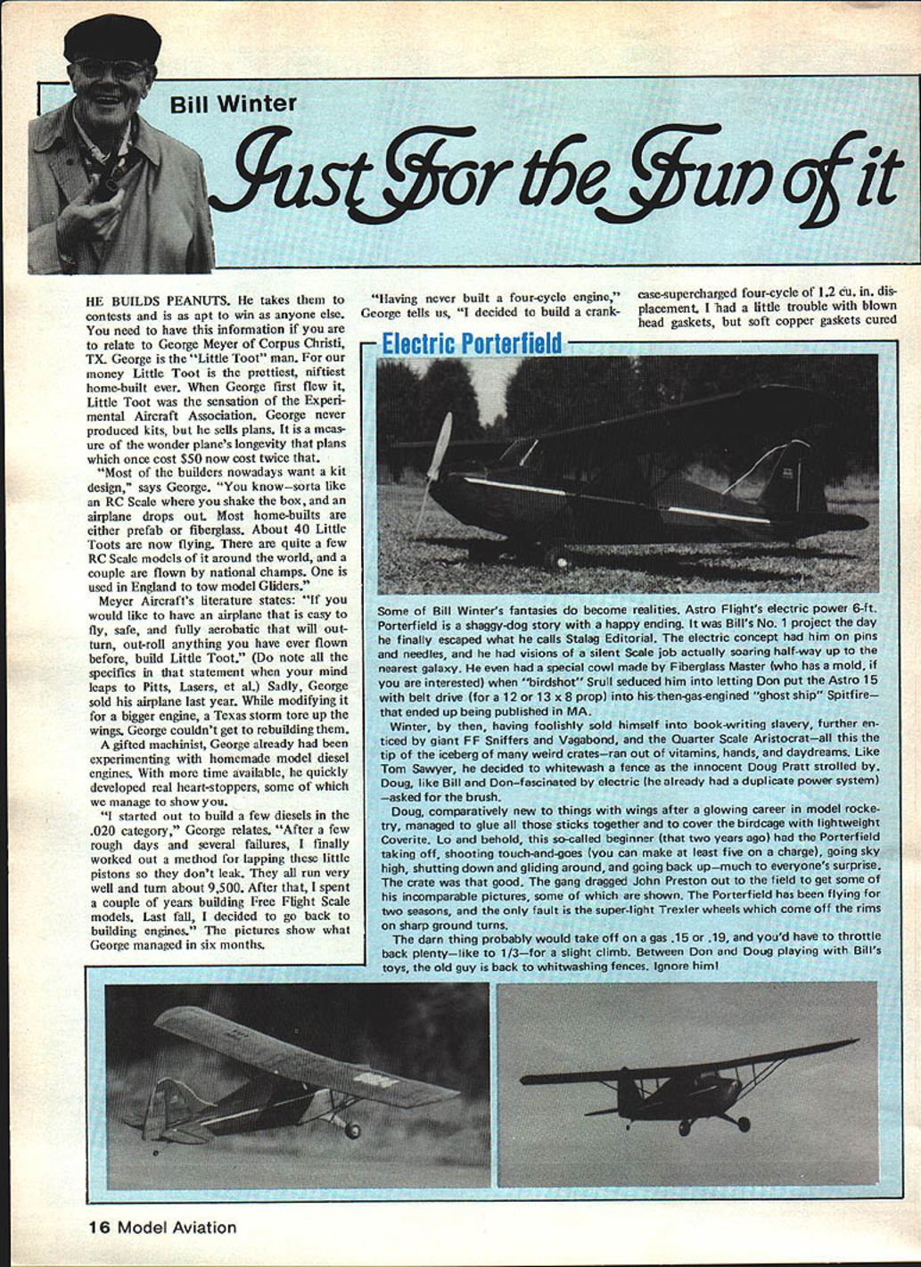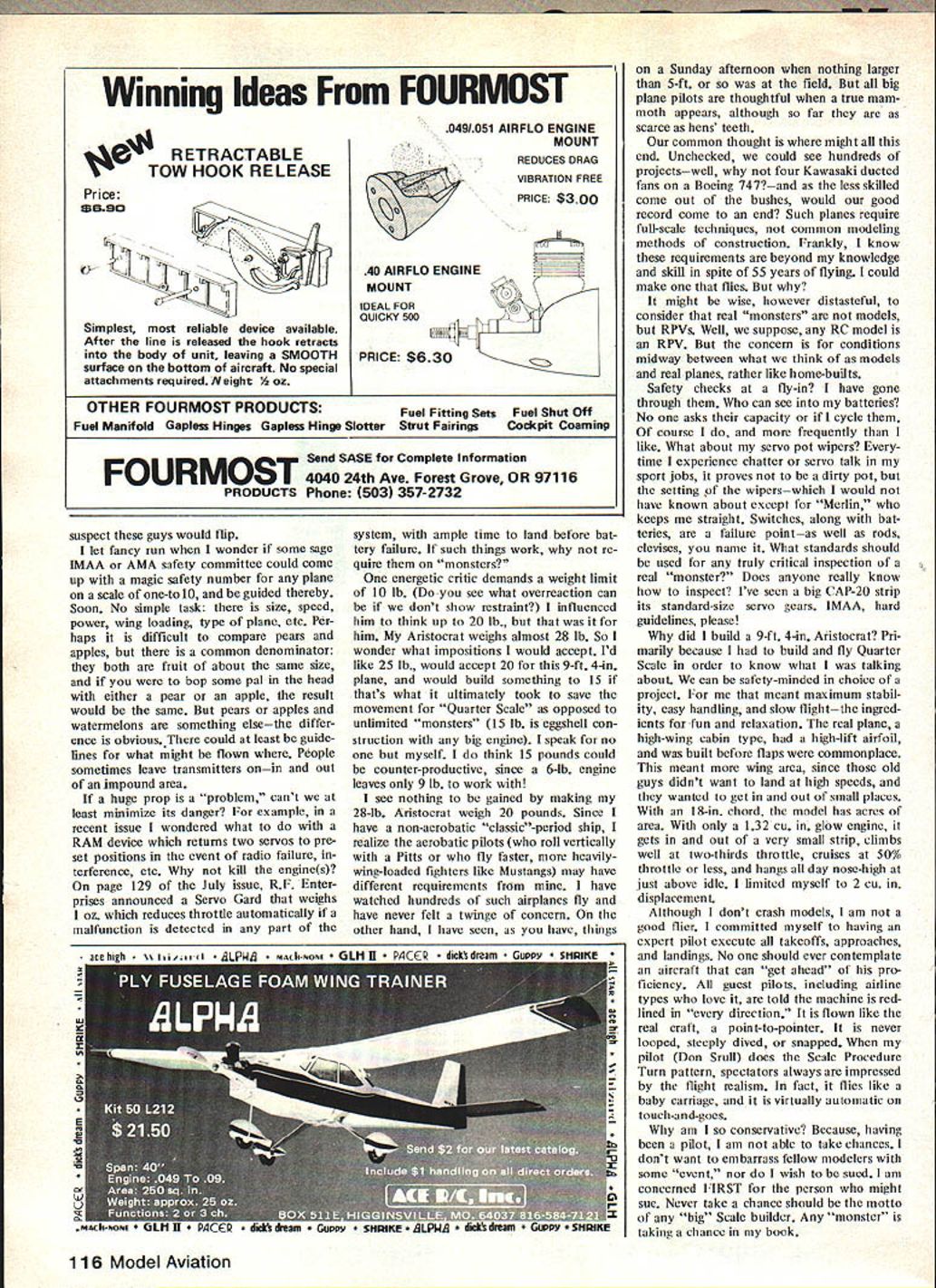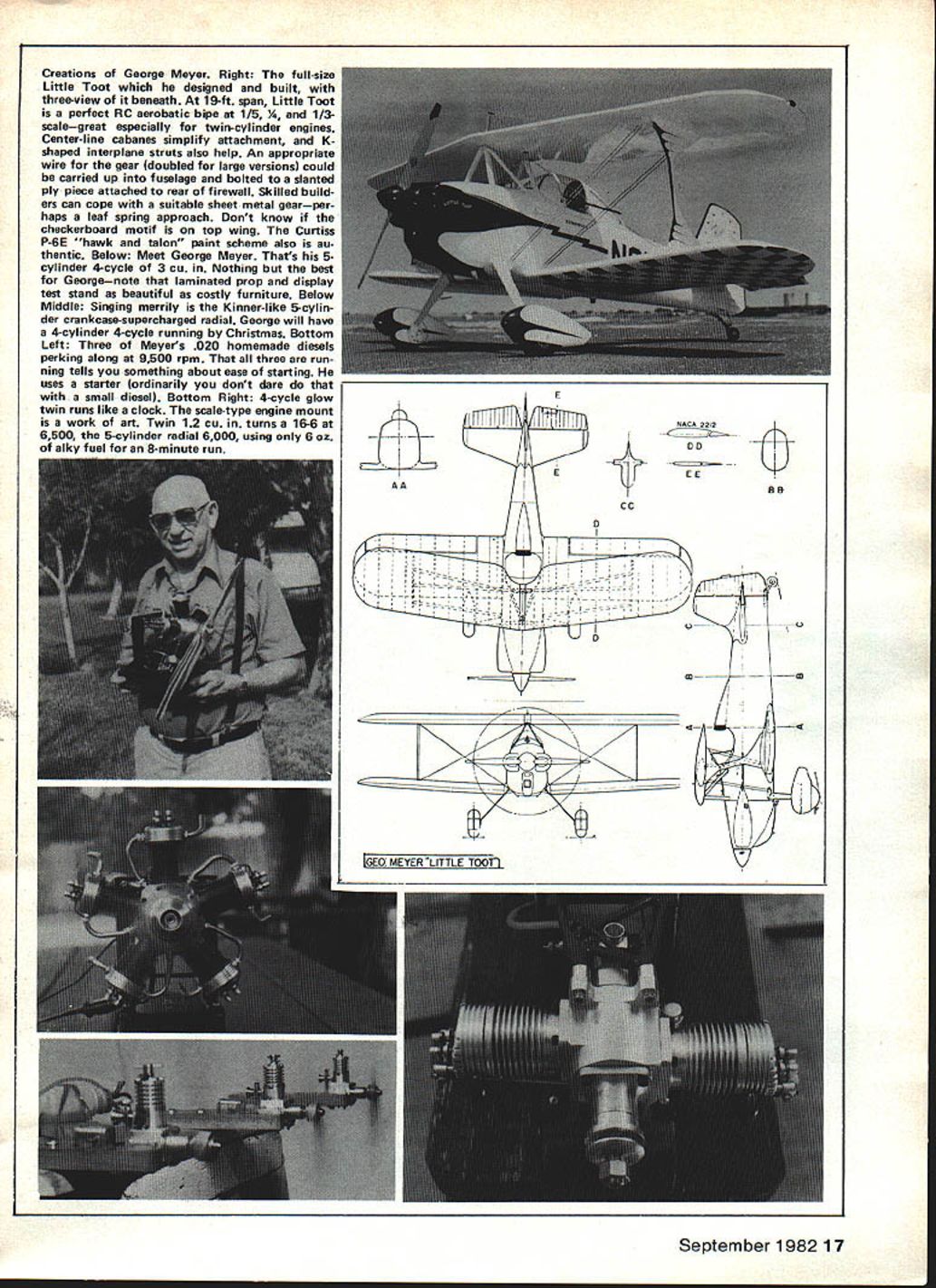 #ev #t HE BUILDS PEANUTS takes contests apt win anyone else need have information relate George Meyer Corpus Christi TX George Little Toot man money Little Toot prettiest niftiest home-built ever George first flew Little Toot sensation Experi mental Aircraft Association George never produced kits sells plans meas ure wonder planes longevity plans once cost $50 now cost twice Most builders nowadays want kit design says George knowsorta like RC Scale shake box airplane drops out Most home-builts either prefab fiberglass About 40 Little Toots now flying quite few RC Scale models around world couple flown national champs uscd England tow model Gliders Meyer Aircrafts literature states would like have airplane easy fly safe fully aerobatic will out turn out-roll anything have ever flown before build Little Toot note specifics statement mind leaps Pitts Lasers et a] Sadly George sold airplane last year modifying bigger engine Texas storm tore up wings George couldnt get rebuilding gifted machinist George already experimenting homemade model diesel engines time availabic quickly developed real heart-stoppers some manage show started out build few diesels 020 category George relates After few rough days several failures finally worked out method lapping little pistons dont leak run very well turn about 9500 After spent couple years building Free Flight Scale models Last fail decided go back building engines pictures show what George managed six months Having never built four-cycle engine George tells us decided build crank case-supercharged four-cycle 12 Cu dis placement bad little trouble blown head gaskets soft copper gaskets cured 16 Model Aviation Creations George Meyer Right full-size Little Toot designed built three-view beneath 19-ft span Little Toot perfect RC aerobatic bipe 1/5 Y4 1/3scalegreat especially twin-cylinder engines Center-line cabanes simplify attachment Kshaped interplane struts also help An appropriate wire gear doubled large versions could carried up fuselage bolted slanted ply piece attached rear firewall Skilled build ers can cope suitable sheet metal gearper haps leaf spring approach Dont know checkerboard motif top wing Curtiss P-6E hawk talon paint scheme also au thentic Below Meet George Meyer Thats 5cylinder 4-cycle 3 cu Nothing best Georgenote laminated prop display test stand beautiful costly furniture Below Middle Singing merrily Kinner-like 5-cylin der crankcase-supercharged radial George will have 4-cylinder 4-cycle running Christmas Bottom Left Three Meyers 020 homemade diesels parking along 9500 rpm three run ning tells something about ease starting uses starter ordinarily dont dare small diesel Bottom Right 4-cycle glow twin runs like clock scale-type engine mount work art Twin 12 cu turns 16-6 6500 5-cylinder radial 6000 using 6 oz nf nlkv fiani fair tmin,ta rain 1AA E A 2212 -cZZI DD EEE ee D IGEO MEYER LITTLE TOOli September 1982 17 problem After seven hours running time tums 16-6 prop 6500 Since ran well decided build five-cylinder 3 cu engine Its radial valve train like old Kinner five camshafts six gears carb Perry 21 engine still think should sleeved down little caib mounted back gear case Five holes let fuel gear case front gear case has five holes let fuel crankcase intake pipes lead crankcase turns 6000 18-6 runs 8 min 6 oz glow fuel latest project four-cylinder in-line crankshaft finishedwith four throws five malns has oil system pres sure mains rods hope have running Christmas As contributor years Rubber Scale models various mags re cently Quarter Scaler cant resist show ing Little Toot three-view magic swept-wing biplanes want best going Scale get Lou Andrews immortal Aeromaster noted sweptwing thing first Udet Flamingo published 1936 MAN Both wings swept like later-day Jungmeister Although Udet mid-20s German trainer said pilots compare favorably famous Jungineister Great Lakes another Overlooked among Curtiss Seahawk top wing swept ala Fal con stralght bottom wingno taper either scale Williams Bros engine would lovely Some air show Great Lakes square outside loops greatest aerial exhibitions ever saw some Marine pilot decided wring out a Seahawk over two grass strips Teter boro 1933 Cars stopped miles un named maneuvers flowed rapidly air craft literally turned inside out 19-ft span Little Toot less 5ft -scale somewhat 6-ft 1/3-scale careful observations flying sites wed urge CG located front leading edge bottom wing sweep top wing Nine-out-of-lO RC Scale bipes waliow tricky am proach tail too low George has said bet hed put nominal price three-viewor maybe has spare literature Little Toot includes larger threeview reduced size printed Meyer Aircraft 5706 Abby Dr Corpus Chris ti TX 78413 SAM has authorized Free Flight Vaga bond Wog Old-Timers Old Square Sides republished recently MA MB Antique rather Old-Timerwhich erroneous listing ask noti fy quickly Vagabond Revisited recent MAN probably acceptable under SAM rules because changes made create modern sport RC-assist up right 19 instead inverted 60 Model Builder has fuli-size plans Old Square Sides designed John Spragueanother byline used years ago John Ponds Plan Service will have official plans three ships Next month Ill provide brief commentary flight characteristics well suggestions Vagabond can equipped de thermalizer Please dont take sunshine away Lets dis tinguish between fun thrilis subject Continued page 20 18 Model Aviation Knighthood Flower Major Hank Bourgeois US Marine Corps pie dated 1937-38 sure 1947-48 correct state-of-the-art Radio Control lob Still universal planes flown escapements turned rudder full right left Receiver relays activated chattered vibration chancy businessand approved frequency aside Ham stuff 465 fliers day RC equivalent moonshining Strange devices flowered desperate tempts get away escapement syndrome job escapement see vane tail behind stab vane rotated Since could stopped slant-wise positions provided feeble elevator doubtful rudder action combina tiOns 
